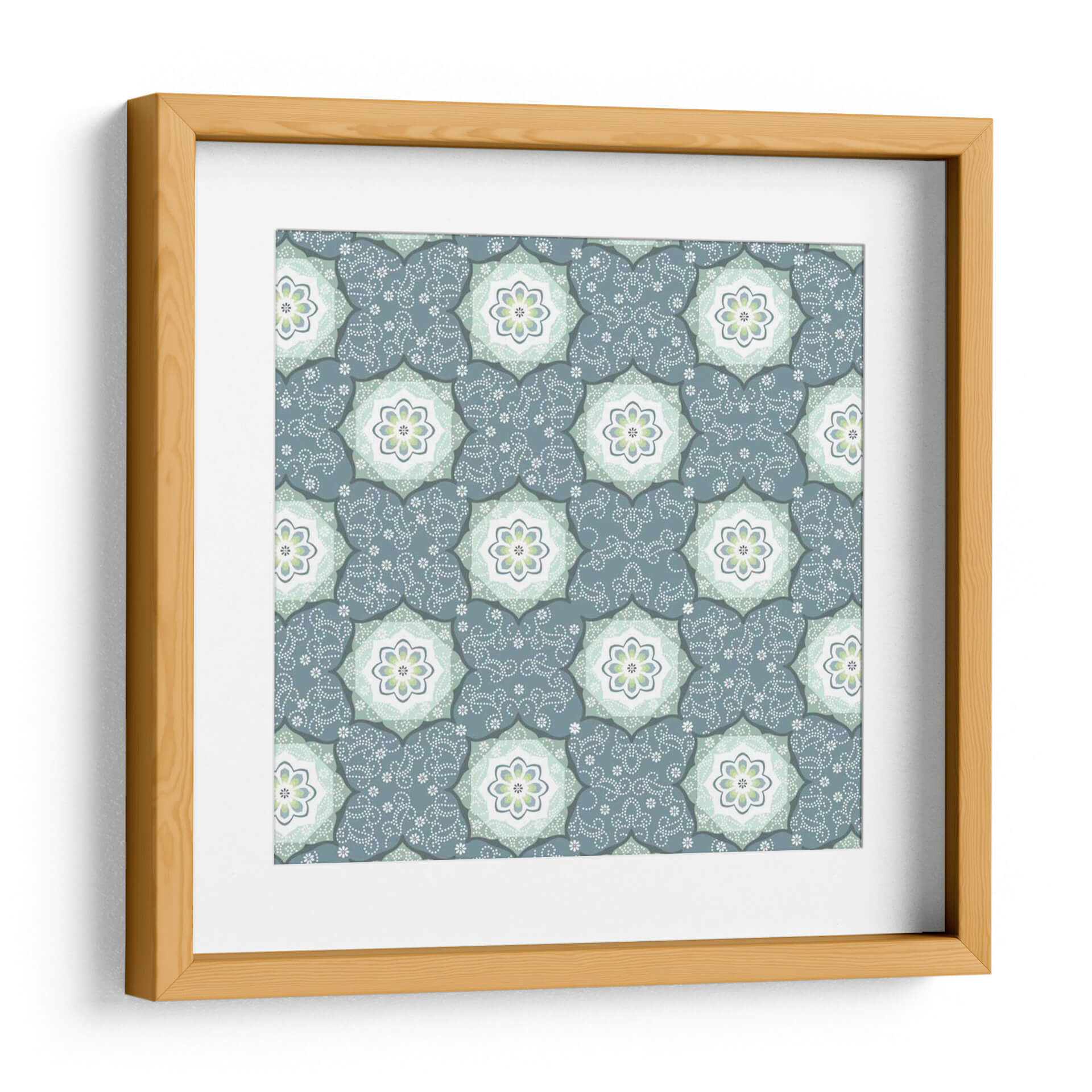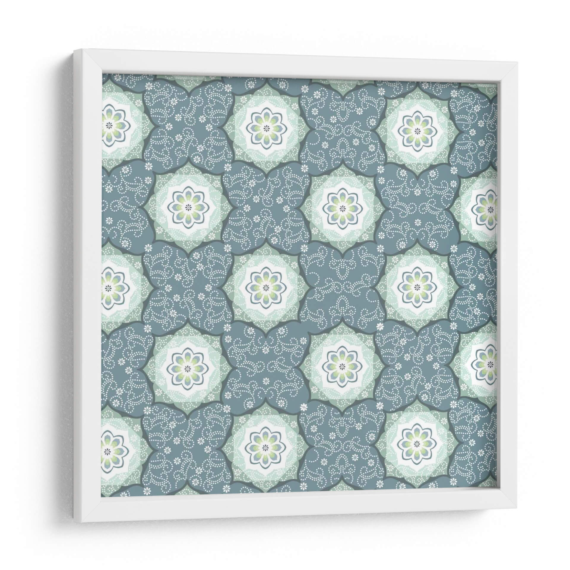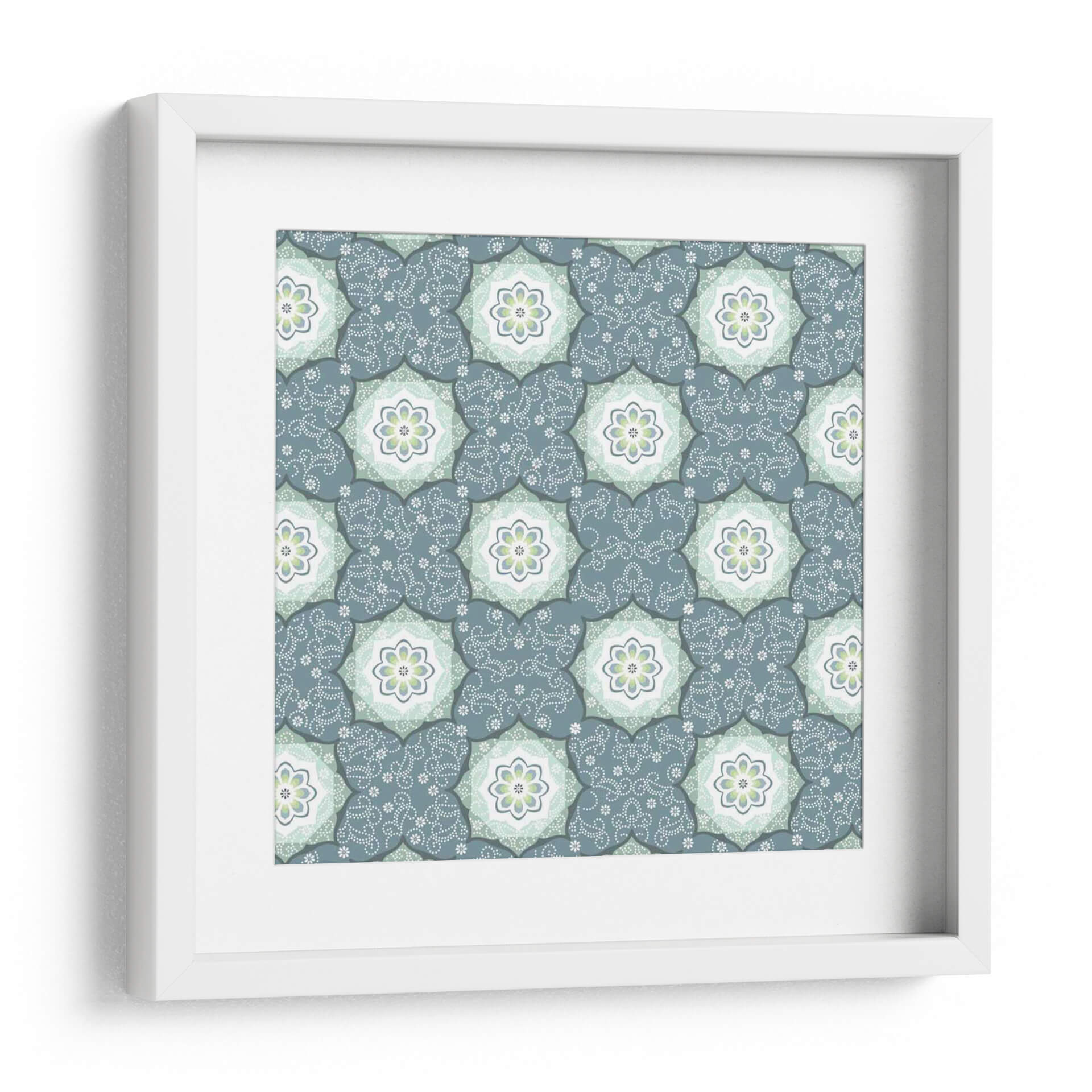 Añada un toque de elegancia y serenidad a su hogar con este cautivador cuadro decorativo "Glamour Medallions II" de Katia Hoffman. La obra presenta un patrón intrincado y simétrico de medallones florales superpuestos sobre un fondo texturizado en tonos azules y verdosos. Cada medallón central, con sus delicados pétalos en blanco y verde menta, se ve realzado por un sutil halo de puntos blancos, creando una sensación de profundidad y sofisticación. El diseño general evoca una atmósfera de calma y refinamiento, similar a los patrones geométricos de inspiración marroquí o mehndi, pero con una sensibilidad contemporánea. La paleta de colores suaves y armoniosos lo convierte en una pieza versátil, perfecta para complementar una variedad de estilos de decoración, desde el bohemio chic hasta el moderno escandinavo. Imagine este cuadro como un punto focal en su sala de estar, aportando una dosis de tranquilidad y un aire de lujo discreto a su espacio. También sería una adición exquisita a un dormitorio, creando un refugio de paz y belleza. "Glamour Medallions II" no es solo una decoración, es una invitación a la contemplación y al bienestar visual, ideal para quienes buscan arte que inspire y eleve el espíritu de su entorno.