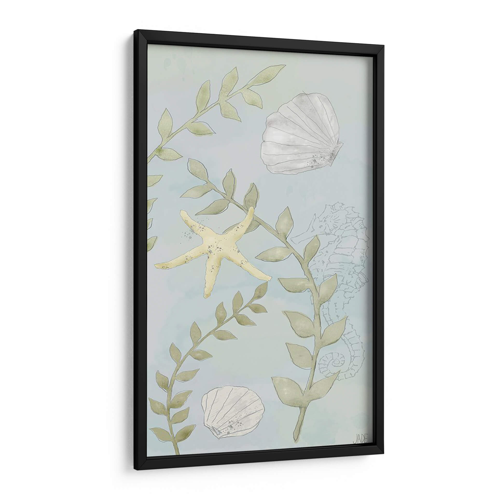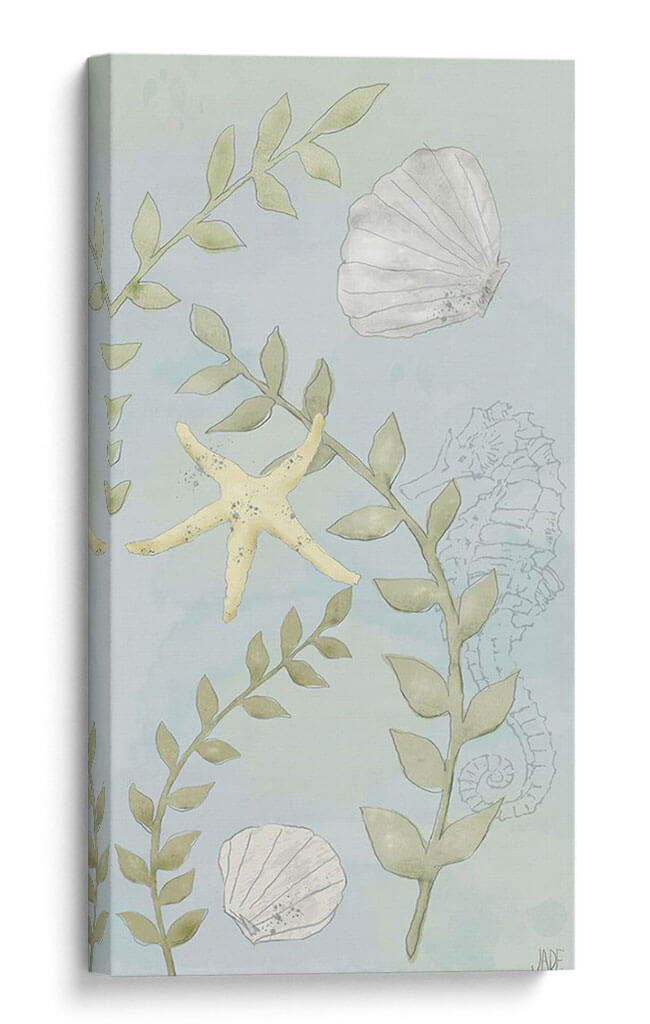 Sumérgete en la serenidad del océano con "Jardines de Agua I", una obra de arte de Jade Reynolds que captura la delicada belleza del mundo submarino. Este cuadro decorativo presenta una paleta de colores suaves y etéreos, dominada por tonos celestes y verdes agua que evocan la calma de las profundidades marinas. La composición se centra en elementos icónicos de la vida marina, como estrellas de mar amarillas y conchas blancas, entrelazados con delicadas ramas de algas de un suave verde hoja. Un sutil contorno de un caballito de mar en el fondo añade un toque de misterio y encanto. El estilo, que recuerda a una acuarela delicada, imparte una sensación de tranquilidad y ligereza, lo que lo convierte en la pieza perfecta para crear un ambiente relajante en cualquier espacio. Ideal para dormitorios, baños o salas de estar que busquen un refugio de paz y conexión con la naturaleza. Añade esta pieza de arte de pared a tu hogar y deja que la serenidad del mar te envuelva, transformando tu entorno en un oasis de calma y belleza natural. Una invitación visual a soñar con paisajes marinos tranquilos y llenos de vida.