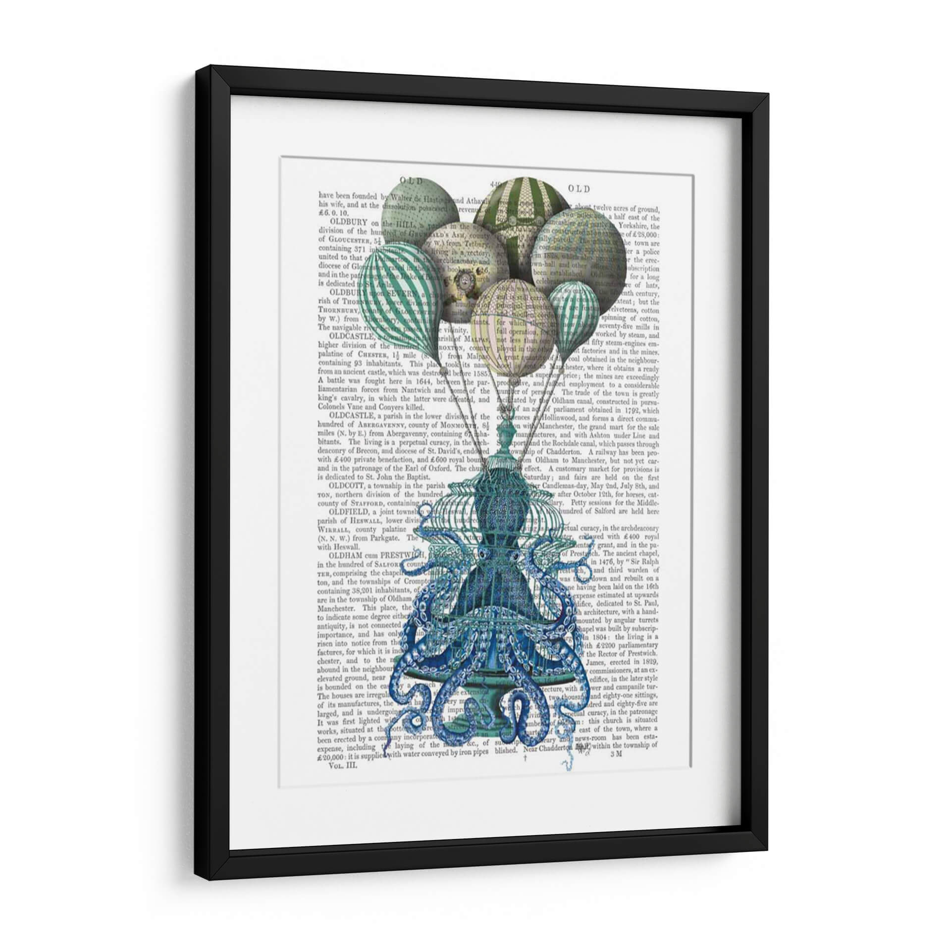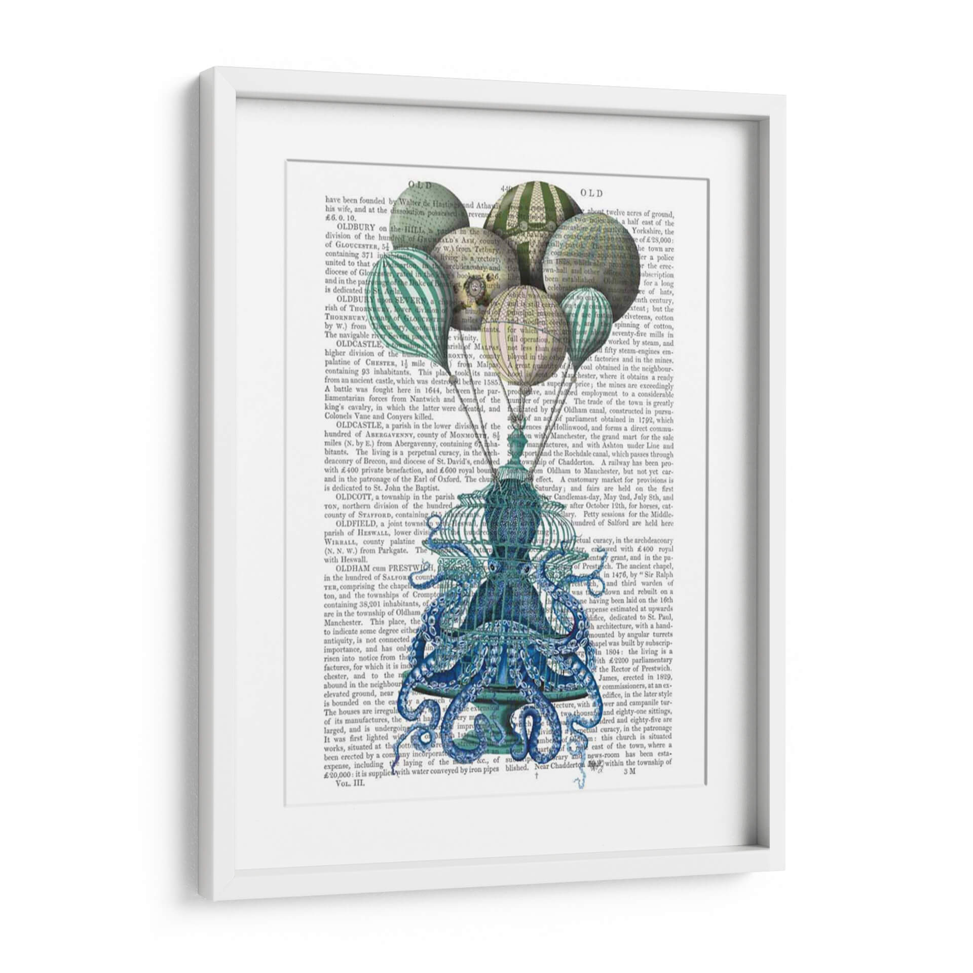 Sumérgete en el misterioso y fascinante mundo de "Jaula de Pulpo y Globos", una obra de arte contemporáneo que desafía la imaginación. Este cuadro decorativo presenta un cautivador pulpo azul vibrante, intrincadamente detallado, atrapado dentro de una jaula ornamentada que evoca la era victoriana, mientras que globos de aire caliente en tonos verdes y blancos flotan libremente por encima. La composición surrealista crea un diálogo visual entre la cautividad y la libertad, invitando a la reflexión sobre el destino y la elección. La paleta de colores, dominada por profundos azules, verdes y el contraste del texto antiguo en el fondo, aporta una sensación de profundidad y elegancia atemporal. Ideal para añadir un toque de originalidad y conversación a cualquier sala de estar, estudio u oficina moderna, este lienzo es perfecto para aquellos que aprecian el arte conceptual y las piezas con una narrativa subyacente. "Jaula de Pulpo y Globos" no es solo una decoración de pared, es una invitación a explorar lo inesperado y a embellecer tu espacio con una pieza que inspira intriga y asombro, capturando la esencia del arte audaz y conceptual.