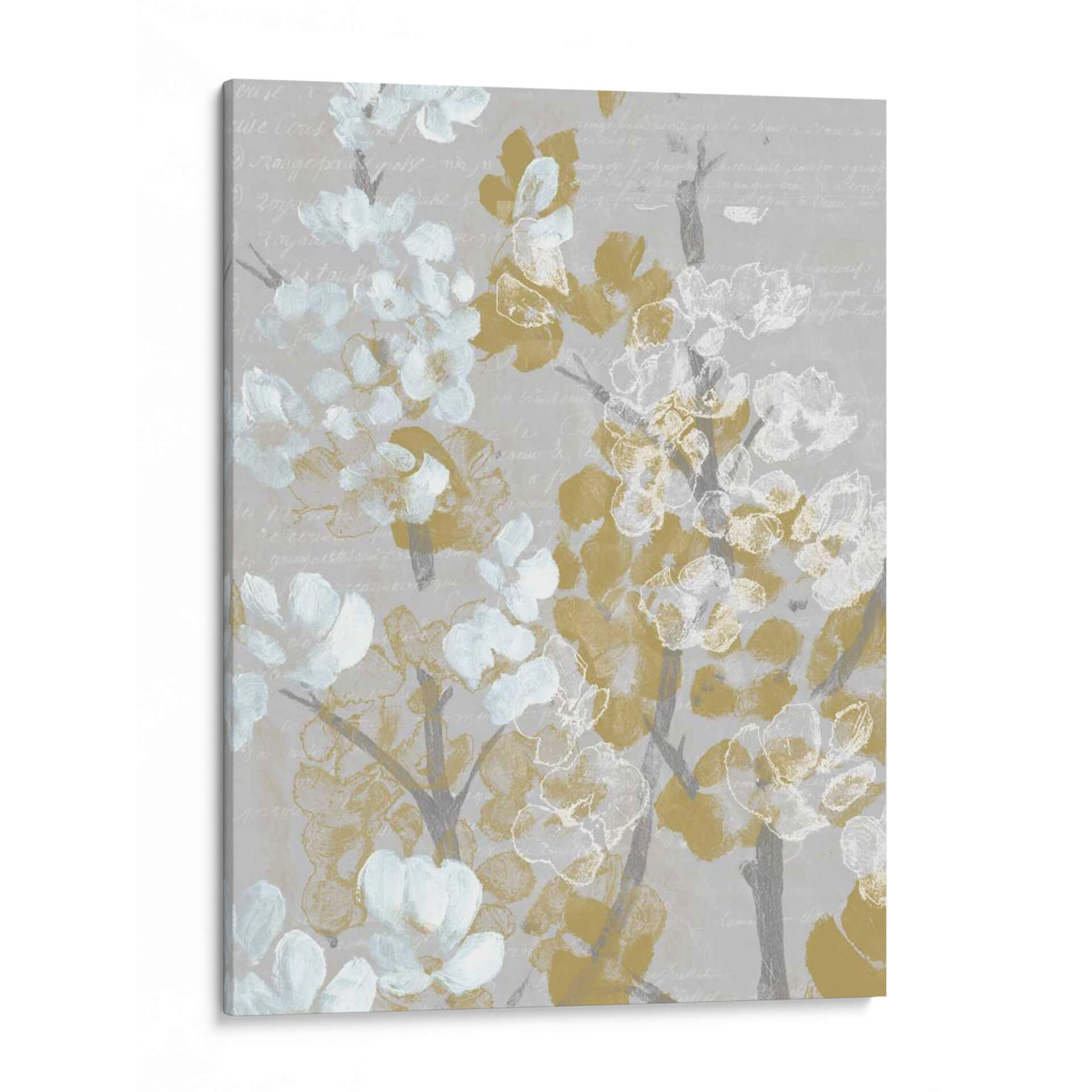 Embellece tu espacio con "Mostaza Sobre Flores Grises I", una obra de arte contemporánea que captura la delicadeza de la naturaleza con un toque moderno. Este cuadro decorativo presenta un delicado motivo floral en tonos mostaza, blanco y gris, sobre un fondo sutilmente texturizado con escritura antigua, evocando una sensación de nostalgia y serenidad. Las pinceladas audaces y gestuales de Jennifer Goldberger aportan profundidad y movimiento, creando un equilibrio visual cautivador entre lo figurativo y lo abstracto. La paleta de colores, dominada por grises neutros, acentos dorados y blancos puros, infunde una atmósfera de calma elegante y sofisticación, perfecta para cualquier rincón de tu hogar u oficina. Imagina este lienzo como un punto focal sereno en tu sala de estar, un toque de refinamiento en tu comedor, o una pieza inspiradora en tu estudio. "Mostaza Sobre Flores Grises I" es más que una simple decoración de pared; es una invitación a la contemplación y a la apreciación de la belleza efímera de las flores, reinterpreteda con una sensibilidad artística única. Añade un aire de distinción y tranquilidad a tus ambientes con esta pieza versátil que combina elementos clásicos con una ejecución contemporánea, asegurando que resuene con tu estilo personal y eleve la estética de tu espacio.