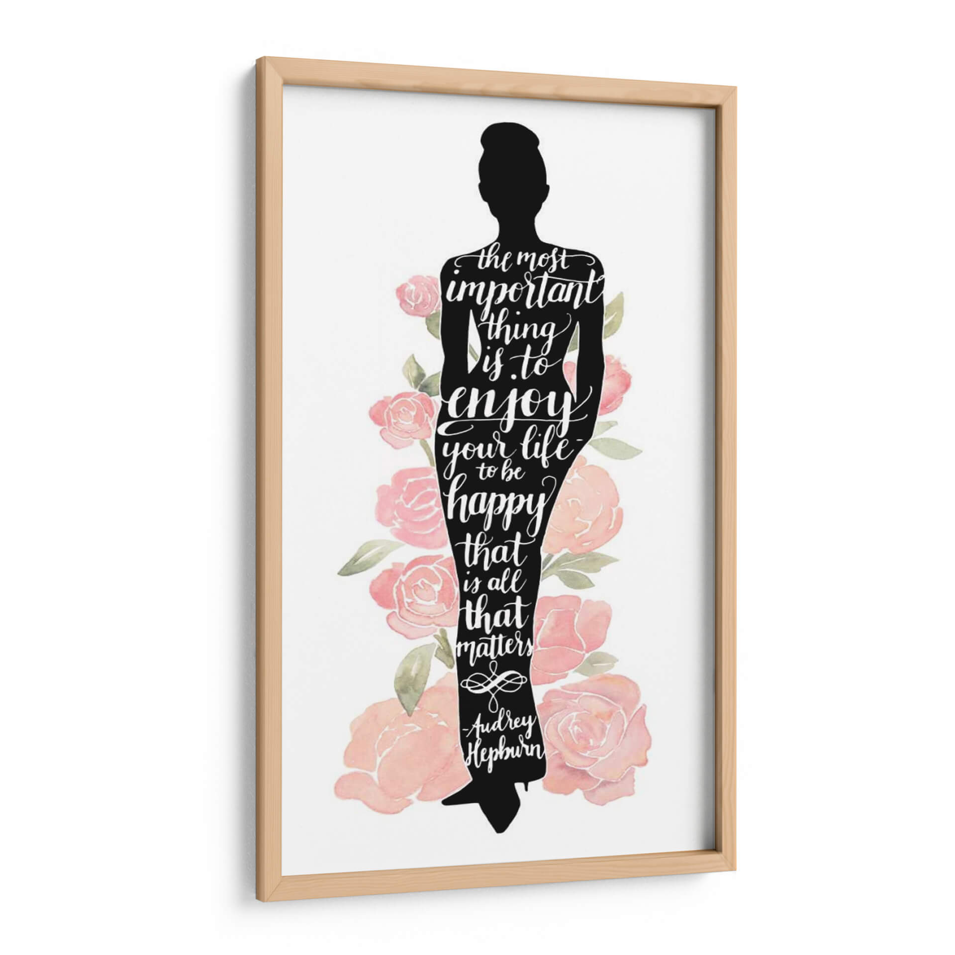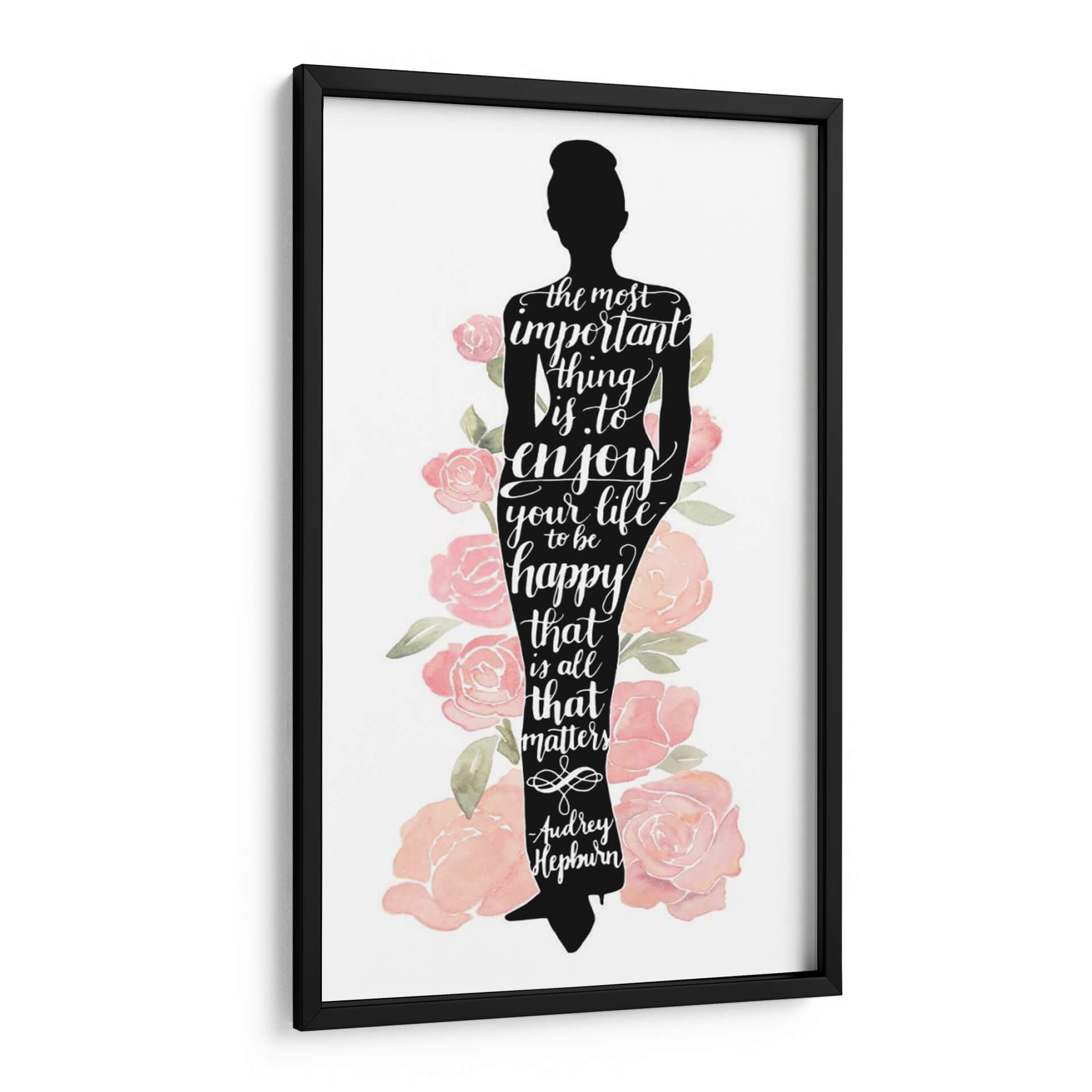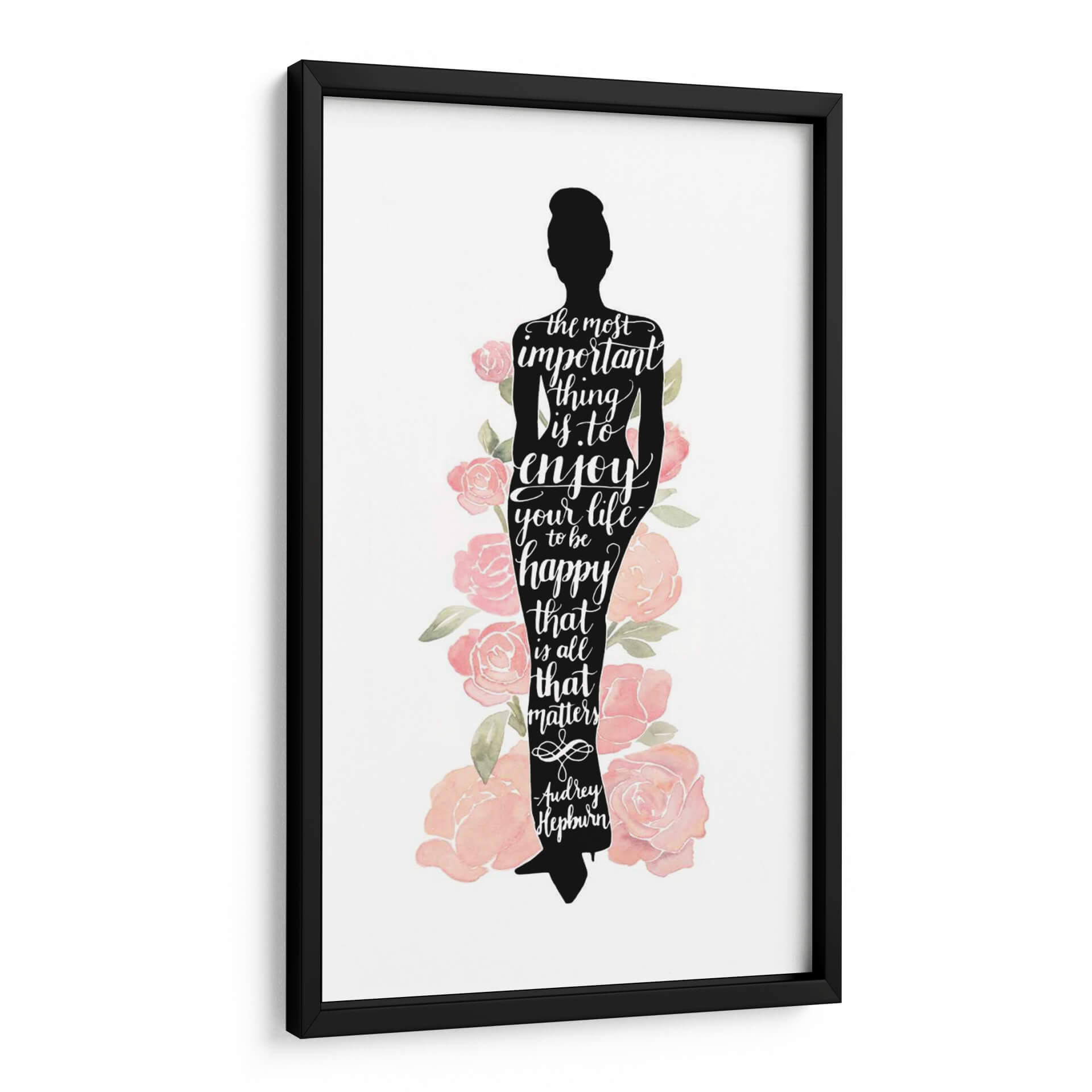 Inmortaliza un icono de estilo con este cautivador cuadro decorativo "Mujer Icónica III" de Grace Popp. La obra presenta la silueta en negro de una figura femenina elegante, evocando la sofisticación atemporal de Audrey Hepburn. Dentro de esta silueta, se despliega una cita inspiradora en caligrafía cursiva: "The most important thing is to enjoy your life to be happy that is all that matters", coronada por la firma del artista y la referencia a Hepburn. Delicadas acuarelas de rosas en tonos melocotón y rosados, con sutiles toques de verde en las hojas, rodean la figura central, aportando un toque de dulzura y romanticismo. El contraste entre la silueta nítida y las flores etéreas crea una composición visualmente atractiva y emotiva. Este cuadro decorativo es perfecto para añadir un punto de inspiración y elegancia a tu salón, dormitorio, vestidor o tocador. Su diseño versátil lo hace ideal para una variedad de estilos de decoración, desde el moderno y chic hasta el clásico o incluso el vintage. "Mujer Icónica III" no es solo una pieza de arte, sino un recordatorio diario para vivir plenamente y con felicidad, convirtiéndose en un verdadero tesoro decorativo que celebra la gracia y la sabiduría.