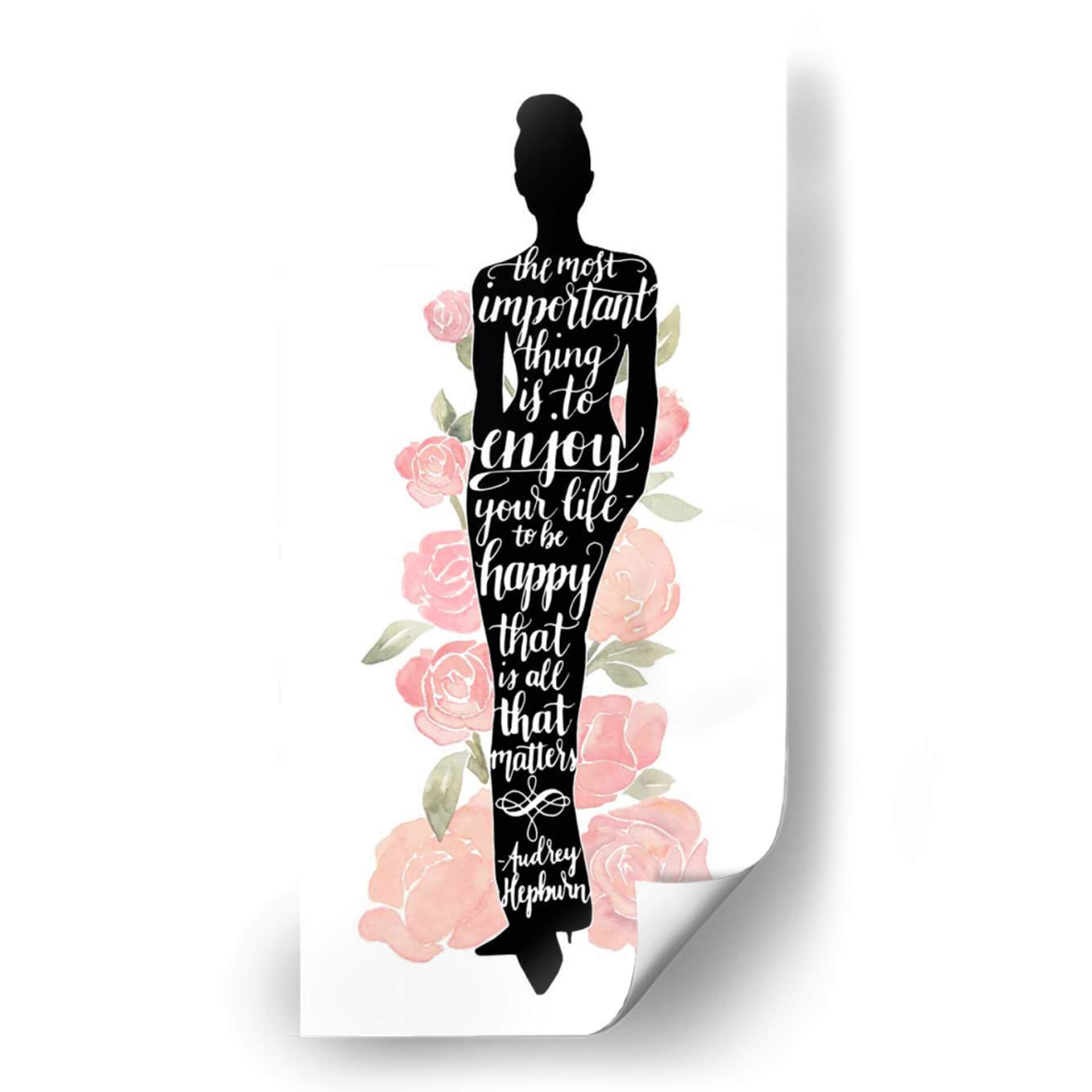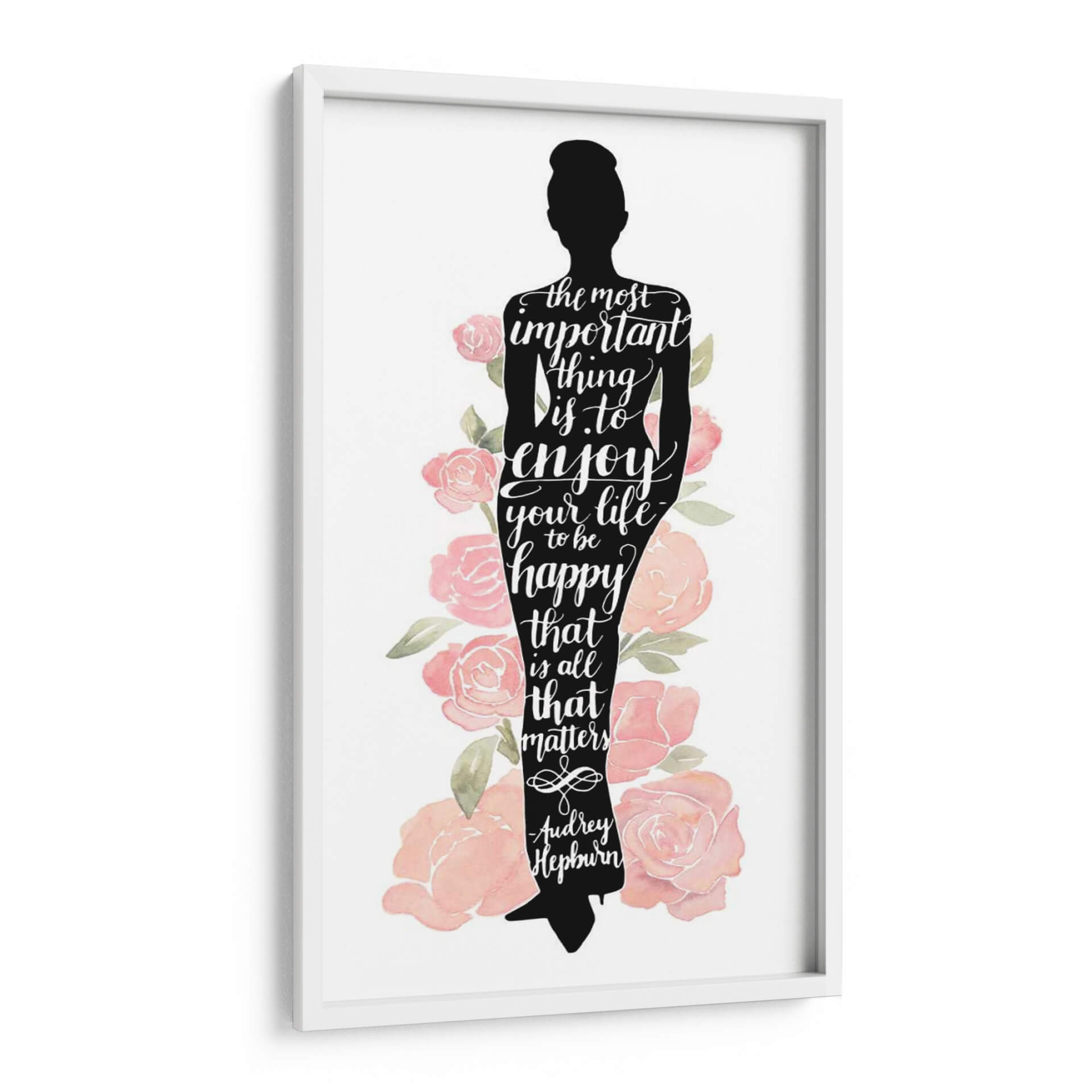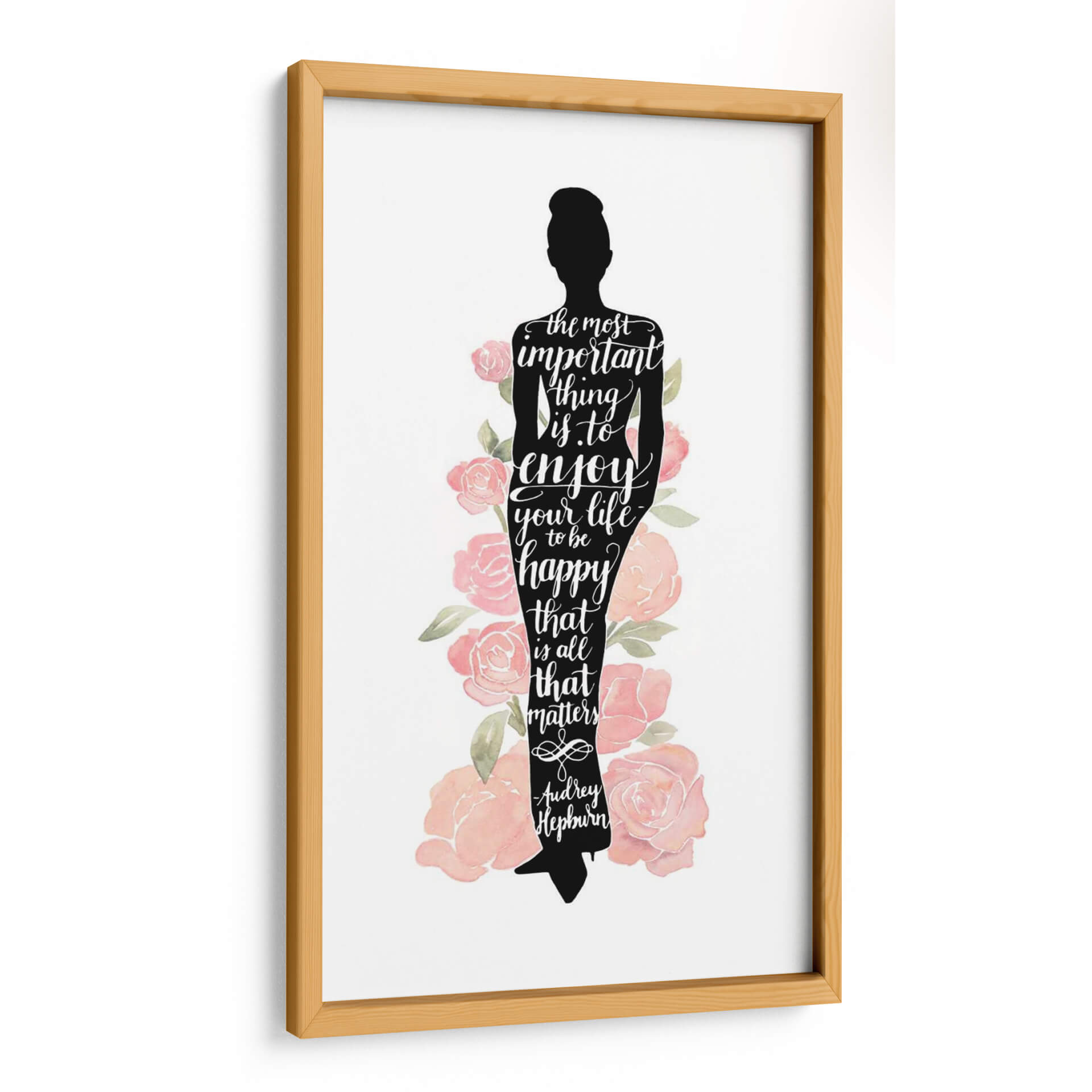 Inmortaliza un icono de estilo con este cautivador cuadro decorativo "Mujer Icónica III" de Grace Popp. La obra presenta la silueta en negro de una figura femenina elegante, evocando la sofisticación atemporal de Audrey Hepburn. Dentro de esta silueta, se despliega una cita inspiradora en caligrafía cursiva: "The most important thing is to enjoy your life to be happy that is all that matters", coronada por la firma del artista y la referencia a Hepburn. Delicadas acuarelas de rosas en tonos melocotón y rosados, con sutiles toques de verde en las hojas, rodean la figura central, aportando un toque de dulzura y romanticismo. El contraste entre la silueta nítida y las flores etéreas crea una composición visualmente atractiva y emotiva. Este cuadro decorativo es perfecto para añadir un punto de inspiración y elegancia a tu salón, dormitorio, vestidor o tocador. Su diseño versátil lo hace ideal para una variedad de estilos de decoración, desde el moderno y chic hasta el clásico o incluso el vintage. "Mujer Icónica III" no es solo una pieza de arte, sino un recordatorio diario para vivir plenamente y con felicidad, convirtiéndose en un verdadero tesoro decorativo que celebra la gracia y la sabiduría.