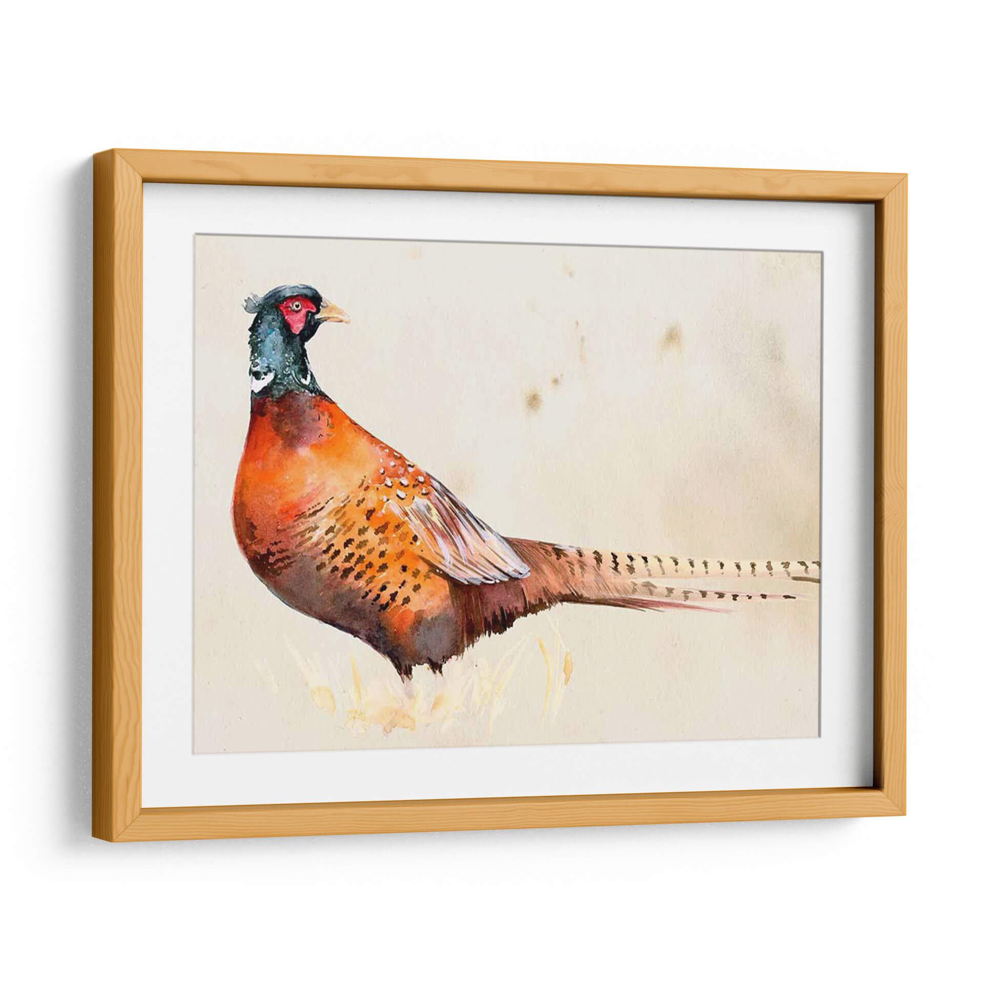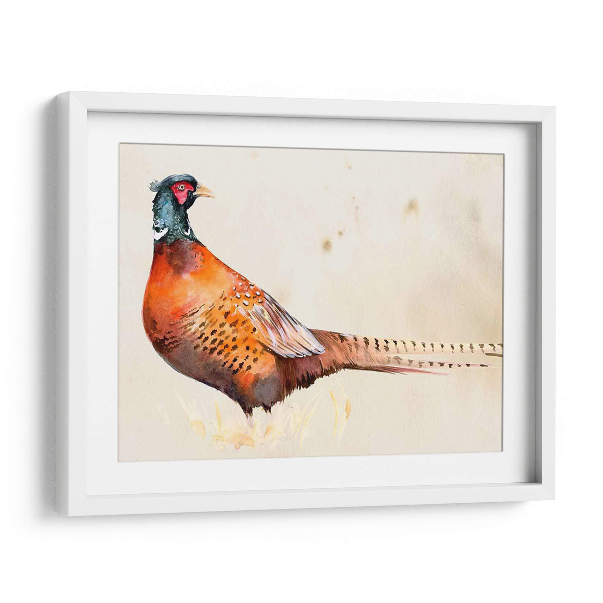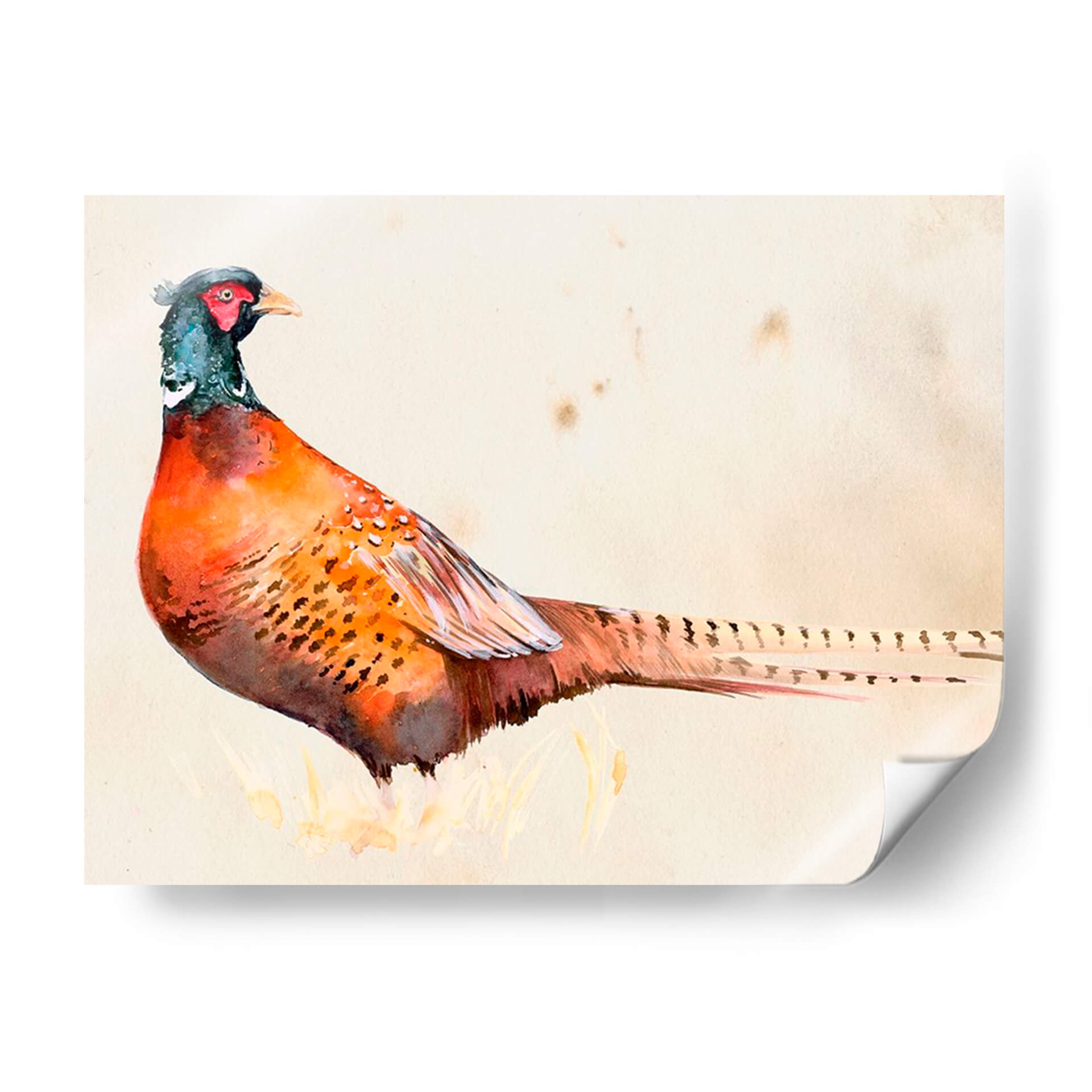Embellece tu hogar con "Pheasantry Ii", una obra de arte exquisita que captura la majestuosidad de un faisán en acuarela. Los vibrantes tonos anaranjados y rojizos del plumaje del ave contrastan sutilmente con los toques de azul verdoso en su cabeza, creando una pieza visualmente cautivadora. El fondo neutro, con sus delicadas manchas, evoca una sensación de antigüedad y elegancia, permitiendo que el sujeto principal sea el protagonista indiscutible. Esta pieza, con su estilo detallado y realista, pero a la vez etéreo gracias a la técnica de acuarela, es perfecta para añadir un toque de naturaleza y sofisticación a cualquier espacio. Imagina este cuadro decorativo en tu sala de estar, aportando un punto focal de conversación, o en tu estudio, inspirando tranquilidad y concentración. Es ideal para quienes aprecian la belleza de la fauna y buscan incorporar elementos orgánicos en su decoración interior. "Pheasantry Ii" no es solo una imagen, es una invitación a la contemplación y un tributo a la delicadeza de la naturaleza, transformando cualquier pared en una galería de arte personal.