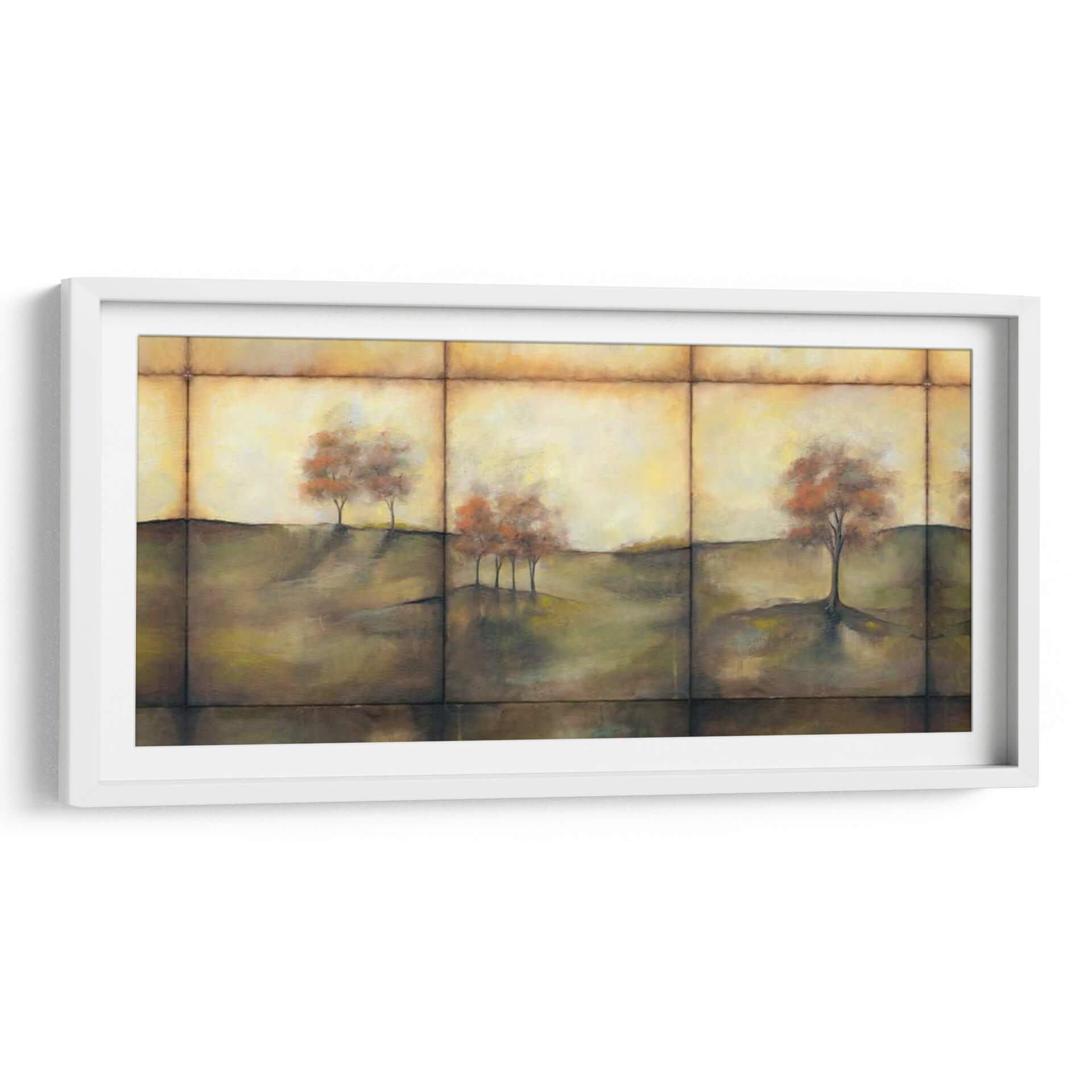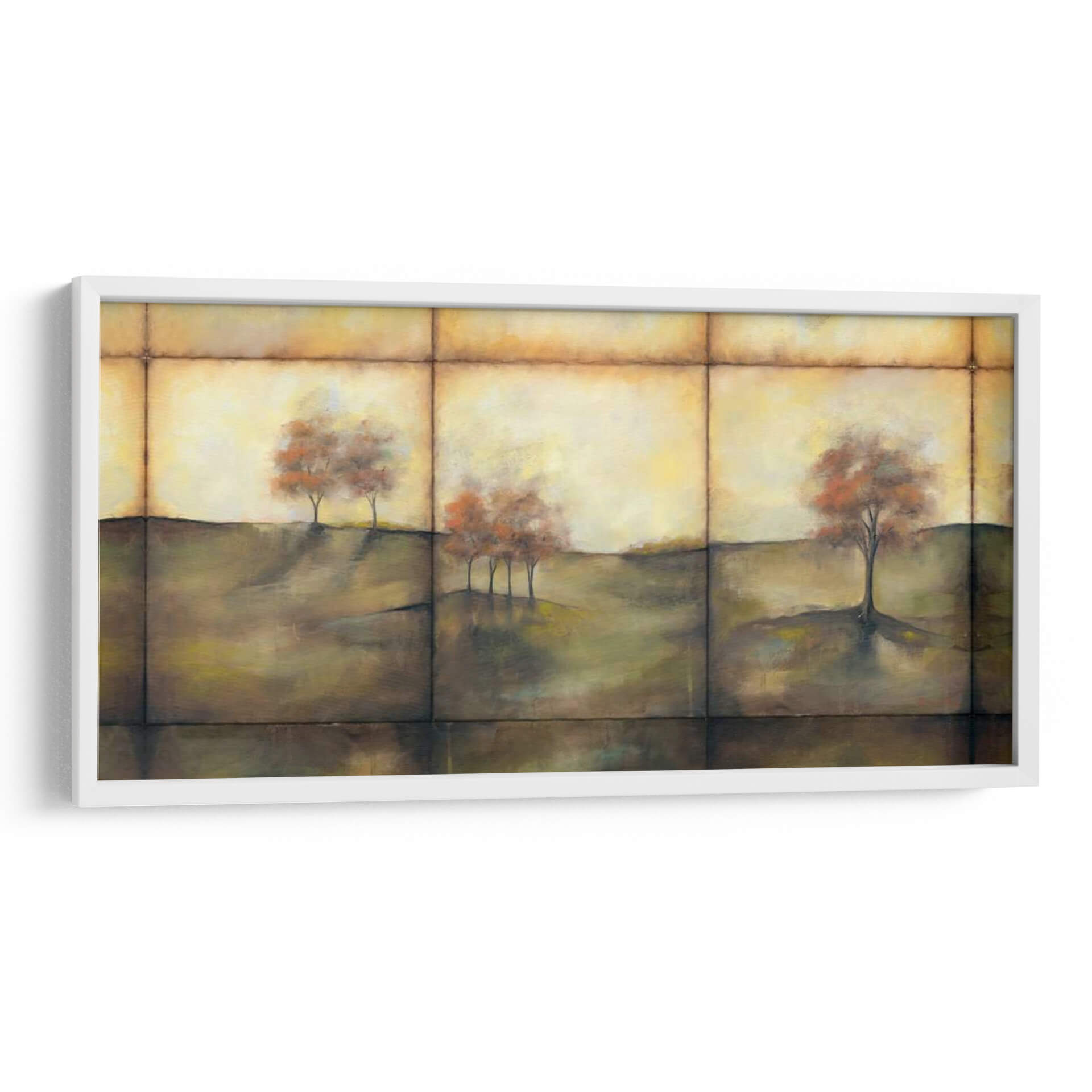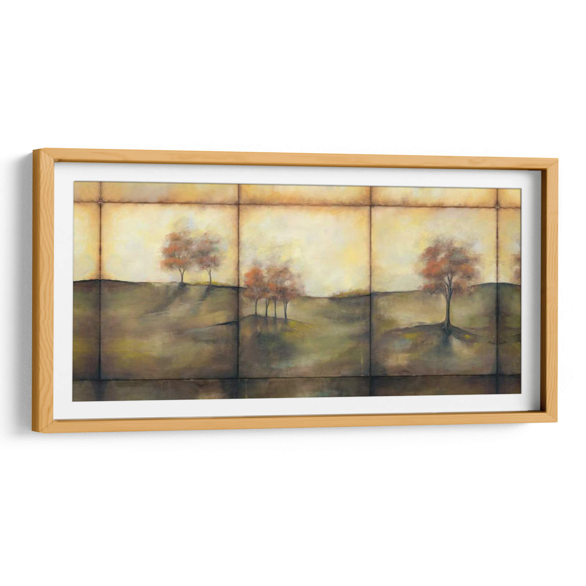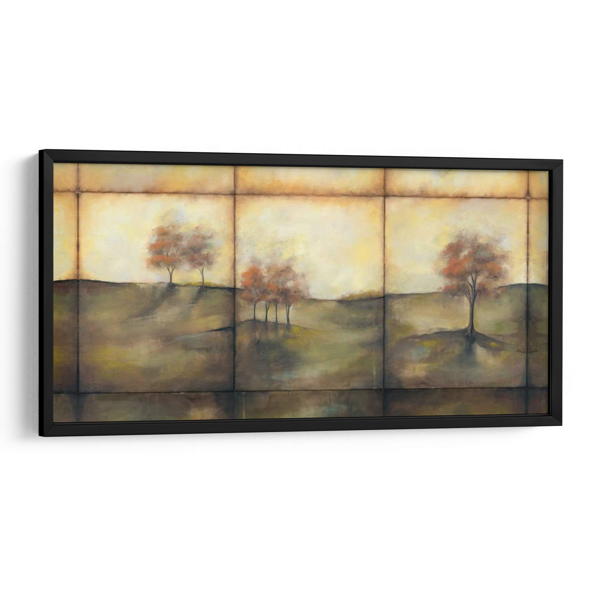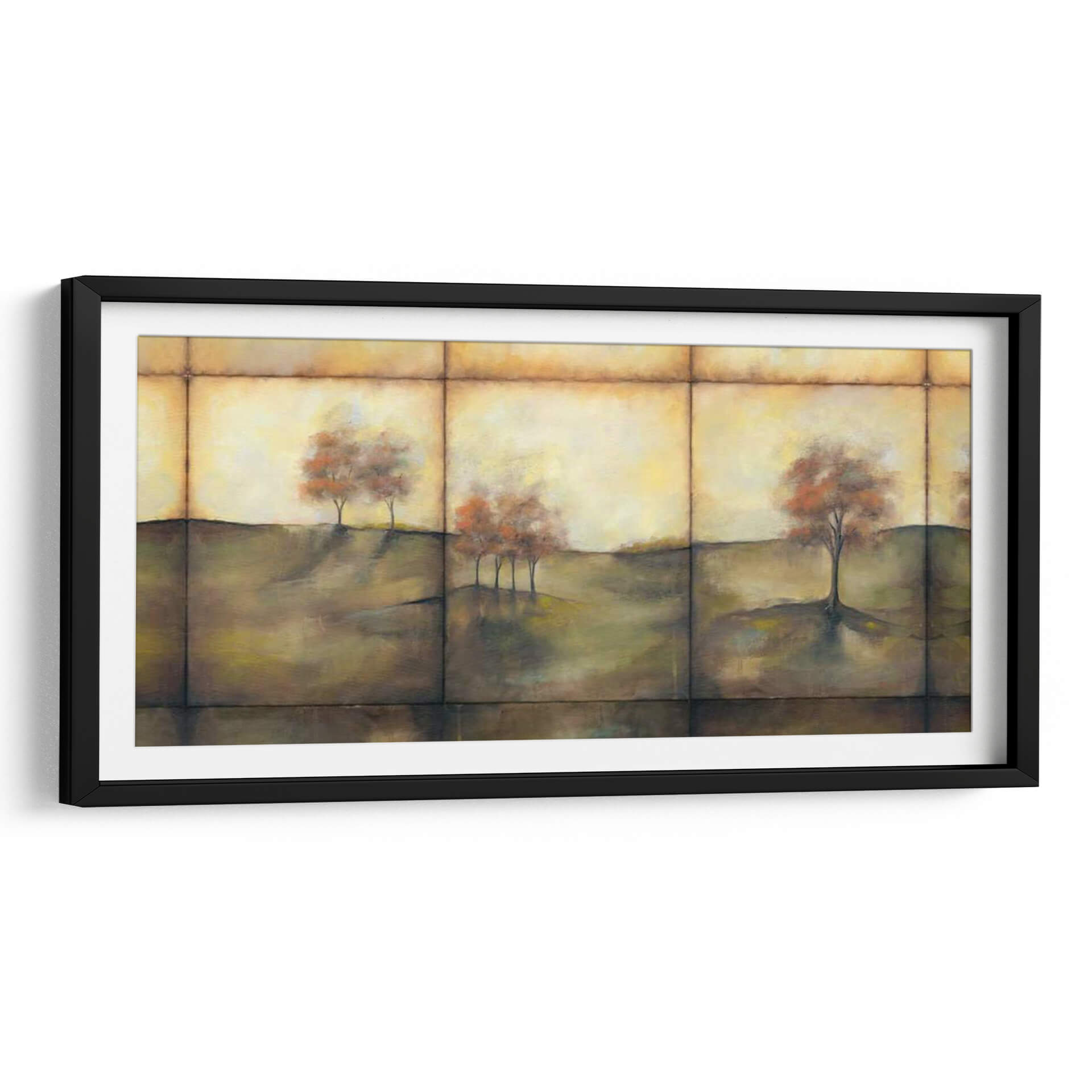 Sumérgete en la serena belleza de "Prado Otoñal I", una cautivadora obra de arte de Jennifer Goldberger que evoca la tranquilidad de una tarde de otoño. Esta pieza, dividida en tres paneles, presenta un paisaje etéreo con árboles de follaje rojizo y anaranjado que se alzan sobre colinas suavemente sombreadas. La paleta de colores, dominada por tonos tierra cálidos, ocres, dorados y verdes apagados, crea una atmósfera acogedora y melancólica, perfecta para añadir un toque de calidez a cualquier espacio. La técnica pictórica, con pinceladas sueltas y texturas sutiles, imparte una sensación de profundidad y movimiento, como si el viento otoñal soplara suavemente a través del prado. El estilo evocador y ligeramente abstracto invita a la contemplación, convirtiéndolo en un punto focal ideal para salones, comedores o estudios que busquen un refugio de paz. Este cuadro decorativo contemporáneo es una invitación a la reflexión, capturando la esencia efímera de la naturaleza en su máximo esplendor. Un elemento decorativo que transformará tu hogar en un santuario de calma y estilo.
