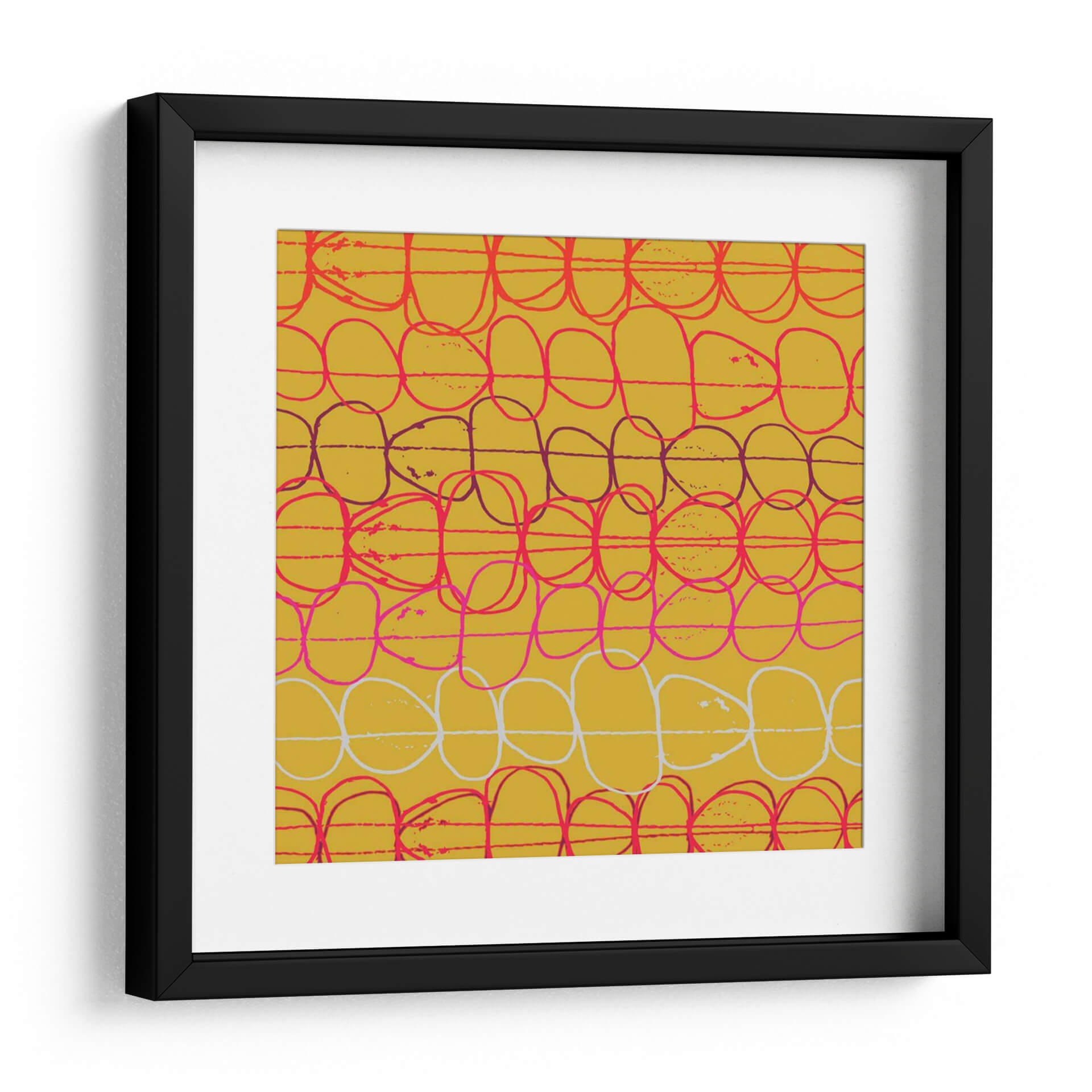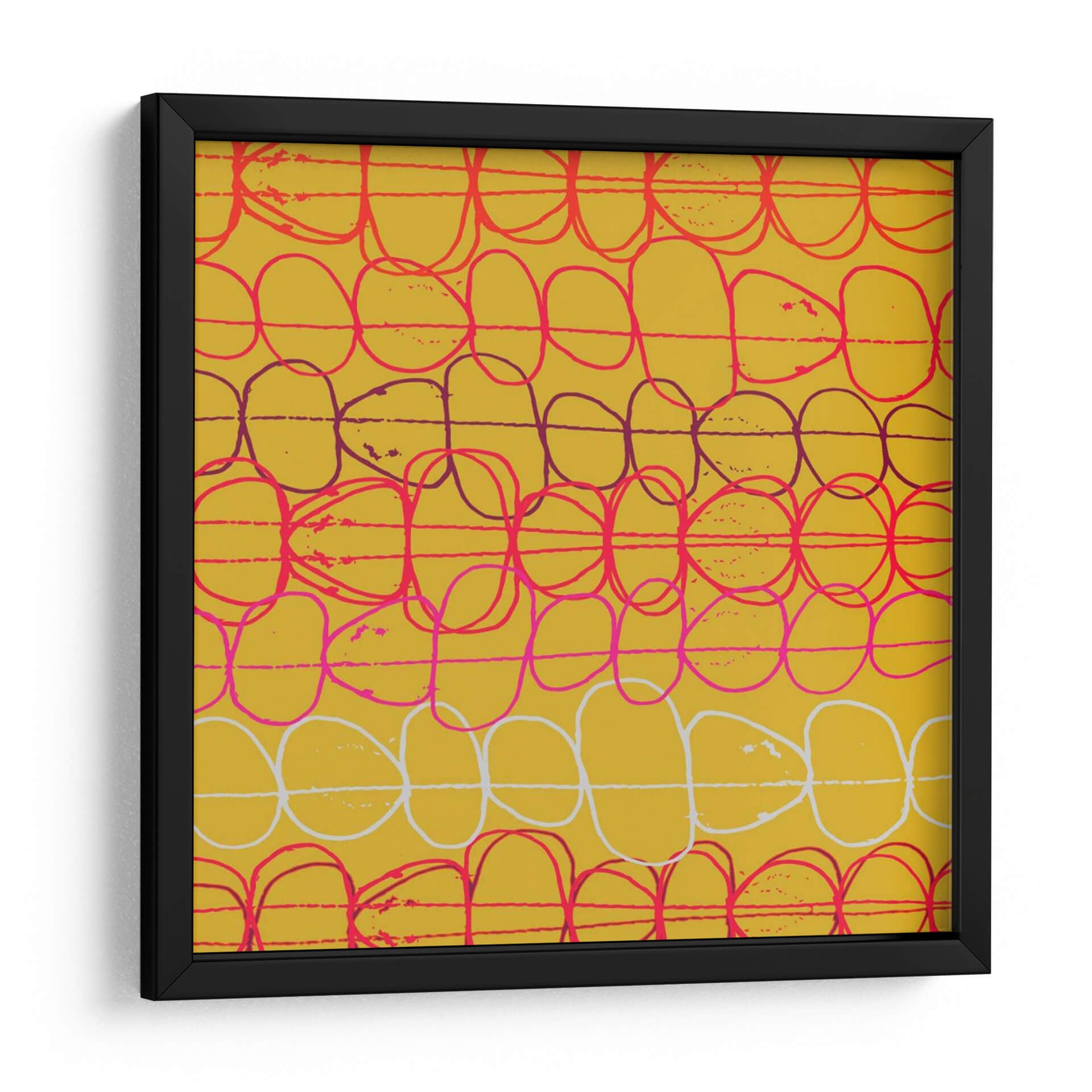Sumérgete en la vibrante energía de "Red Fall II", una obra de arte abstracto contemporáneo del artista Ali Benyon. Este cautivador cuadro decorativo presenta un patrón dinámico de formas circulares y ovaladas entrelazadas, ejecutado con trazos audaces y expresivos sobre un fondo de un cálido y radiante tono ocre. La paleta de colores se enriquece con acentos de rojo intenso, rosa vibrante y blanco nítido, creando un contraste visual que atrae la mirada y estimula los sentidos. La composición, aunque abstracta, evoca una sensación de movimiento rítmico y fluidez, similar a una cascada de elementos que caen o se entrelazan en un baile visual. "Red Fall II" es una pieza versátil que puede añadir un toque de color y modernidad a cualquier espacio. Ideal para salones, estudios o comedores que buscan un punto focal audaz y lleno de carácter. Su estilo contemporáneo se integra perfectamente en decoraciones modernas, minimalistas o eclécticas, aportando personalidad y un aire artístico único a tu hogar u oficina. Descubre la belleza del arte abstracto y transforma tus paredes con esta obra inspiradora que combina técnica y emoción.