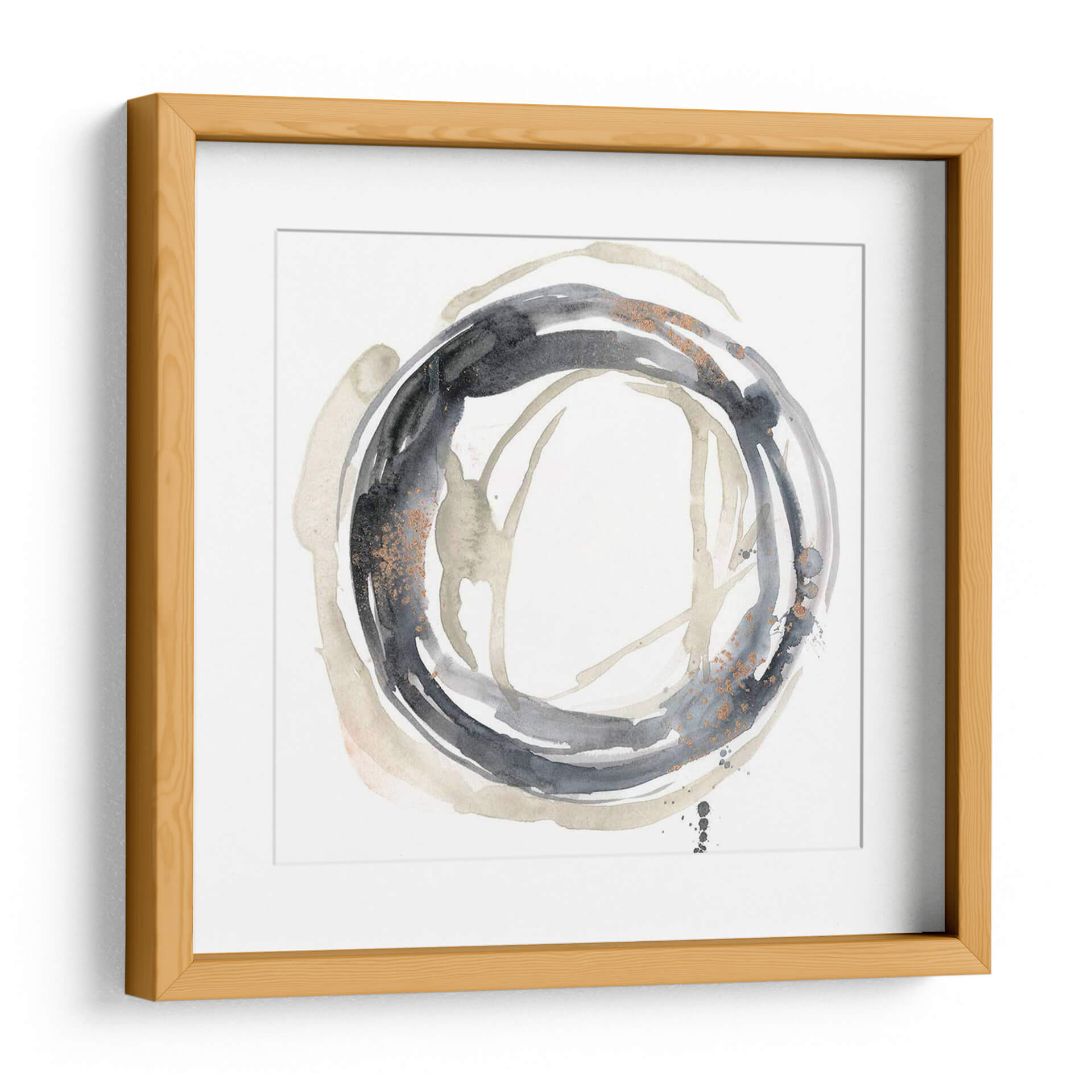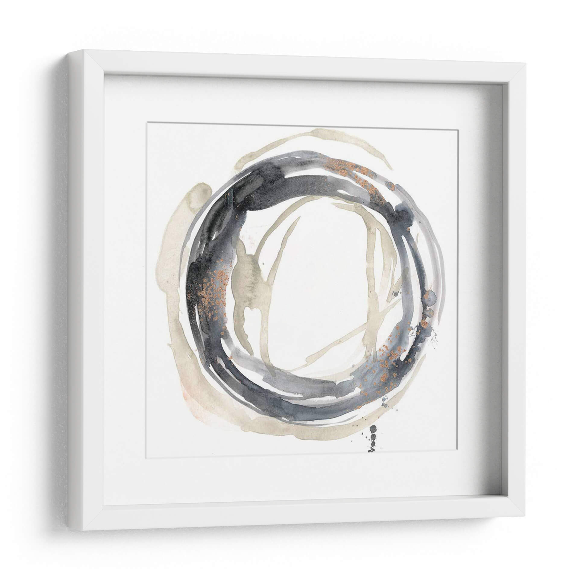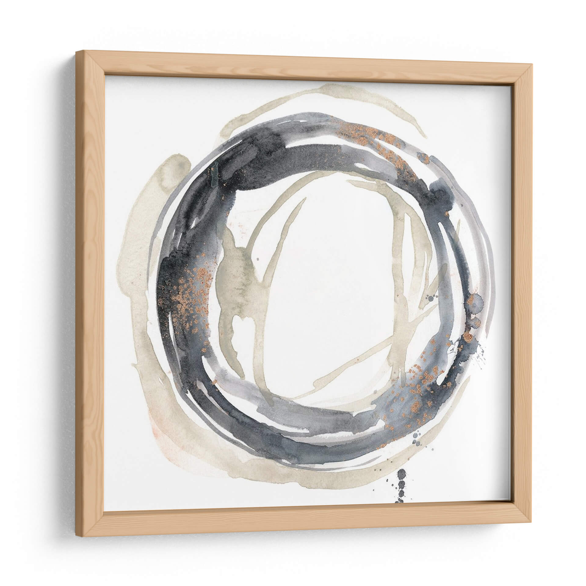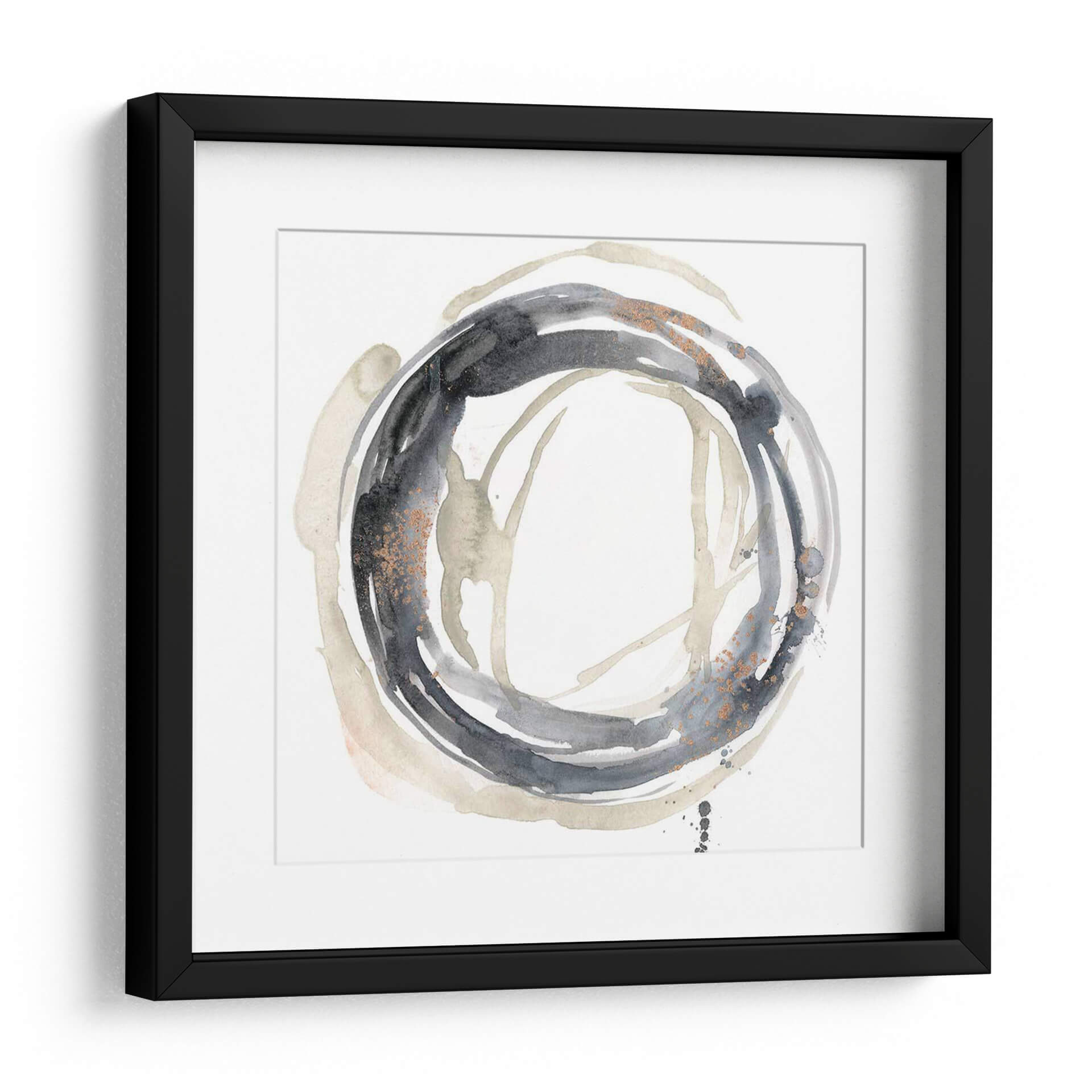 Sumérgete en la sofisticación moderna con "Revolución Neutral II", una obra de arte abstracta que redefine la elegancia en tu espacio. Esta pieza cautivadora, creada por Jennifer Goldberger, se caracteriza por su audaz círculo central en tonos carbón y grises profundos, salpicado con delicados toques de cobre que aportan una dimensión sutil y lujosa. El contraste entre las pinceladas fluidas y los detalles texturizados invita a la contemplación, creando una atmósfera de calma y misterio. Los trazos sueltos y las manchas de color en tonos tierra y beige se entrelazan, evocando una sensación de movimiento orgánico y profundidad. "Revolución Neutral II" es más que un simple cuadro decorativo; es una expresión de estilo contemporáneo que armoniza con cualquier decoración, desde la más minimalista hasta la más audaz. Su paleta neutra pero impactante la convierte en la elección perfecta para añadir un punto focal de refinamiento a tu sala de estar, oficina o dormitorio, transformando cualquier ambiente en una galería personal. Descubre cómo esta pieza puede inspirar serenidad y conversación en tu hogar.