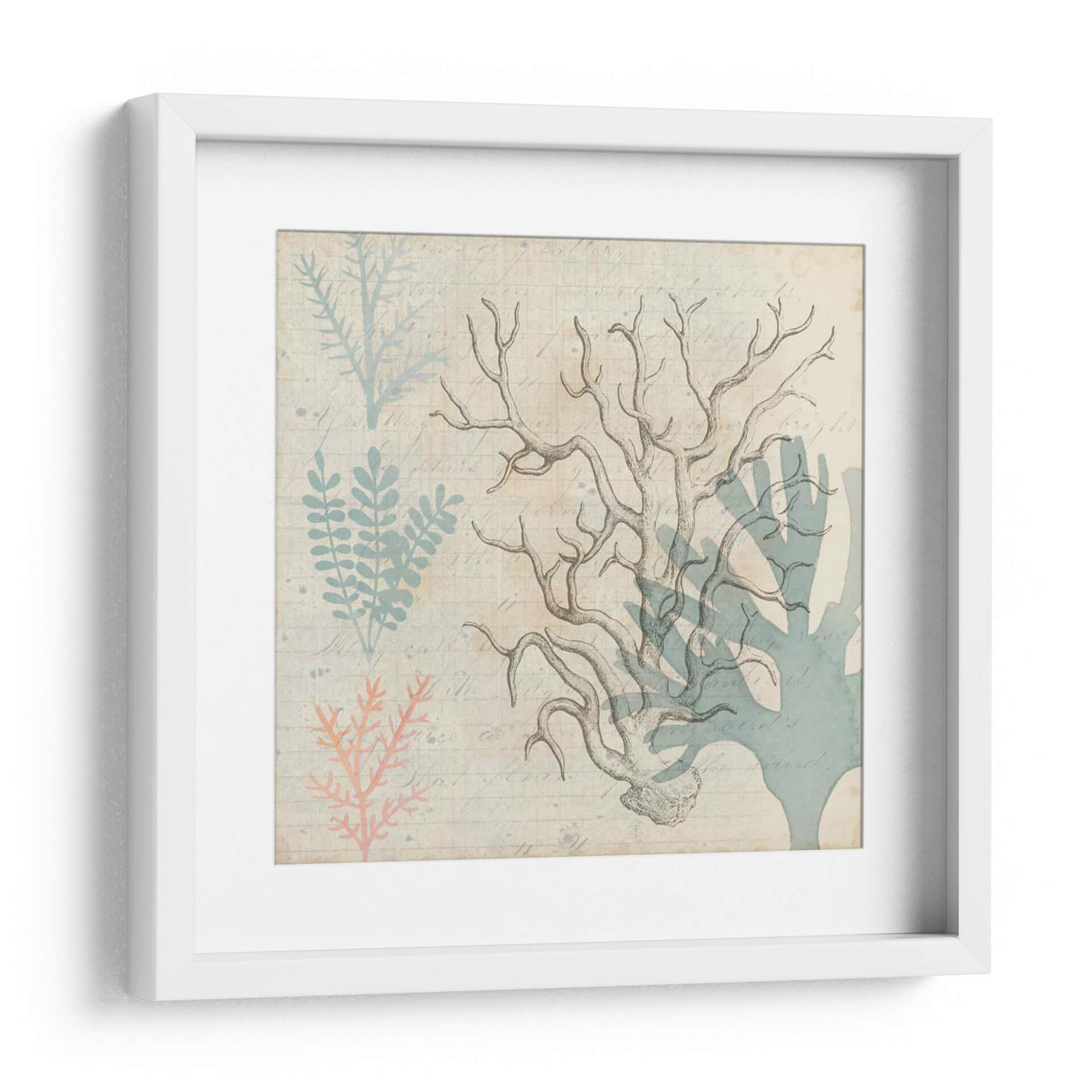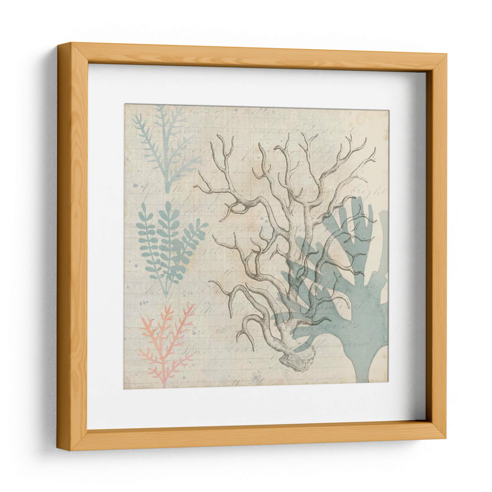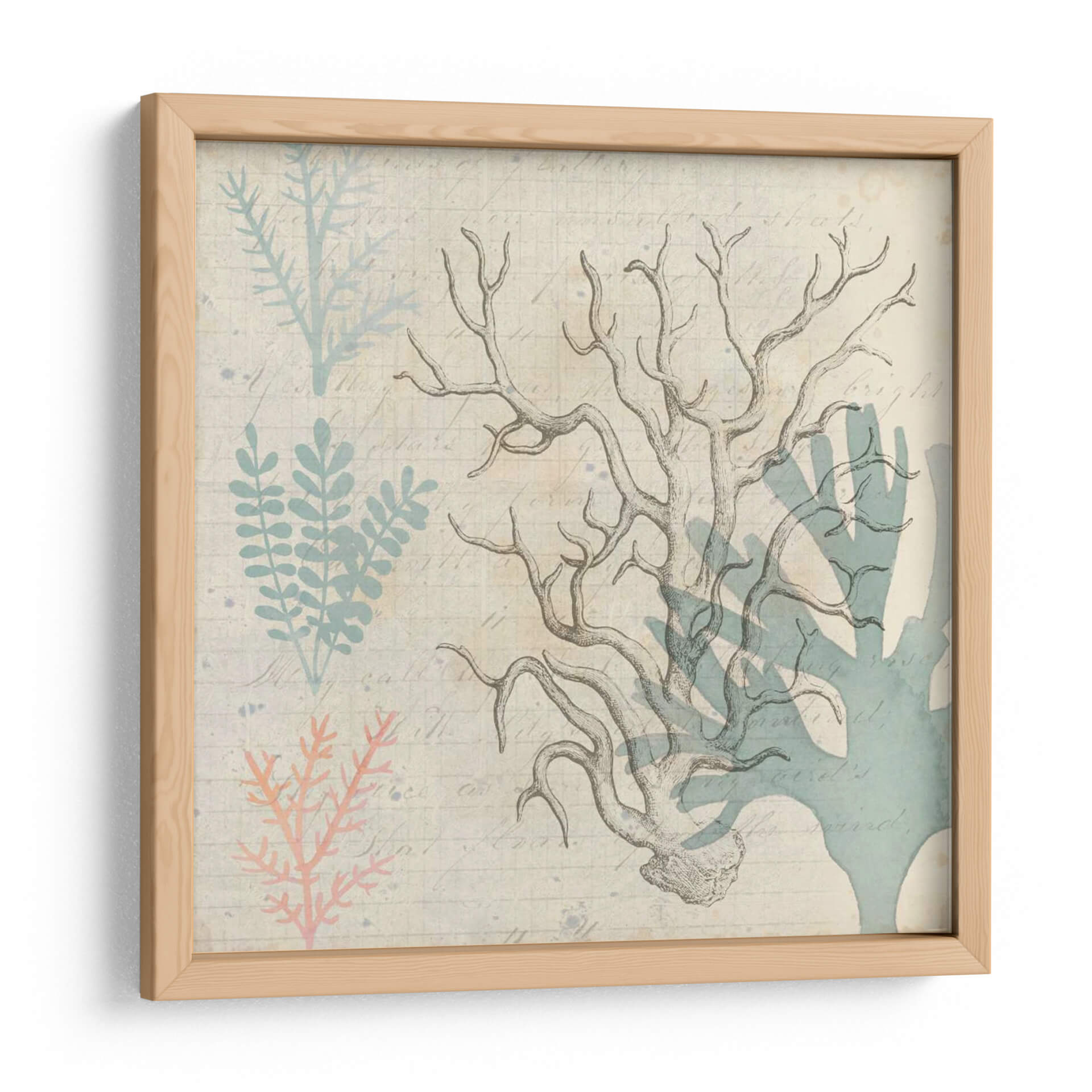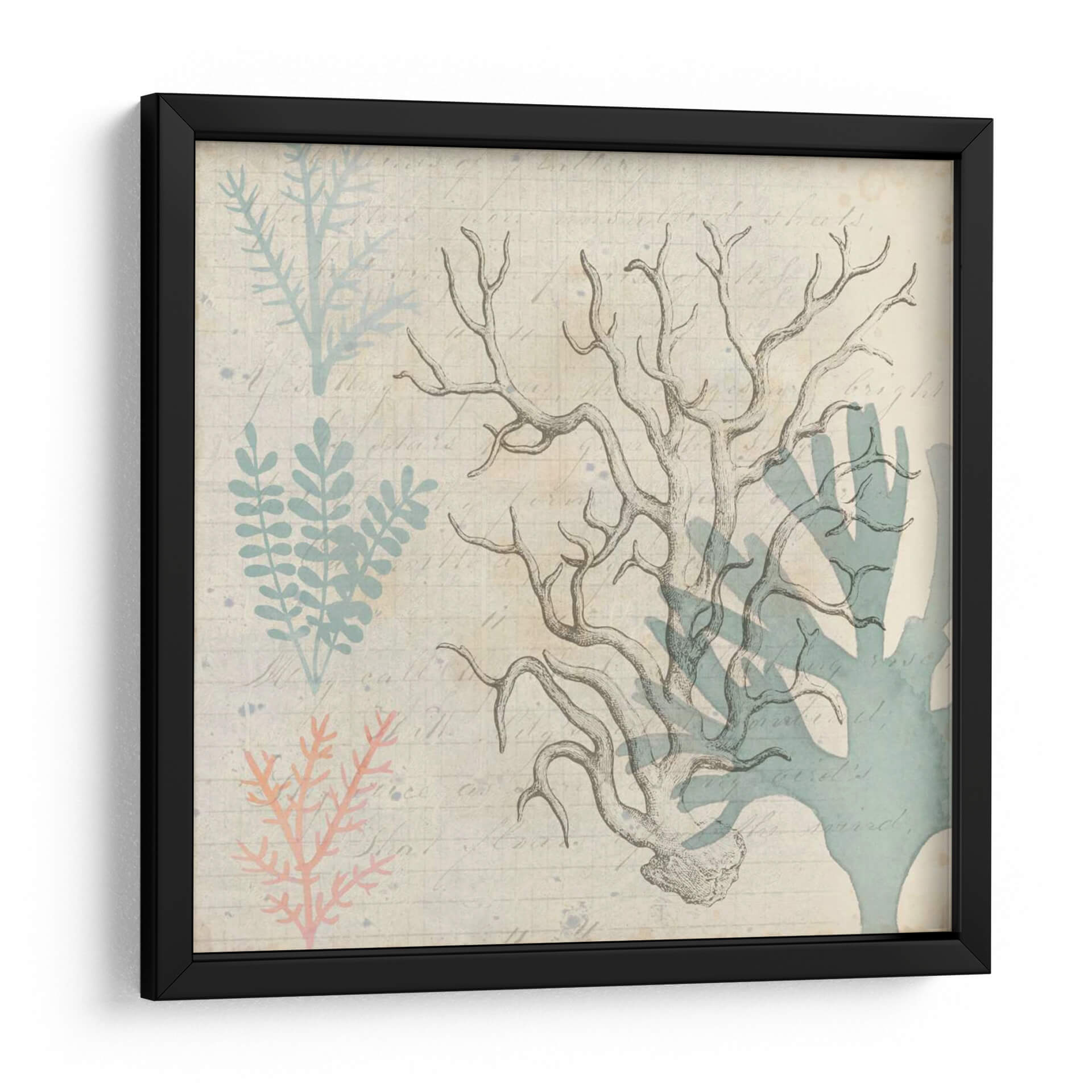 Sumérgete en la serenidad del océano con "Sea Ephemera II", una cautivadora obra de arte de Grace Popp que evoca la belleza etérea de la vida marina. Este cuadro decorativo presenta un delicado estudio de corales y algas, dibujados con un estilo que recuerda a las ilustraciones botánicas clásicas, sobre un fondo texturizado que simula papel antiguo con escritura desvanecida. La paleta de colores suaves, dominada por tonos tierra, azules pálidos y acentos coralinos, crea una atmósfera de calma y nostalgia, transportando al espectador a las profundidades tranquilas del mar. La composición, centrada en la intrincada ramificación de un coral principal y rodeada de formas de vegetación marina más sutiles, ofrece un equilibrio visual armonioso. Ideal para infundir una sensación de paz y conexión con la naturaleza en tu hogar u oficina, este cuadro es perfecto para quienes buscan añadir un toque de elegancia orgánica y serenidad a su decoración. Su diseño atemporal lo convierte en una pieza versátil, capaz de complementar tanto espacios modernos como decoraciones más tradicionales, aportando una nota de sofisticación discreta y encanto marino.
