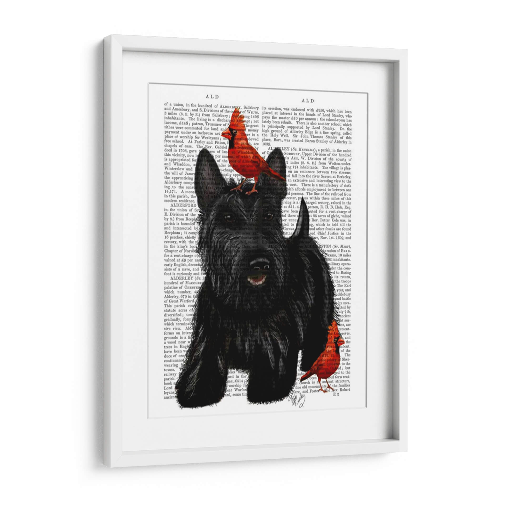 Este cautivador cuadro decorativo presenta un terrier escocés de pelaje negro y denso, con una expresión vivaz y ojos penetrantes. La obra se asienta sobre un fondo que evoca páginas de libros antiguos, aportando un toque de historia y profundidad. Dos vibrantes pájaros rojos, posados elegantemente sobre la cabeza del perro y en la parte inferior derecha, añaden un contraste de color sorprendente y un toque de naturaleza inesperado. La combinación de la textura del pelaje del perro, la delicadeza de las aves y el fondo de texto crea una composición visualmente rica y equilibrada. Este arte de pared es ideal para amantes de los animales, especialmente de la raza terrier escocés, y para aquellos que aprecian un estilo que fusiona lo clásico con lo contemporáneo. Su atmósfera es a la vez juguetona y sofisticada, lo que lo convierte en una pieza perfecta para salones, estudios u oficinas, añadiendo personalidad y un punto de conversación a cualquier espacio. La paleta de colores, dominada por los tonos oscuros del perro y el fondo, se ve realzada por los vivos toques rojos, creando una pieza llamativa y memorable que invita a la contemplación.