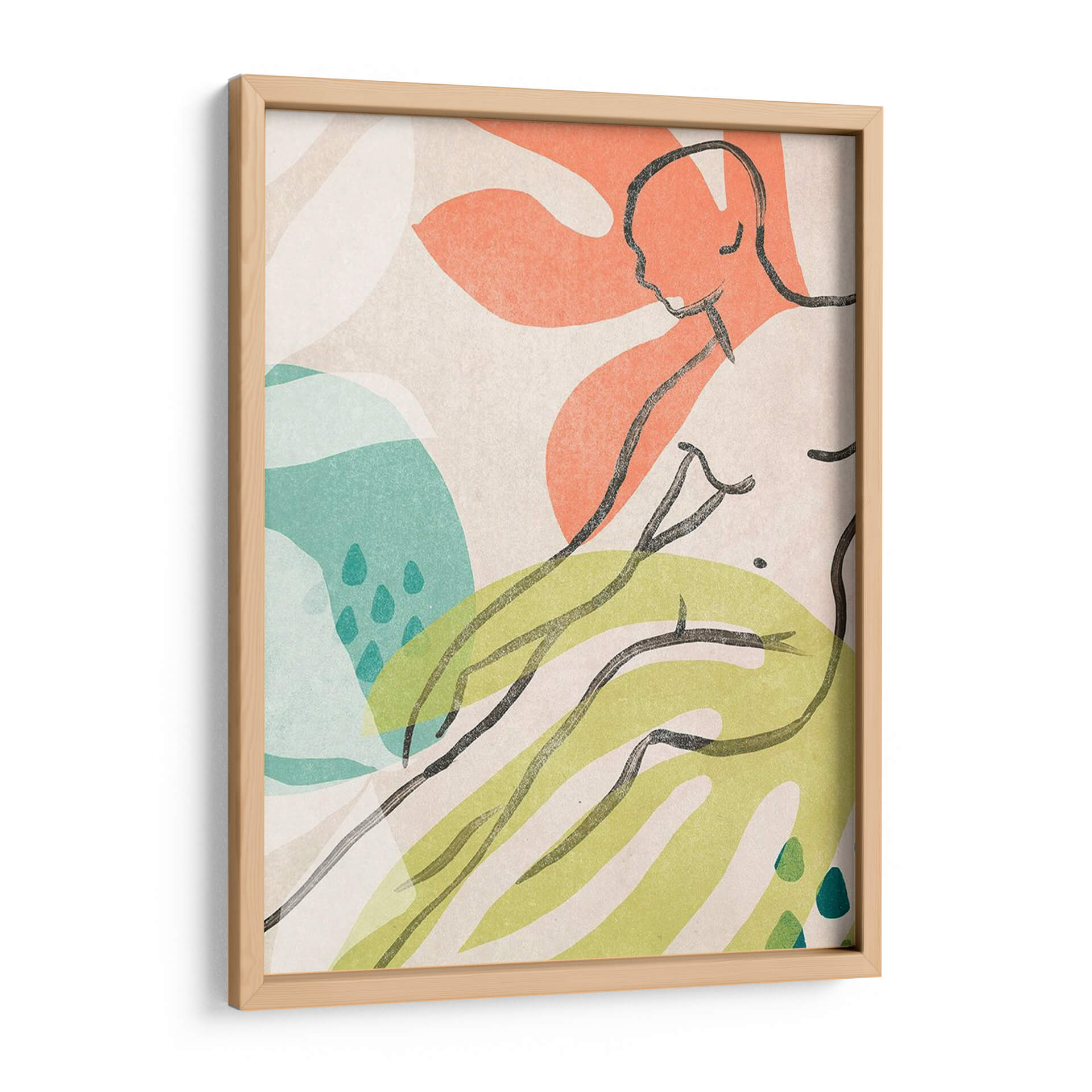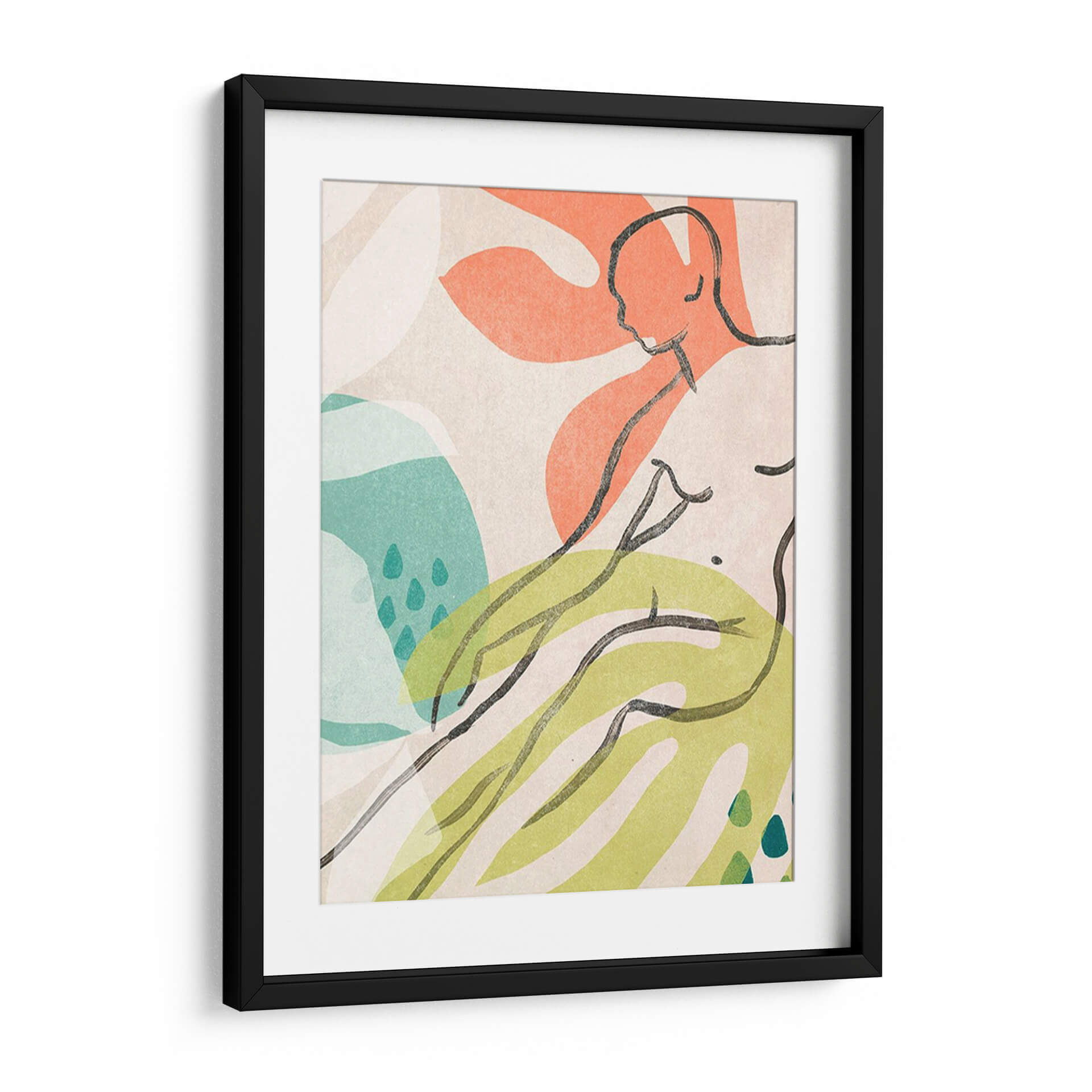 Sumérgete en la serenidad y la forma con "Tropical Desnudo IV", una obra de arte contemporáneo que fusiona la delicadeza de la figura humana con elementos abstractos de inspiración natural. La artista June Erica Vess crea una composición armoniosa donde líneas fluidas en negro trazan la silueta de una figura recostada, evocando una sensación de calma y contemplación. La paleta de colores, dominada por tonos tierra suaves, toques vibrantes de coral y verde lima, y acentos de turquesa, añade profundidad y vitalidad a la pieza. Los bloques de color orgánicos y las texturas sutiles complementan la elegancia minimalista de los trazos, resultando en un cuadro decorativo que invita a la reflexión y al disfrute estético. Esta obra es ideal para espacios que buscan un toque de sofisticación natural, como salas de estar modernas, dormitorios acogedores o estudios creativos, aportando una atmósfera de tranquilidad y conexión con la naturaleza. "Tropical Desnudo IV" no es solo una imagen, sino una invitación a explorar la belleza de la forma y el color en su expresión más pura, convirtiéndose en un punto focal cautivador que eleva cualquier ambiente.
