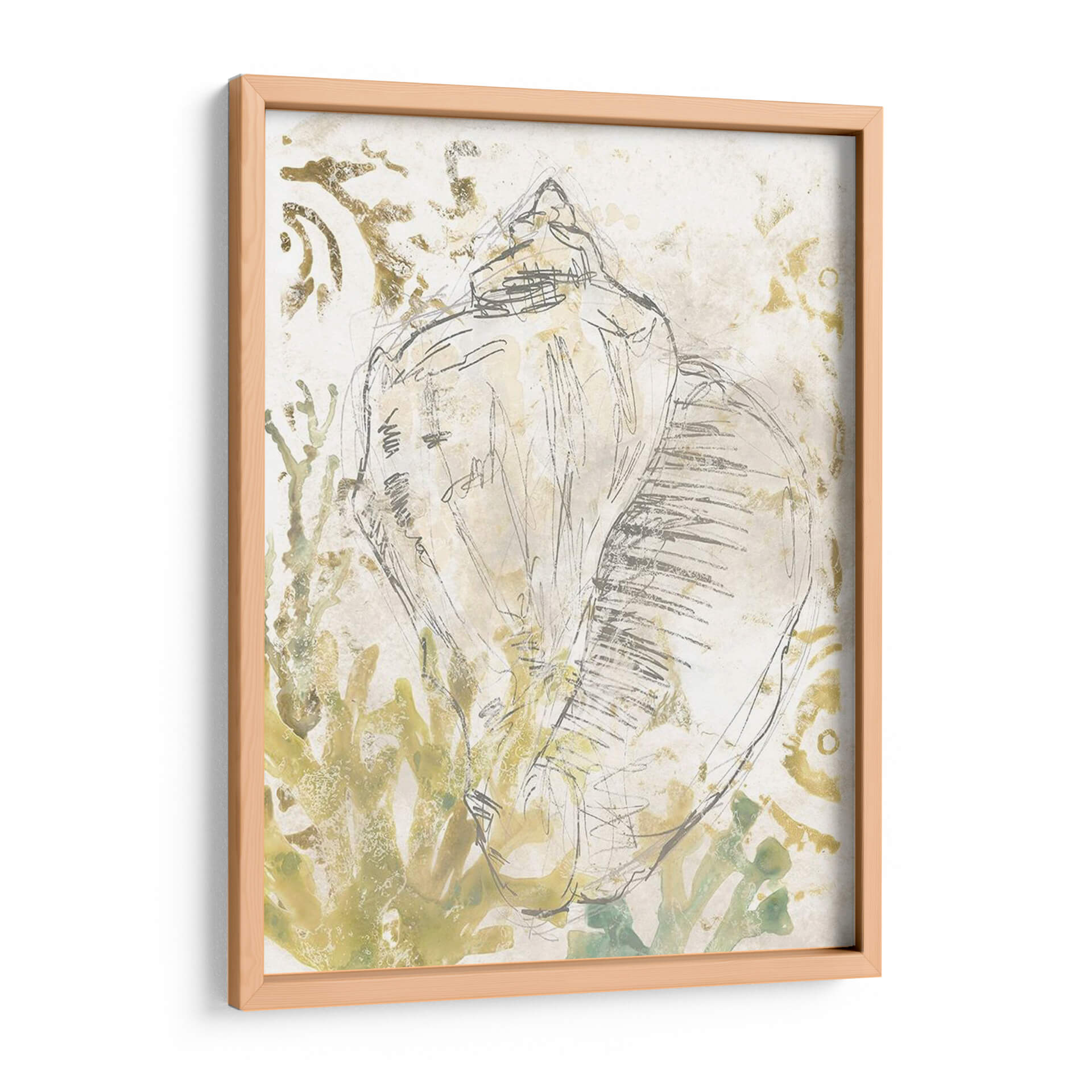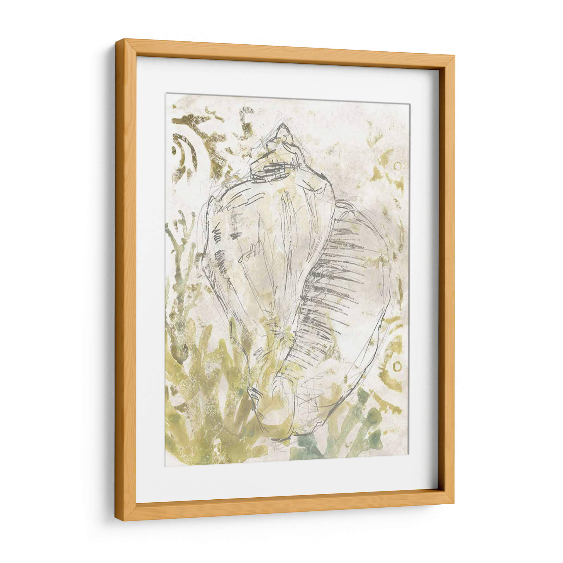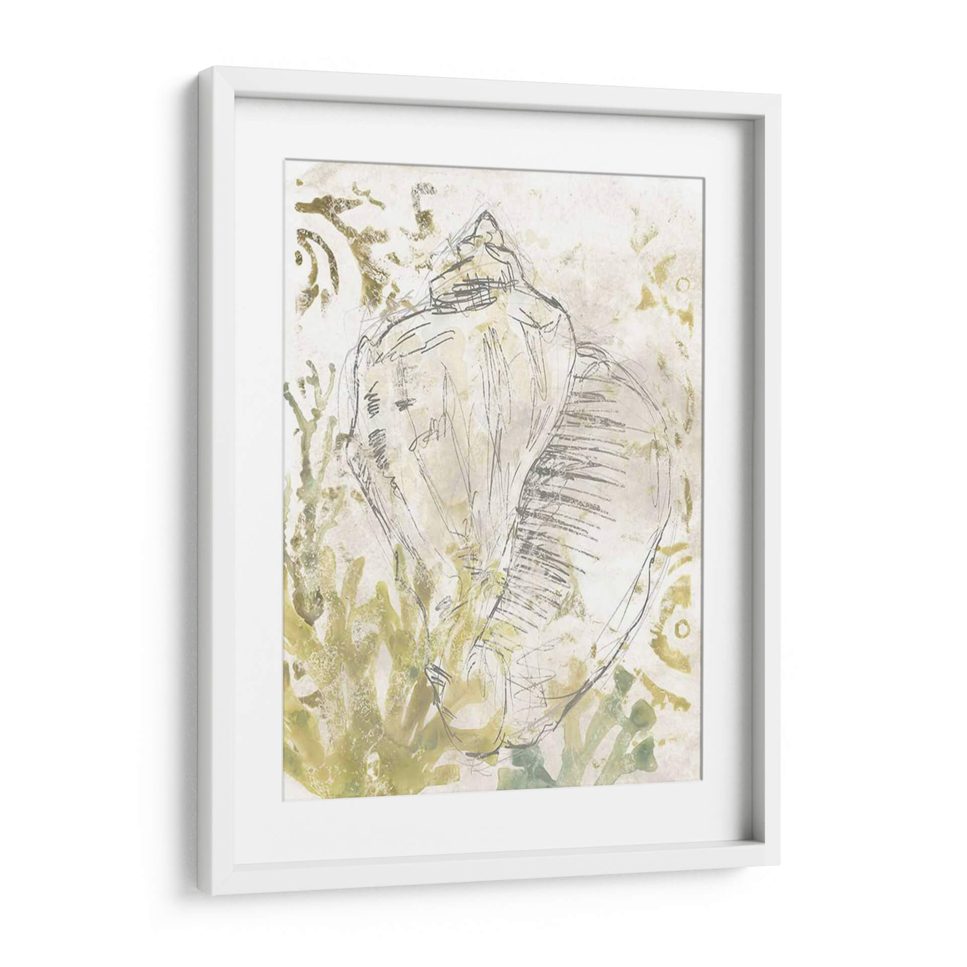 Sumérgete en la serenidad costera con "Verdant Shell Fresco I", una obra de arte que captura la delicadeza y la forma orgánica de una caracola. La artista June Erica Vess utiliza una técnica mixta que combina bocetos a lápiz con lavados de acuarela en tonos tierra y verdes suaves, creando una atmósfera etérea y tranquila. Las líneas fluidas y gestuales del boceto principal de la concha contrastan con las texturas sutiles y los patrones orgánicos del fondo, que evocan algas marinas o formaciones rocosas erosionadas por el mar. Esta pieza es ideal para quienes buscan infundir calma y una conexión con la naturaleza en su hogar u oficina. Su paleta de colores neutros y terrosos la hace increíblemente versátil, complementando una amplia gama de estilos decorativos, desde el bohemio hasta el costero o el minimalista moderno. "Verdant Shell Fresco I" no es solo una representación de un objeto marino, sino una invitación a la contemplación y a la apreciación de la belleza sutil del mundo natural. Un cuadro decorativo perfecto para añadir un toque de sofisticación orgánica a cualquier estancia.