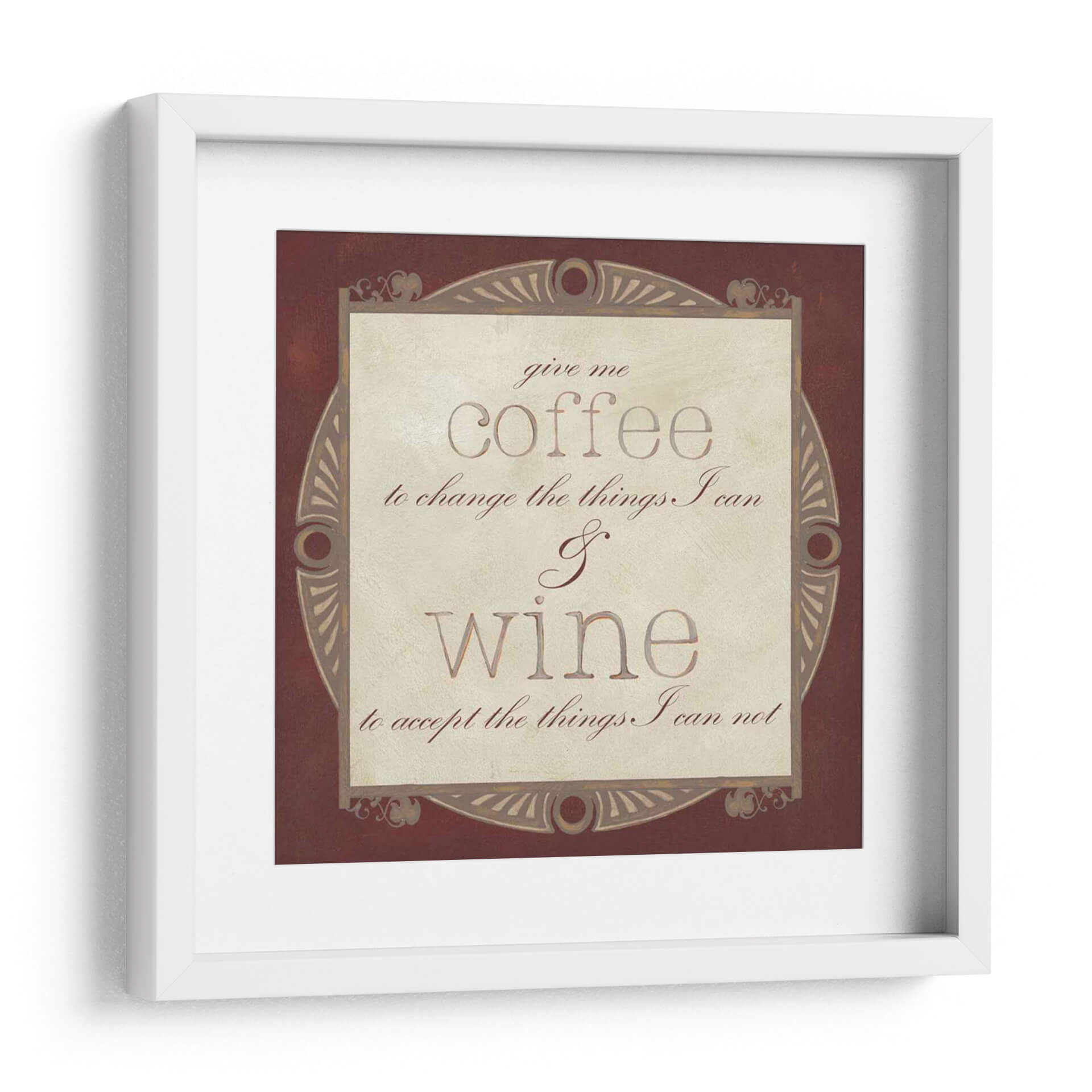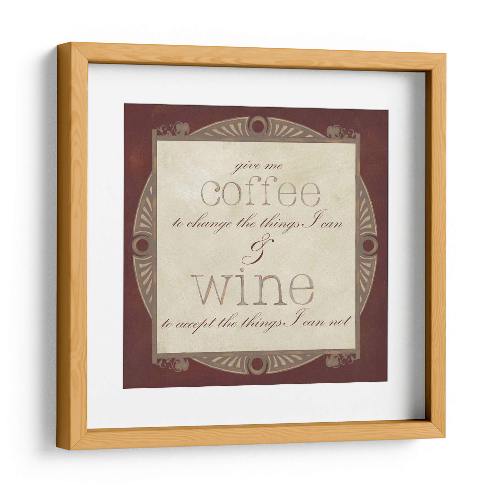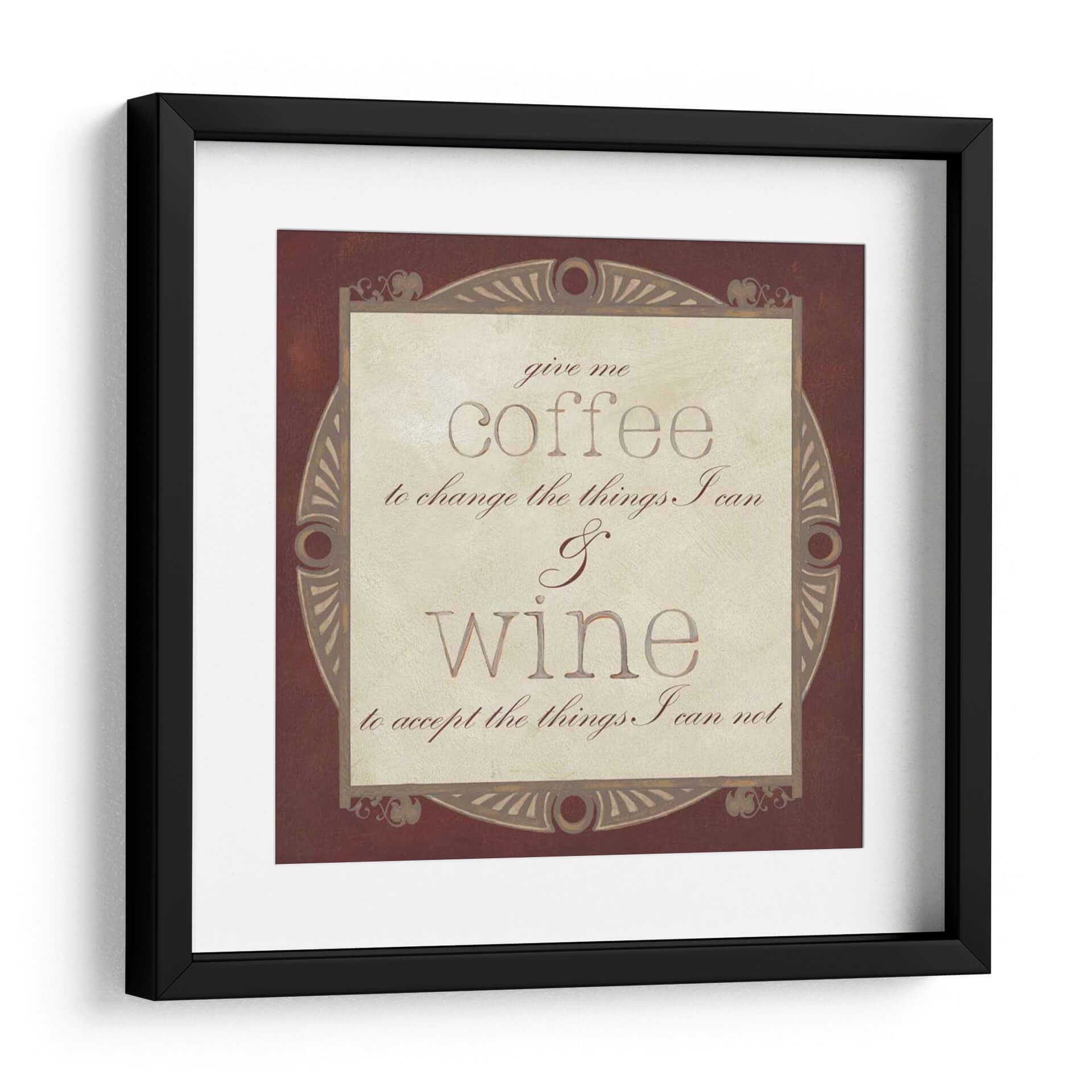 Inyecta carácter y sabiduría a tu hogar con "Vino Inspirado I", una obra de arte textil que celebra la dualidad de la vida con elegancia y un toque de humor. Este cuadro decorativo presenta una cita célebre sobre el café y el vino, enmarcada por un diseño ornamentado en tonos tierra que evoca calidez y sofisticación. La paleta de colores, dominada por marrones profundos y cremas sutiles, crea una atmósfera acogedora y atemporal, perfecta para cualquier estancia. La composición tipográfica, con fuentes contrastantes y un diseño central bien definido, guía la mirada del espectador hacia el mensaje, invitando a la reflexión y a la apreciación de los pequeños placeres. Ideal para la cocina, el comedor, la bodega o incluso la oficina, este cuadro no solo embellece el espacio, sino que también actúa como un recordatorio inspirador para enfrentar los desafíos y aceptar la vida con serenidad. Añade un toque de personalidad y estilo a tu decoración con esta pieza única que combina arte visual y reflexión.