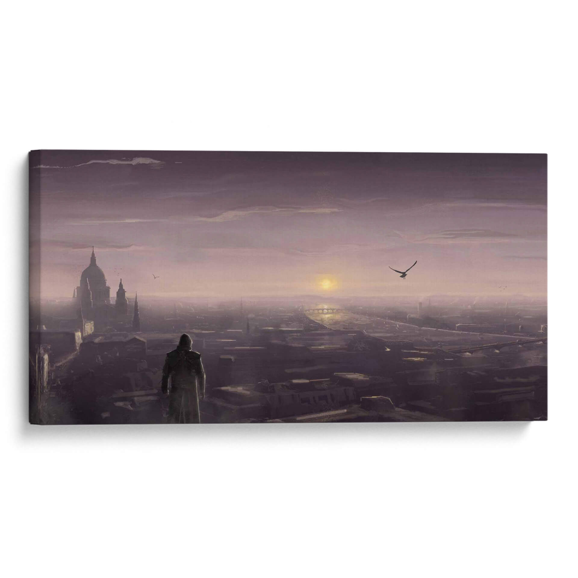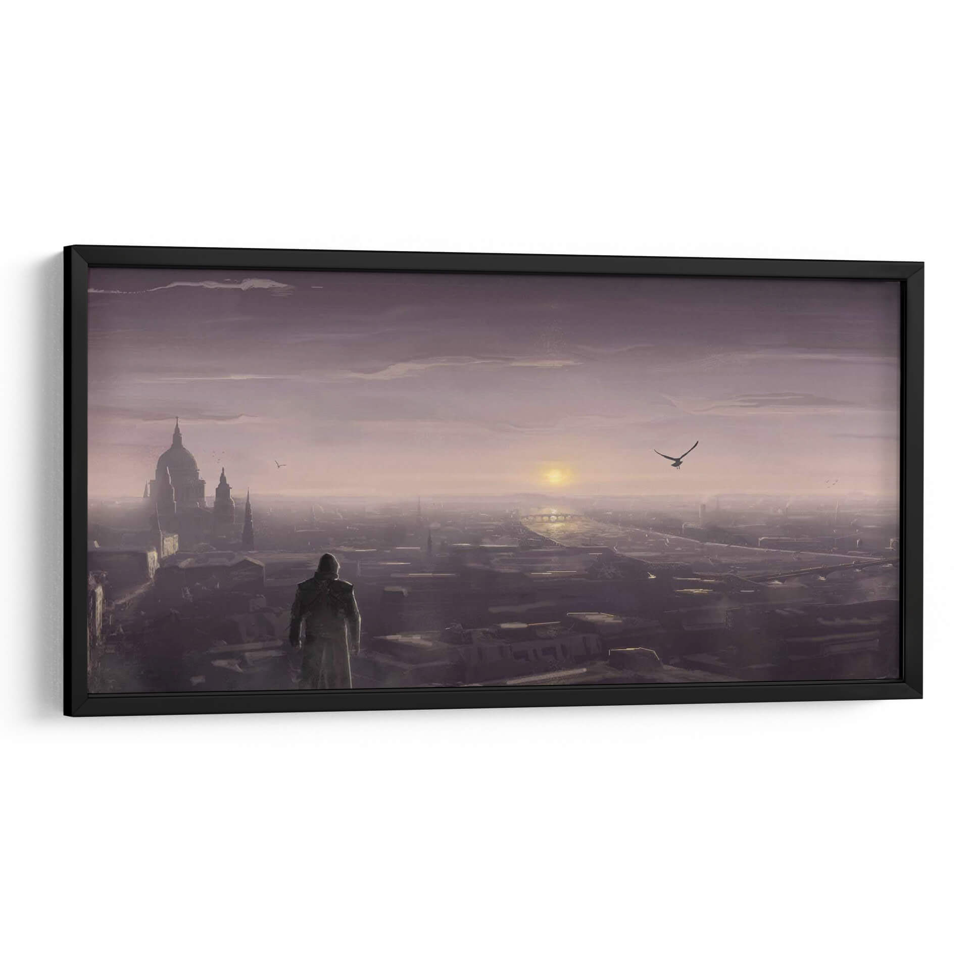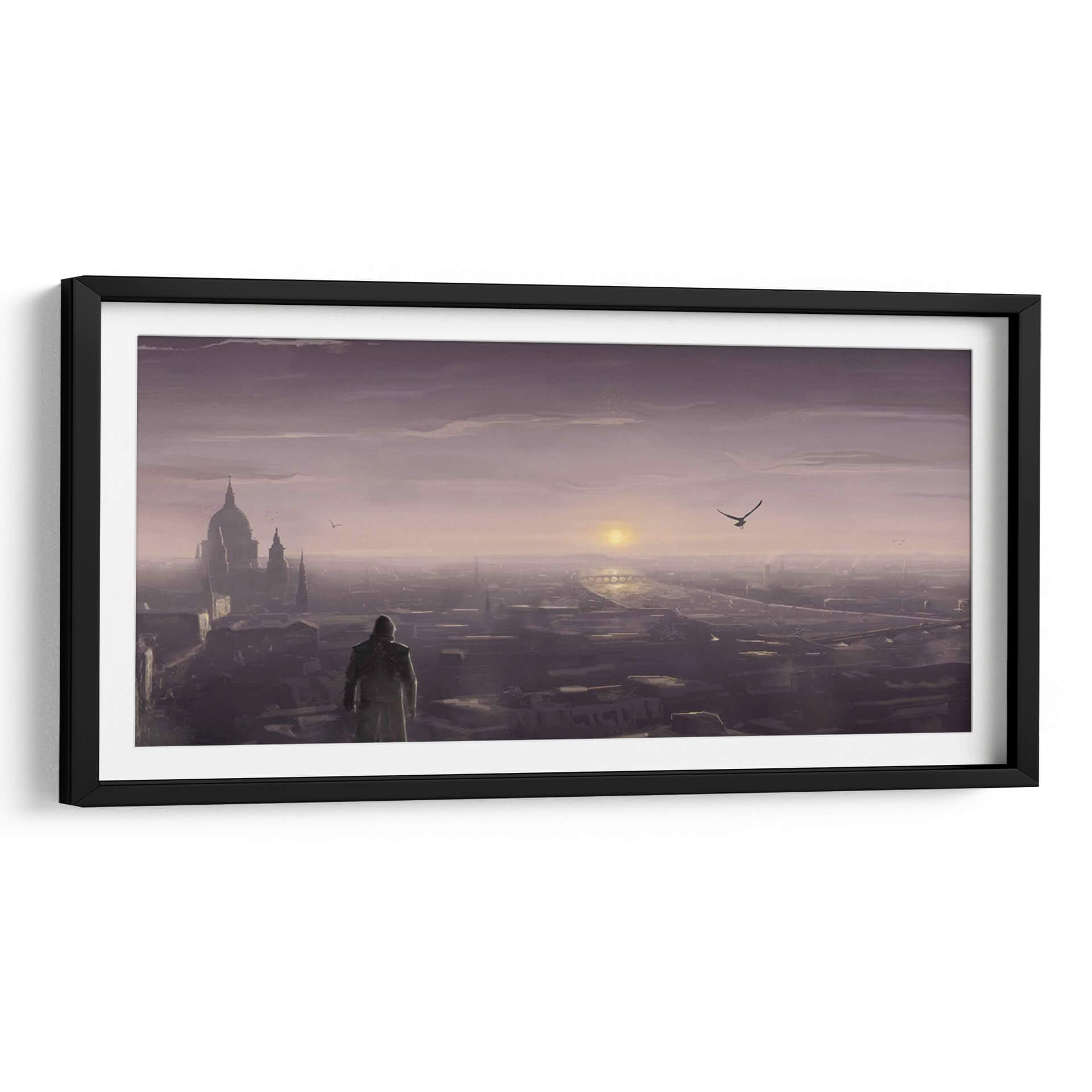 Sumérgete en la majestuosidad de "Assassins Creed Horizon", un cuadro decorativo que captura la esencia de un paisaje urbano al amanecer o al atardecer. La obra presenta una figura solitaria de espaldas, contemplando una vasta metrópoli que se extiende hasta el horizonte. Destaca una imponente cúpula arquitectónica a la izquierda, evocando historia y grandeza, mientras que la luz suave del sol se filtra a través de una bruma etérea, iluminando un puente y el río que atraviesa la ciudad. La paleta de colores, dominada por tonos púrpuras, grises y toques dorados, crea una atmósfera de misterio, introspección y una serena anticipación. El estilo pictórico, con pinceladas que sugieren detalle sin ser fotorrealistas, añade profundidad y carácter. Este cuadro decorativo es perfecto para añadir un punto focal evocador a tu sala de estar, estudio u oficina, inspirando reflexión y una sensación de aventura épica. Ideal para amantes de la historia, la arquitectura y las narrativas visuales profundas, "Assassins Creed Horizon" transforma cualquier espacio en un portal a mundos imaginarios y momentos inolvidables.