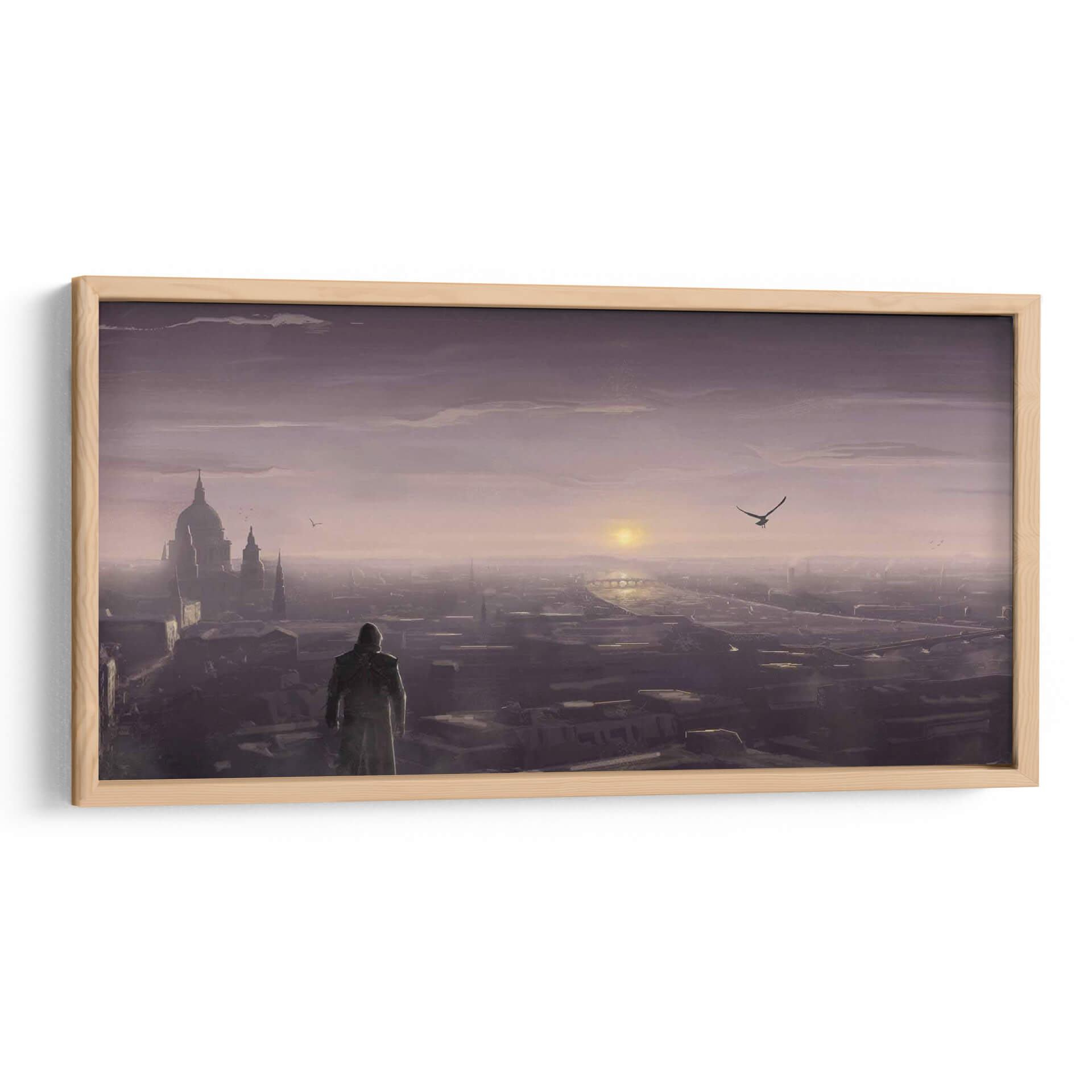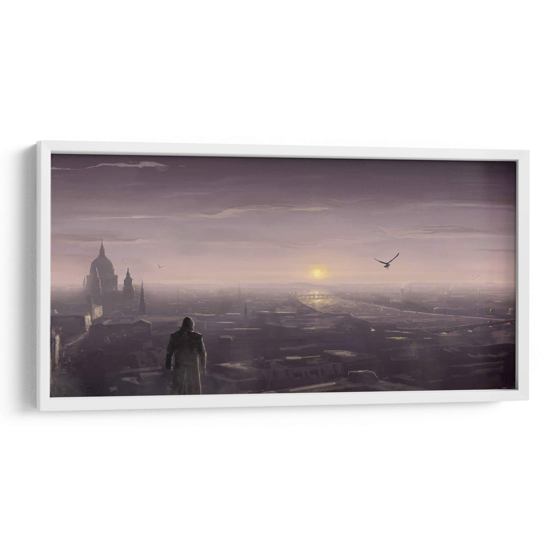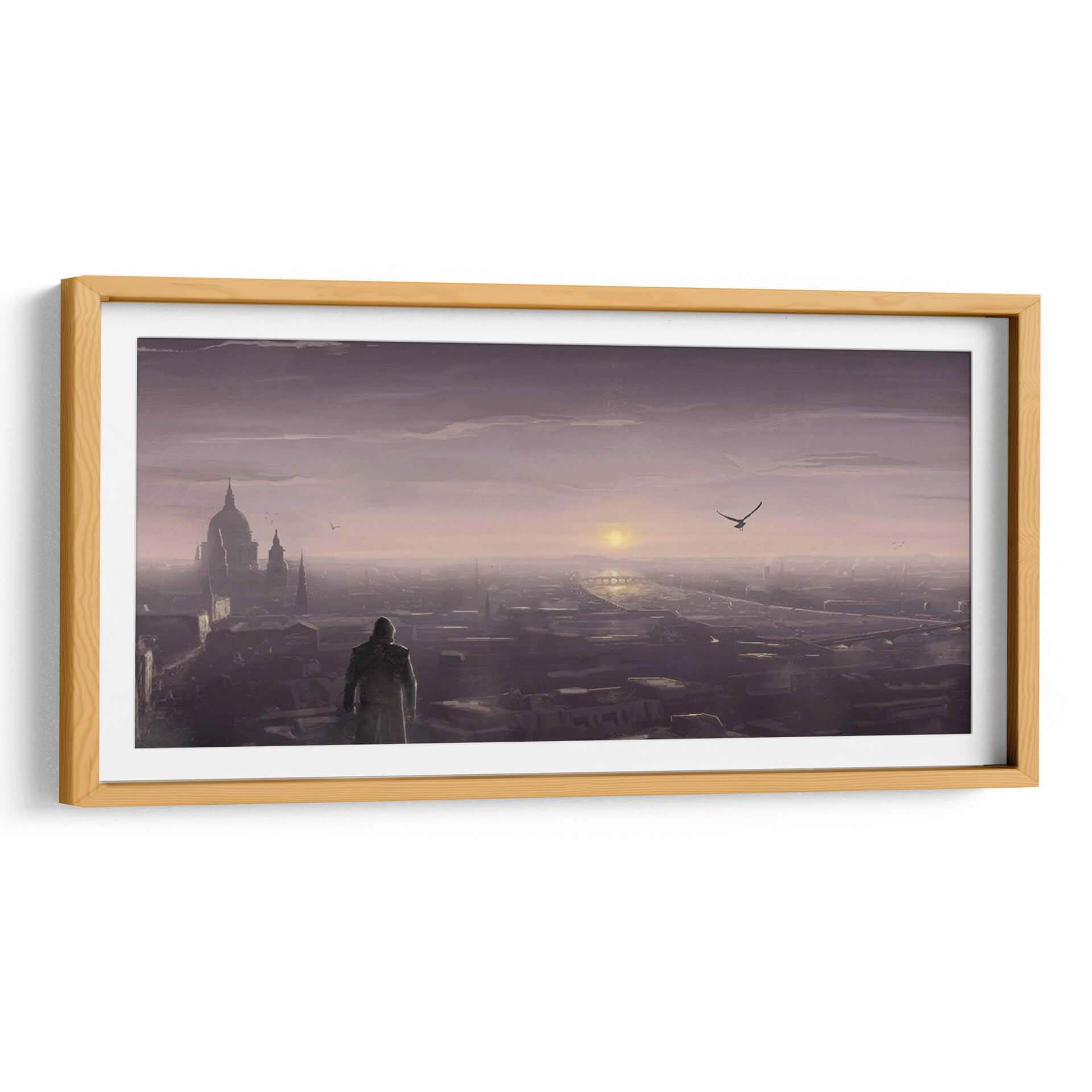 Sumérgete en la majestuosidad de "Assassins Creed Horizon", un cuadro decorativo que captura la esencia de un paisaje urbano al amanecer o al atardecer. La obra presenta una figura solitaria de espaldas, contemplando una vasta metrópoli que se extiende hasta el horizonte. Destaca una imponente cúpula arquitectónica a la izquierda, evocando historia y grandeza, mientras que la luz suave del sol se filtra a través de una bruma etérea, iluminando un puente y el río que atraviesa la ciudad. La paleta de colores, dominada por tonos púrpuras, grises y toques dorados, crea una atmósfera de misterio, introspección y una serena anticipación. El estilo pictórico, con pinceladas que sugieren detalle sin ser fotorrealistas, añade profundidad y carácter. Este cuadro decorativo es perfecto para añadir un punto focal evocador a tu sala de estar, estudio u oficina, inspirando reflexión y una sensación de aventura épica. Ideal para amantes de la historia, la arquitectura y las narrativas visuales profundas, "Assassins Creed Horizon" transforma cualquier espacio en un portal a mundos imaginarios y momentos inolvidables.