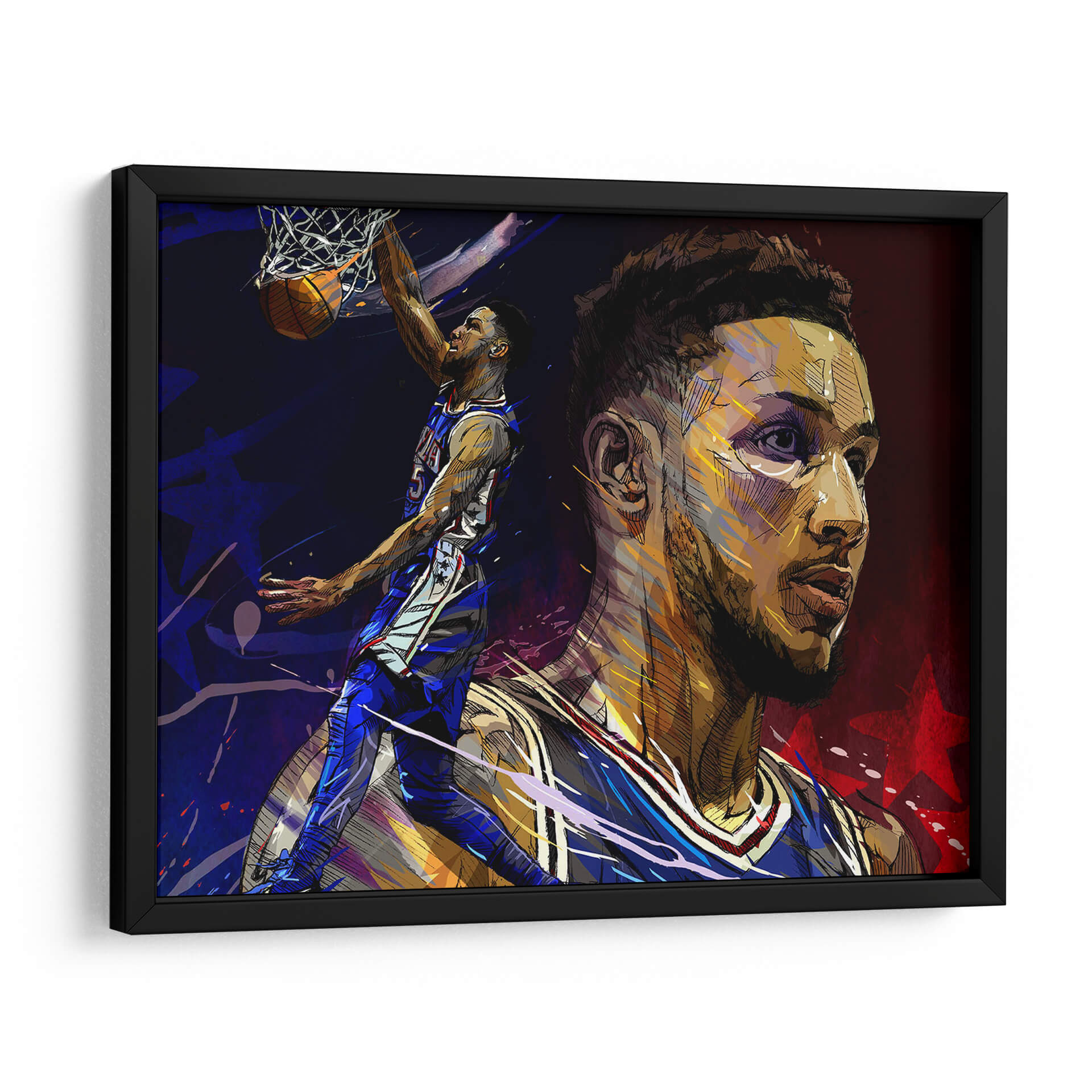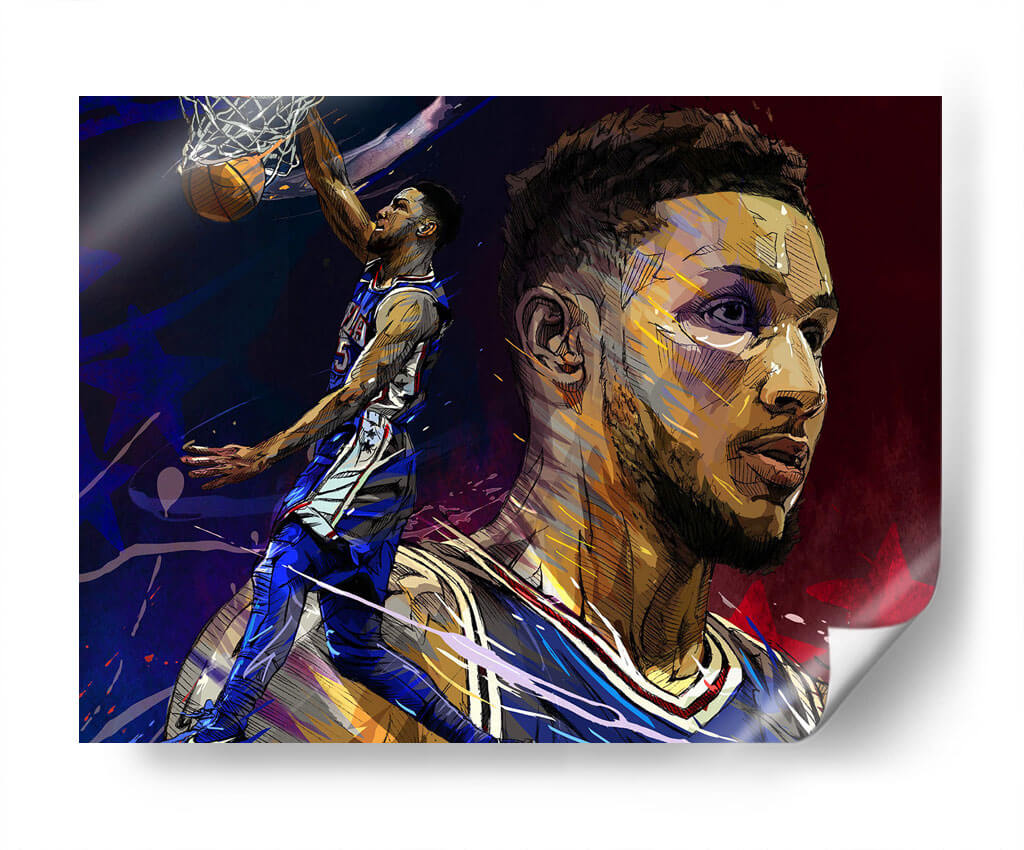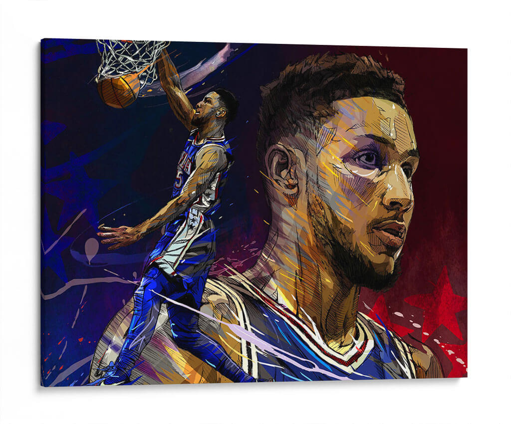 Sumérgete en la energía y el dinamismo del baloncesto con este impactante cuadro decorativo que captura la esencia de un momento decisivo en la cancha. La obra presenta un retrato potente de un jugador en acción, con una composición que fusiona el primer plano detallado del rostro del atleta con la figura en pleno salto, a punto de encestar. La paleta de colores vibrantes, dominada por azules intensos, rojos apasionados y toques de amarillo y blanco, crea un contraste audaz que evoca la emoción y la intensidad del juego. El estilo artístico, una mezcla de ilustración expresionista con trazos enérgicos y salpicaduras de color, confiere a la pieza una textura visual cautivadora y moderna. Este cuadro decorativo es ideal para espacios que buscan un toque de vitalidad y deportividad, como salas de estar, estudios de oficina o habitaciones de aficionados al baloncesto, sirviendo como un punto focal que inspira determinación y pasión. Transforma tu pared en una galería de arte contemporáneo con esta pieza llena de fuerza y movimiento.