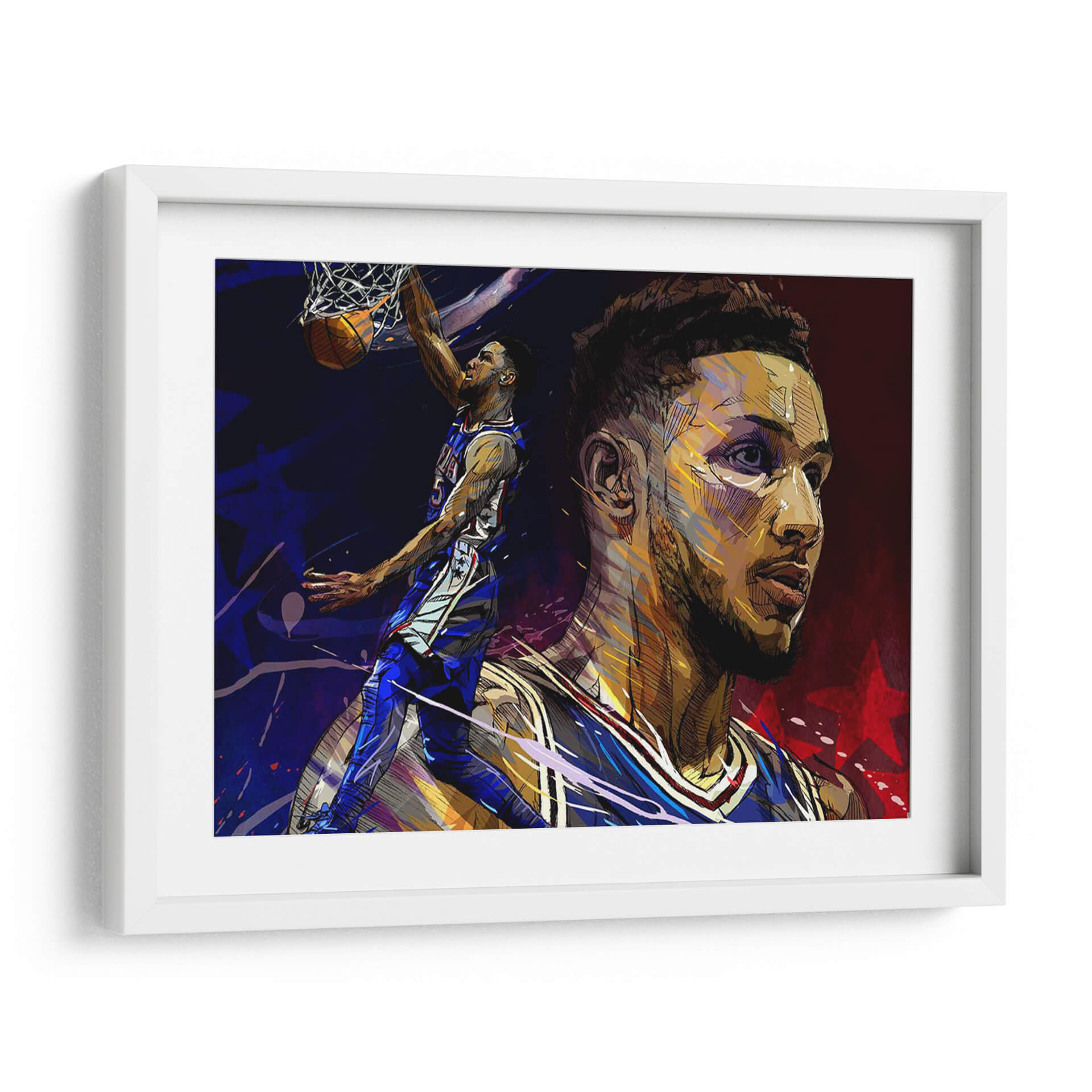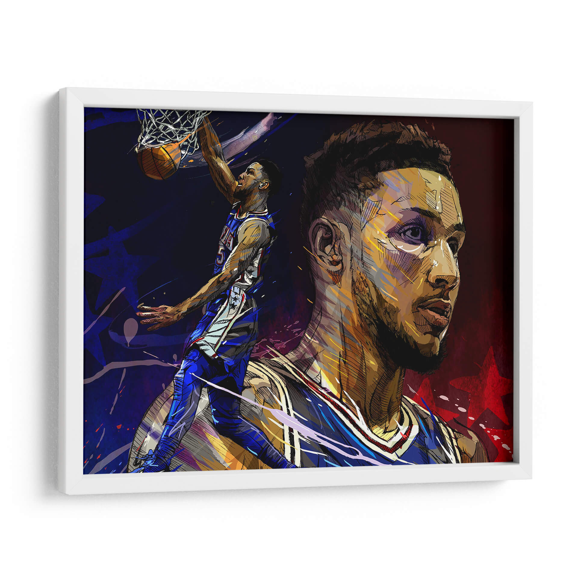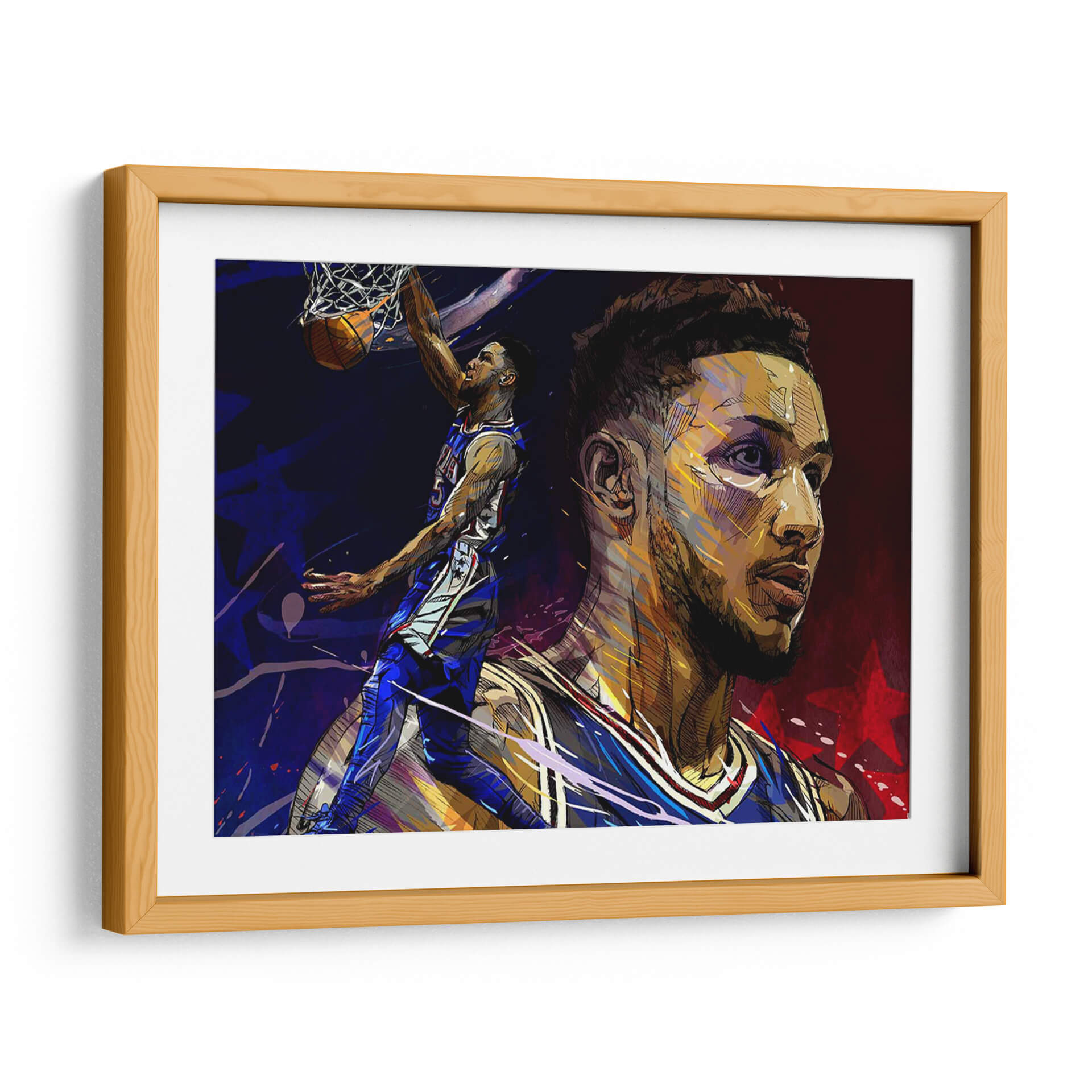 Sumérgete en la energía y el dinamismo del baloncesto con este impactante cuadro decorativo que captura la esencia de un momento decisivo en la cancha. La obra presenta un retrato potente de un jugador en acción, con una composición que fusiona el primer plano detallado del rostro del atleta con la figura en pleno salto, a punto de encestar. La paleta de colores vibrantes, dominada por azules intensos, rojos apasionados y toques de amarillo y blanco, crea un contraste audaz que evoca la emoción y la intensidad del juego. El estilo artístico, una mezcla de ilustración expresionista con trazos enérgicos y salpicaduras de color, confiere a la pieza una textura visual cautivadora y moderna. Este cuadro decorativo es ideal para espacios que buscan un toque de vitalidad y deportividad, como salas de estar, estudios de oficina o habitaciones de aficionados al baloncesto, sirviendo como un punto focal que inspira determinación y pasión. Transforma tu pared en una galería de arte contemporáneo con esta pieza llena de fuerza y movimiento.