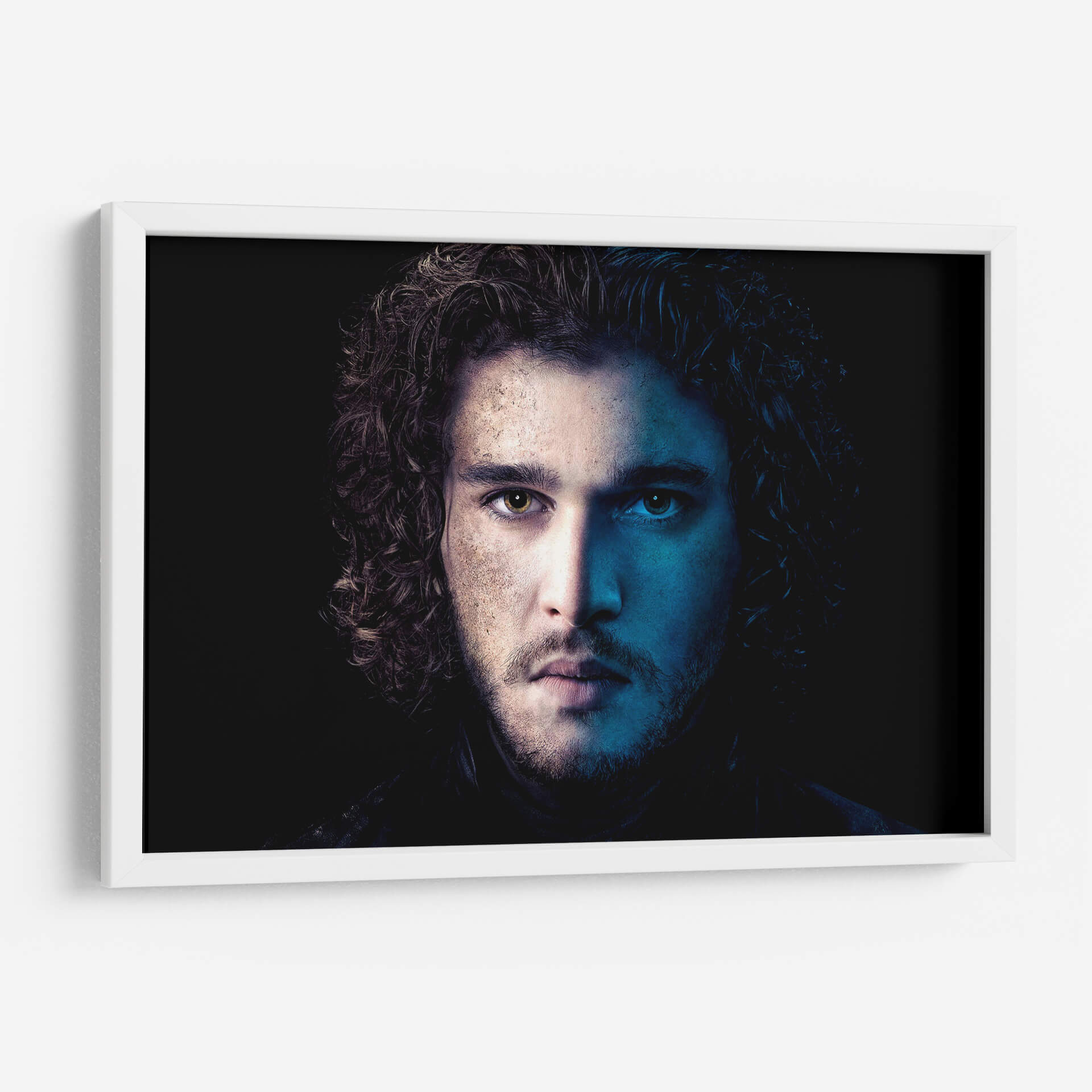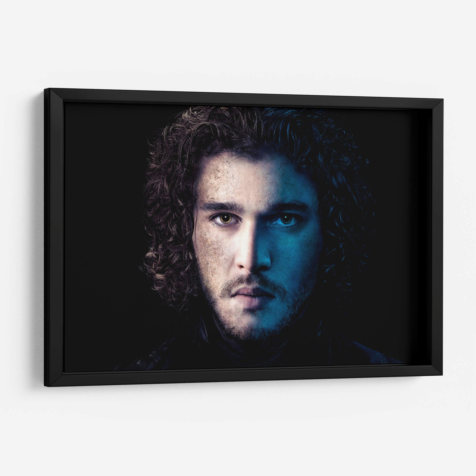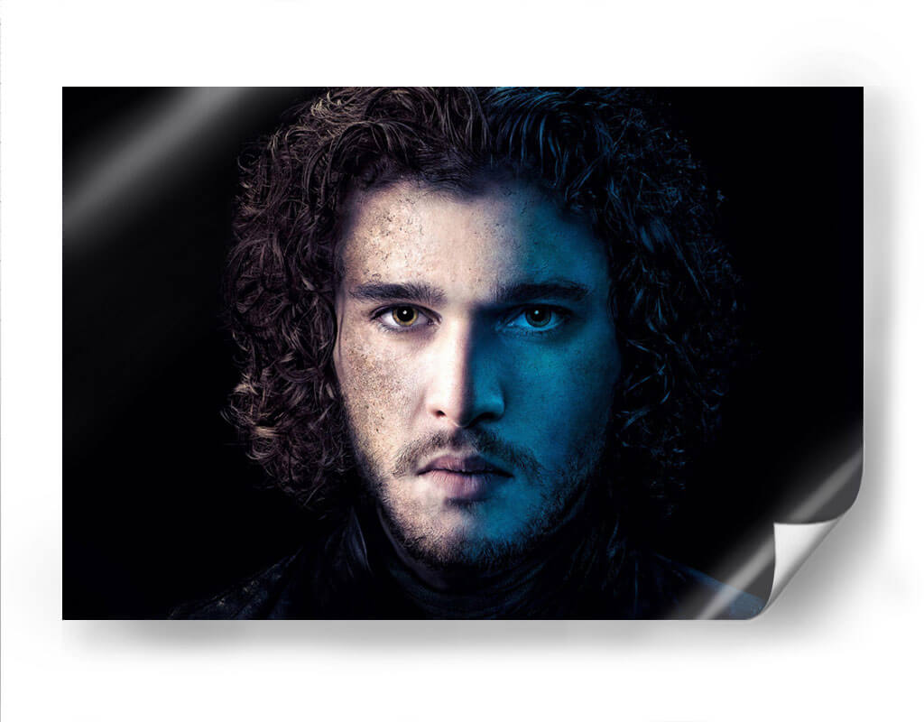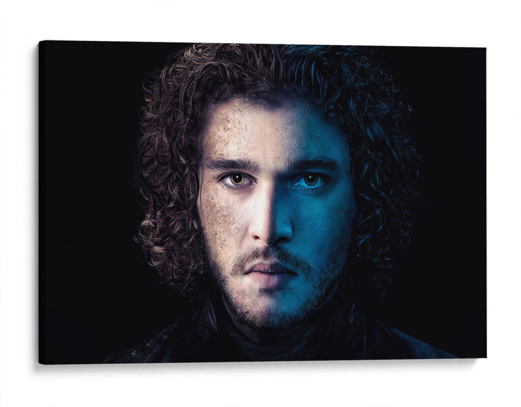 Descubre la intensidad y el misterio de nuestro cuadro decorativo "Jon Snow en Azul". Esta cautivadora obra de arte captura un primer plano dramático de un rostro masculino, dividido por una iluminación contrastante. Por un lado, tonos cálidos y terrosos iluminan la piel, sugiriendo introspección y un carácter forjado por la experiencia. Por el otro, una vibrante luz azul crea un aura enigmática y profunda, resaltando la dualidad y la complejidad del personaje. El cabello oscuro y rizado enmarca el rostro, añadiendo un toque de textura y movimiento. El fondo oscuro y minimalista dirige toda la atención hacia la mirada penetrante y la expresión enigmática del sujeto, creando un fuerte impacto visual. Este cuadro es perfecto para añadir un toque de sofisticación y conversación a cualquier espacio moderno, ya sea una sala de estar, un estudio o una oficina. Su paleta de colores única y su atmósfera evocadora lo convierten en una pieza de arte de pared ideal para aquellos que aprecian el arte con carácter y profundidad emocional. Transforma tu decoración con esta pieza impactante que evoca intriga y admiración.