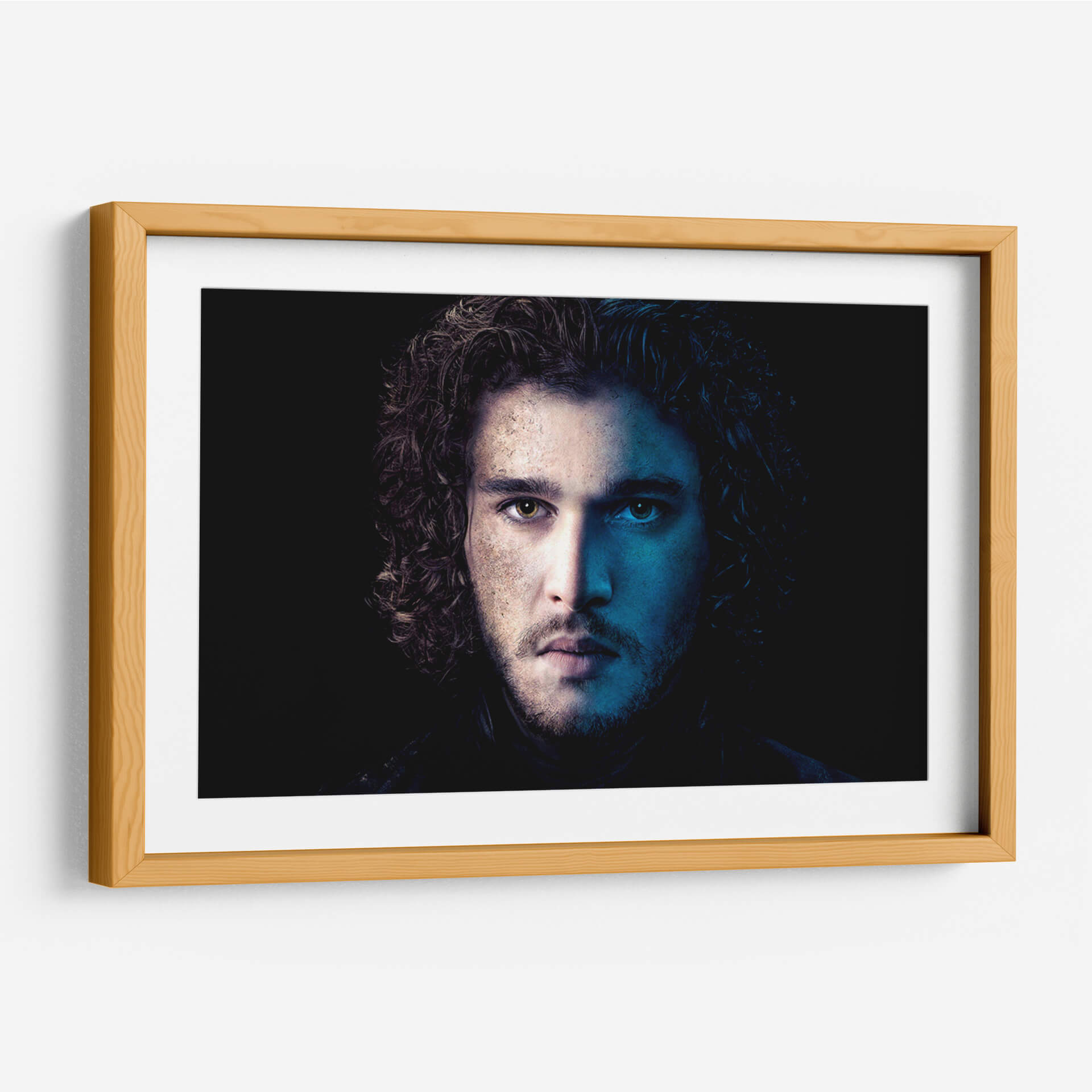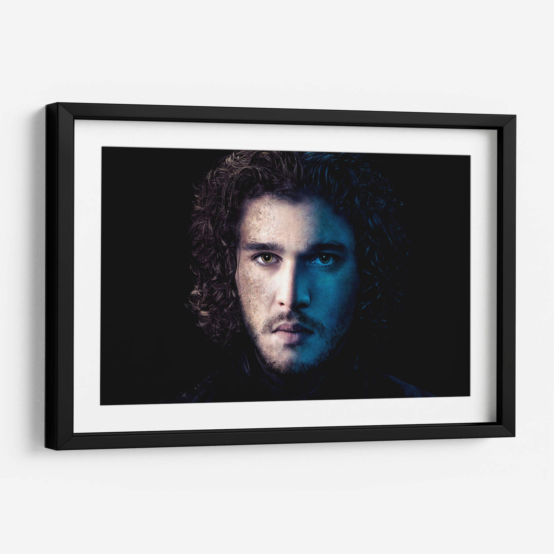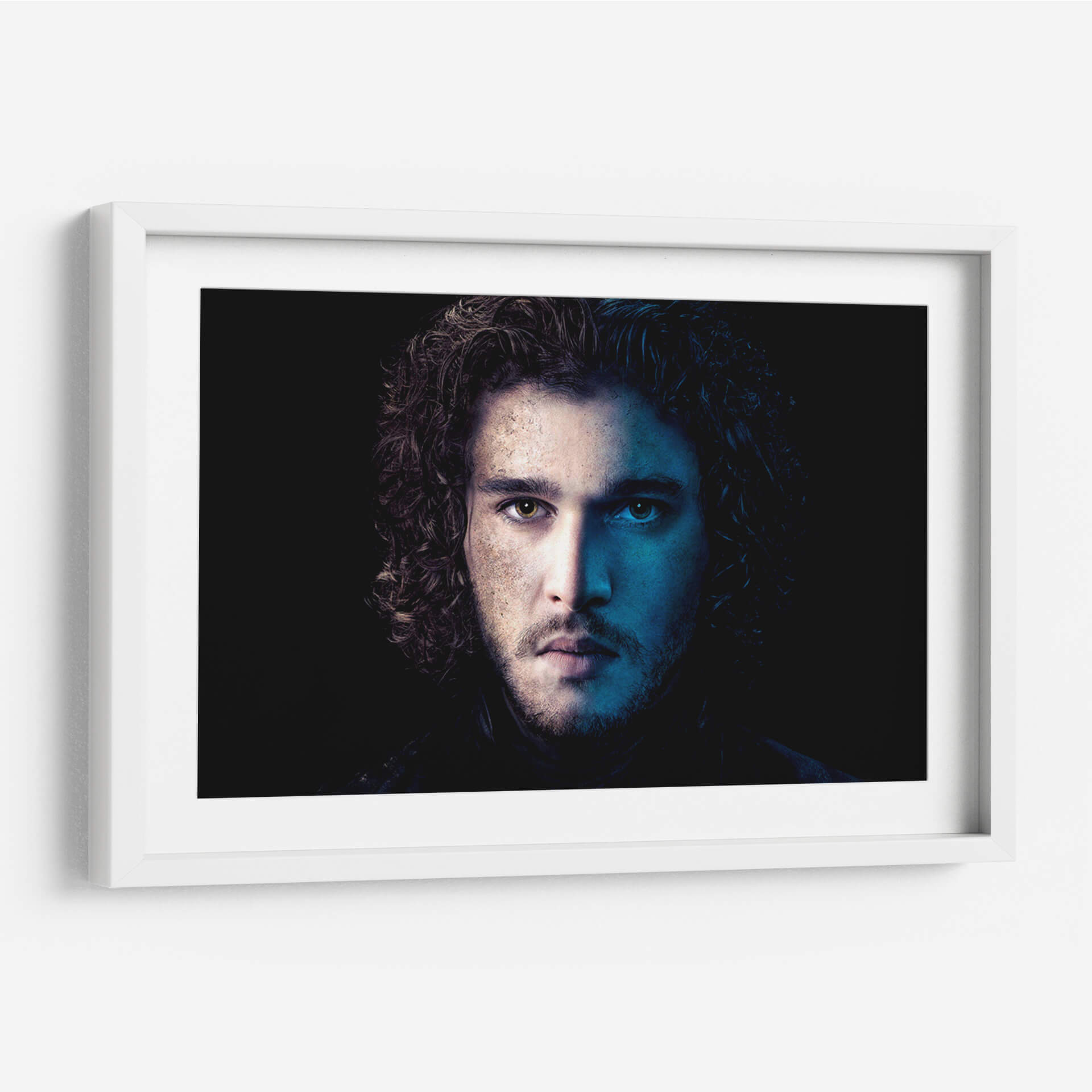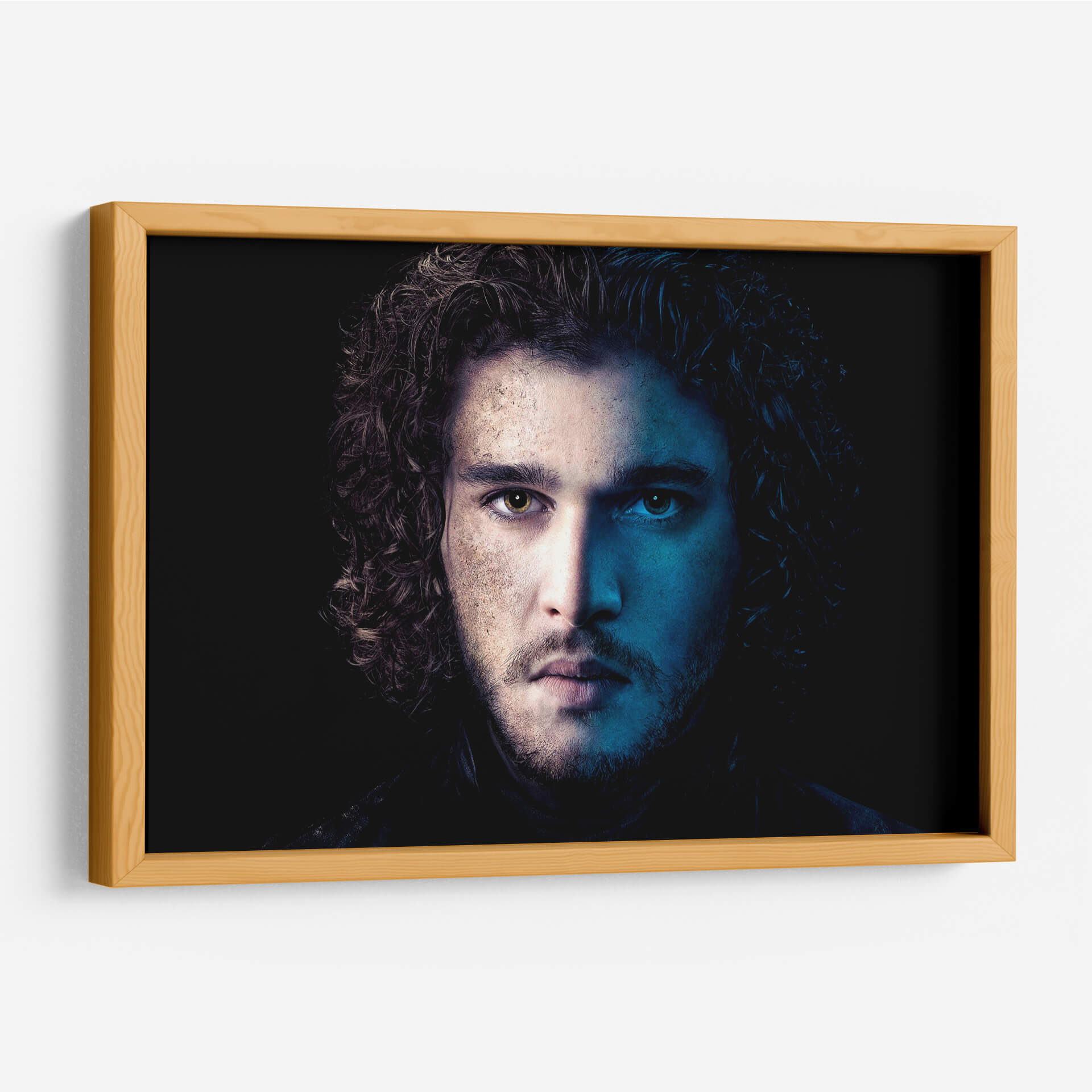 Descubre la intensidad y el misterio de nuestro cuadro decorativo "Jon Snow en Azul". Esta cautivadora obra de arte captura un primer plano dramático de un rostro masculino, dividido por una iluminación contrastante. Por un lado, tonos cálidos y terrosos iluminan la piel, sugiriendo introspección y un carácter forjado por la experiencia. Por el otro, una vibrante luz azul crea un aura enigmática y profunda, resaltando la dualidad y la complejidad del personaje. El cabello oscuro y rizado enmarca el rostro, añadiendo un toque de textura y movimiento. El fondo oscuro y minimalista dirige toda la atención hacia la mirada penetrante y la expresión enigmática del sujeto, creando un fuerte impacto visual. Este cuadro es perfecto para añadir un toque de sofisticación y conversación a cualquier espacio moderno, ya sea una sala de estar, un estudio o una oficina. Su paleta de colores única y su atmósfera evocadora lo convierten en una pieza de arte de pared ideal para aquellos que aprecian el arte con carácter y profundidad emocional. Transforma tu decoración con esta pieza impactante que evoca intriga y admiración.