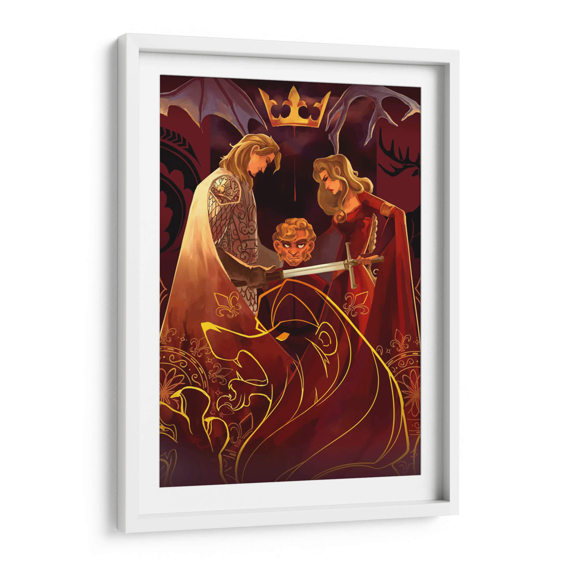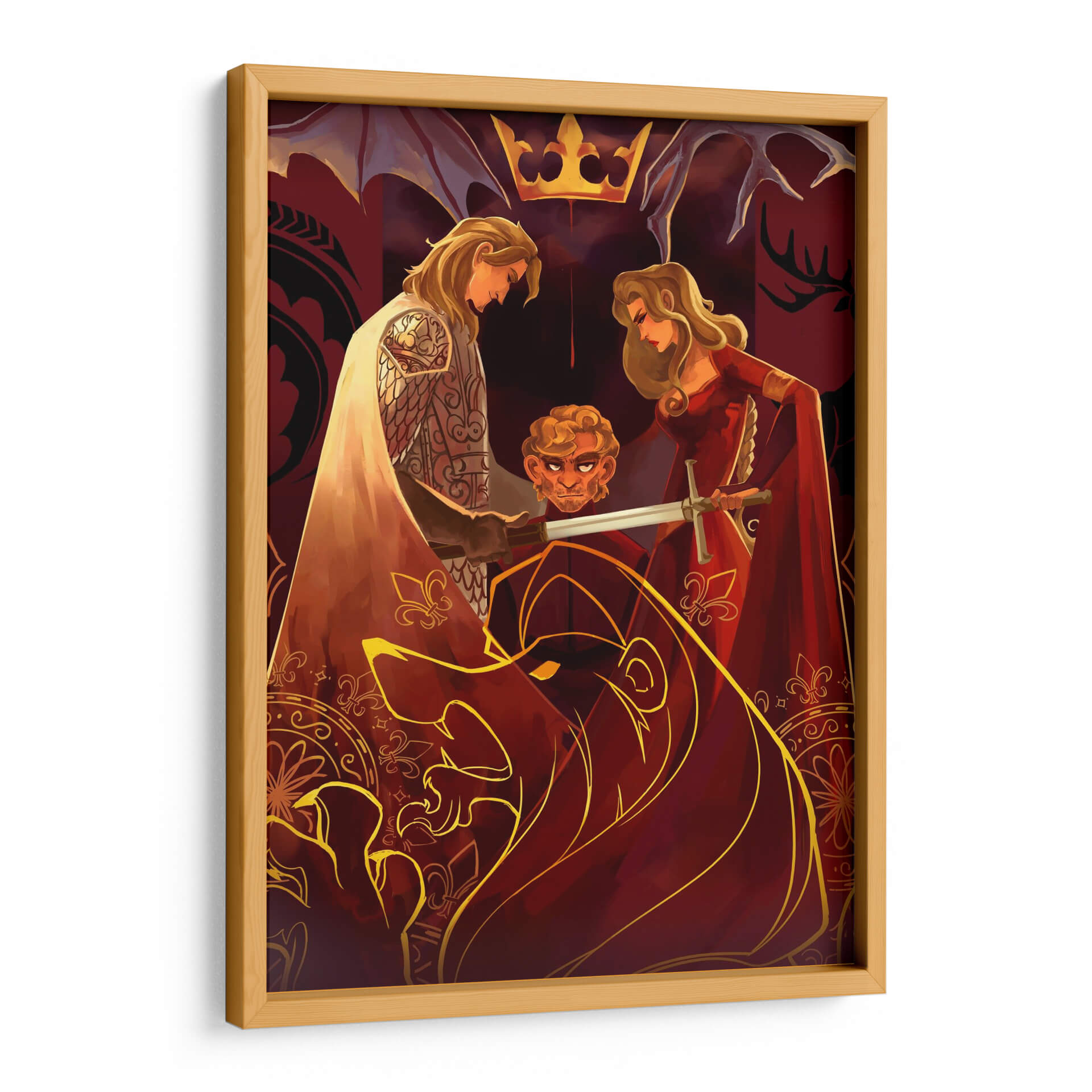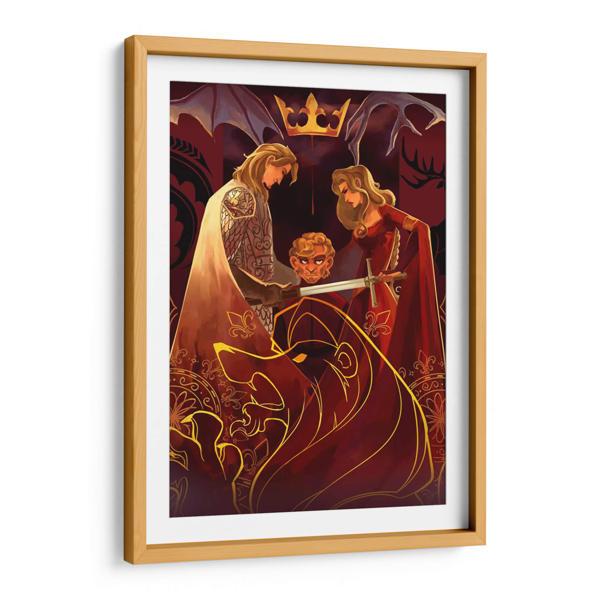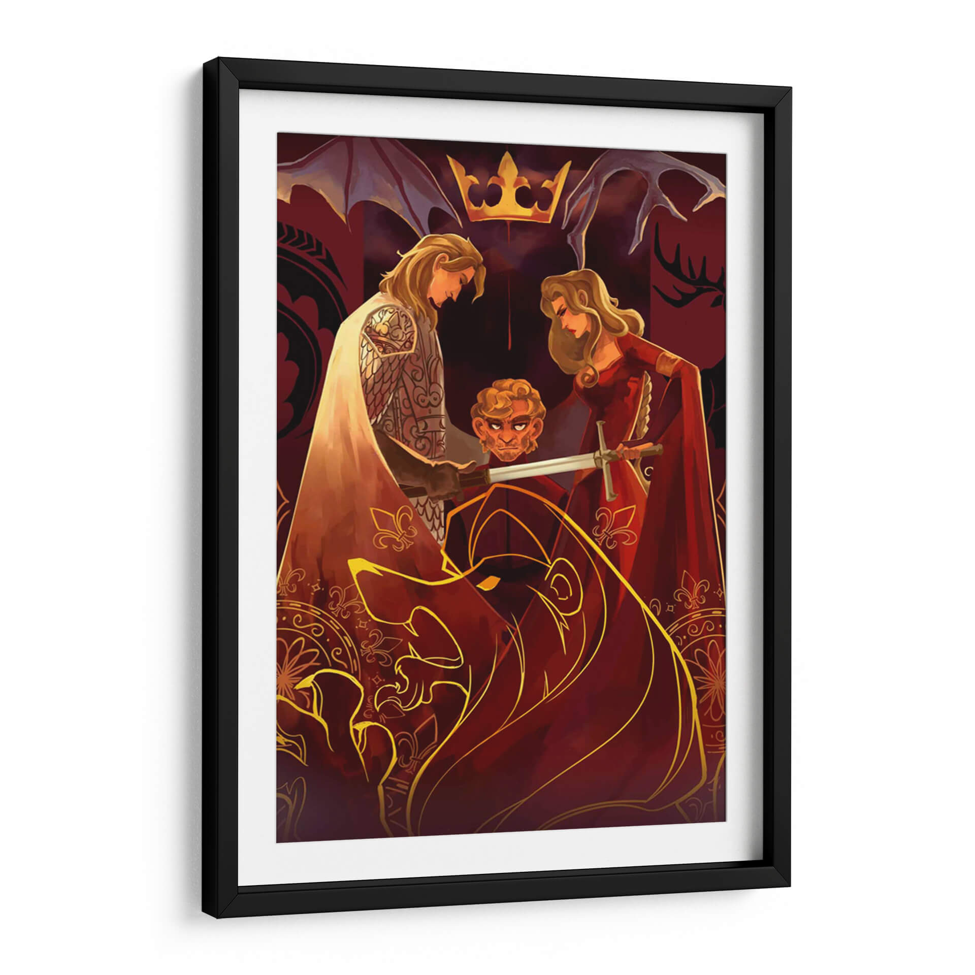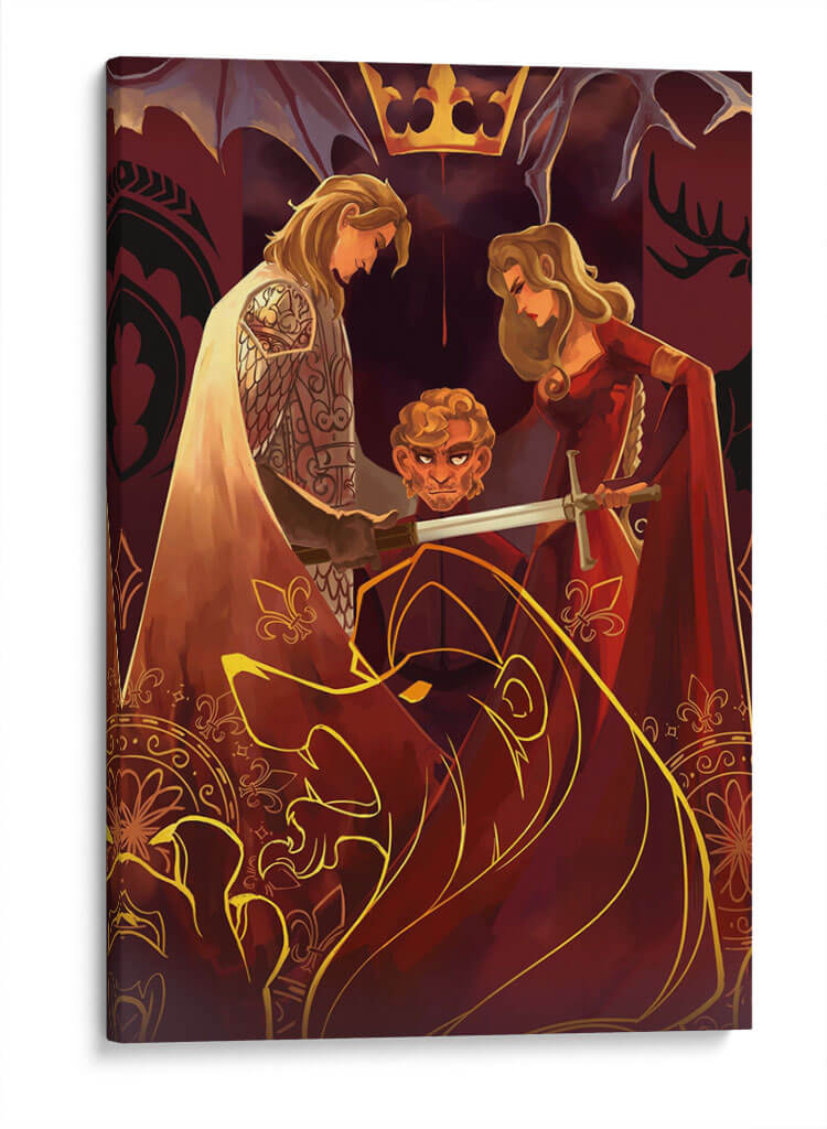 Sumérgete en la intriga y el drama con este impactante cuadro decorativo, "Los hijos Lannister". La obra captura un momento de tensión palpable, con figuras estilizadas envueltas en ricos tonos de rojo, dorado y marrón oscuro. Una corona dorada domina la parte superior, sugiriendo poder y realeza, mientras que una espada cruza el centro, un símbolo de conflicto y determinación. Las complejas filigranas y los patrones ornamentales en la parte inferior añaden una capa de opulencia y misterio a la composición. Los rostros expresan una gama de emociones, desde la seriedad hasta la sospecha, invitando al espectador a descifrar la narrativa subyacente. Este cuadro decorativo es perfecto para añadir un toque de sofisticación y carácter a tu sala de estar, estudio u oficina. Su paleta de colores cálidos y su estilo evocador lo convierten en una pieza de conversación fascinante, ideal para aquellos que aprecian el arte con profundidad y un aire de intriga cortesana. Transforma tu espacio con esta obra maestra contemporánea.
