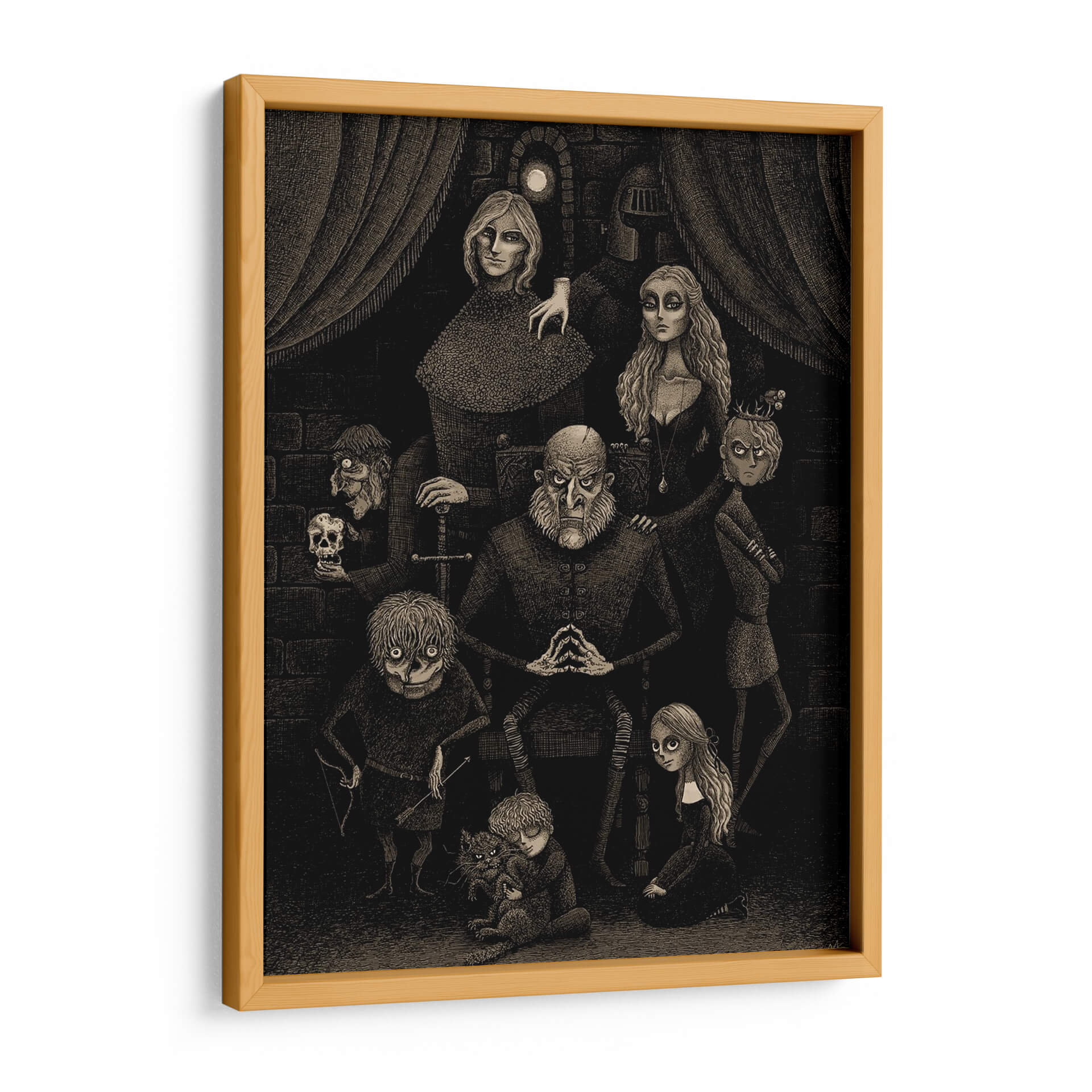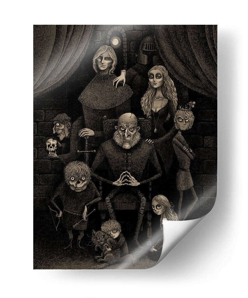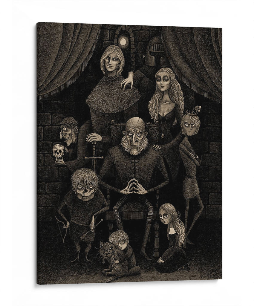 Sumérgete en el misterioso y cautivador mundo de 'Los monstruos Lannister', una obra de arte que evoca atmósferas góticas y narrativas oscuras. Esta pieza presenta un enigmático clan familiar, retratado con un estilo detallado y expresivo que recuerda a las ilustraciones clásicas de cuentos de hadas retorcidos o a las crónicas de familias sombrías. La paleta de colores monocromática, dominada por tonos sepia y oscuros, acentúa el misterio y la antigüedad de la escena, creando una sensación de profundidad y drama. La composición, centrada en la figura patriarcal sentada en un trono y rodeada por los demás miembros de la familia, cada uno con sus propias peculiaridades y expresiones inquietantes, invita a la contemplación y a la especulación sobre sus historias. Es una obra perfecta para aquellos que aprecian el arte con carácter, historias implícitas y un toque de lo macabro o lo fantástico. Ideal para añadir un punto focal intrigante a un estudio, sala de lectura o cualquier espacio que busque una decoración distintiva y llena de personalidad. Este cuadro decorativo es una invitación a explorar las complejidades de la naturaleza humana y la fantasía.