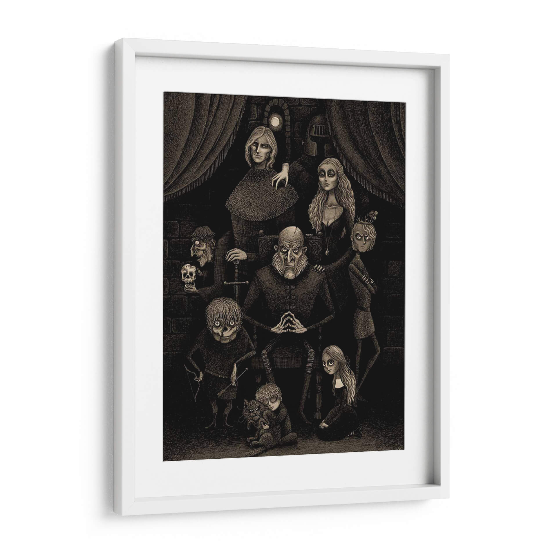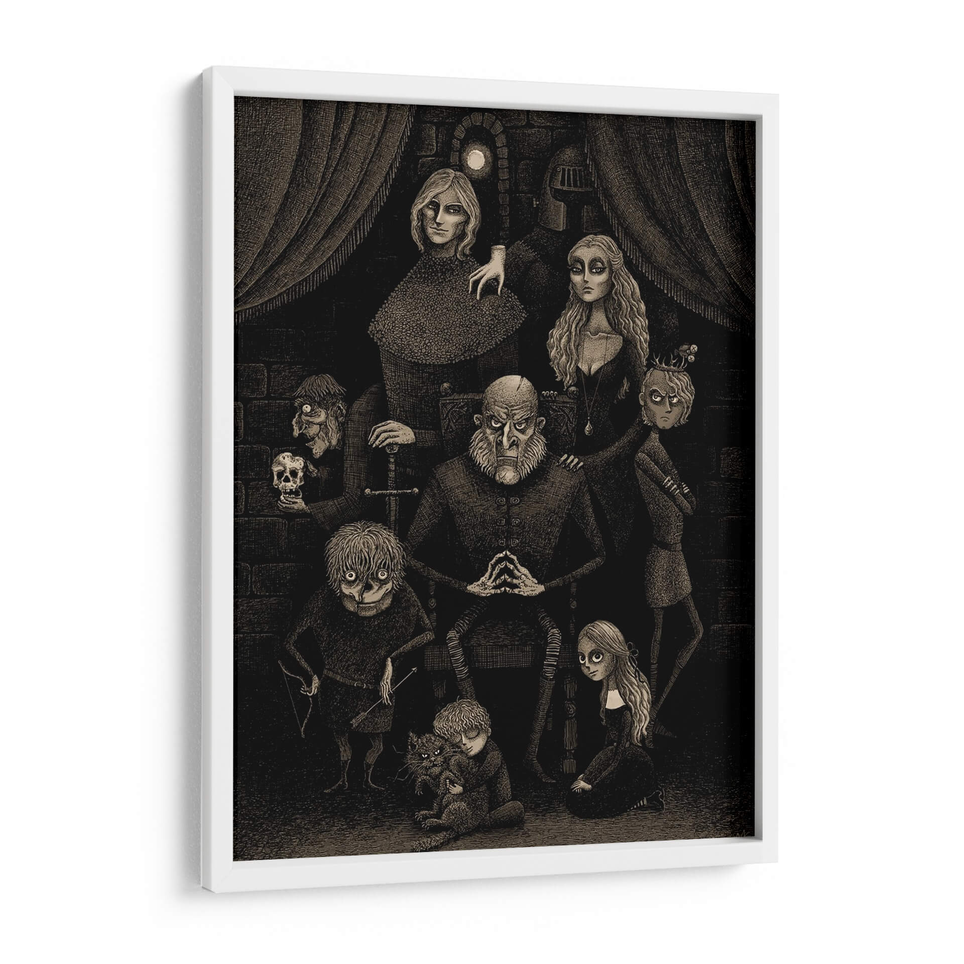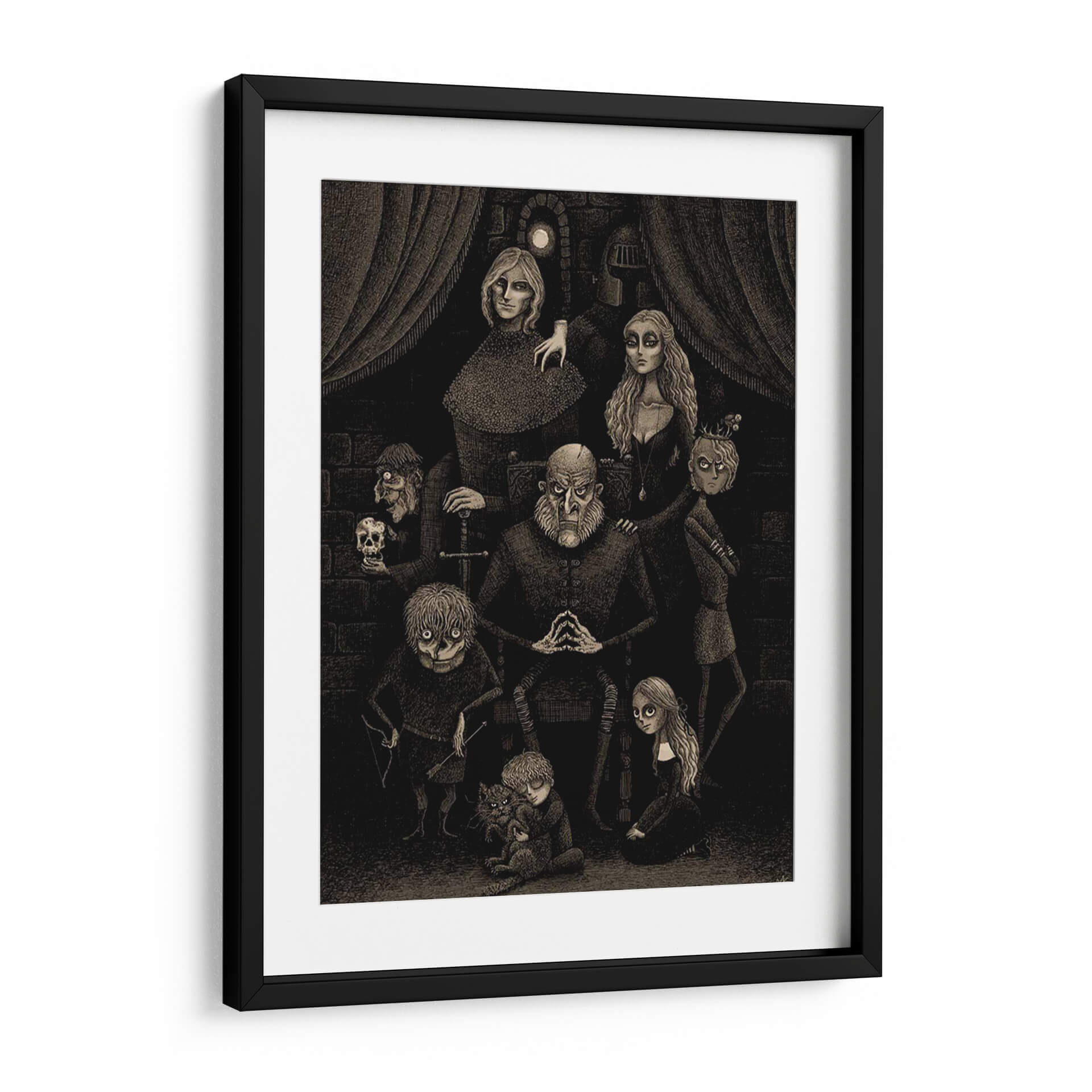 Sumérgete en el misterioso y cautivador mundo de 'Los monstruos Lannister', una obra de arte que evoca atmósferas góticas y narrativas oscuras. Esta pieza presenta un enigmático clan familiar, retratado con un estilo detallado y expresivo que recuerda a las ilustraciones clásicas de cuentos de hadas retorcidos o a las crónicas de familias sombrías. La paleta de colores monocromática, dominada por tonos sepia y oscuros, acentúa el misterio y la antigüedad de la escena, creando una sensación de profundidad y drama. La composición, centrada en la figura patriarcal sentada en un trono y rodeada por los demás miembros de la familia, cada uno con sus propias peculiaridades y expresiones inquietantes, invita a la contemplación y a la especulación sobre sus historias. Es una obra perfecta para aquellos que aprecian el arte con carácter, historias implícitas y un toque de lo macabro o lo fantástico. Ideal para añadir un punto focal intrigante a un estudio, sala de lectura o cualquier espacio que busque una decoración distintiva y llena de personalidad. Este cuadro decorativo es una invitación a explorar las complejidades de la naturaleza humana y la fantasía.