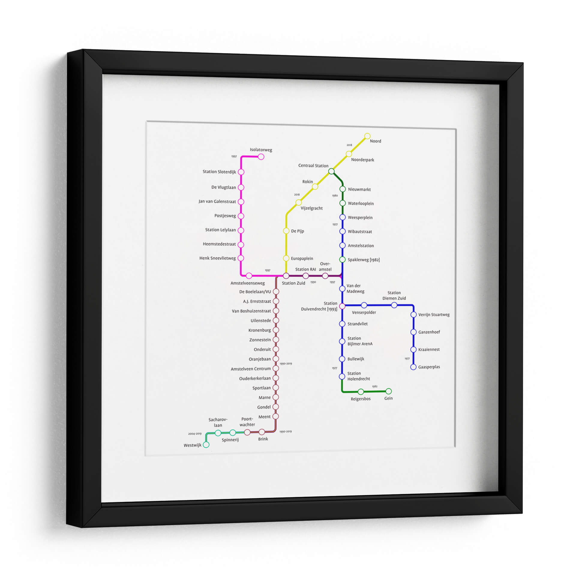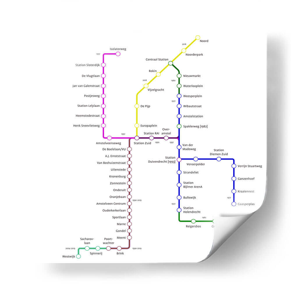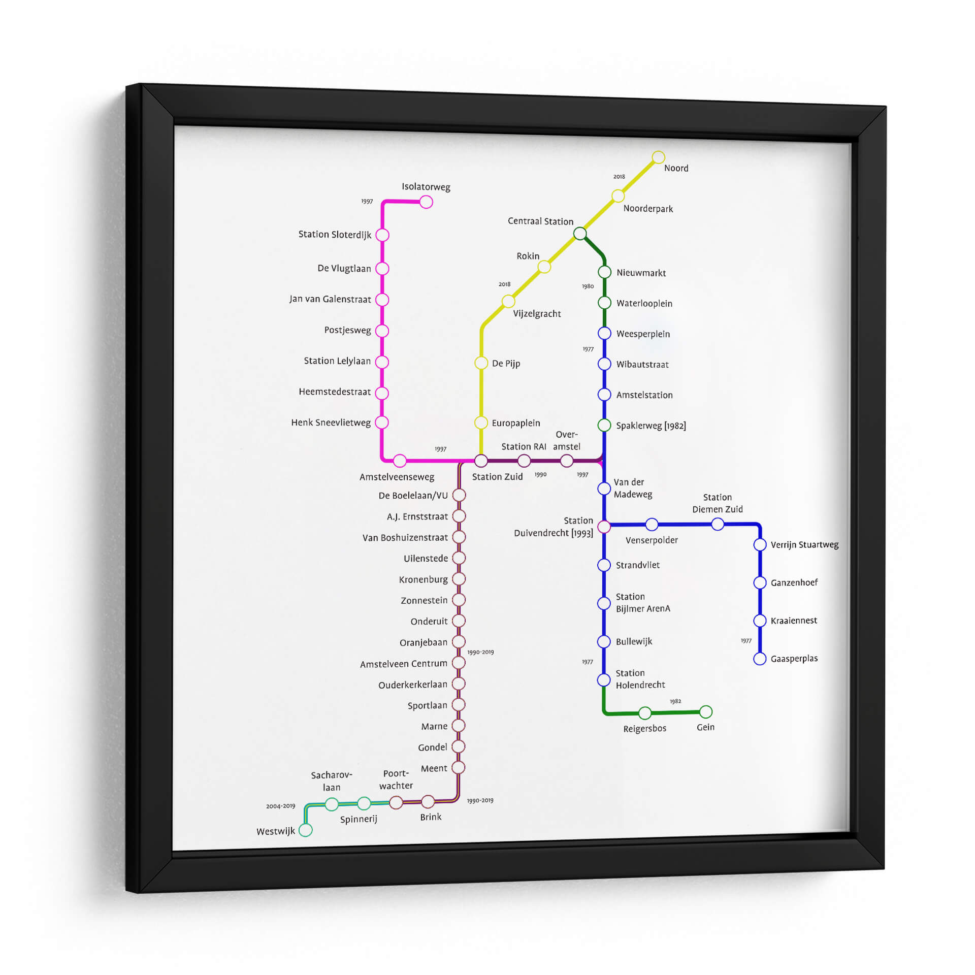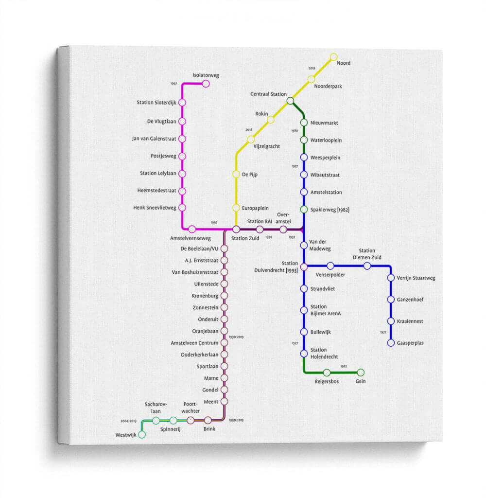 Transforma tu espacio con este cautivador cuadro decorativo inspirado en el metro de Ámsterdam, Holanda. Una pieza de diseño gráfico moderno que captura la esencia de la planificación urbana y la conectividad. Los vibrantes colores de las diferentes líneas de metro (púrpura, amarillo, verde y azul) se entrelazan sobre un fondo neutro, creando un punto focal dinámico y educativo. Cada estación está meticulosamente etiquetada, invitando a la contemplación y al descubrimiento de la intrincada red de transporte de la capital holandesa. Este diseño no solo es estéticamente agradable, sino que también evoca una sensación de orden, eficiencia y aventura urbana. Ideal para amantes de los viajes, la arquitectura, el diseño y para añadir un toque intelectual y contemporáneo a tu sala de estar, oficina o estudio. Su estilo gráfico lo hace versátil para complementar decoraciones modernas, minimalistas o eclécticas, aportando carácter y conversación a cualquier ambiente.