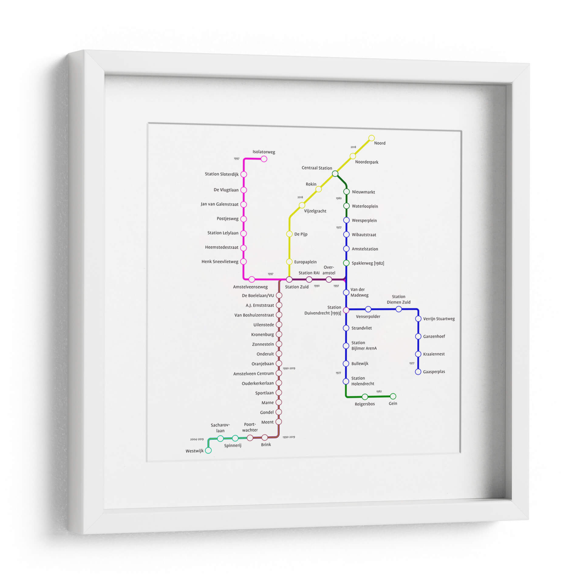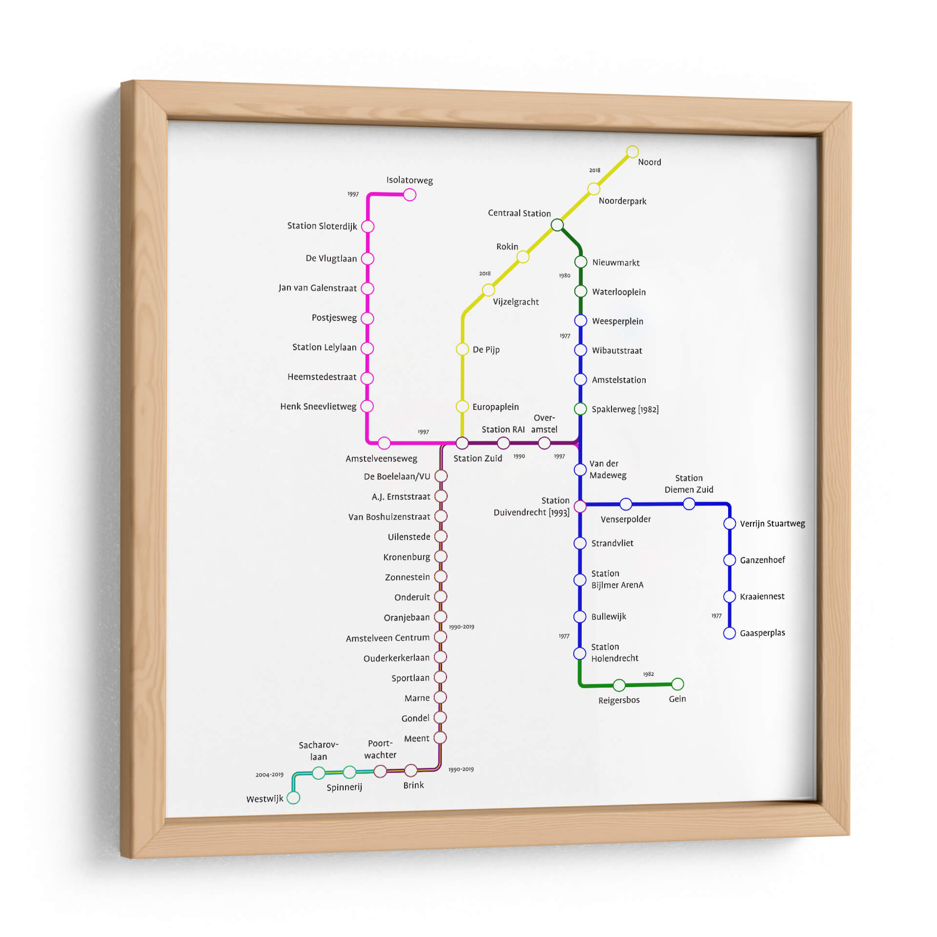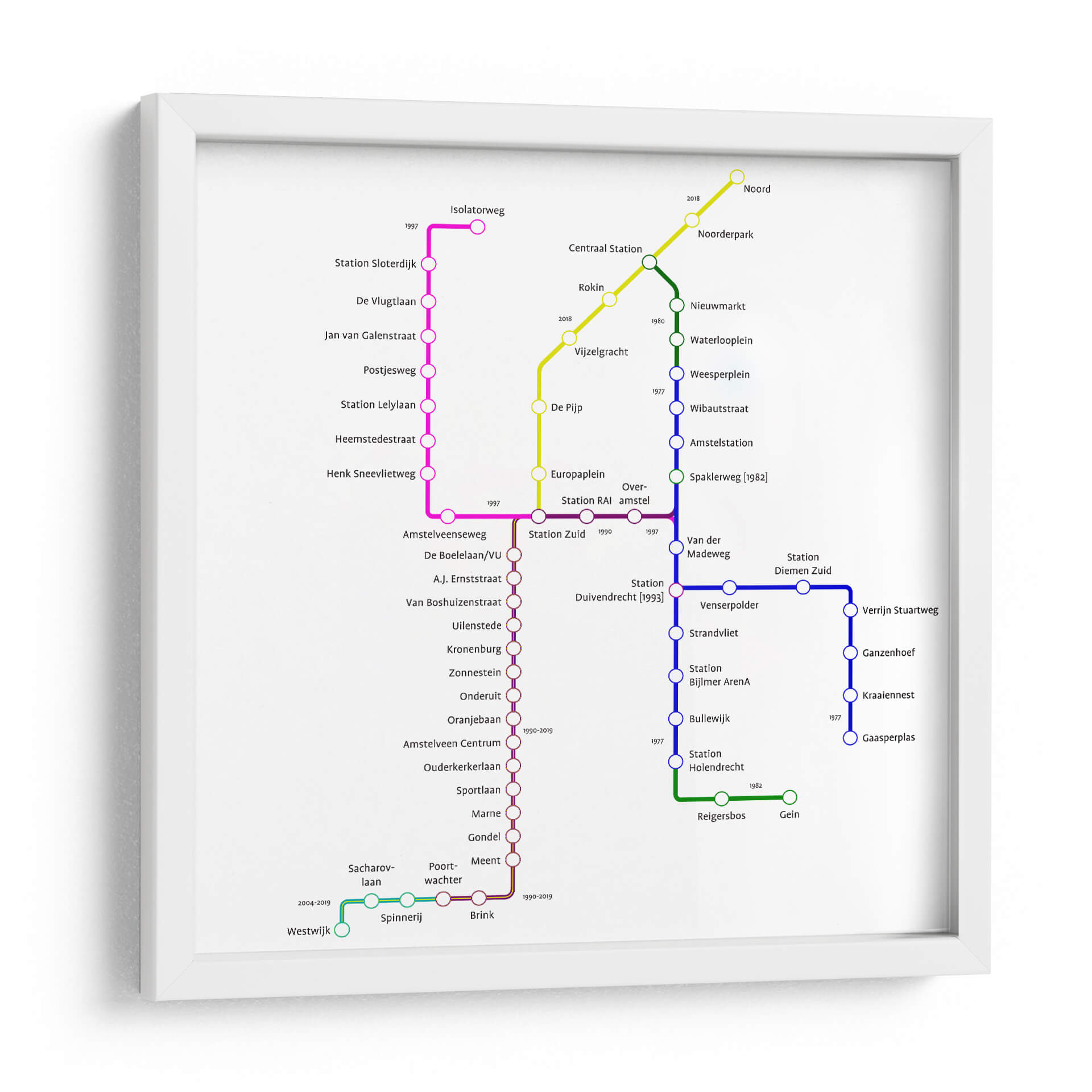 Transforma tu espacio con este cautivador cuadro decorativo inspirado en el metro de Ámsterdam, Holanda. Una pieza de diseño gráfico moderno que captura la esencia de la planificación urbana y la conectividad. Los vibrantes colores de las diferentes líneas de metro (púrpura, amarillo, verde y azul) se entrelazan sobre un fondo neutro, creando un punto focal dinámico y educativo. Cada estación está meticulosamente etiquetada, invitando a la contemplación y al descubrimiento de la intrincada red de transporte de la capital holandesa. Este diseño no solo es estéticamente agradable, sino que también evoca una sensación de orden, eficiencia y aventura urbana. Ideal para amantes de los viajes, la arquitectura, el diseño y para añadir un toque intelectual y contemporáneo a tu sala de estar, oficina o estudio. Su estilo gráfico lo hace versátil para complementar decoraciones modernas, minimalistas o eclécticas, aportando carácter y conversación a cualquier ambiente.