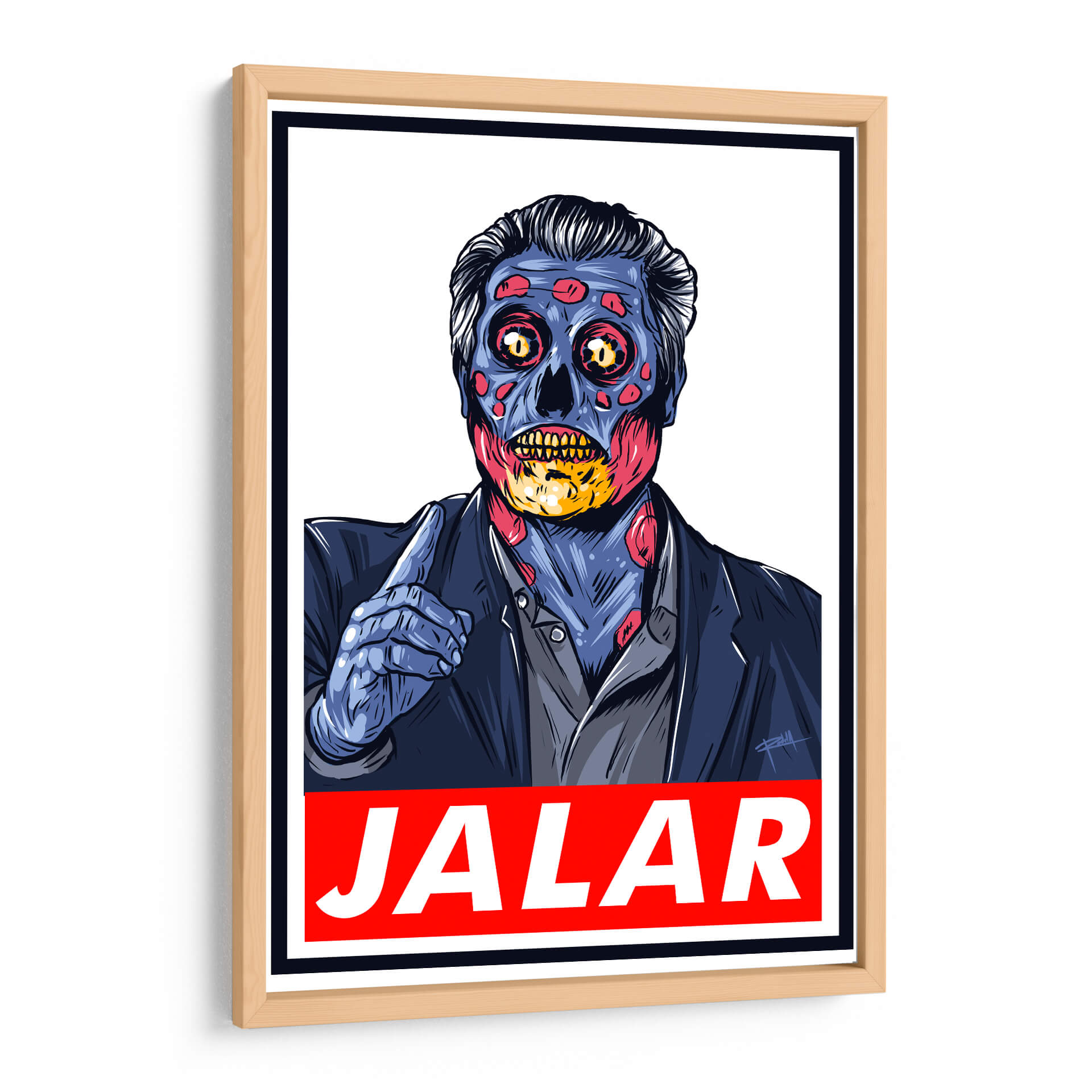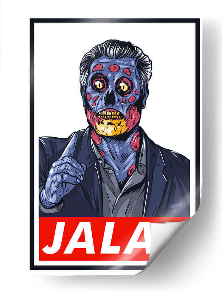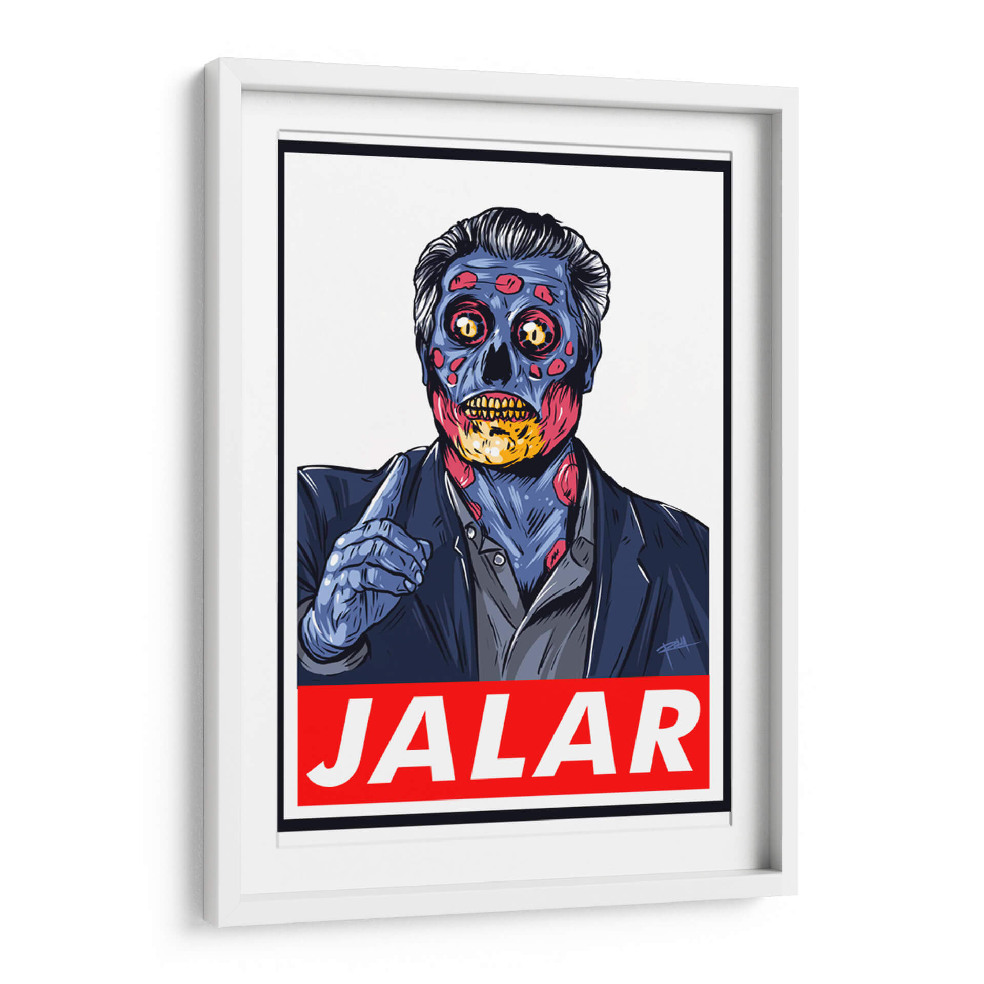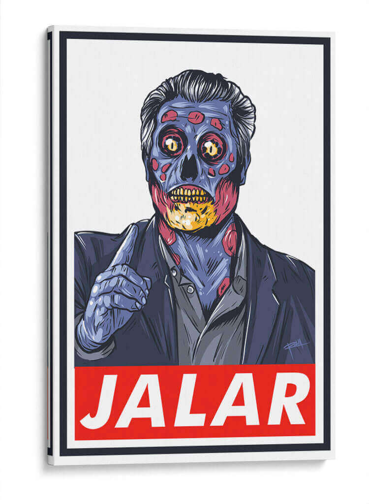 Sumérgete en el impactante mundo de "Obey Bronco" de Gerardo Rodela - Neoleón, una obra que desafía las convenciones y captura la atención de inmediato. Este cuadro decorativo presenta una figura masculina con rasgos de calavera y piel azulada, adornada con detalles en rojo y amarillo vibrante que le otorgan una energía cruda y perturbadora. El estilo gráfico y audaz, combinado con la mirada penetrante y el gesto de advertencia, crea una atmósfera de misterio y poder. La composición se centra en el rostro expresivo, enmarcado por un traje oscuro y un fondo neutro que realza su presencia. Debajo, un rótulo rojo brillante con la palabra "JALAR" añade un elemento de intriga y puede interpretarse de diversas maneras, invitando a la reflexión. Ideal para espacios que buscan un toque de arte contemporáneo atrevido y con carácter, este cuadro es perfecto para salas de estar modernas, oficinas o cualquier lugar donde se desee un punto focal que genere conversación y provoque emociones. Su paleta de colores contrastantes y su diseño gráfico lo convierten en una pieza única que inyectará personalidad a tu decoración.