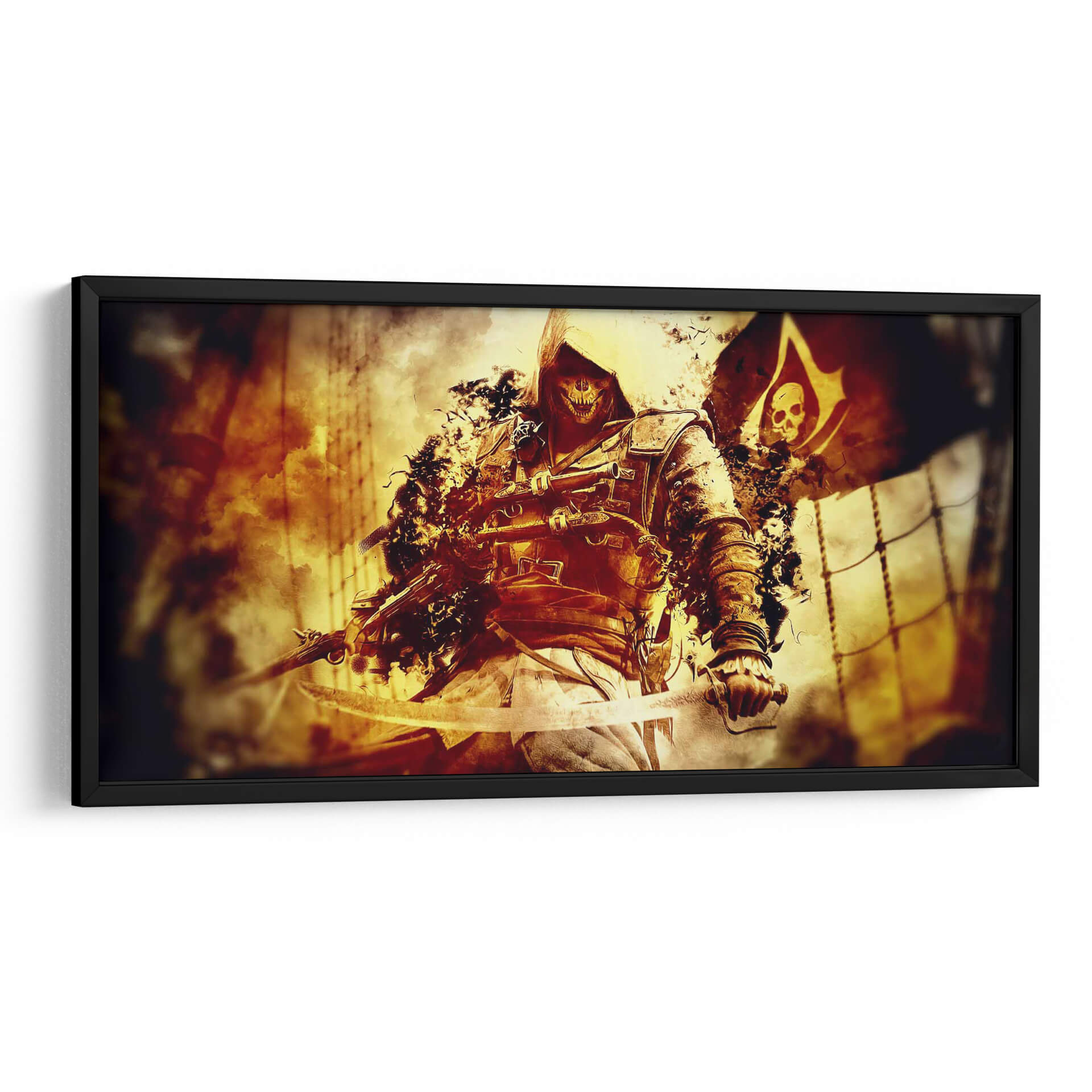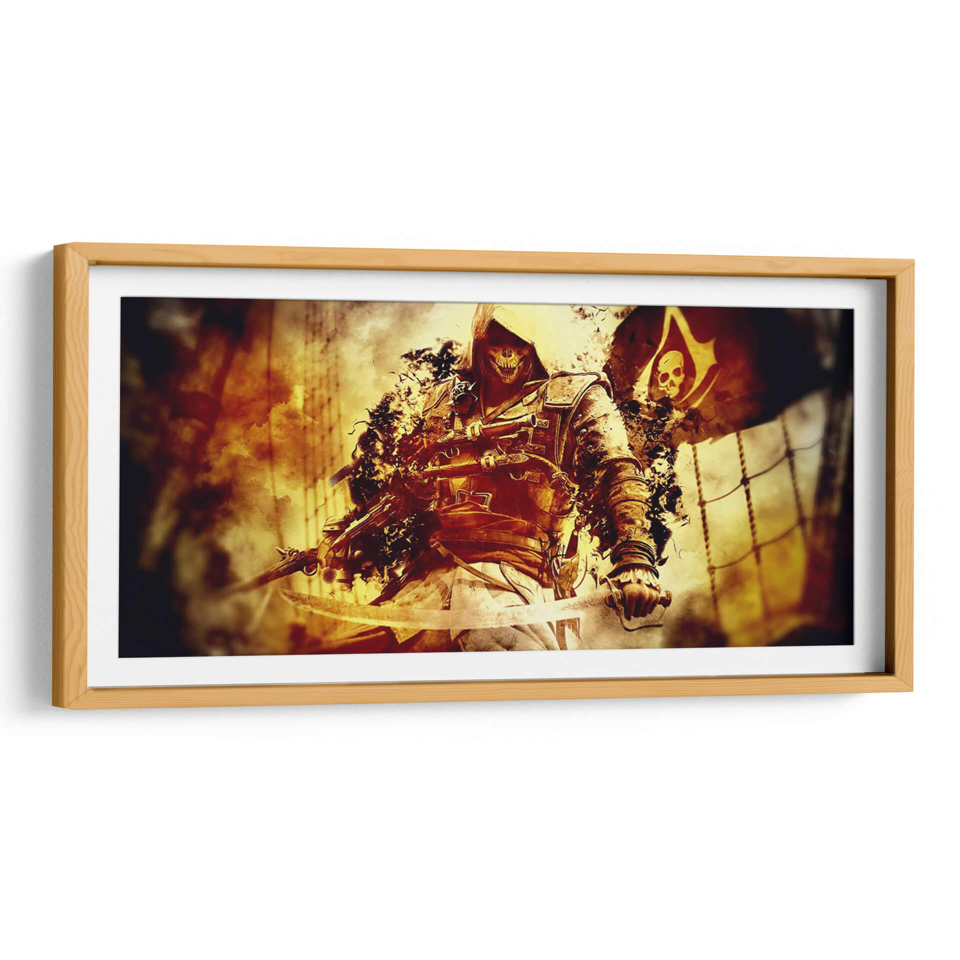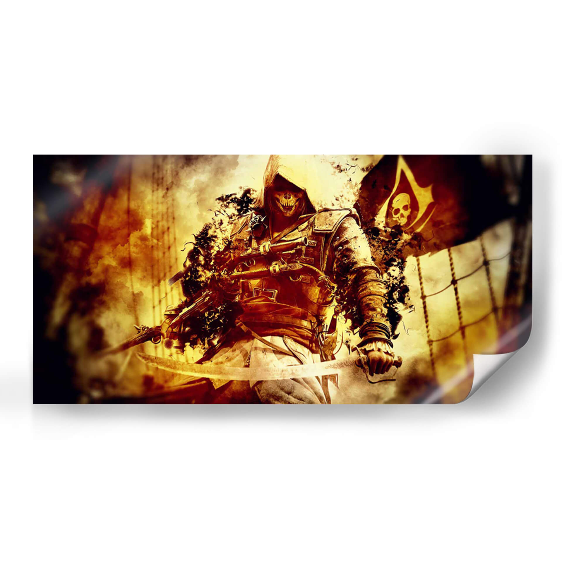 Sumérgete en la intensidad de "Pirata en Llamas", una obra de arte digital que captura la esencia de la aventura y el misterio del mar. Este cuadro decorativo presenta una figura imponente, un pirata con un aura de fuego y misterio, cuya mirada penetrante y armamento sugieren historias de audacia y peligro. La paleta de colores, dominada por tonos cálidos como el naranja, el amarillo y el marrón, junto con el contraste del negro, evoca una atmósfera de acción y drama, casi como si la escena estuviera envuelta en la calidez de una explosión o el crepúsculo ardiente. La composición es dinámica, con elementos que sugieren movimiento y poder, acentuados por partículas de fuego y humo que emanan de la figura y se mezclan con un fondo oscuro y texturizado. Este cuadro es ideal para espacios que buscan un punto focal audaz y lleno de carácter, como una sala de estar moderna, un estudio o un bar temático, añadiendo un toque de energía y un aire de leyenda a la decoración de tu hogar u oficina. Su estilo único lo convierte en una pieza de conversación que atraerá a los amantes de lo épico y lo extraordinario.