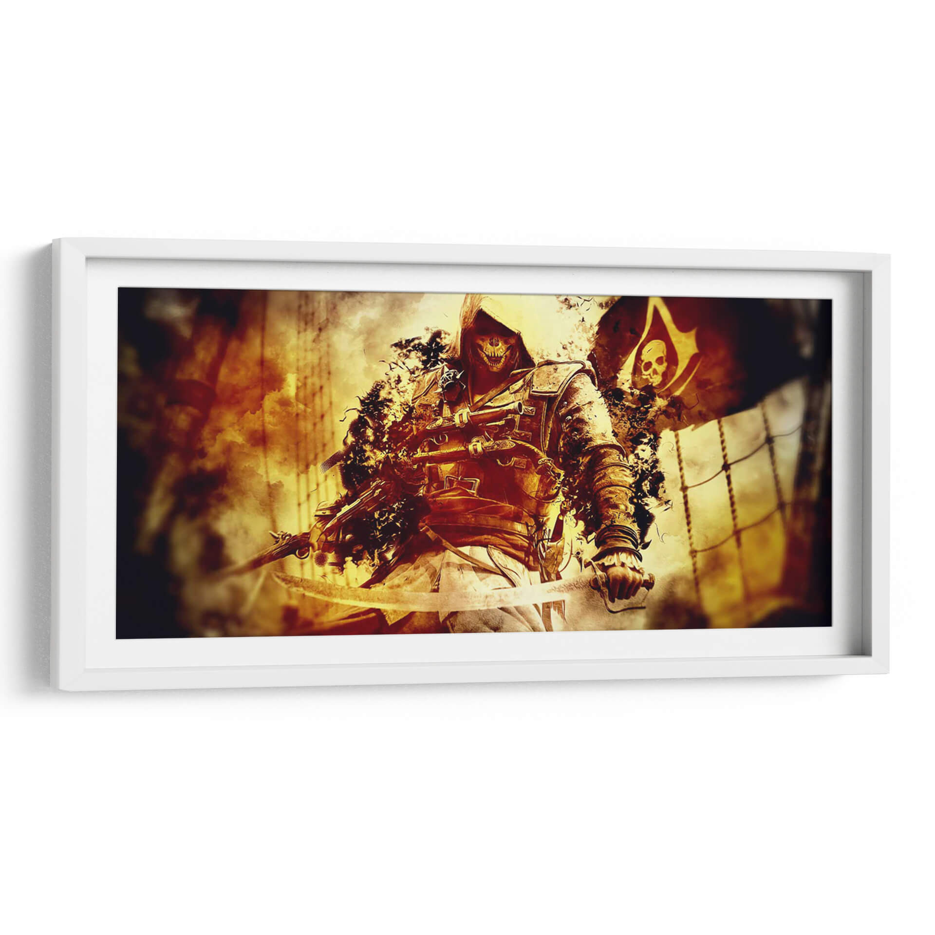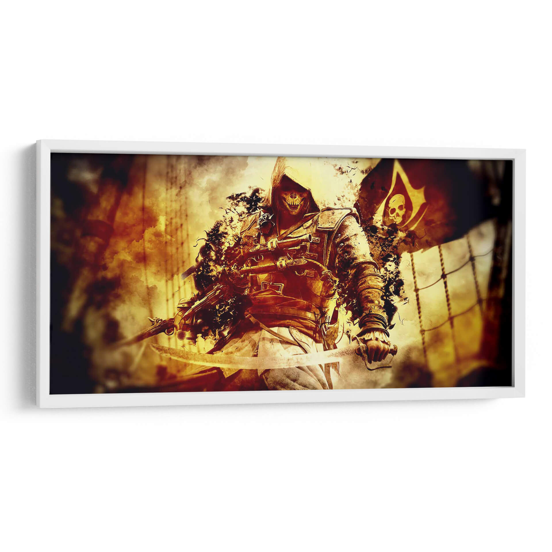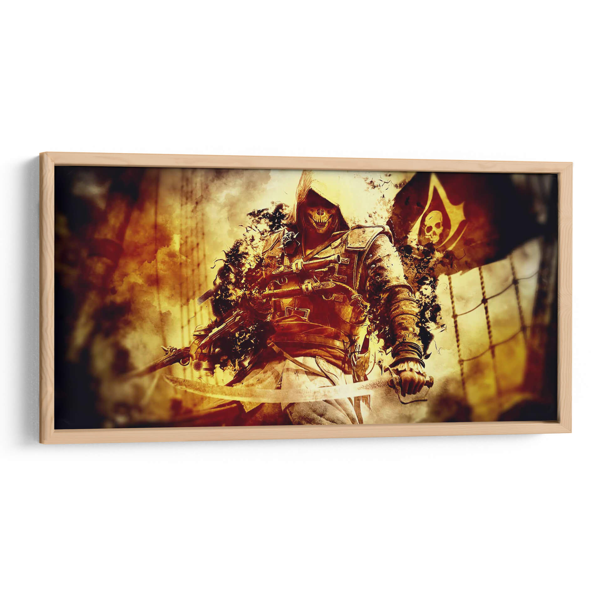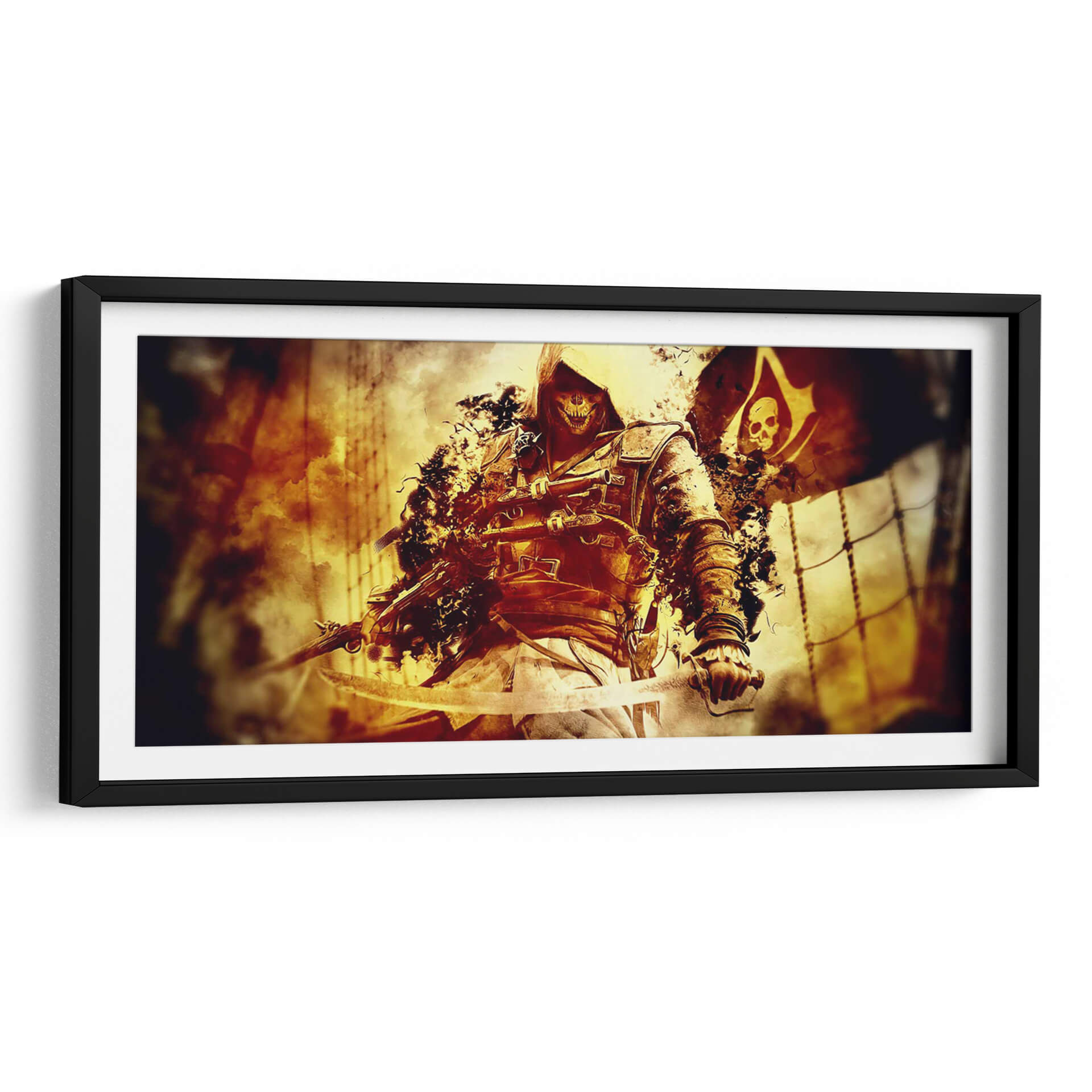 Sumérgete en la intensidad de "Pirata en Llamas", una obra de arte digital que captura la esencia de la aventura y el misterio del mar. Este cuadro decorativo presenta una figura imponente, un pirata con un aura de fuego y misterio, cuya mirada penetrante y armamento sugieren historias de audacia y peligro. La paleta de colores, dominada por tonos cálidos como el naranja, el amarillo y el marrón, junto con el contraste del negro, evoca una atmósfera de acción y drama, casi como si la escena estuviera envuelta en la calidez de una explosión o el crepúsculo ardiente. La composición es dinámica, con elementos que sugieren movimiento y poder, acentuados por partículas de fuego y humo que emanan de la figura y se mezclan con un fondo oscuro y texturizado. Este cuadro es ideal para espacios que buscan un punto focal audaz y lleno de carácter, como una sala de estar moderna, un estudio o un bar temático, añadiendo un toque de energía y un aire de leyenda a la decoración de tu hogar u oficina. Su estilo único lo convierte en una pieza de conversación que atraerá a los amantes de lo épico y lo extraordinario.