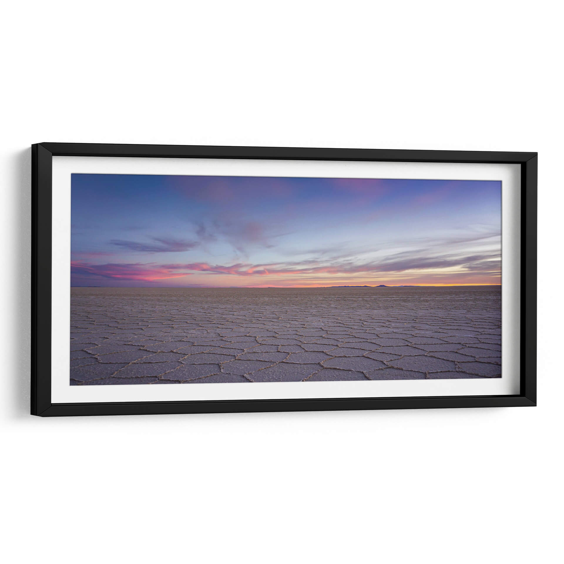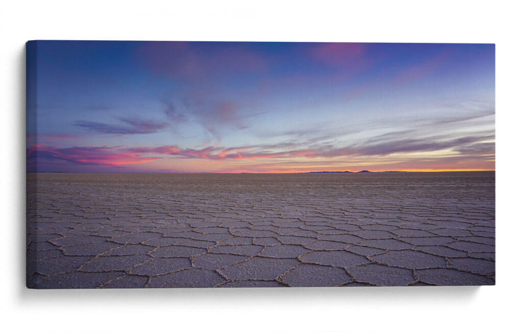 Sumérgete en la majestuosidad del Salar de Uyuni con este impresionante cuadro decorativo que captura la esencia de un atardecer sereno sobre un paisaje vasto y texturizado. La obra presenta un cielo de ensueño, teñido de azules profundos y pinceladas vibrantes de rosa y naranja, donde las nubes se extienden como delicadas acuarelas. En la tierra, un patrón geométrico de polígonos secos se despliega hasta el horizonte, creando una sensación de orden natural y serenidad. Este cuadro minimalista y evocador es perfecto para añadir un toque de paz y asombro a cualquier espacio. Imagina contemplar este paisaje de sal y cielo cada día en tu sala de estar, dormitorio u oficina, transportándote a un lugar de tranquilidad y belleza natural. Su composición equilibrada y su paleta de colores suaves lo convierten en una pieza versátil, ideal para complementar decoraciones modernas, contemporáneas o rústicas. Transforma tu hogar en un santuario de calma y estilo con esta representación artística única de uno de los paisajes más cautivadores del mundo.