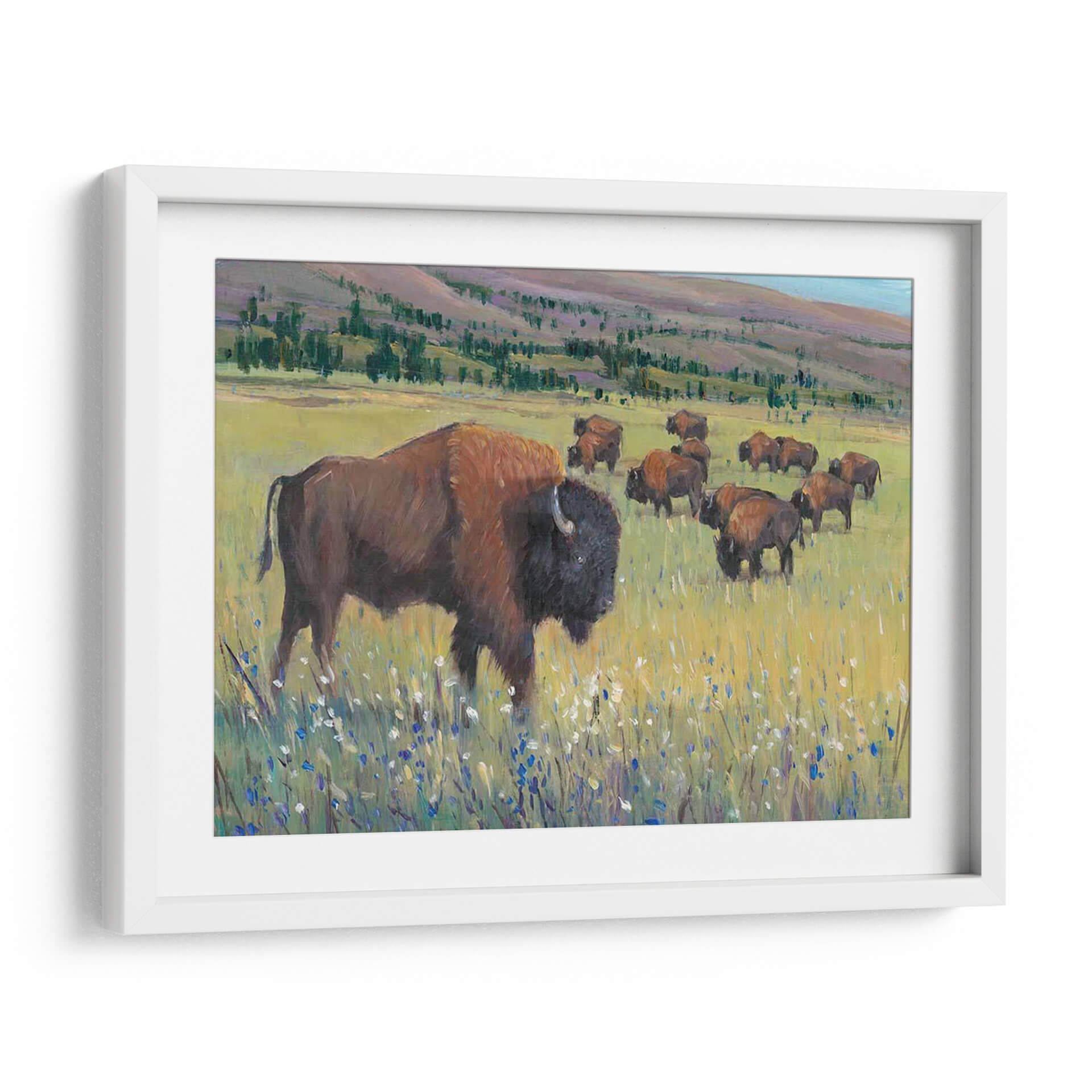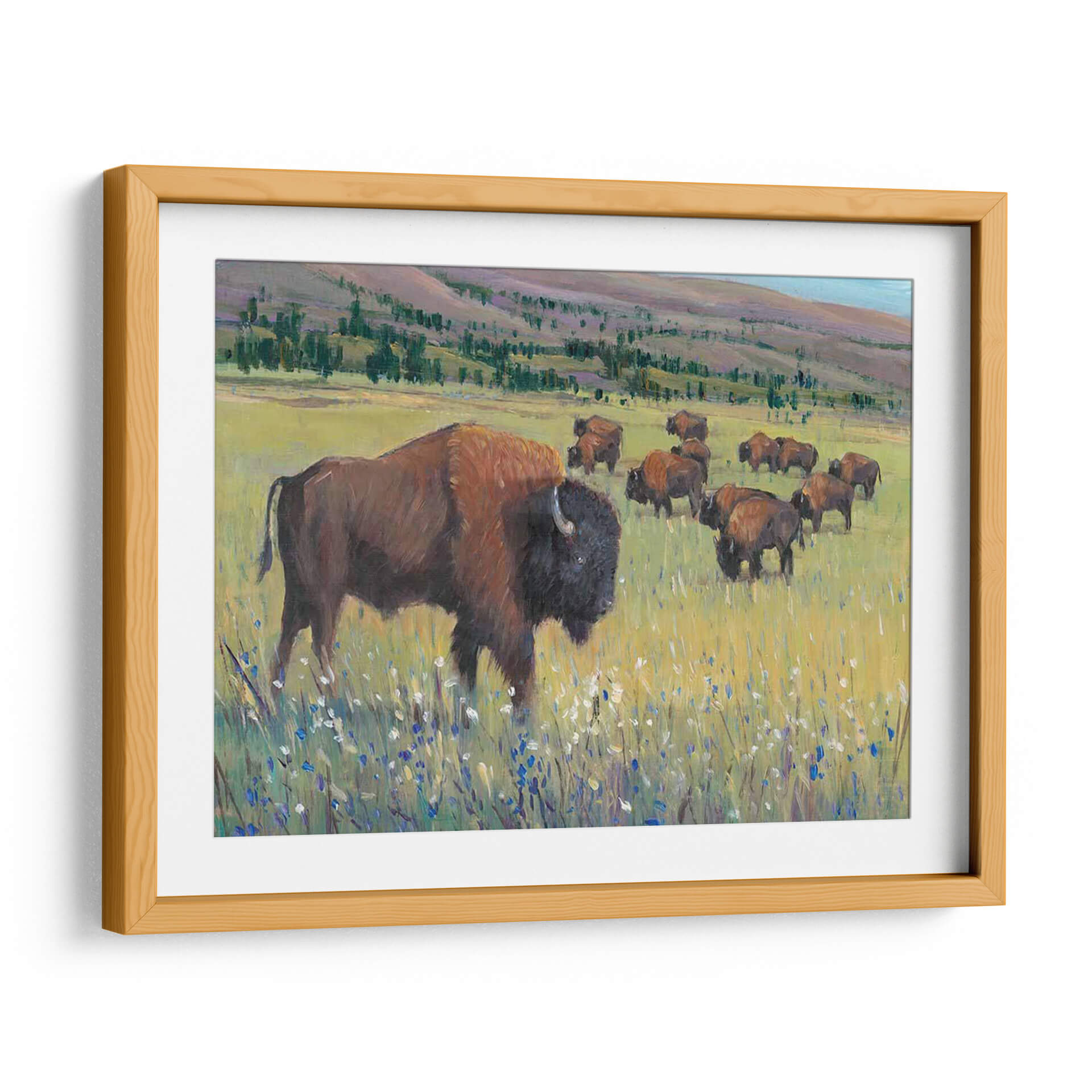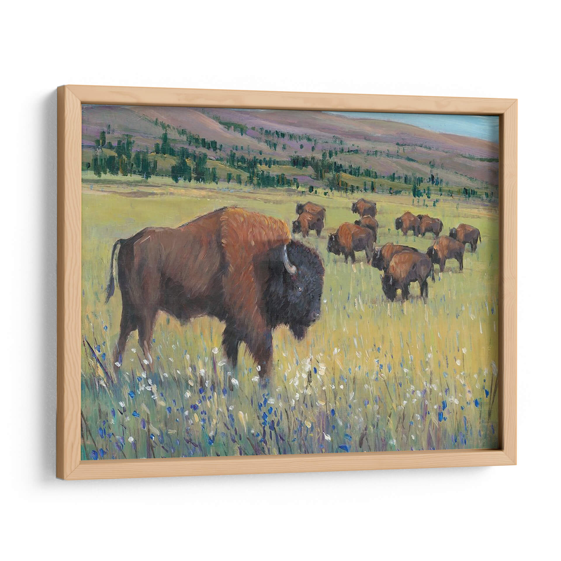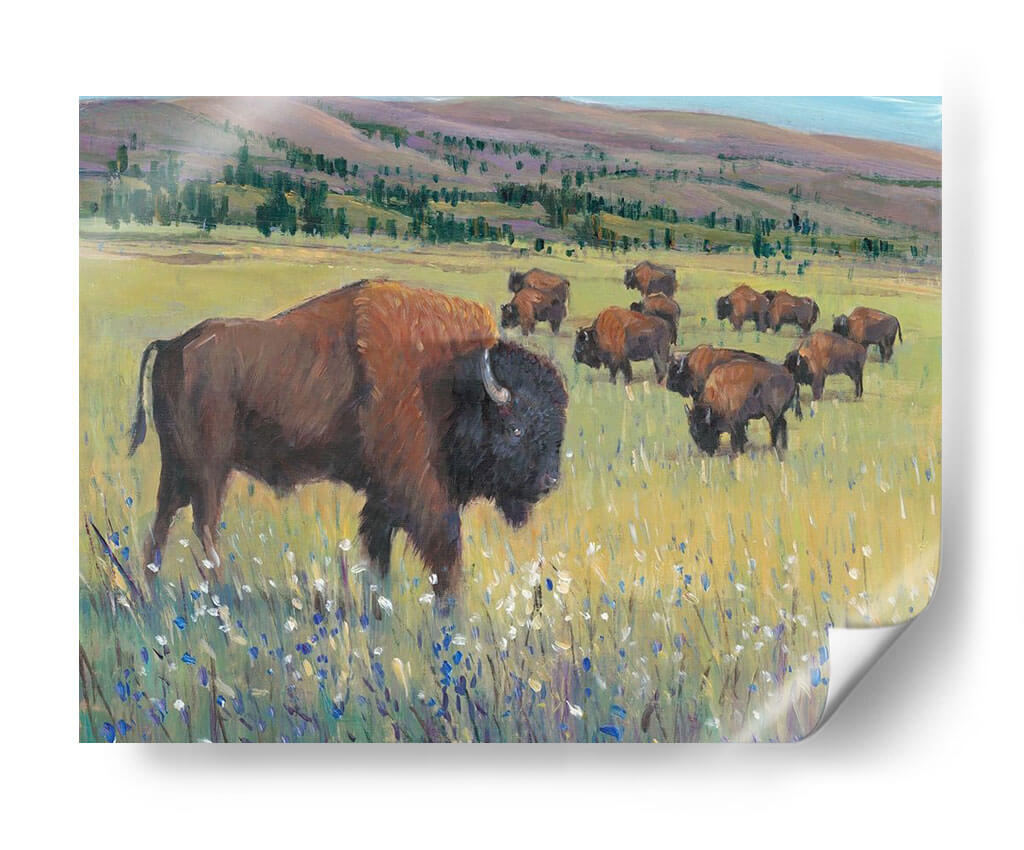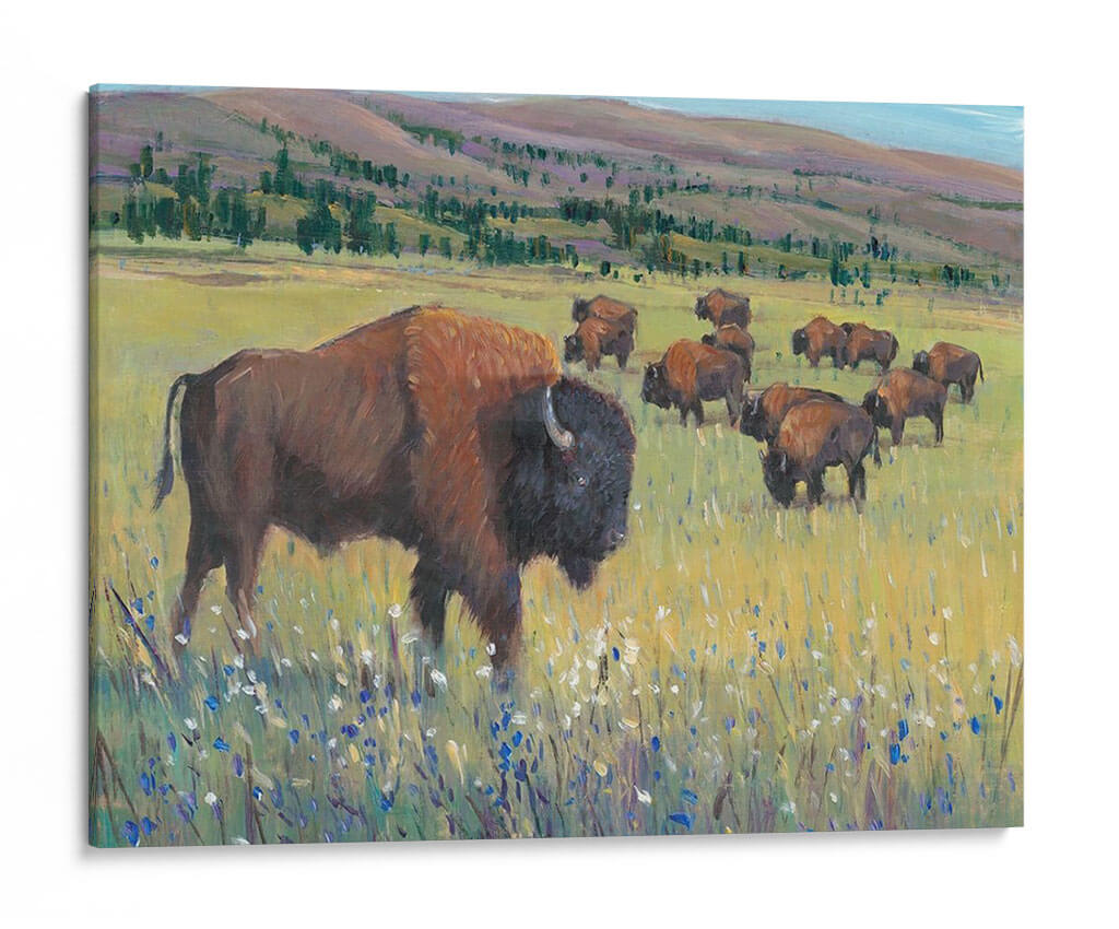 Adéntrate en la majestuosidad de la naturaleza con "Animales Del Oeste I", una obra de arte cautivadora que captura la esencia de los búfalos en su hábitat natural. Este cuadro decorativo presenta una manada de majestuosos búfalos pastando en un extenso prado, con un imponente ejemplar en primer plano que irradia fuerza y serenidad. Los tonos tierra y verdes dominantes, salpicados por delicadas flores azules y blancas, crean una atmósfera de paz y conexión con el entorno salvaje. La pincelada suelta y expresiva del artista Tim O'Toole aporta vitalidad y textura a la escena, invitando al espectador a sumergirse en la vastedad del paisaje del oeste americano. Ideal para salones, estudios u oficinas, esta pieza evoca la libertad, la resiliencia y la belleza indómita de la vida silvestre. Añade un toque de naturaleza y carácter a tu decoración con este impresionante cuadro de búfalos, perfecto para quienes aprecian el arte inspirado en paisajes y animales.