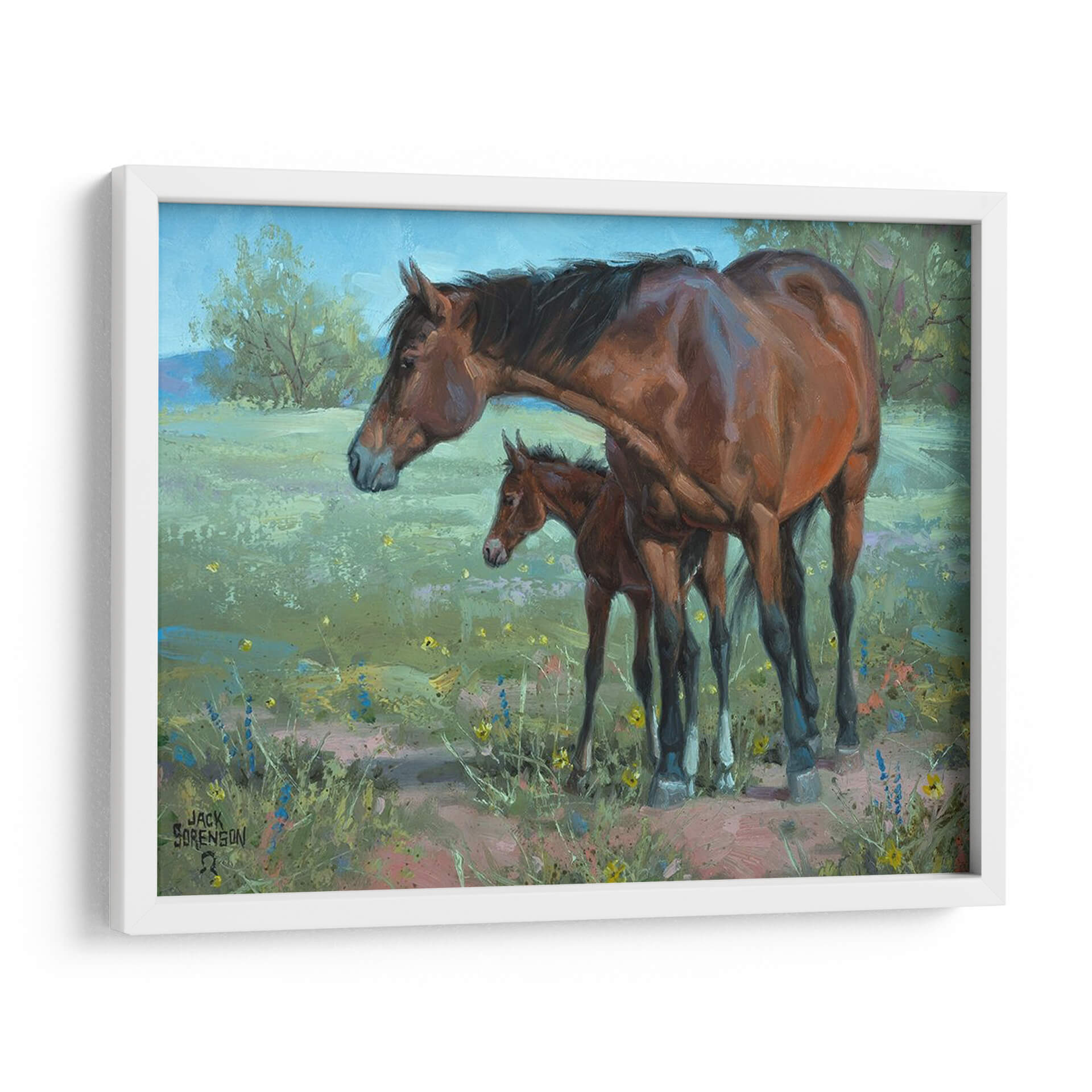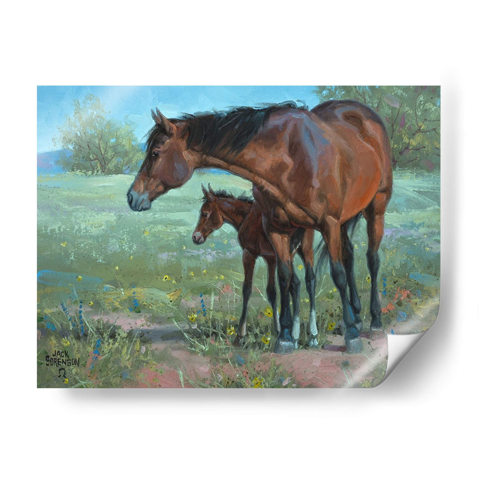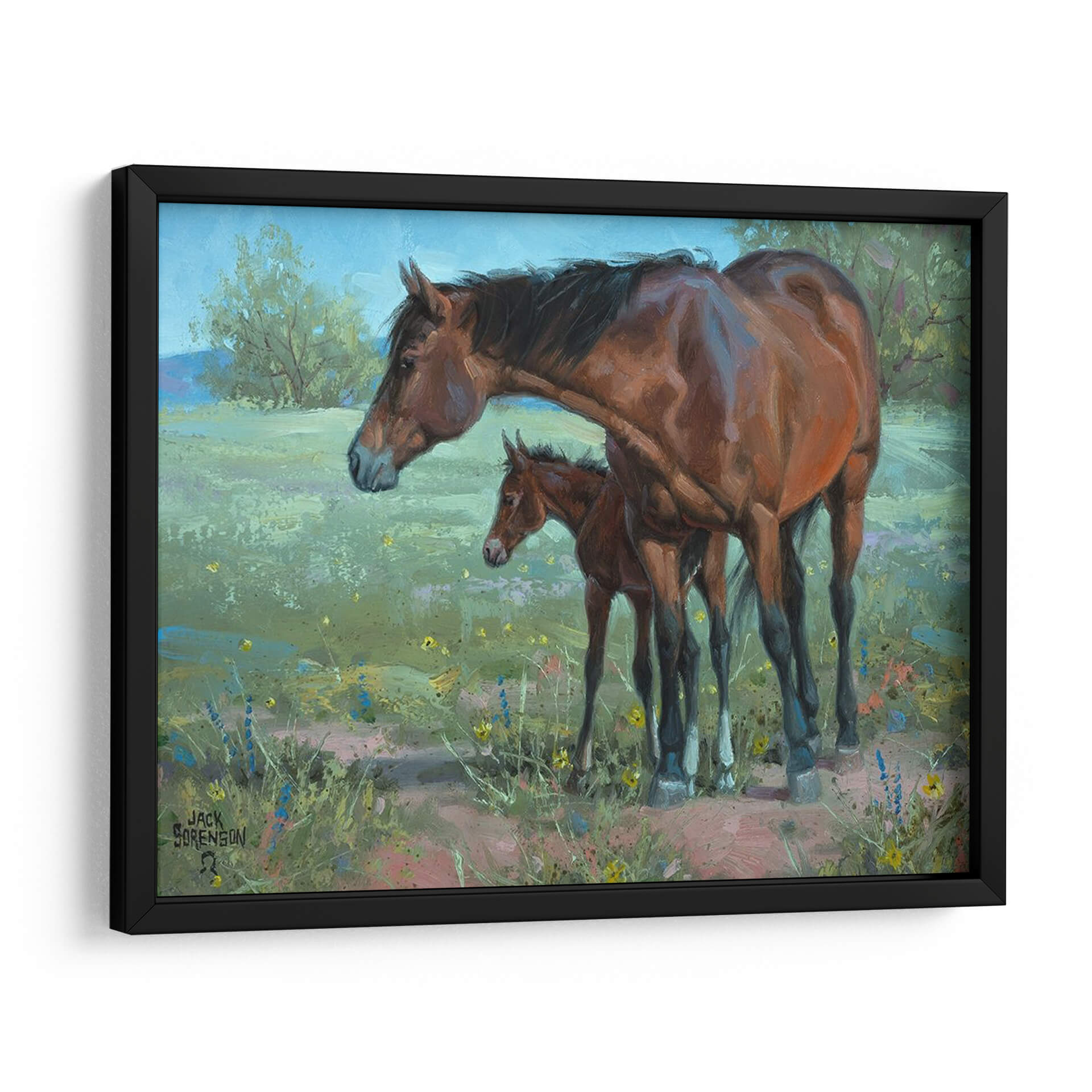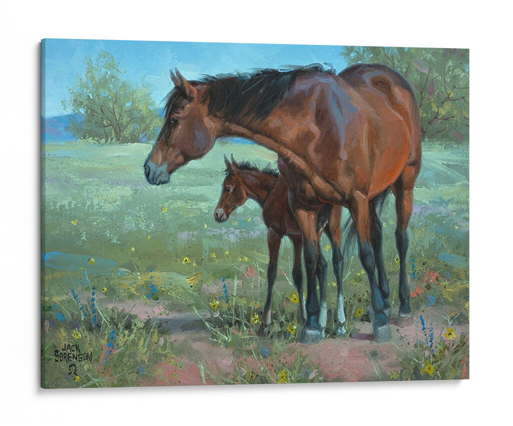 Captura la esencia de la naturaleza y el vínculo materno con este evocador cuadro decorativo "Bajo Mamas Ojo Vigilante" del artista Jack Sorenson. La obra presenta a una majestuosa yegua protegiendo a su tierno potro en un prado pintoresco, donde la luz del sol baña la escena en tonos cálidos y serenos. La paleta de colores, dominada por marrones ricos, verdes exuberantes y un cielo azul vibrante, crea una atmósfera de paz y conexión profunda. El estilo artístico, una mezcla de realismo y expresionismo, da vida a los animales y al entorno con pinceladas audaces y una captura magistral de la luz y la sombra. Este cuadro es ideal para infundir serenidad y un toque rústico en cualquier habitación, desde la sala de estar hasta un dormitorio acogedor o una oficina que busque inspiración natural. Añade una pieza de arte que celebra la fuerza, la ternura y la belleza indómita de la vida silvestre.