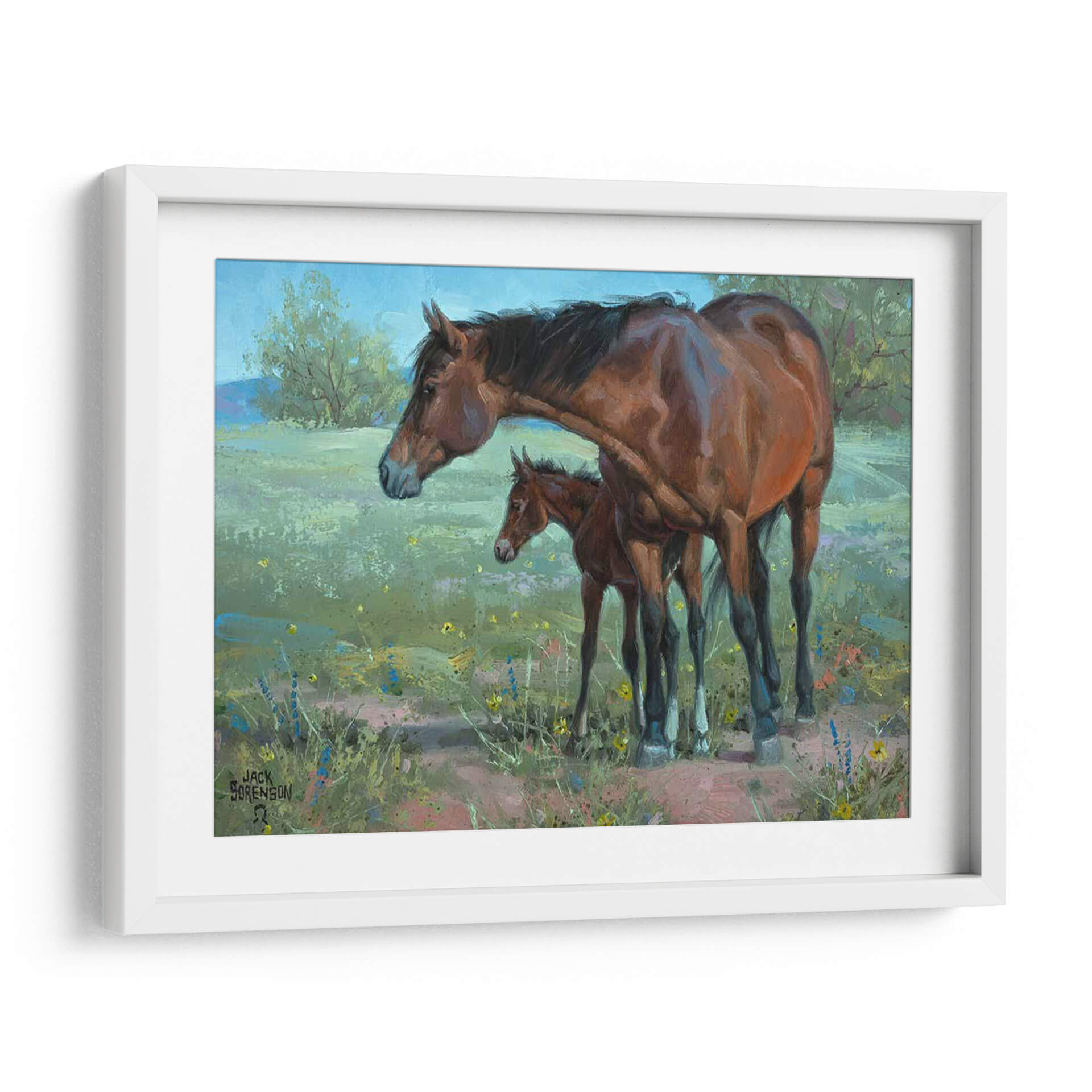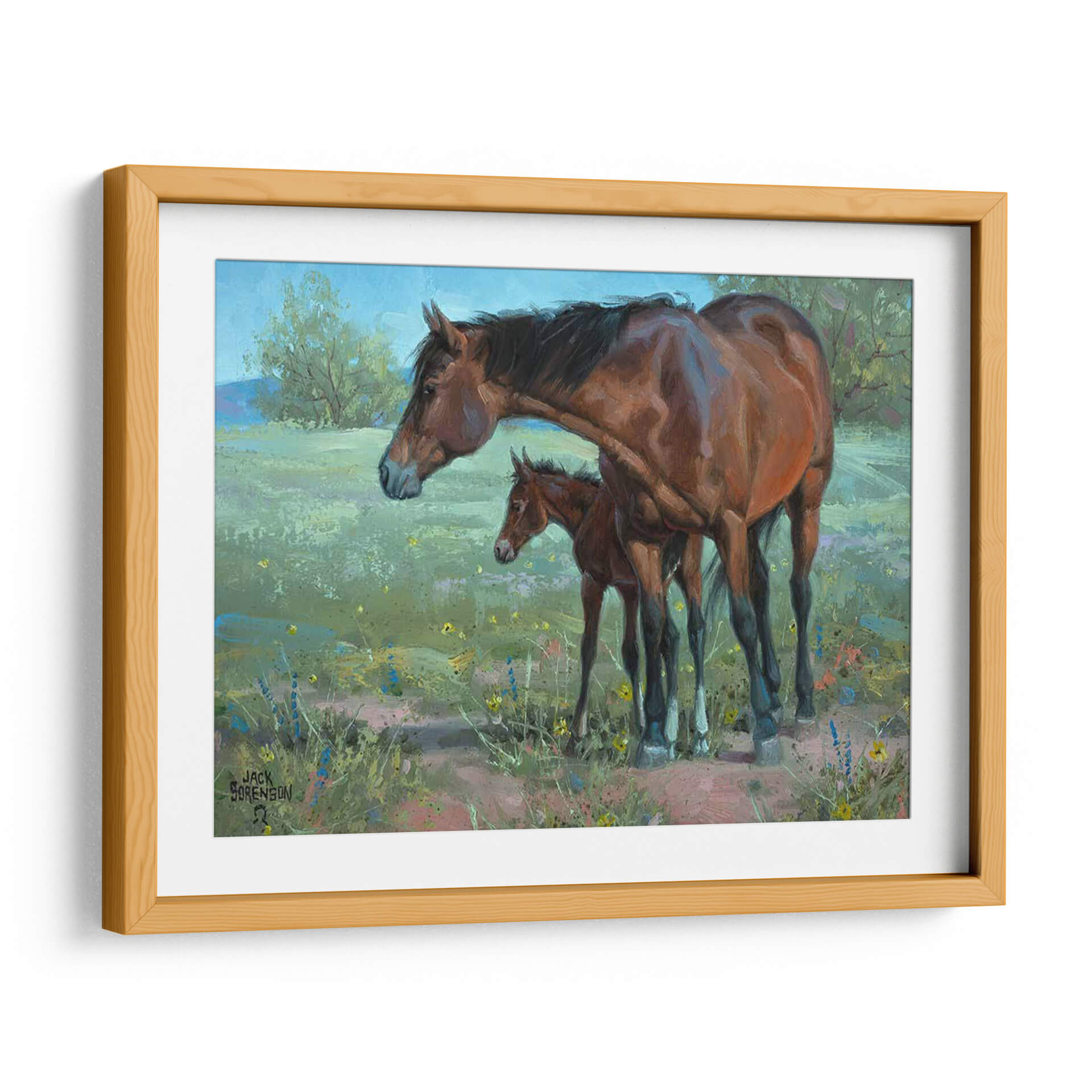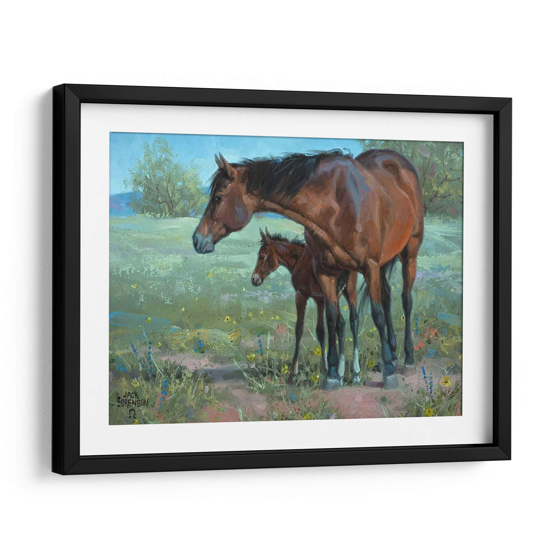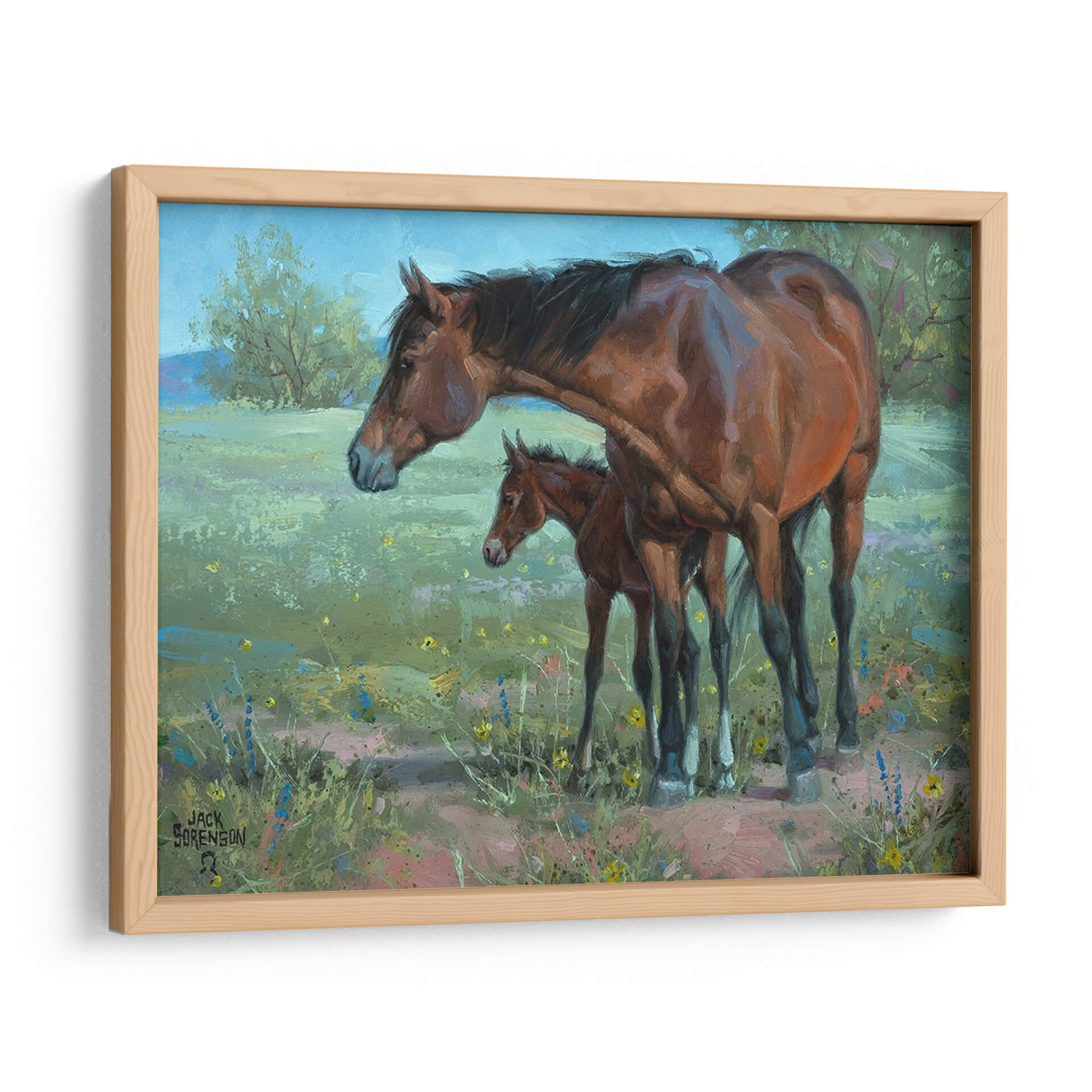 Captura la esencia de la naturaleza y el vínculo materno con este evocador cuadro decorativo "Bajo Mamas Ojo Vigilante" del artista Jack Sorenson. La obra presenta a una majestuosa yegua protegiendo a su tierno potro en un prado pintoresco, donde la luz del sol baña la escena en tonos cálidos y serenos. La paleta de colores, dominada por marrones ricos, verdes exuberantes y un cielo azul vibrante, crea una atmósfera de paz y conexión profunda. El estilo artístico, una mezcla de realismo y expresionismo, da vida a los animales y al entorno con pinceladas audaces y una captura magistral de la luz y la sombra. Este cuadro es ideal para infundir serenidad y un toque rústico en cualquier habitación, desde la sala de estar hasta un dormitorio acogedor o una oficina que busque inspiración natural. Añade una pieza de arte que celebra la fuerza, la ternura y la belleza indómita de la vida silvestre.