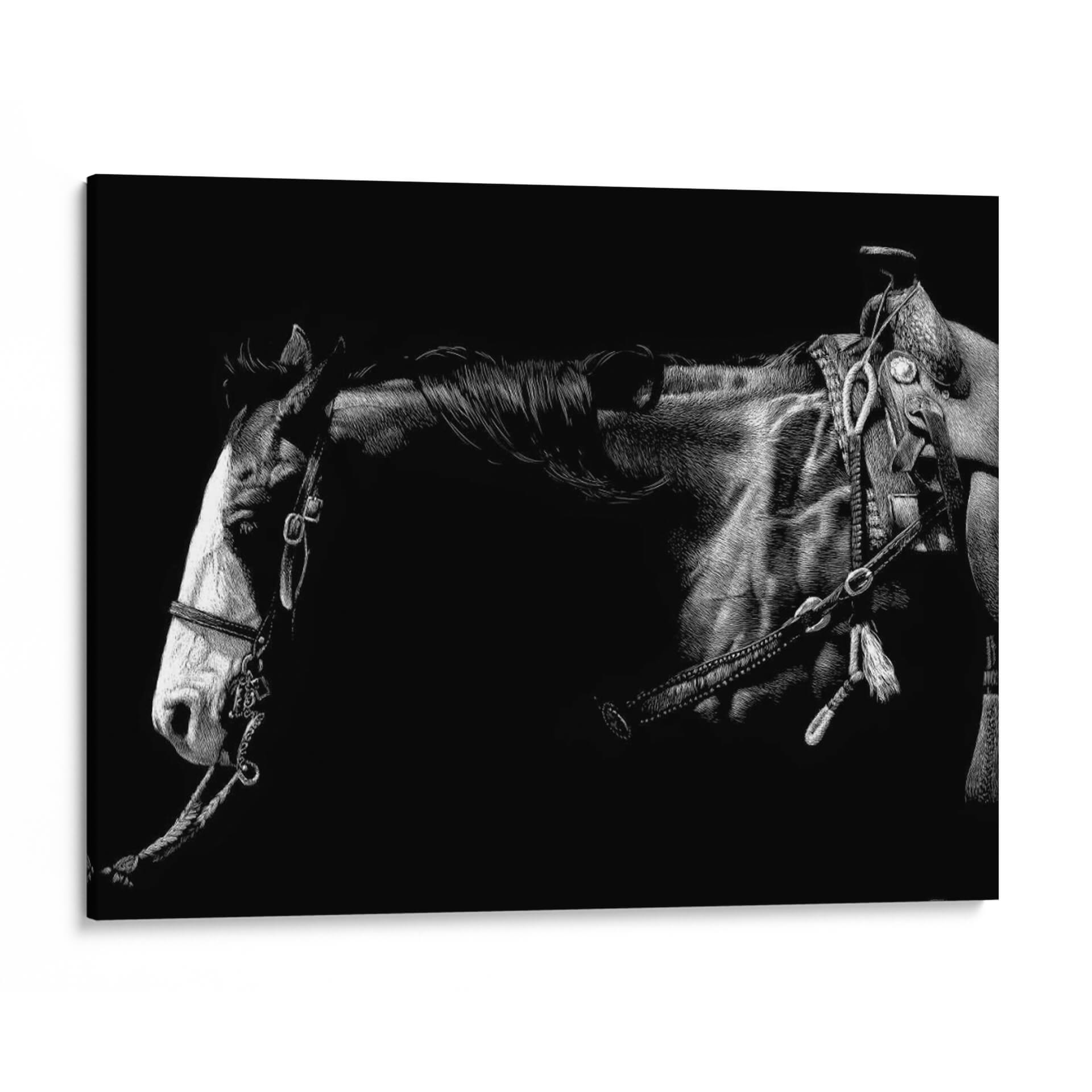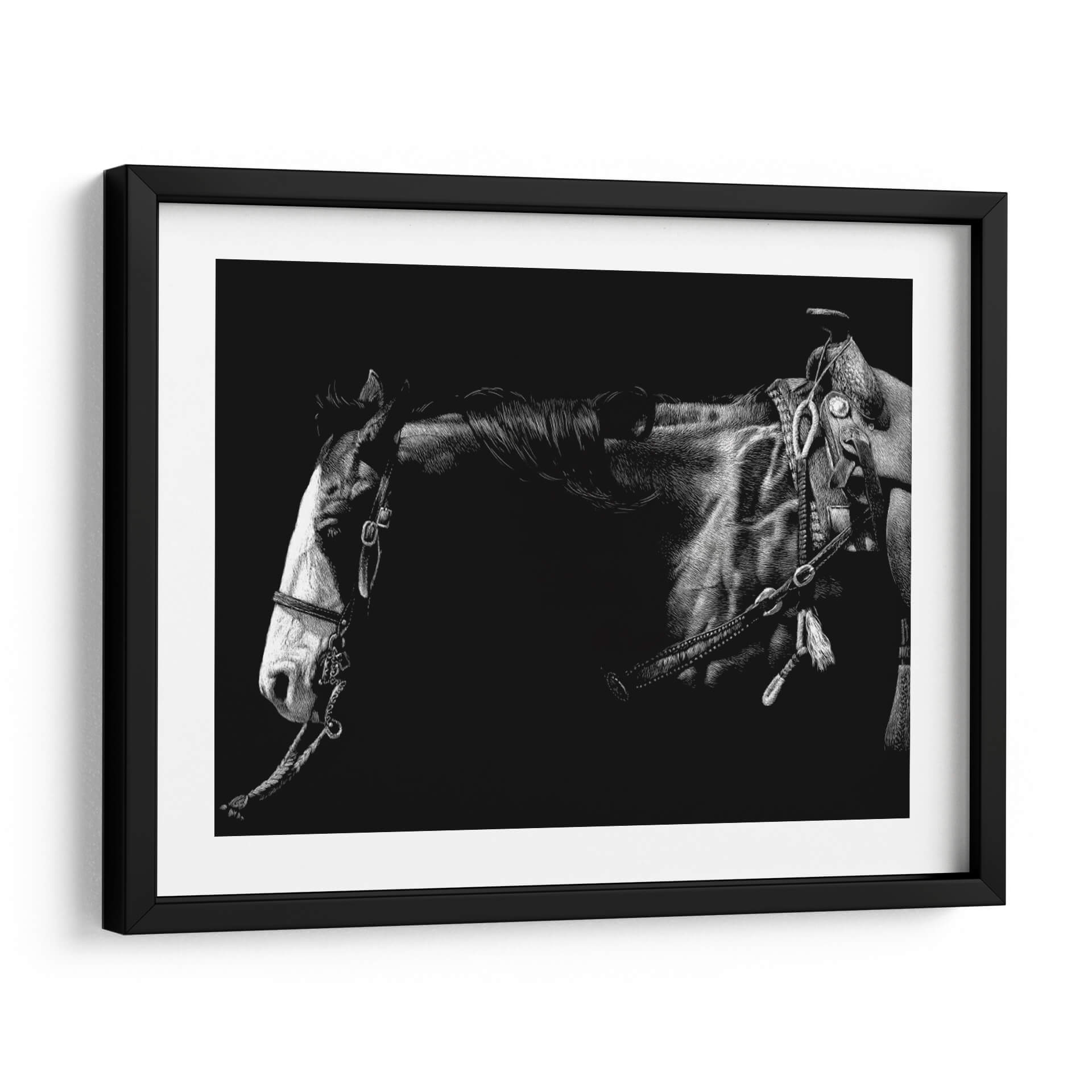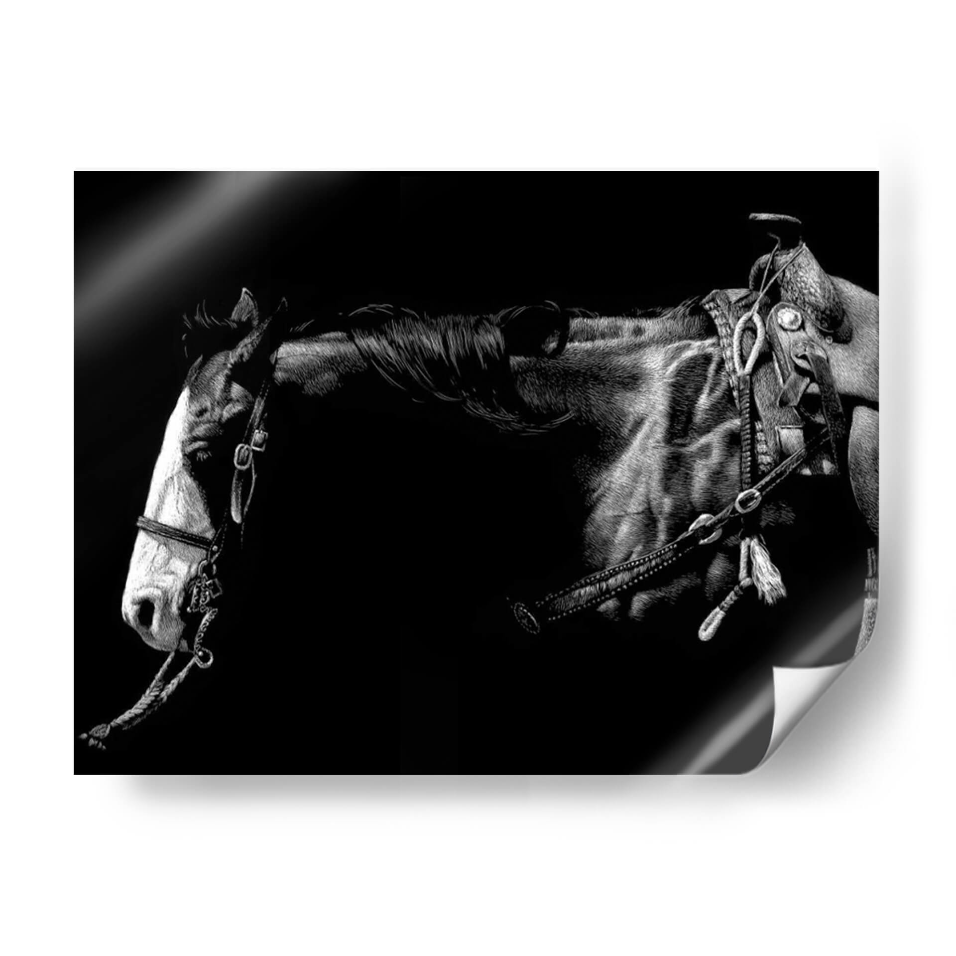 Captura la esencia del espíritu ecuestre con este impresionante cuadro decorativo de un bulldog a caballo, titulado 'Bulldogger Caldfaced' por Julie T. Chapman. La obra se presenta en un potente contraste de blanco y negro, destacando cada detalle intrincado del pelaje del caballo y la textura de la montura occidental. La luz ilumina sutilmente el hocico y el cuello del equino, mientras que el fondo oscuro crea una atmósfera de misterio y elegancia. Este retrato ecuestre, de estilo realista con un toque dramático, evoca una sensación de fuerza, lealtad y la indomable naturaleza del oeste. Es una pieza ideal para amantes de los animales, entusiastas de la equitación o cualquiera que busque añadir un toque de carácter y sofisticación a su hogar u oficina. Transforma tu espacio con esta obra de arte cautivadora que narra una historia de valentía y conexión.