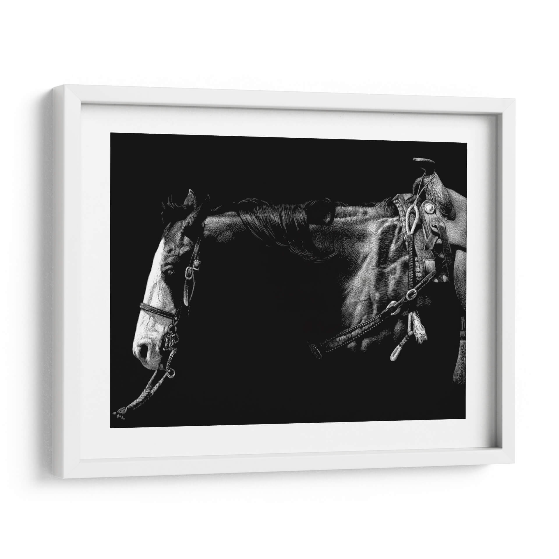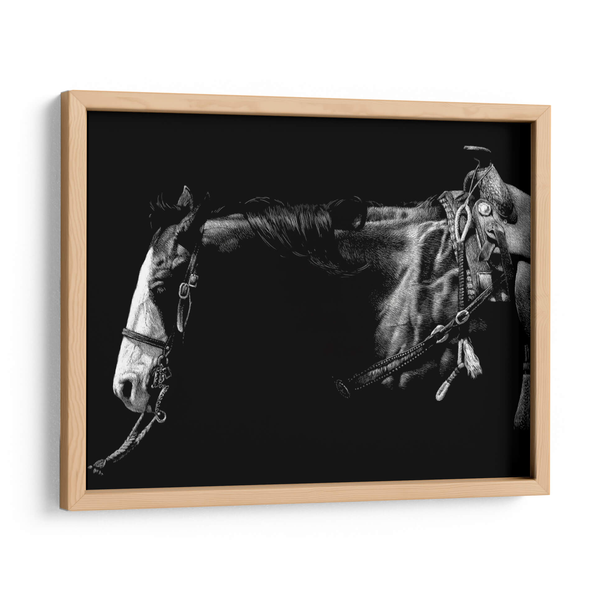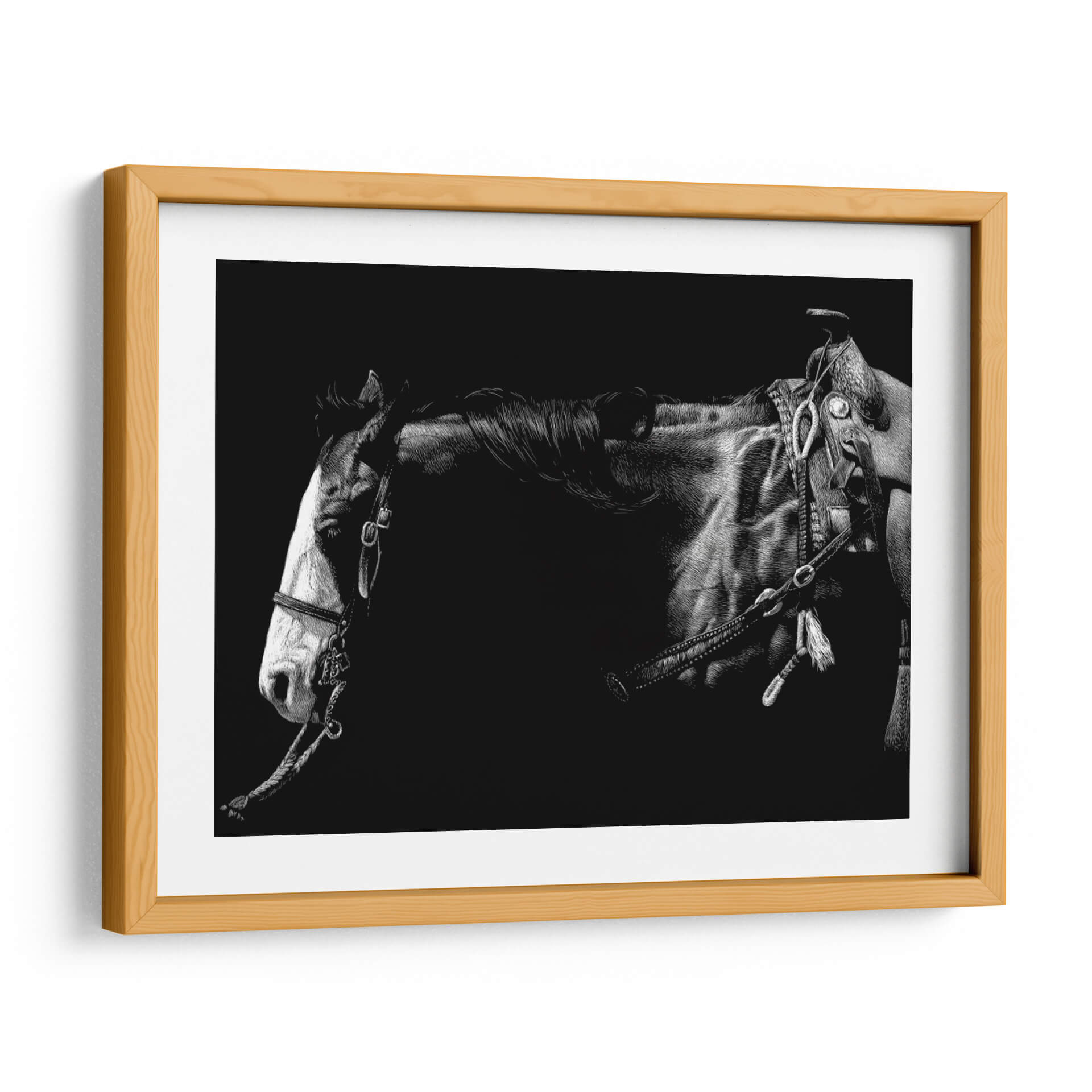 Captura la esencia del espíritu ecuestre con este impresionante cuadro decorativo de un bulldog a caballo, titulado 'Bulldogger Caldfaced' por Julie T. Chapman. La obra se presenta en un potente contraste de blanco y negro, destacando cada detalle intrincado del pelaje del caballo y la textura de la montura occidental. La luz ilumina sutilmente el hocico y el cuello del equino, mientras que el fondo oscuro crea una atmósfera de misterio y elegancia. Este retrato ecuestre, de estilo realista con un toque dramático, evoca una sensación de fuerza, lealtad y la indomable naturaleza del oeste. Es una pieza ideal para amantes de los animales, entusiastas de la equitación o cualquiera que busque añadir un toque de carácter y sofisticación a su hogar u oficina. Transforma tu espacio con esta obra de arte cautivadora que narra una historia de valentía y conexión.