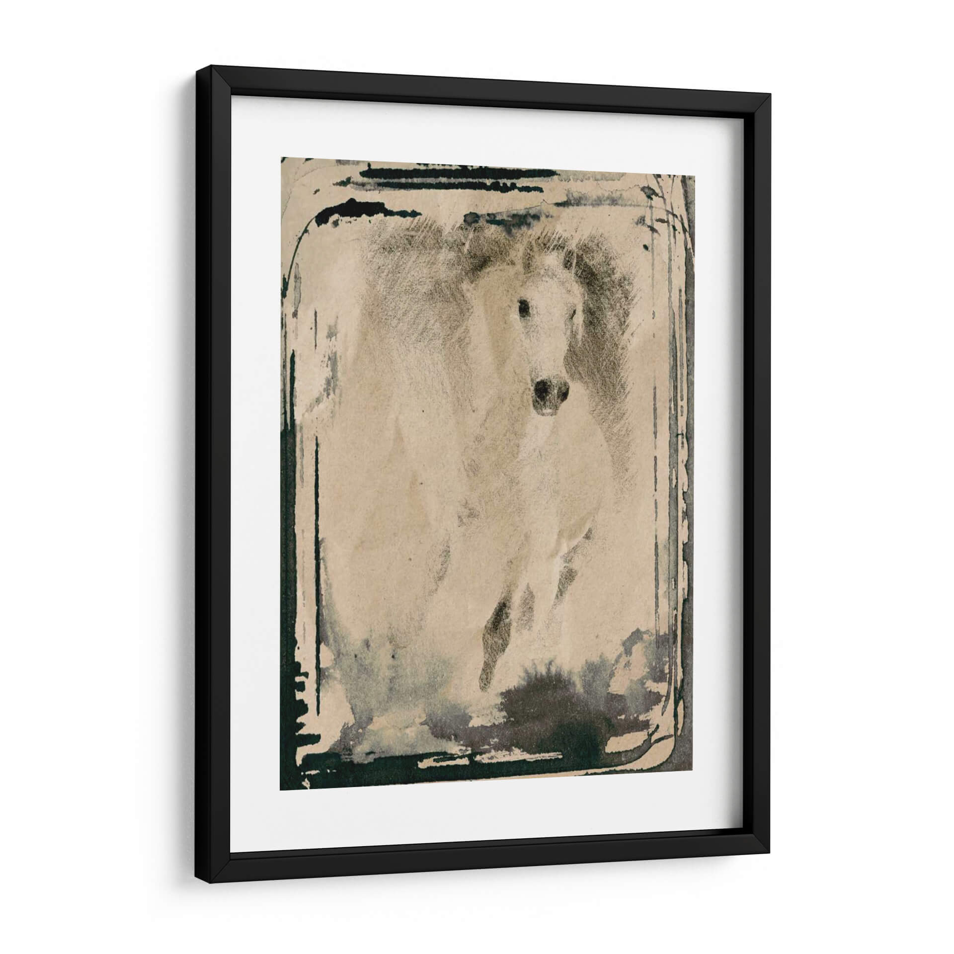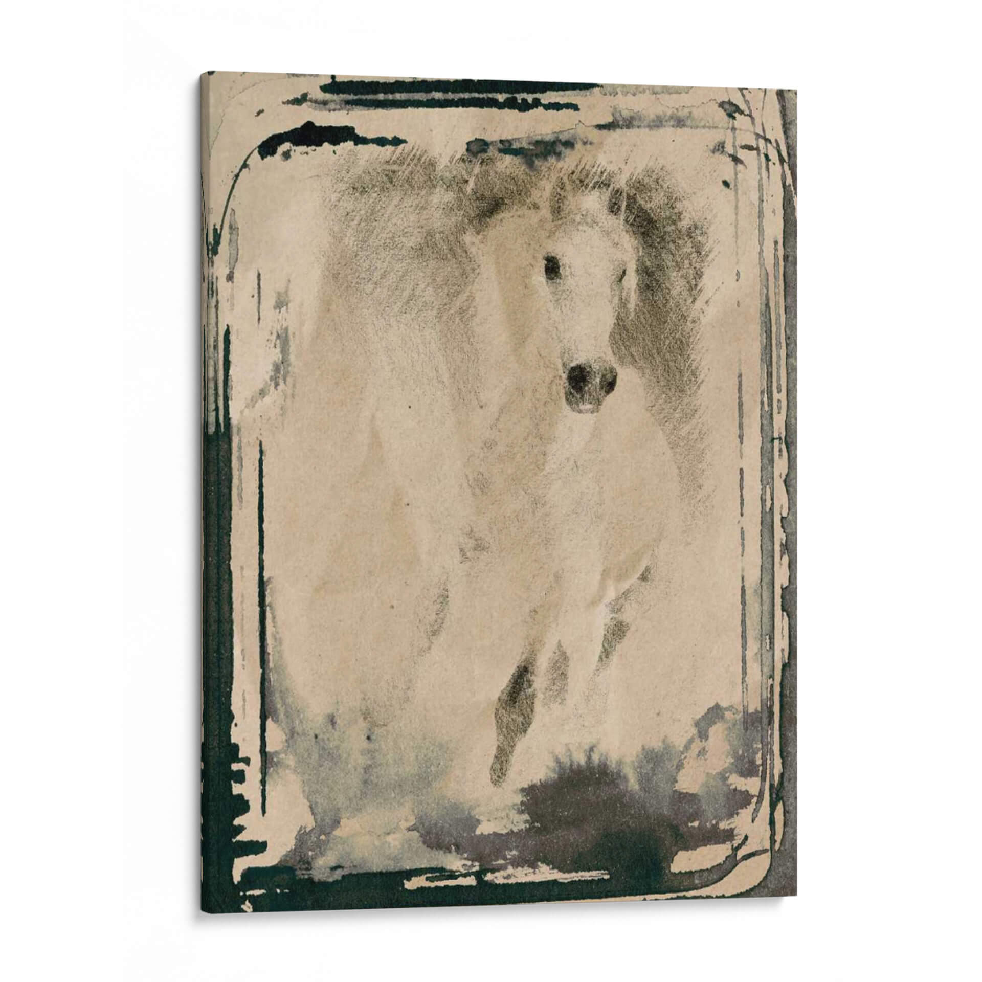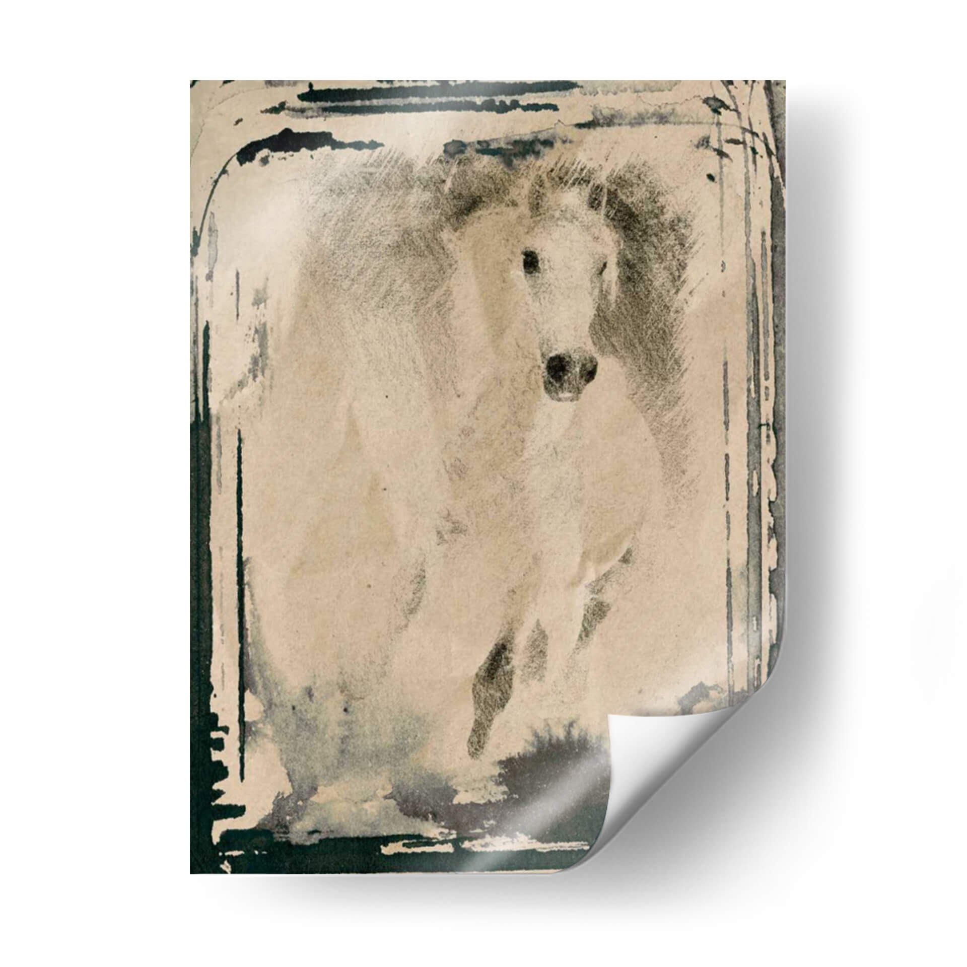 Captura la fuerza y la elegancia indomable con este cuadro decorativo de un caballo corriendo, una obra maestra de Irena Orlov. La pieza evoca una sensación de movimiento dinámico y libertad salvaje, con un estilo que fusiona la técnica del dibujo a lápiz o carboncillo con toques de acuarela o tinta para crear una atmósfera etérea y poderosa. La paleta de colores, predominantemente en tonos sepia y grises, junto con las pinceladas de tinta oscura que bordean la composición, confiere a la obra una profundidad y un carácter casi atemporal, rememorando viejas fotografías o bocetos artísticos. El caballo, representado en pleno galope, se convierte en un símbolo de energía pura y determinación, con su crin al viento y su mirada intensa. Este cuadro decorativo es ideal para espacios que buscan un toque de distinción y carácter, ya sea en una sala de estar moderna, un estudio o una oficina. Su estilo artístico, que podríamos definir como expresionista con influencias figurativas, permite que encaje en decoraciones rústicas, industriales o contemporáneas, añadiendo un punto focal cautivador y una narrativa visual que invita a la contemplación. Añade esta pieza a tu colección y transforma tu hogar en una galería de arte personal.