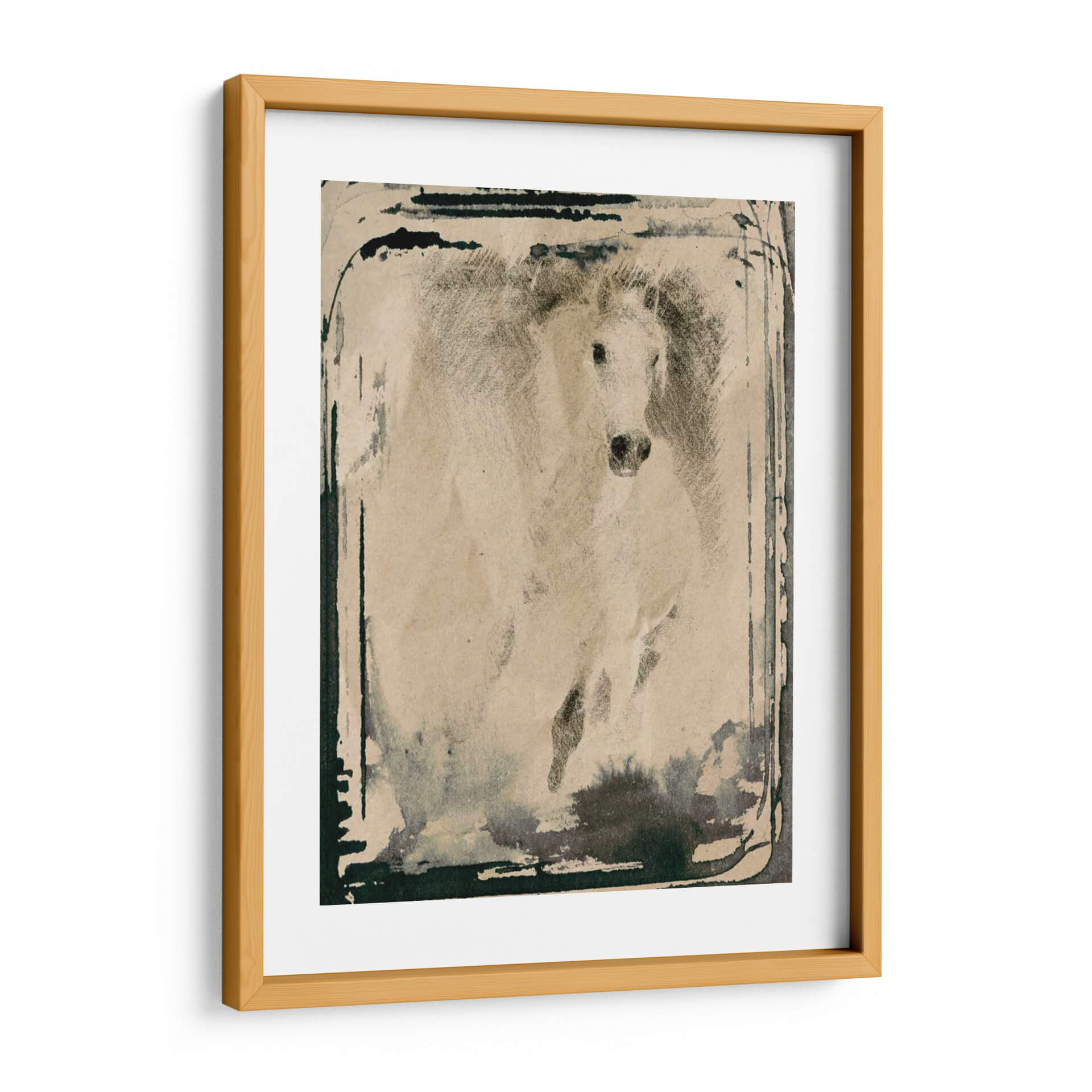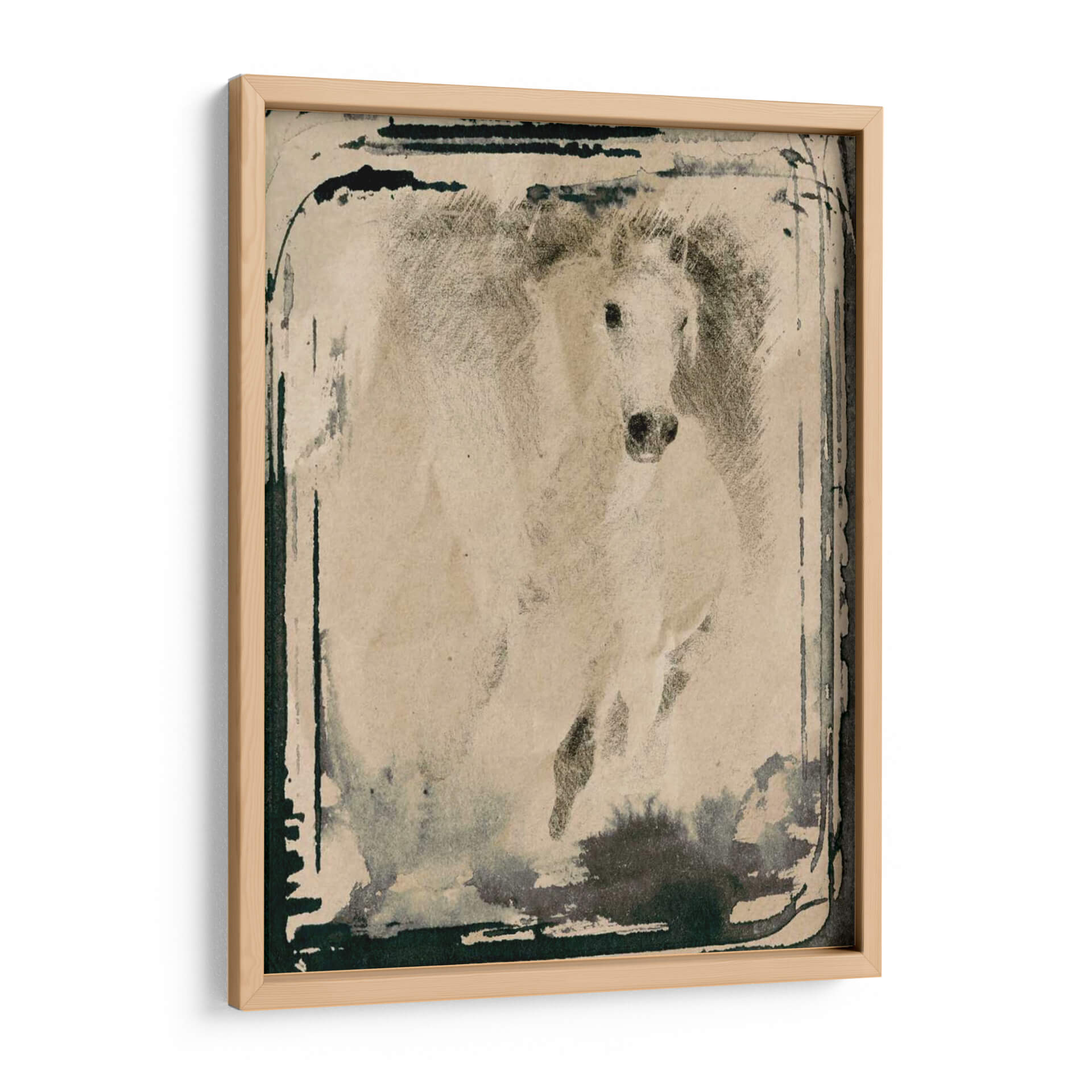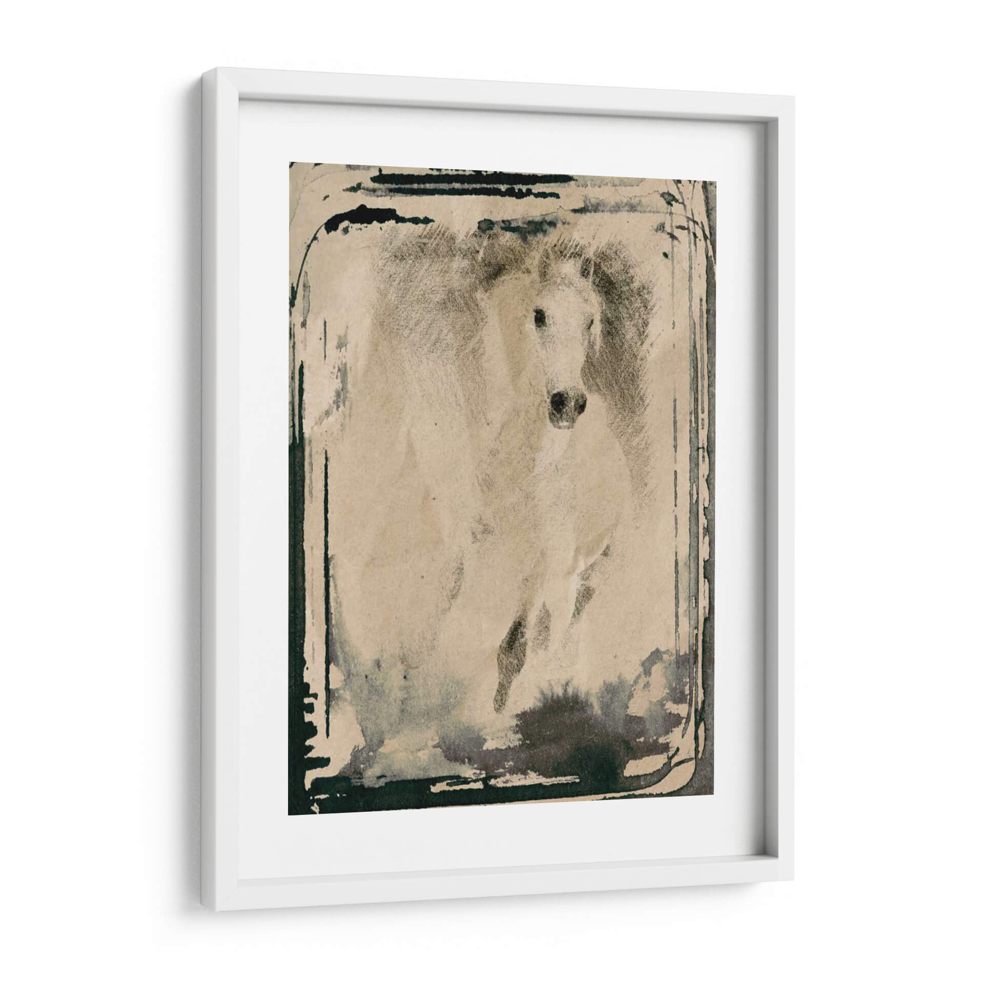 Captura la fuerza y la elegancia indomable con este cuadro decorativo de un caballo corriendo, una obra maestra de Irena Orlov. La pieza evoca una sensación de movimiento dinámico y libertad salvaje, con un estilo que fusiona la técnica del dibujo a lápiz o carboncillo con toques de acuarela o tinta para crear una atmósfera etérea y poderosa. La paleta de colores, predominantemente en tonos sepia y grises, junto con las pinceladas de tinta oscura que bordean la composición, confiere a la obra una profundidad y un carácter casi atemporal, rememorando viejas fotografías o bocetos artísticos. El caballo, representado en pleno galope, se convierte en un símbolo de energía pura y determinación, con su crin al viento y su mirada intensa. Este cuadro decorativo es ideal para espacios que buscan un toque de distinción y carácter, ya sea en una sala de estar moderna, un estudio o una oficina. Su estilo artístico, que podríamos definir como expresionista con influencias figurativas, permite que encaje en decoraciones rústicas, industriales o contemporáneas, añadiendo un punto focal cautivador y una narrativa visual que invita a la contemplación. Añade esta pieza a tu colección y transforma tu hogar en una galería de arte personal.