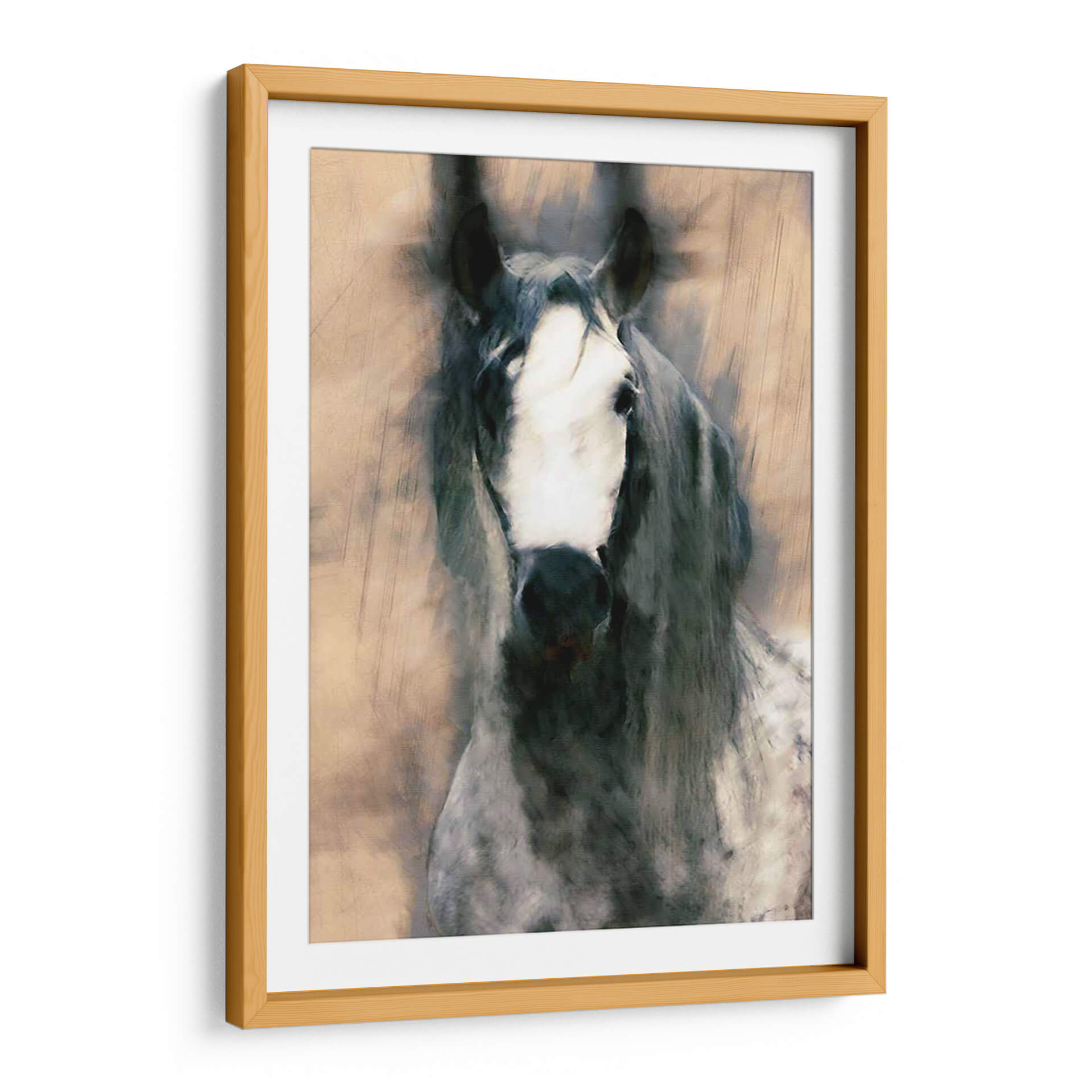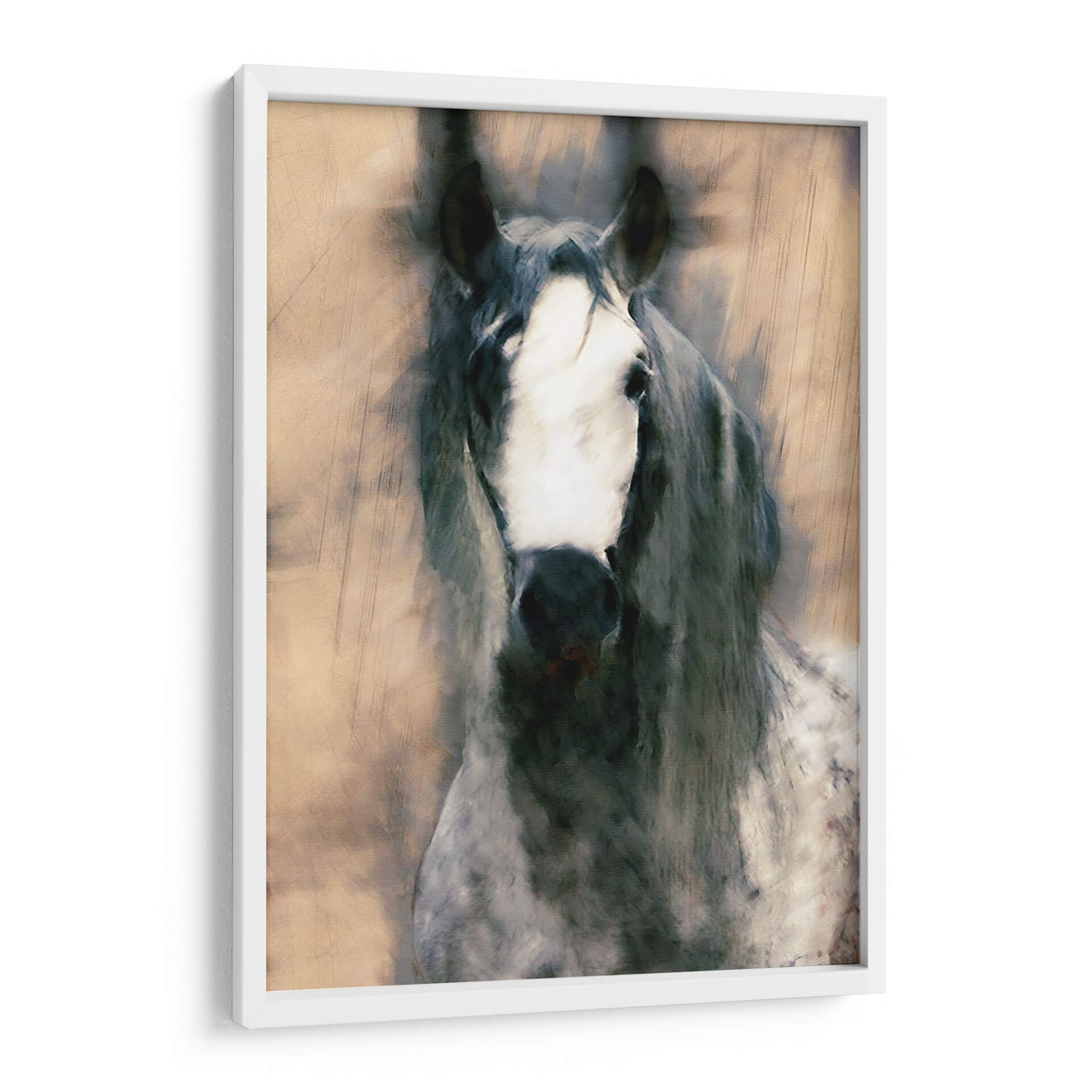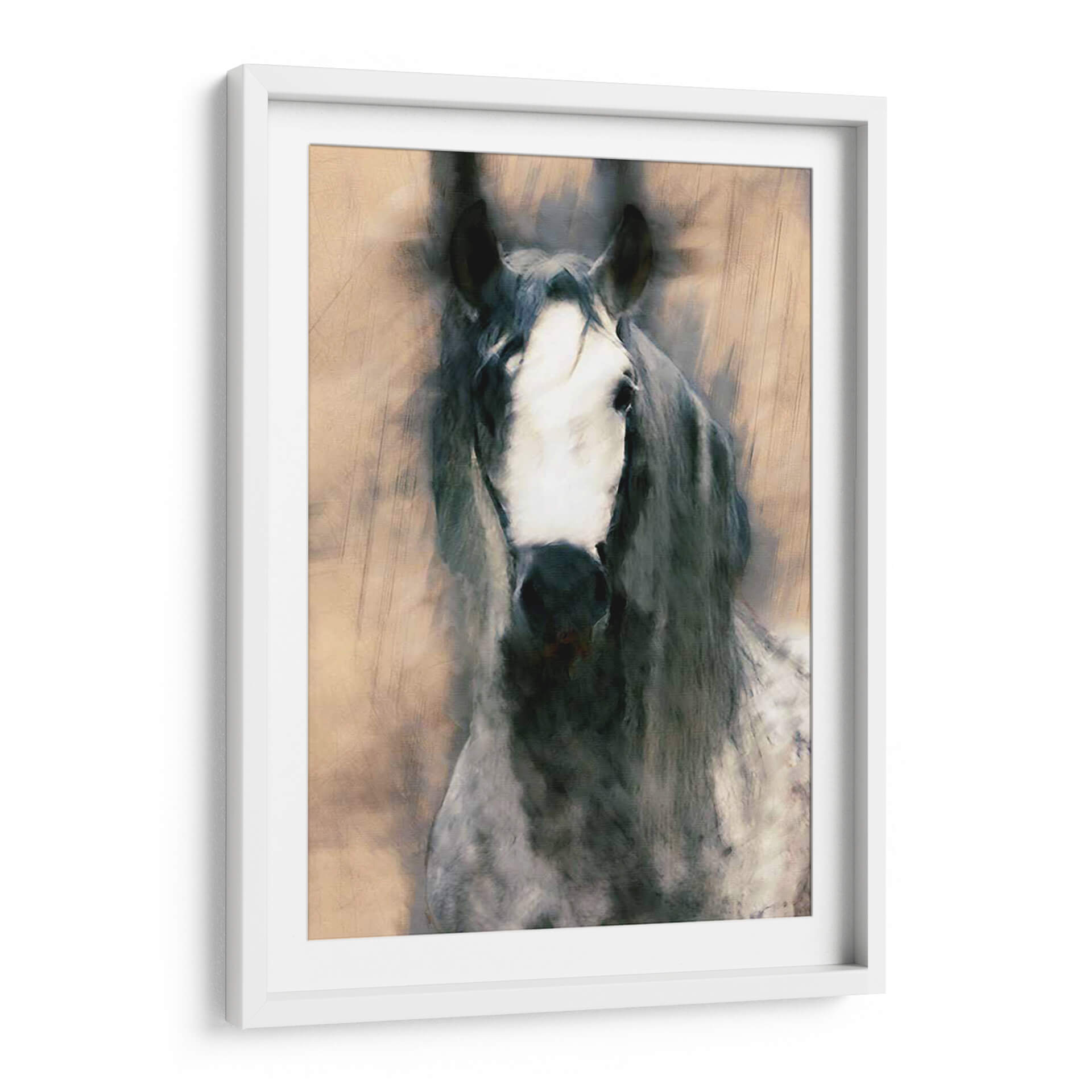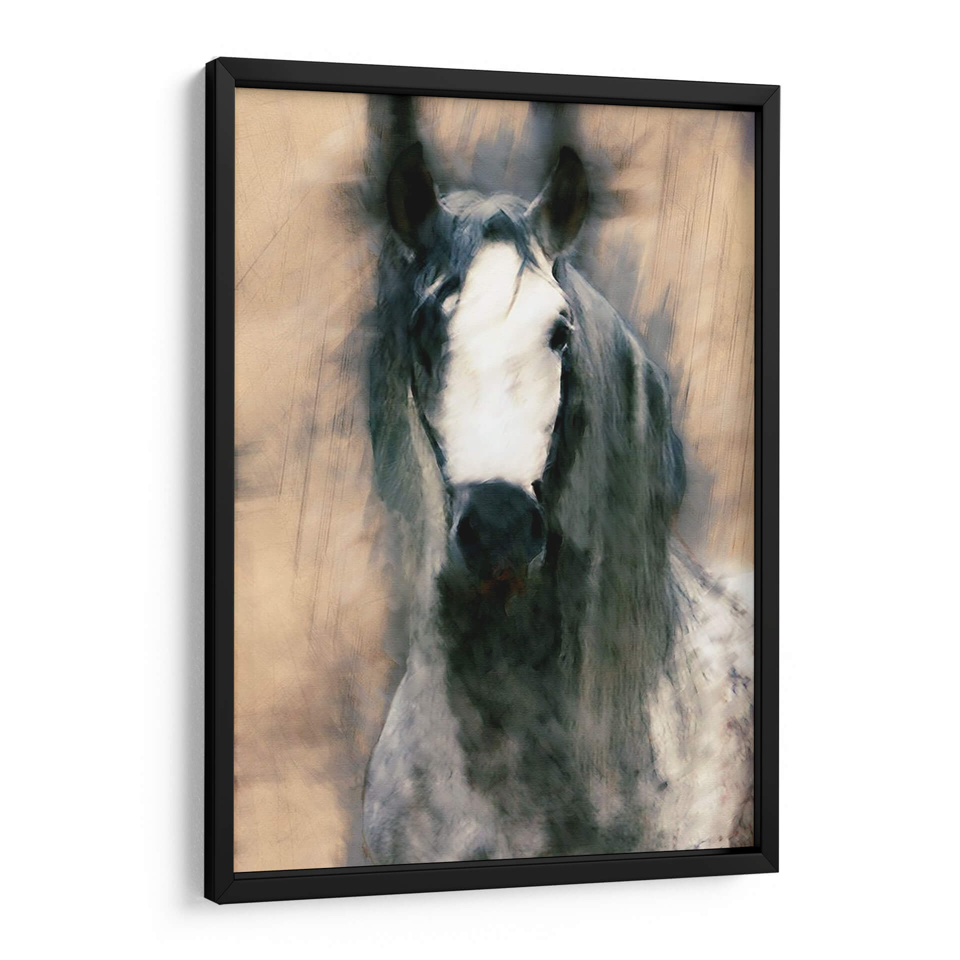 Sumérgete en la majestuosidad y el misterio con 'Caballo Mezclado II' de Leticia Herrera, un cuadro decorativo que captura la esencia de la fuerza equina con un toque artístico contemporáneo. Esta obra presenta un primer plano de un caballo, cuya mirada penetrante y crin al viento evocan una sensación de movimiento y vitalidad. La paleta de colores, dominada por tonos tierra, grises profundos y blancos contrastantes, crea una atmósfera a la vez serena y poderosa, perfecta para añadir un punto focal de elegancia a cualquier espacio. El estilo, que fusiona elementos realistas con pinceladas expresivas y texturas que recuerdan a un boceto o una acuarela, confiere a la pieza una cualidad única y dinámica. Ideal para salones modernos, estudios o recibidores que buscan una pieza de carácter y sofisticación. Este cuadro decorativo no solo embellece, sino que también inspira, conectando al espectador con la nobleza y el espíritu indómito de estos magníficos animales. Añade un toque de arte contemporáneo y naturaleza a tu decoración con esta impactante obra.