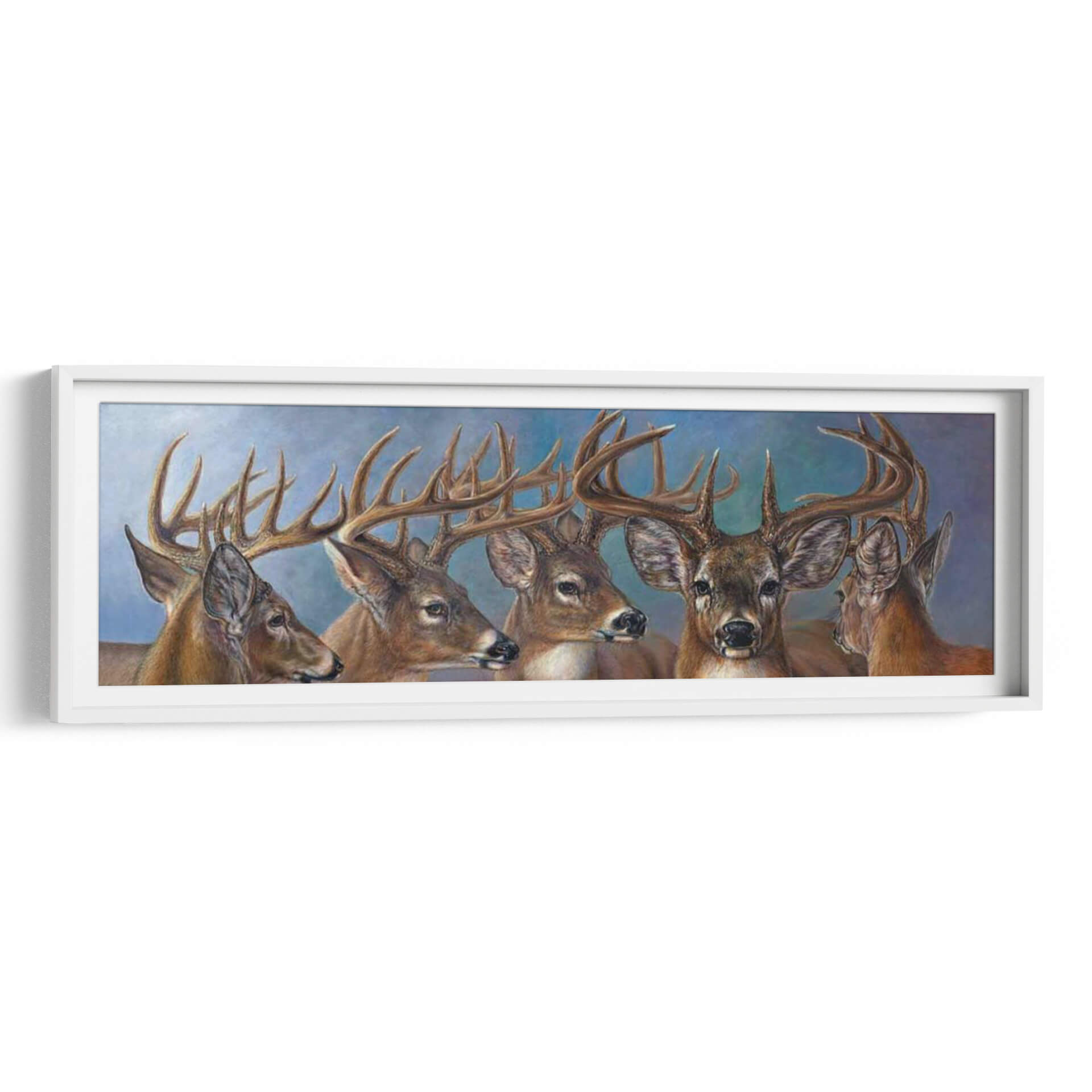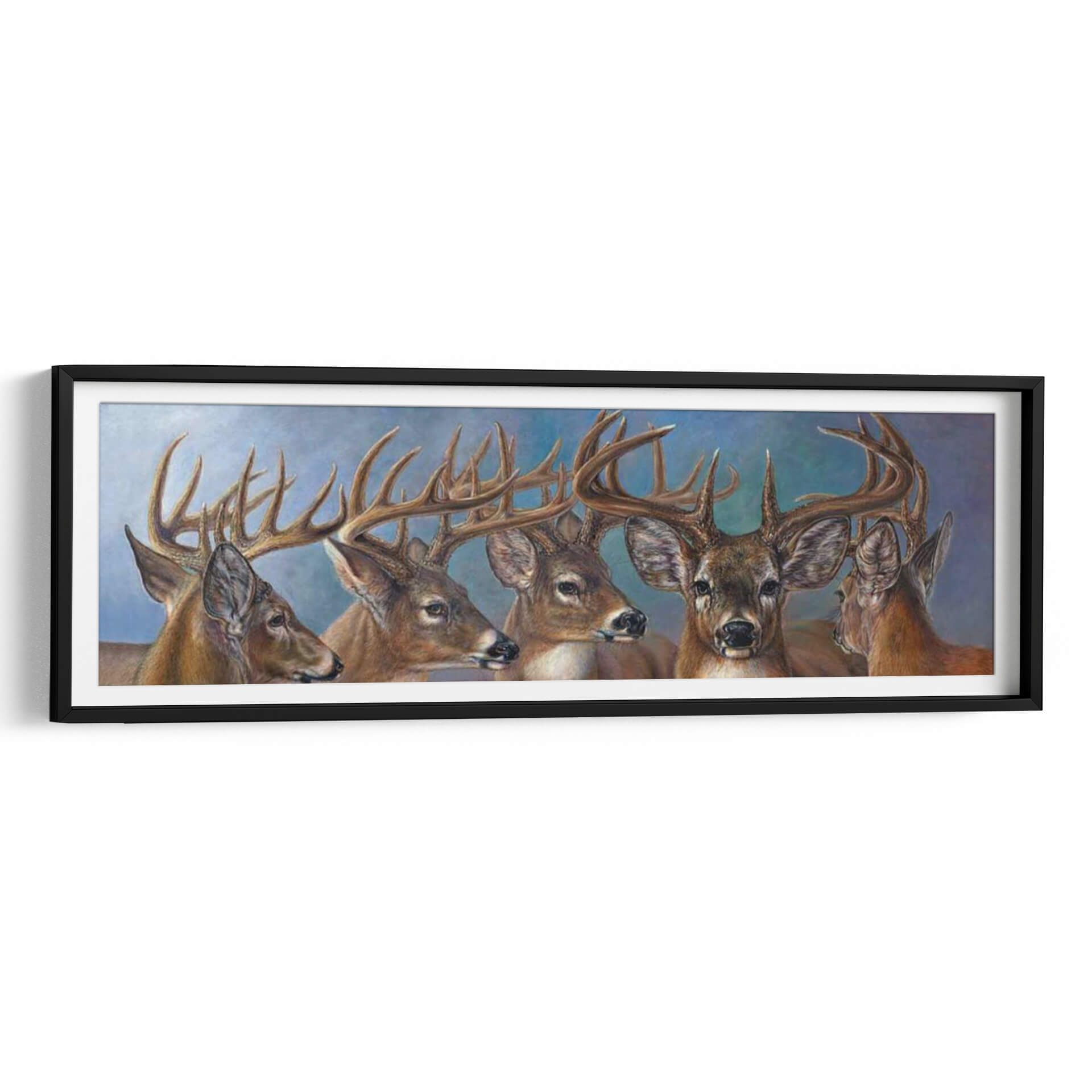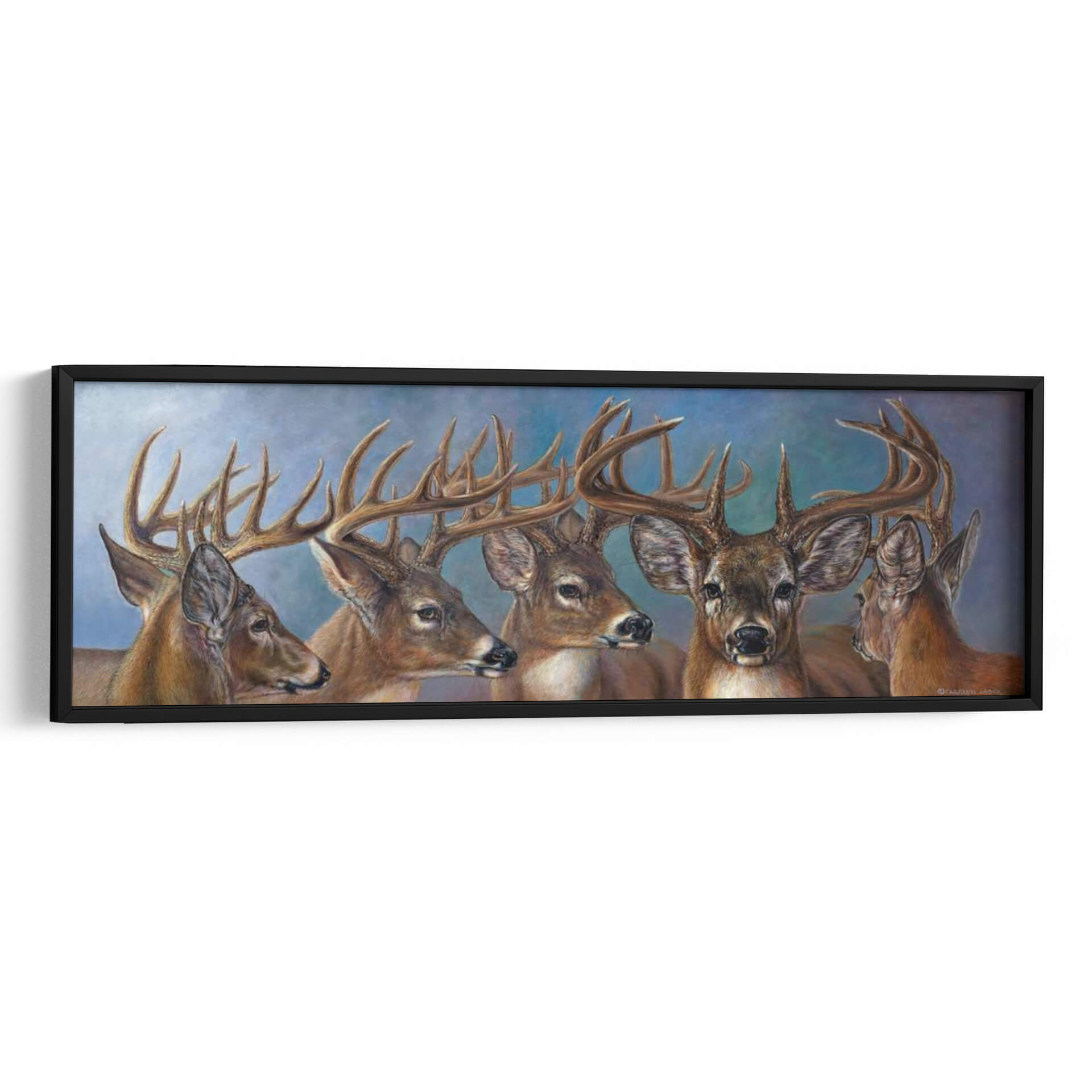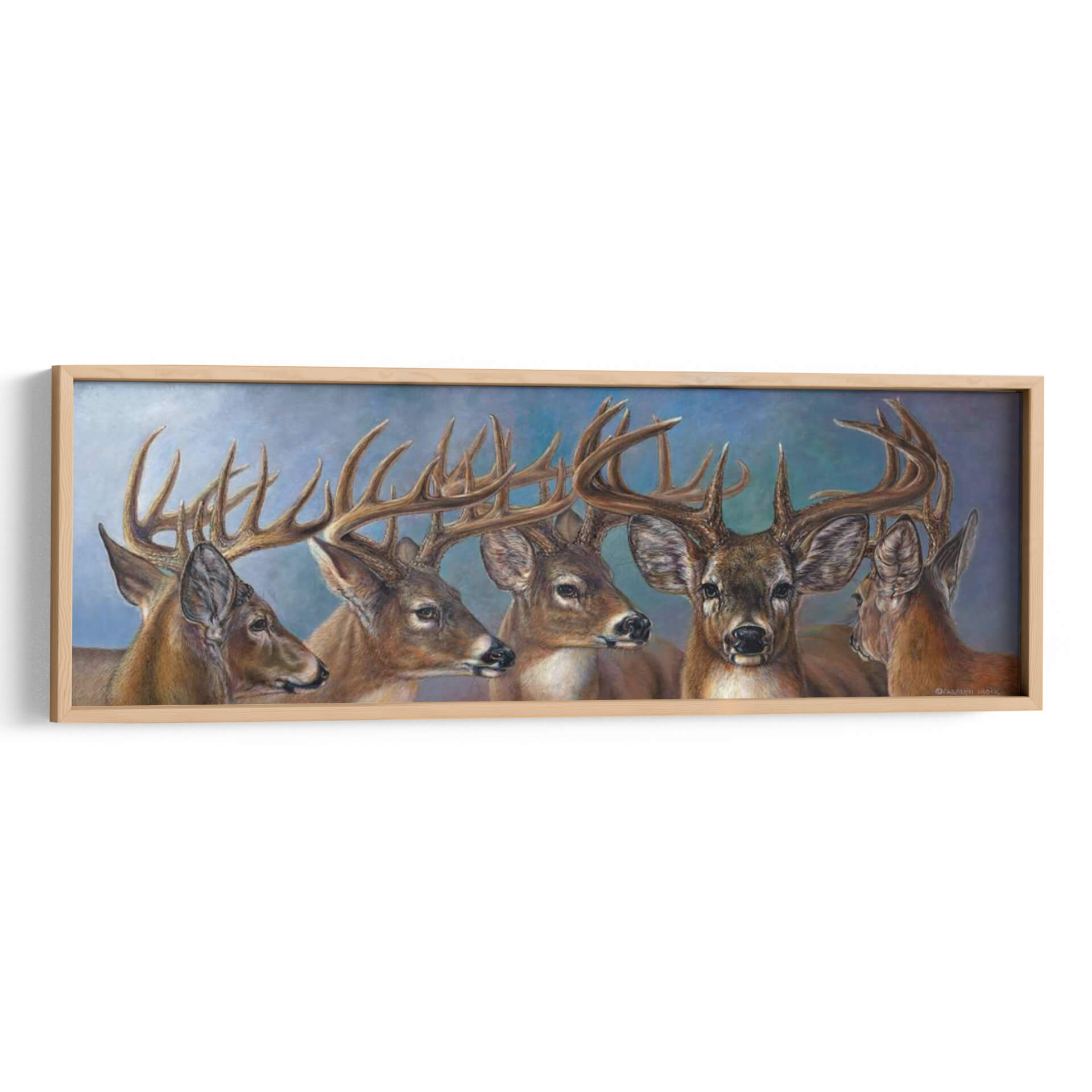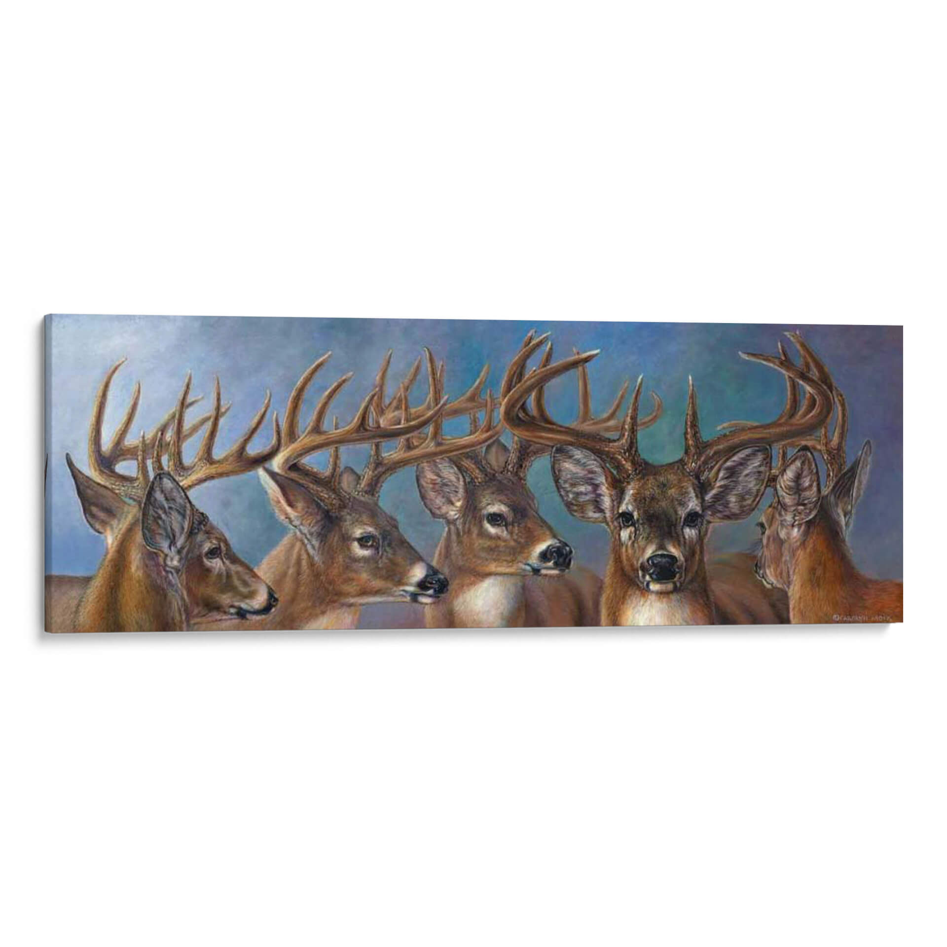 Captura la majestuosidad de la naturaleza en tu hogar con este cautivador cuadro decorativo titulado 'Cinco Dólares' del artista Carolyn Mock. La obra presenta un primer plano íntimo de cinco ciervos machos, cada uno con una cornamenta imponente y una mirada penetrante, que transmiten una sensación de fuerza y conexión salvaje. La paleta de colores, dominada por tonos tierra cálidos en los animales y un fondo azulado degradado que evoca un cielo crepuscular o un paisaje acuático sereno, crea un contraste visualmente atractivo. El estilo realista y detallado de la pintura permite apreciar la textura del pelaje y la complejidad de las astas, invitando a la contemplación. Este lienzo es ideal para añadir un toque de elegancia rústica y un aire de tranquilidad a cualquier espacio, ya sea un salón acogedor, un estudio o una entrada que busque causar una impresión duradera. Transforma tu decoración con esta pieza inspirada en la vida silvestre que resonará con los amantes de la naturaleza y el arte con carácter. Añade esta obra maestra a tu colección y disfruta de su presencia inspiradora cada día.