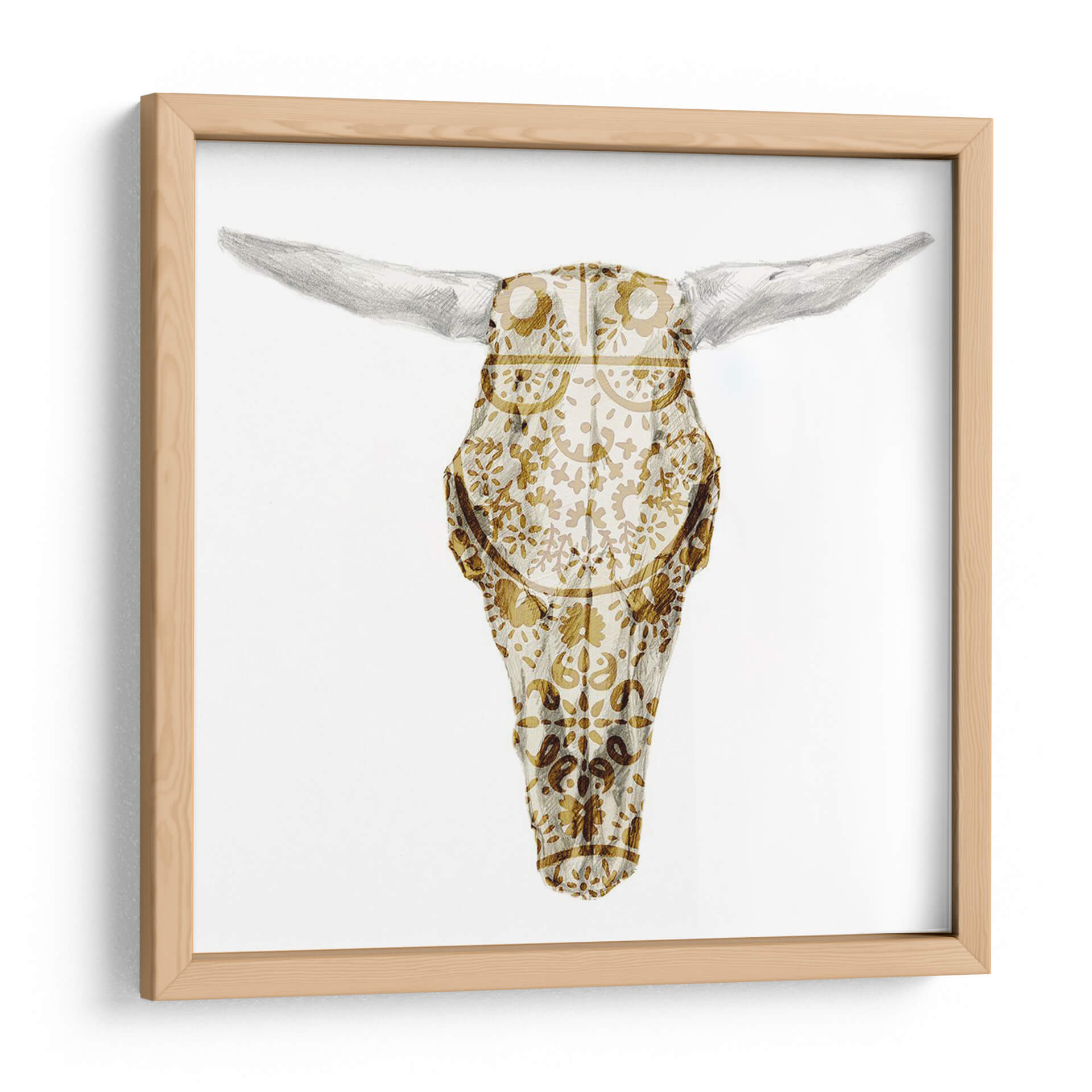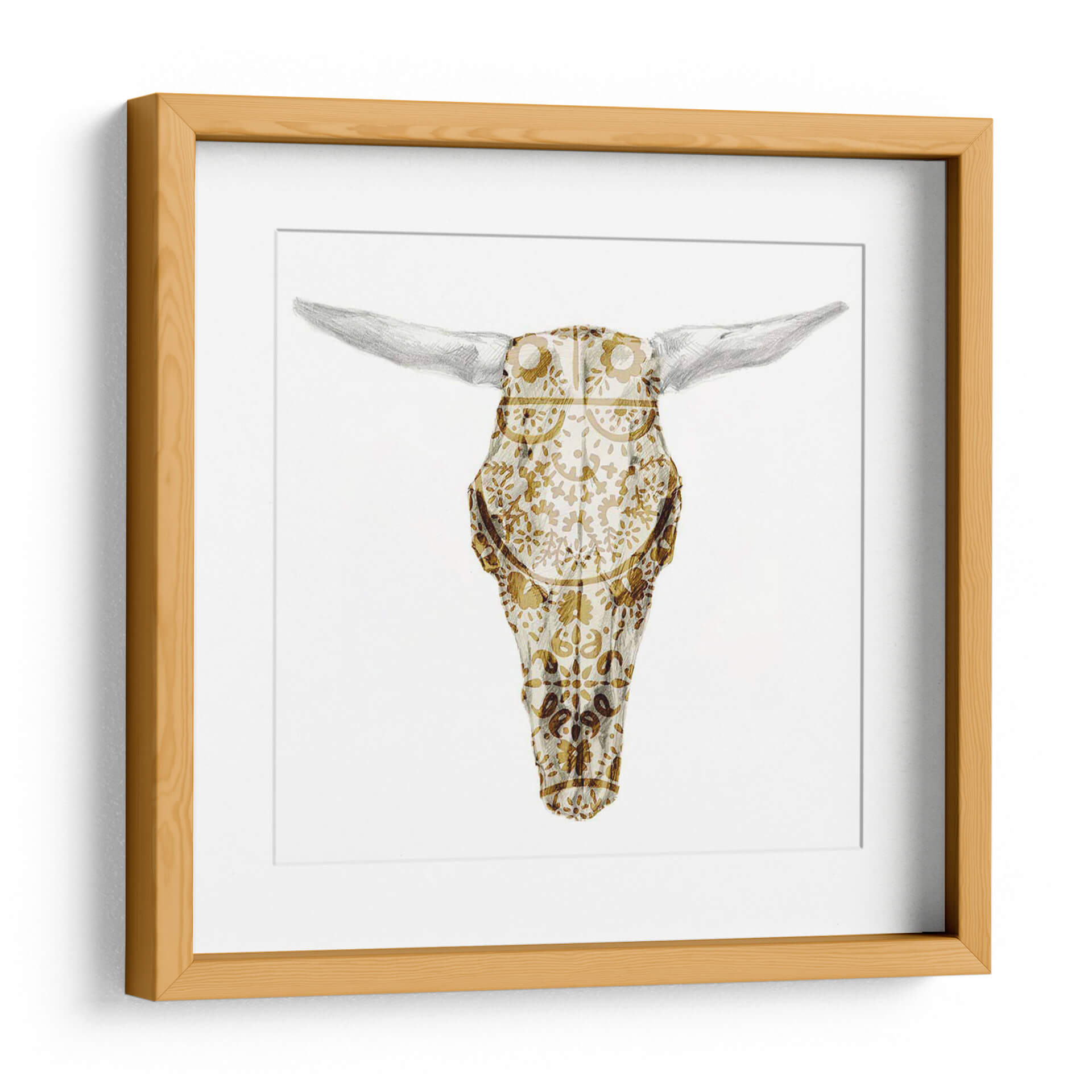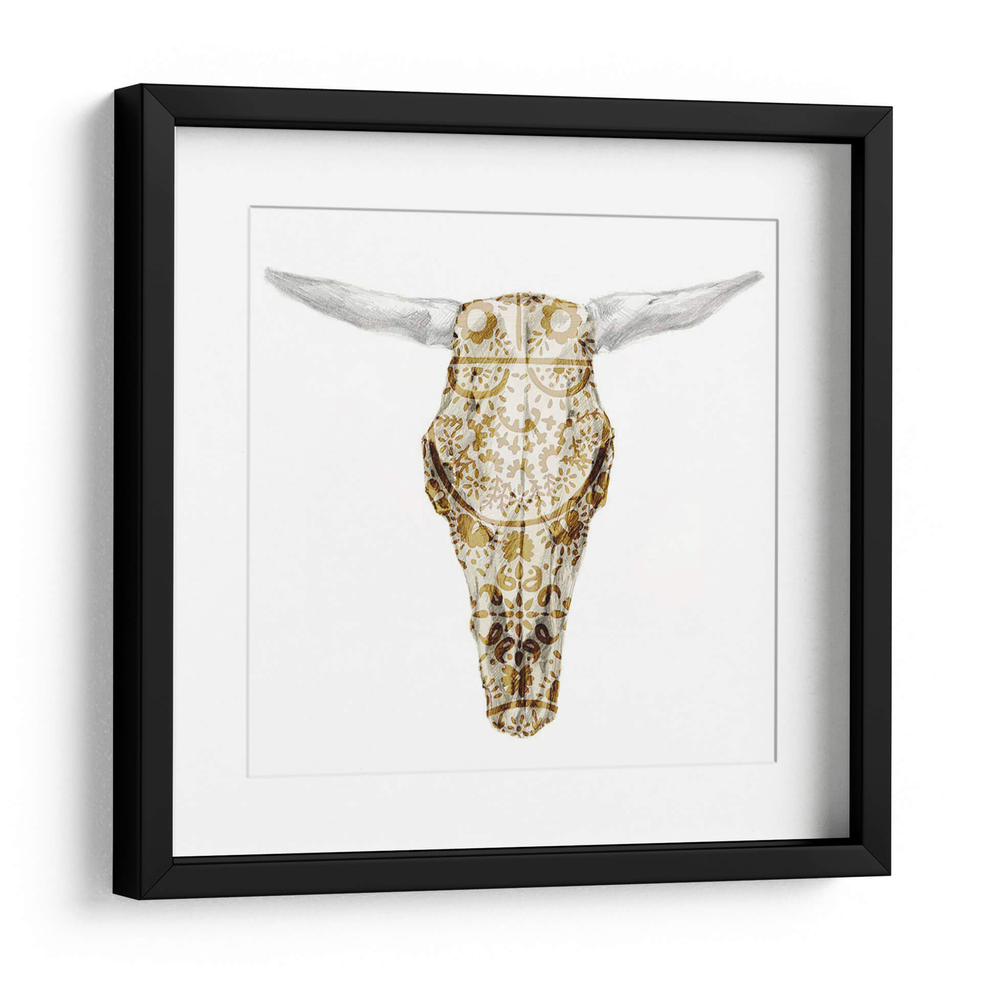 Embárcate en un viaje visual con "Día Del Cráneo Muerto Monte Viii", una obra de arte que fusiona la solemnidad del cráneo de toro con intrincados patrones decorativos en tonos dorados y marrones sobre un fondo blanco nítido. Esta pieza evoca una mezcla de lo místico y lo terrenal, presentando una composición detallada que invita a la contemplación. Los delicados diseños florales y geométricos superpuestos en el cráneo añaden una capa de sofisticación y un toque inesperado, transformando un símbolo tradicionalmente asociado con la mortalidad en una celebración de la vida y la belleza ornamental. El estilo visual es una fusión de realismo en el trazo del cráneo y un tratamiento más gráfico en los patrones, creando un contraste dinámico. Los colores cálidos y dorados aportan una sensación de riqueza y elegancia, mientras que el fondo neutro permite que la figura central resalte con una presencia impactante. Este cuadro decorativo es ideal para añadir un punto focal intrigante a salones modernos, estudios o espacios que busquen una declaración de estilo audaz y con un toque bohemio o étnico. Su diseño único lo convierte en una pieza conversacional, perfecta para aquellos que aprecian el arte contemporáneo con profundidad simbólica y una estética refinada. Añade carácter y una atmósfera de misterio elegante a tu hogar con este impresionante cuadro.