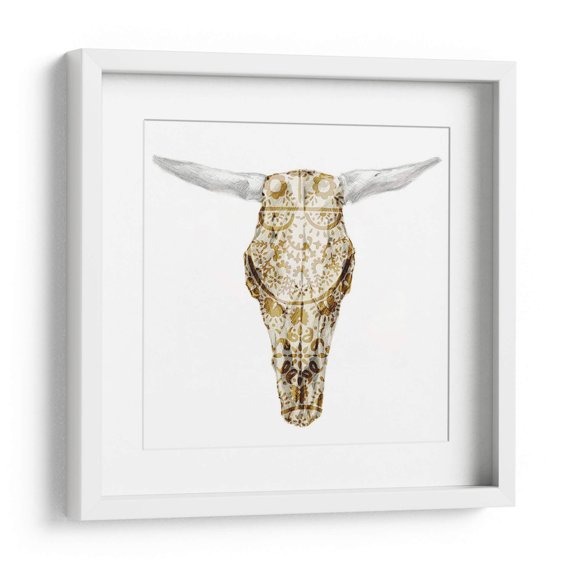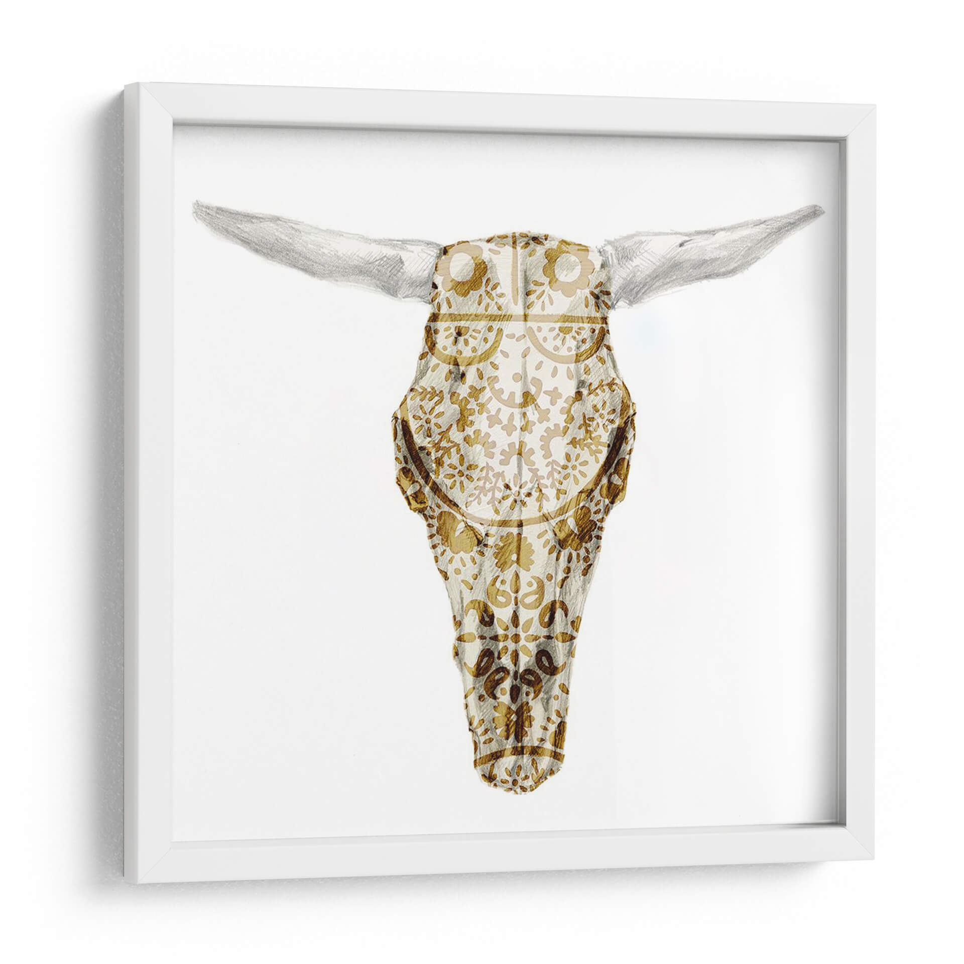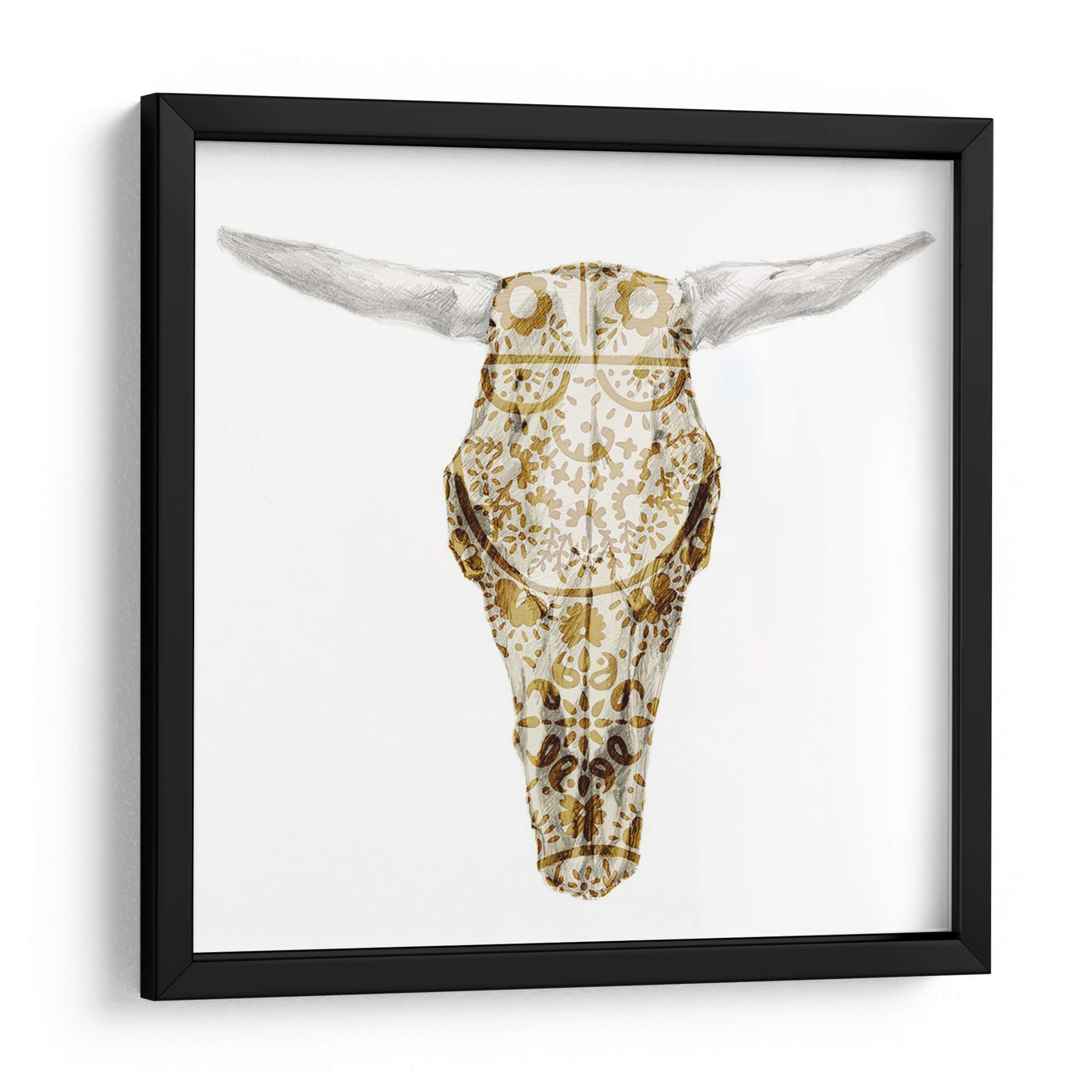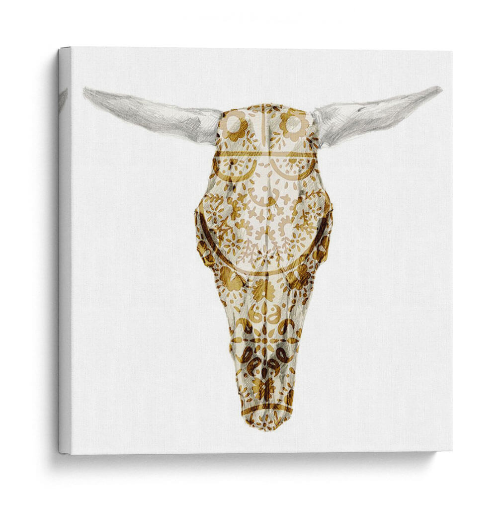 Embárcate en un viaje visual con "Día Del Cráneo Muerto Monte Viii", una obra de arte que fusiona la solemnidad del cráneo de toro con intrincados patrones decorativos en tonos dorados y marrones sobre un fondo blanco nítido. Esta pieza evoca una mezcla de lo místico y lo terrenal, presentando una composición detallada que invita a la contemplación. Los delicados diseños florales y geométricos superpuestos en el cráneo añaden una capa de sofisticación y un toque inesperado, transformando un símbolo tradicionalmente asociado con la mortalidad en una celebración de la vida y la belleza ornamental. El estilo visual es una fusión de realismo en el trazo del cráneo y un tratamiento más gráfico en los patrones, creando un contraste dinámico. Los colores cálidos y dorados aportan una sensación de riqueza y elegancia, mientras que el fondo neutro permite que la figura central resalte con una presencia impactante. Este cuadro decorativo es ideal para añadir un punto focal intrigante a salones modernos, estudios o espacios que busquen una declaración de estilo audaz y con un toque bohemio o étnico. Su diseño único lo convierte en una pieza conversacional, perfecta para aquellos que aprecian el arte contemporáneo con profundidad simbólica y una estética refinada. Añade carácter y una atmósfera de misterio elegante a tu hogar con este impresionante cuadro.