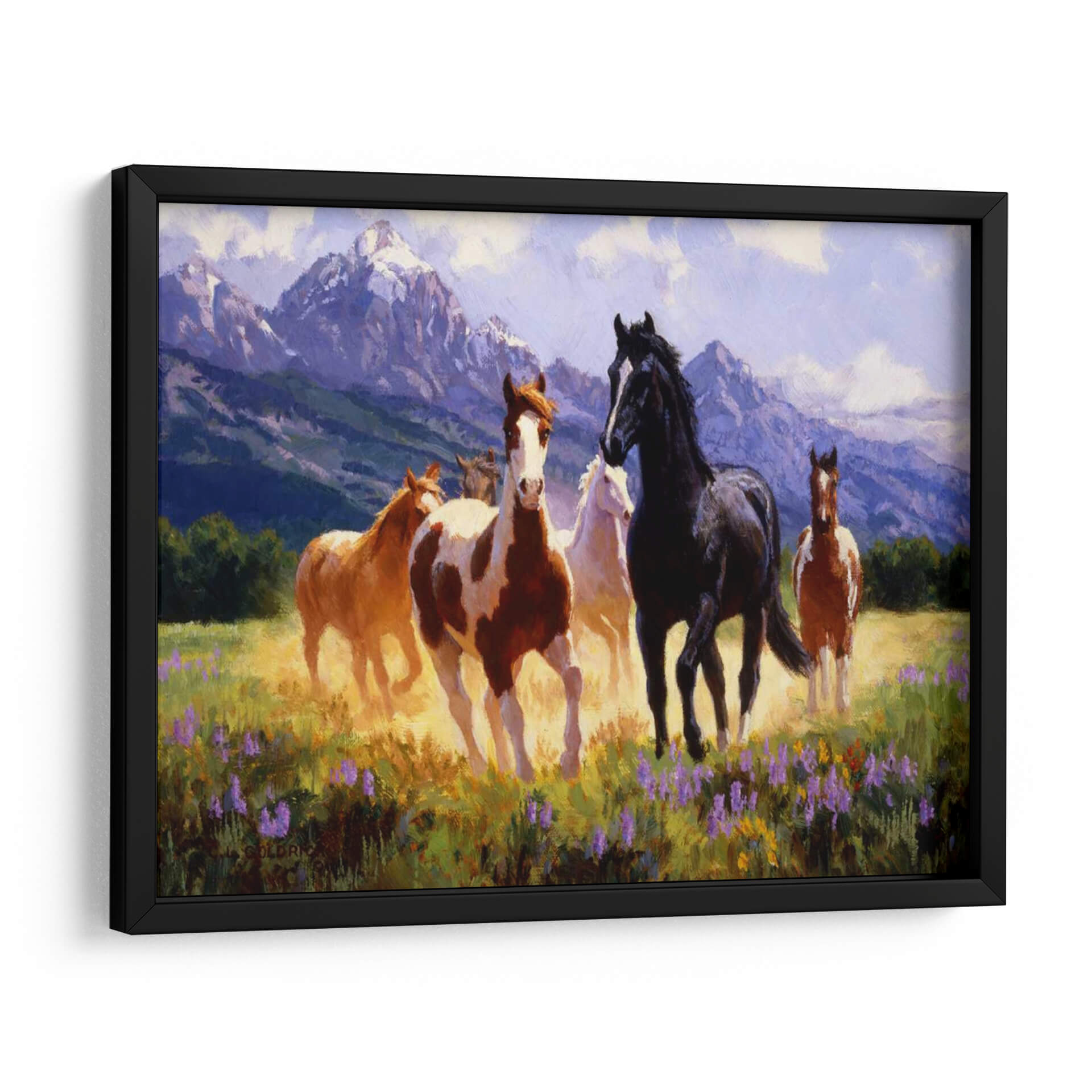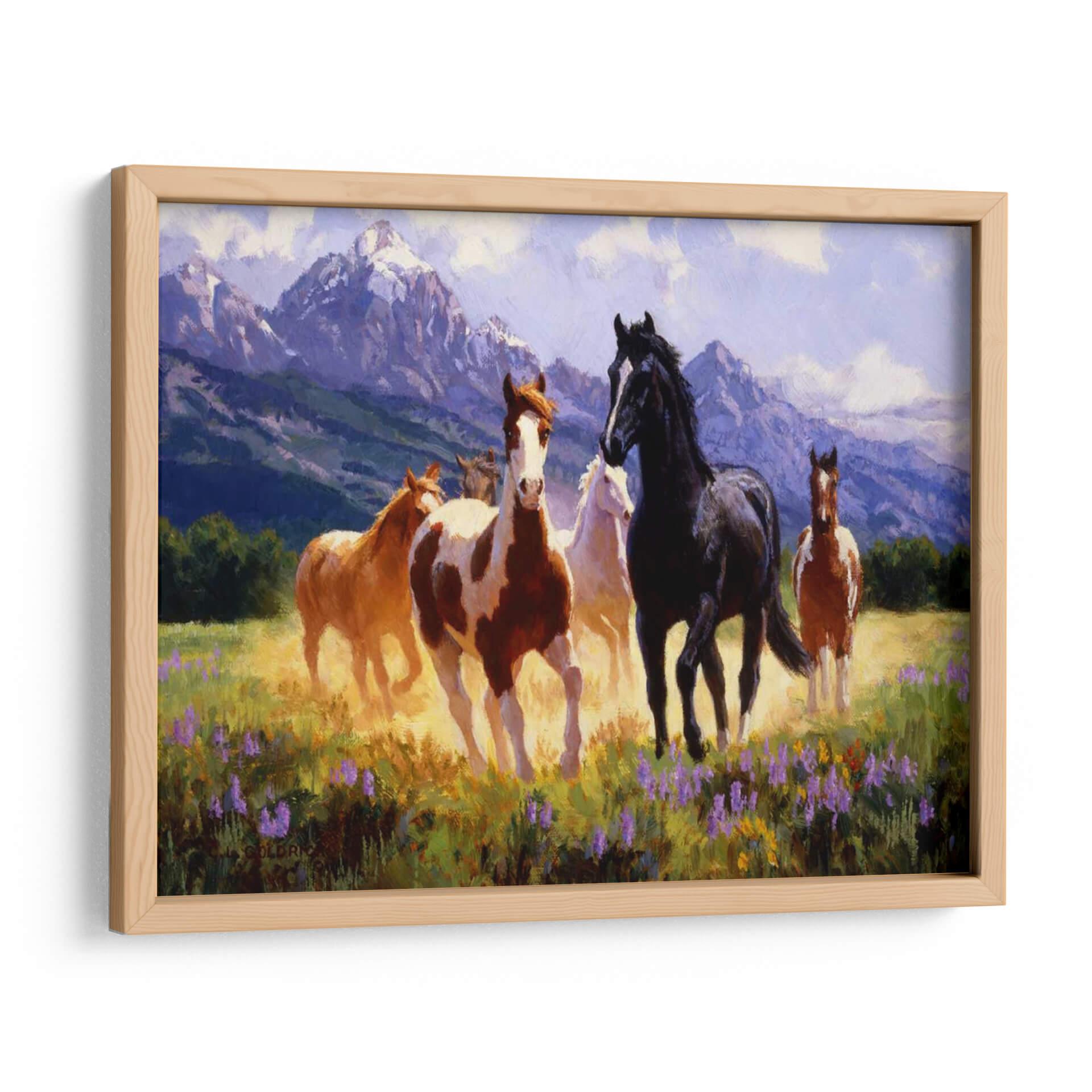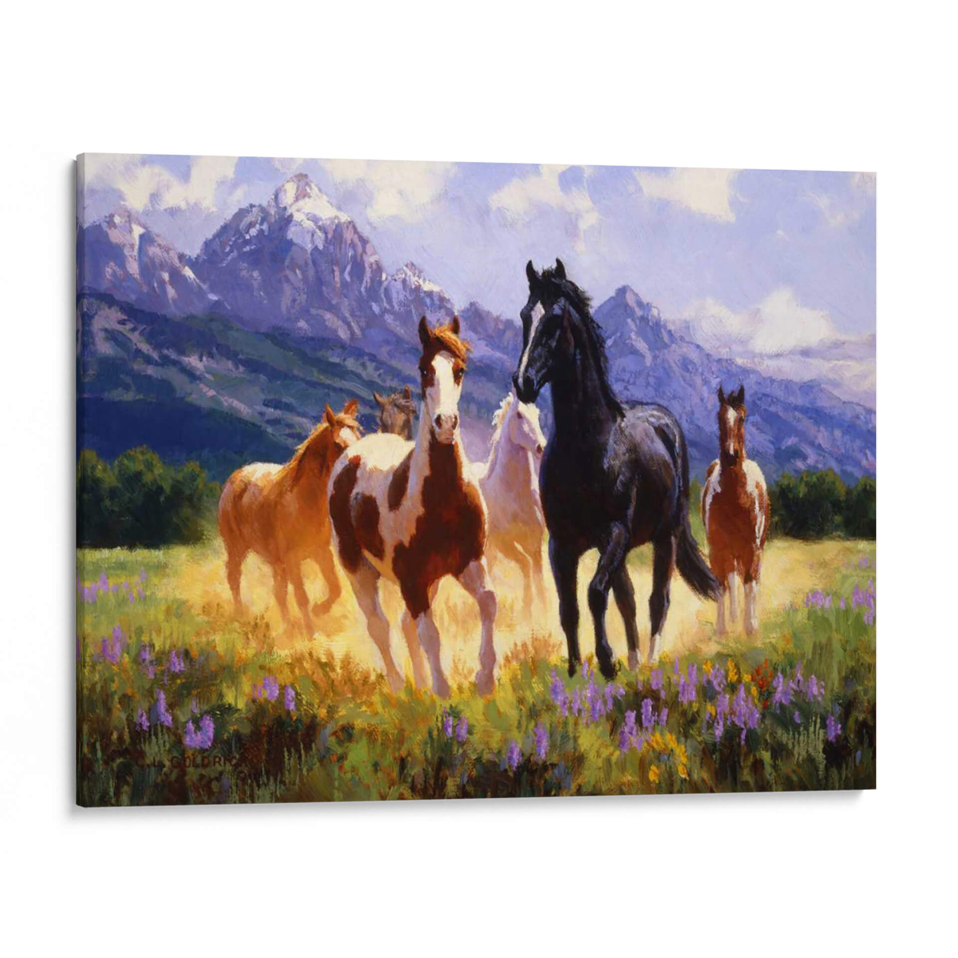 Captura la esencia de la libertad y la majestuosidad con "Días De Verano", una obra de arte excepcional del artista Claire Goldrick. Este cuadro decorativo transporta al espectador a un prado bañado por el sol, donde un grupo de caballos salvajes galopa con gracia. La paleta de colores, dominada por tonos cálidos de tierra, amarillos dorados y vibrantes púrpuras de flores silvestres, evoca una sensación de vitalidad y energía. Las imponentes montañas nevadas al fondo, bañadas en una luz suave y etérea, añaden profundidad y un toque de serenidad a la escena, sugiriendo la inmensidad de la naturaleza. El estilo pictórico, con pinceladas expresivas y una atención particular a la luz y el movimiento, dota a los caballos de una vida palpable, transmitiendo una atmósfera de pura libertad y espíritu indomable. "Días De Verano" es una pieza ideal para infundir a tu hogar u oficina una dosis de naturaleza salvaje y elegancia atemporal. Perfecto para salones, estudios o cualquier espacio que busque un punto focal inspirador y lleno de movimiento, este cuadro decorativo es una invitación a soñar con horizontes abiertos y la belleza indómita del mundo natural.
