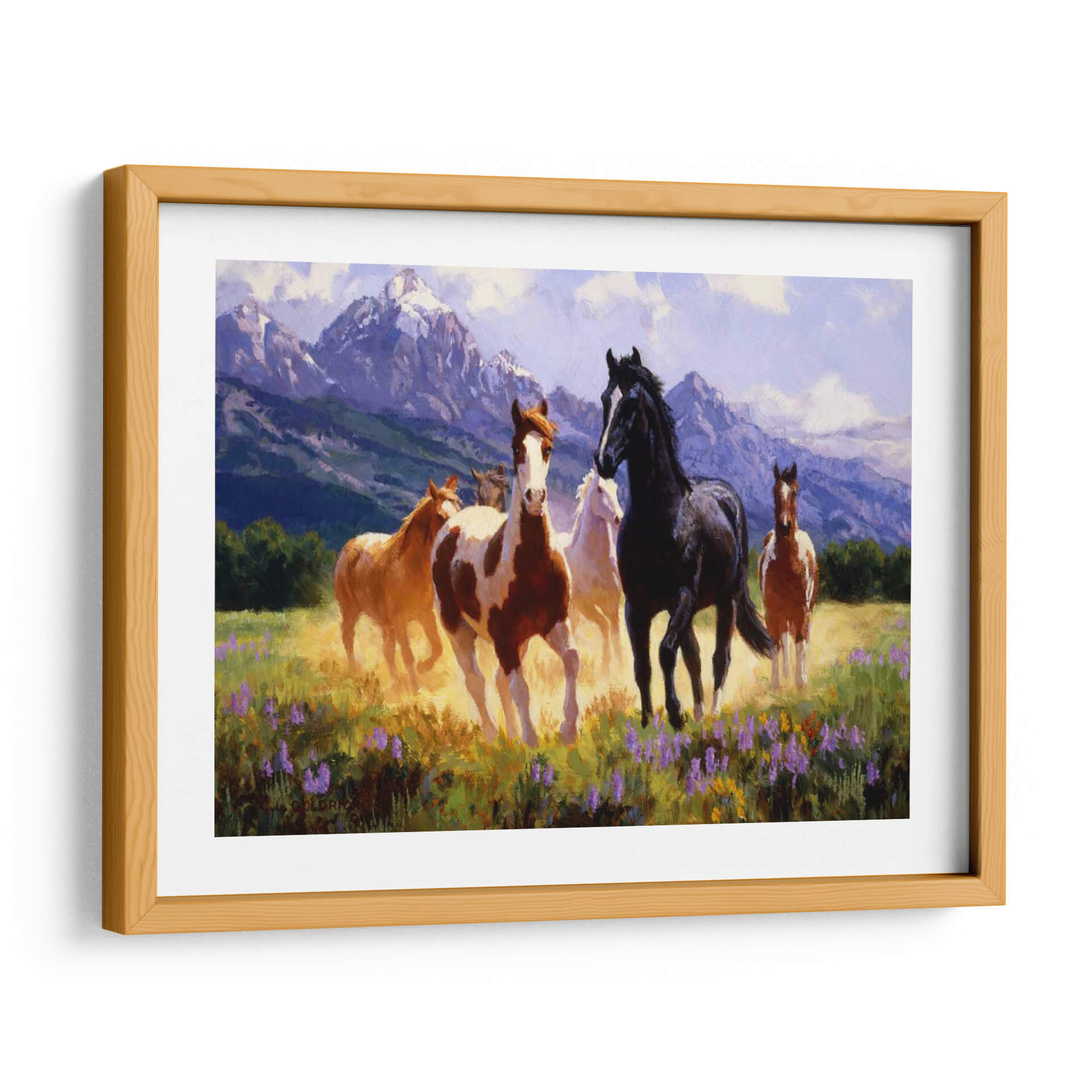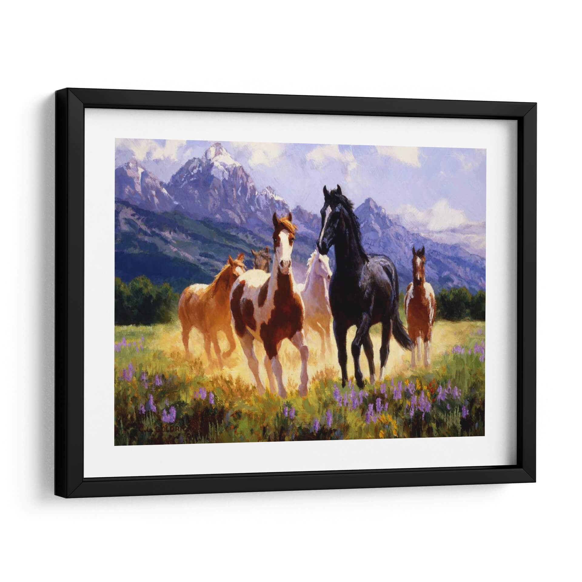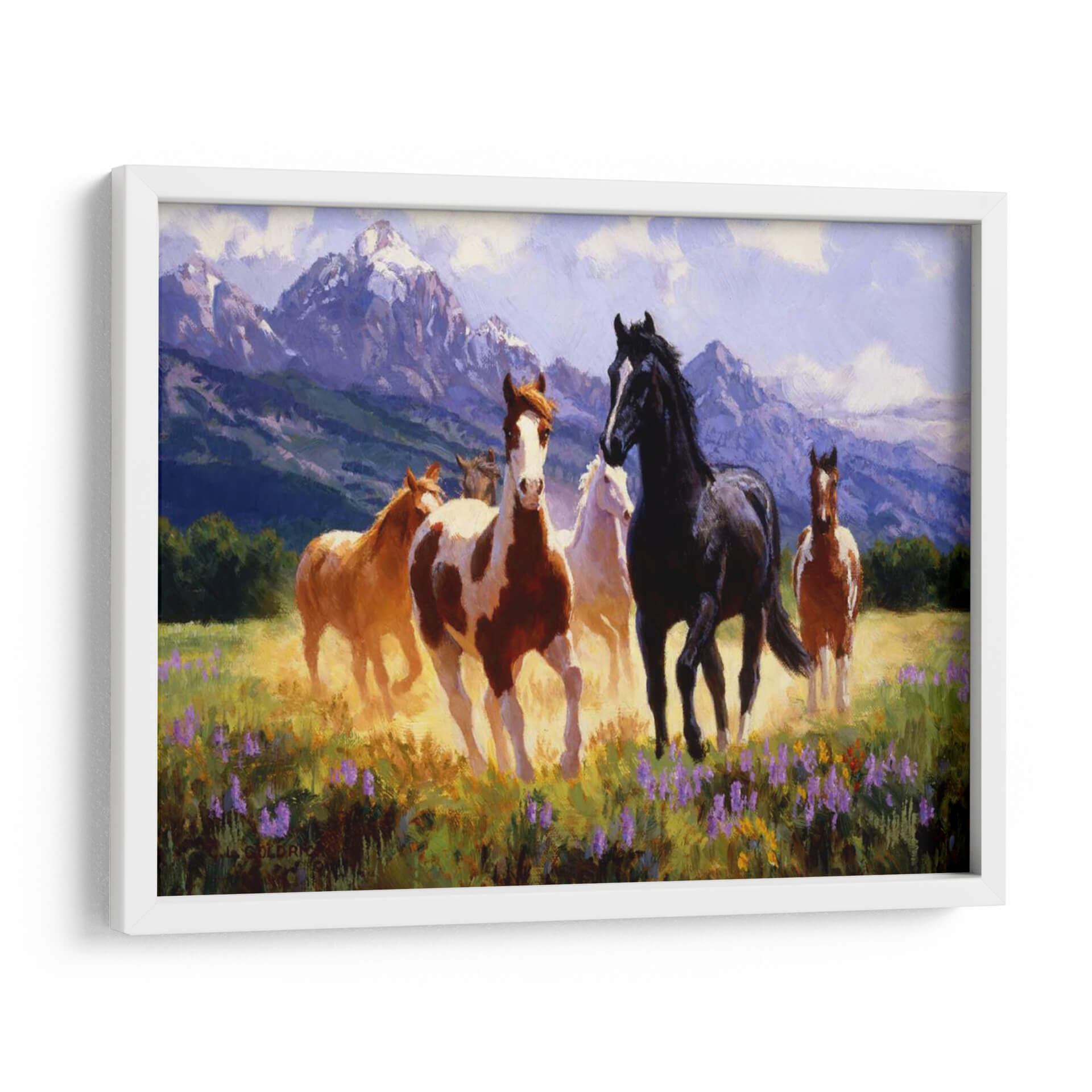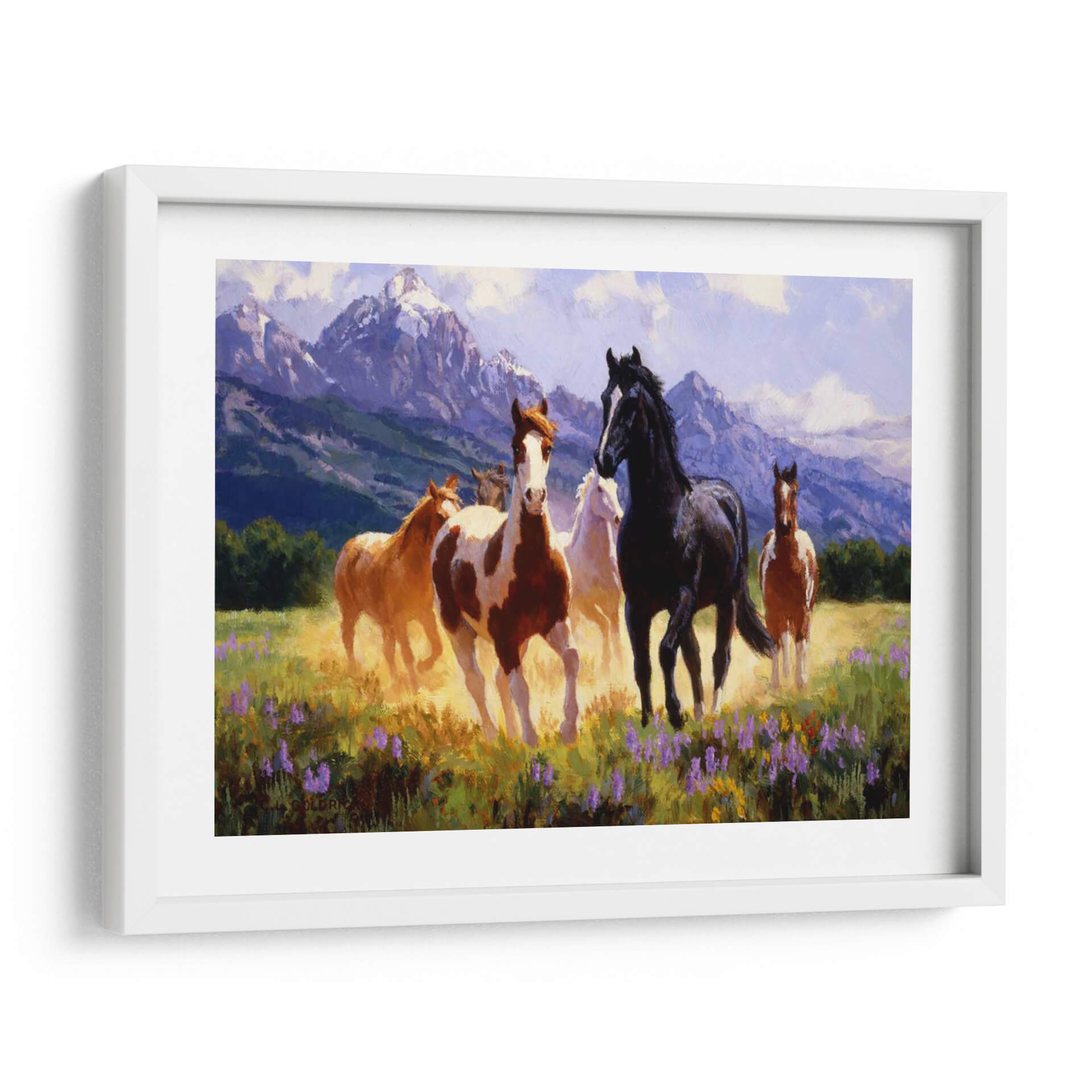 Captura la esencia de la libertad y la majestuosidad con "Días De Verano", una obra de arte excepcional del artista Claire Goldrick. Este cuadro decorativo transporta al espectador a un prado bañado por el sol, donde un grupo de caballos salvajes galopa con gracia. La paleta de colores, dominada por tonos cálidos de tierra, amarillos dorados y vibrantes púrpuras de flores silvestres, evoca una sensación de vitalidad y energía. Las imponentes montañas nevadas al fondo, bañadas en una luz suave y etérea, añaden profundidad y un toque de serenidad a la escena, sugiriendo la inmensidad de la naturaleza. El estilo pictórico, con pinceladas expresivas y una atención particular a la luz y el movimiento, dota a los caballos de una vida palpable, transmitiendo una atmósfera de pura libertad y espíritu indomable. "Días De Verano" es una pieza ideal para infundir a tu hogar u oficina una dosis de naturaleza salvaje y elegancia atemporal. Perfecto para salones, estudios o cualquier espacio que busque un punto focal inspirador y lleno de movimiento, este cuadro decorativo es una invitación a soñar con horizontes abiertos y la belleza indómita del mundo natural.