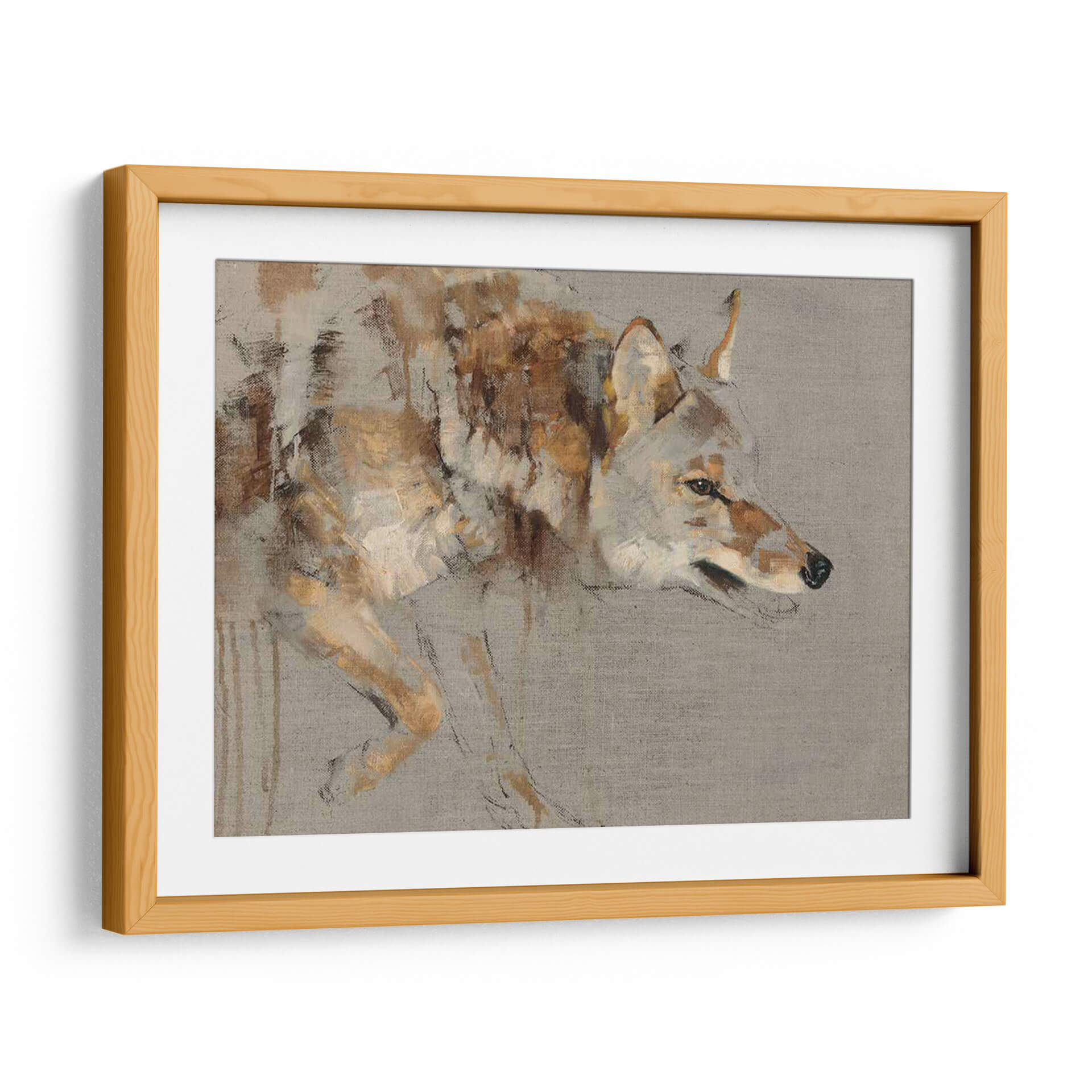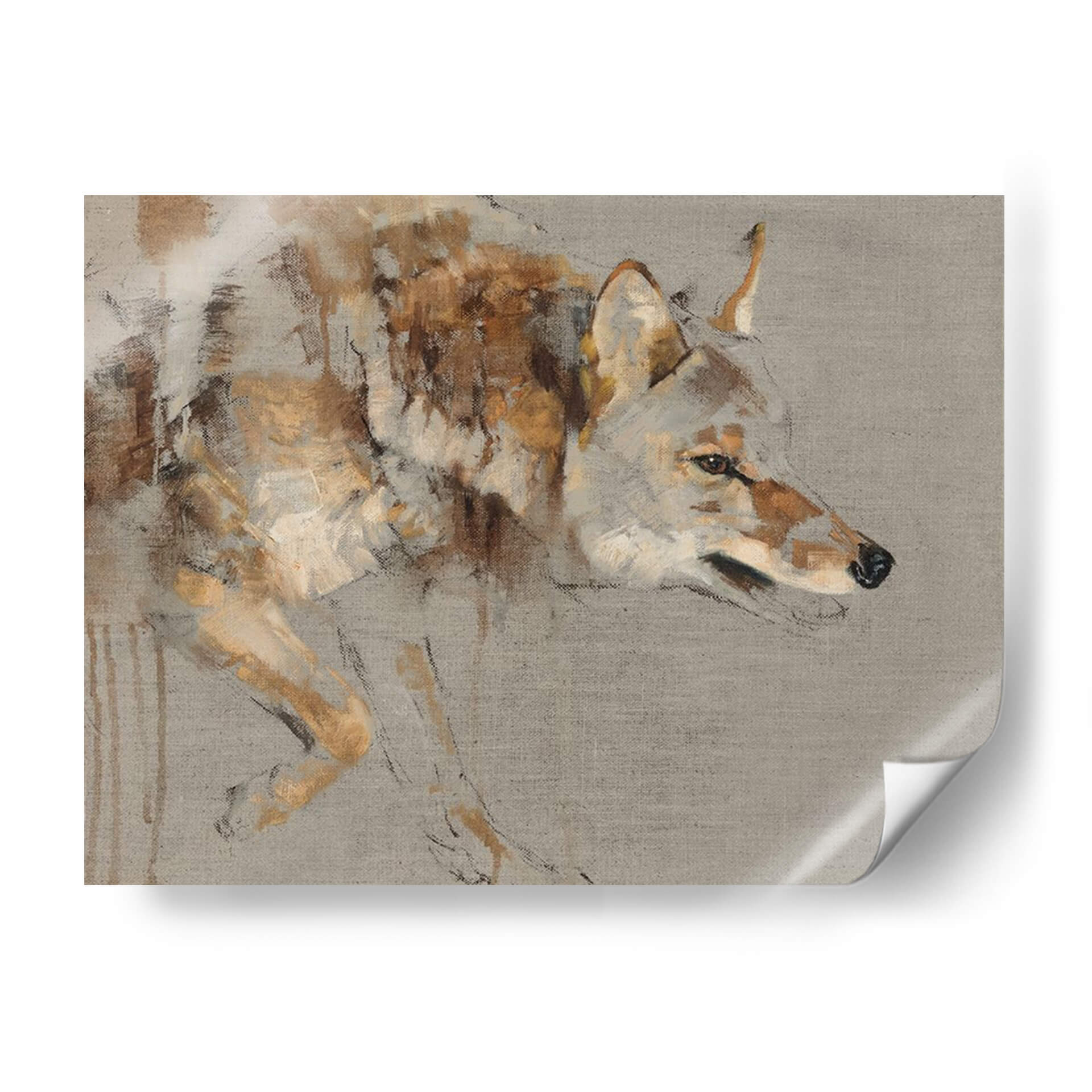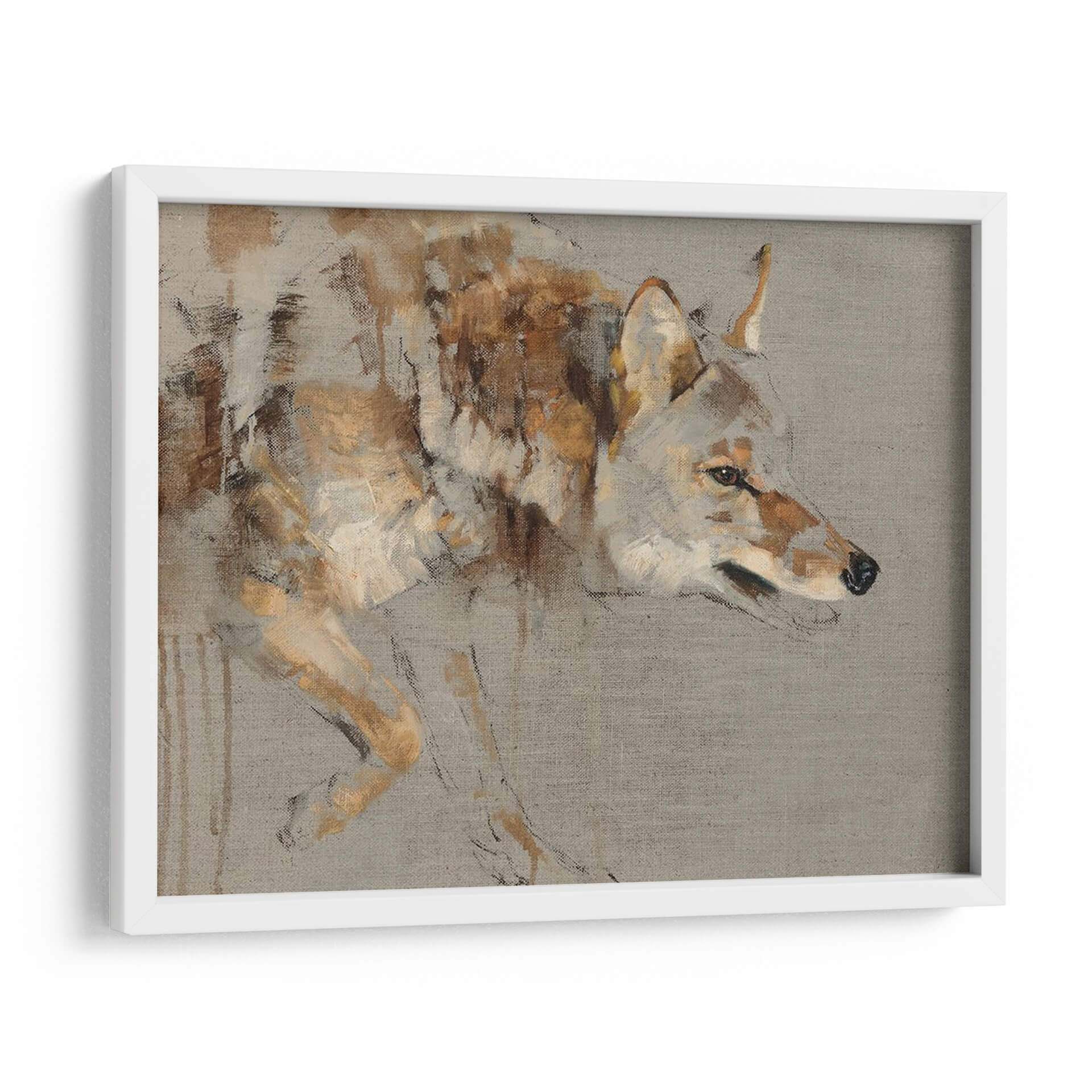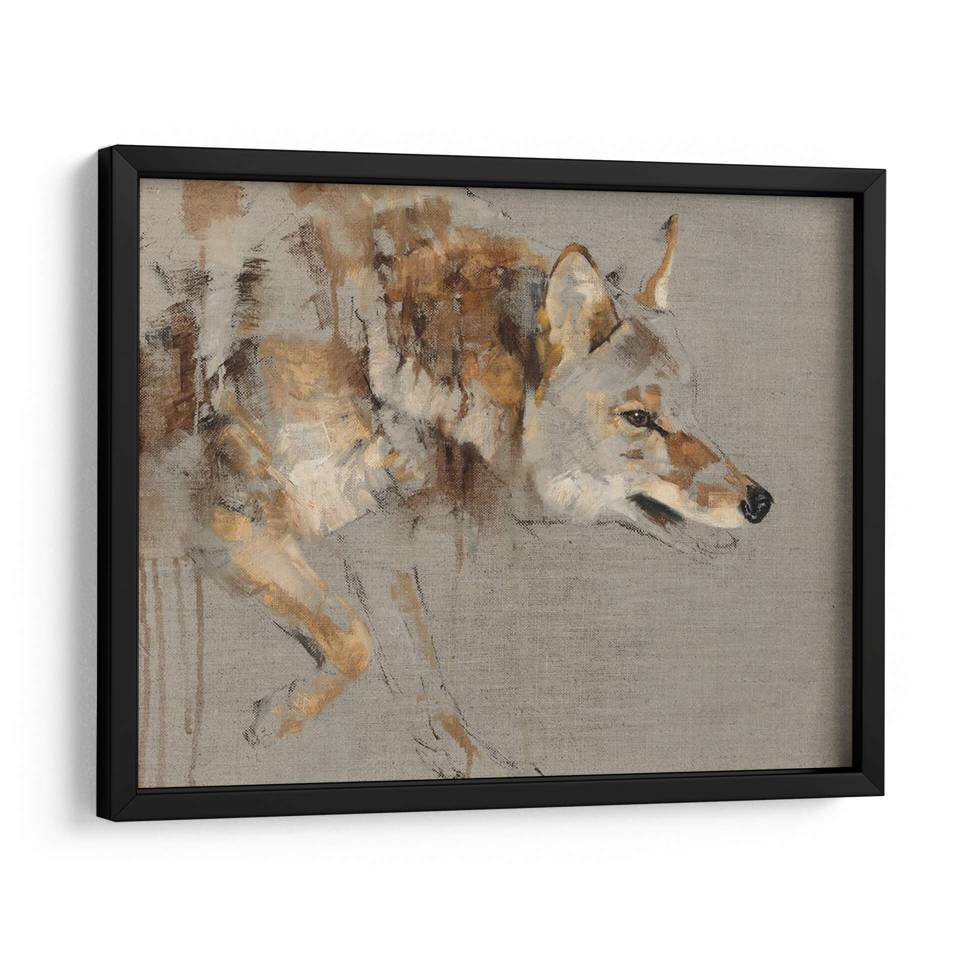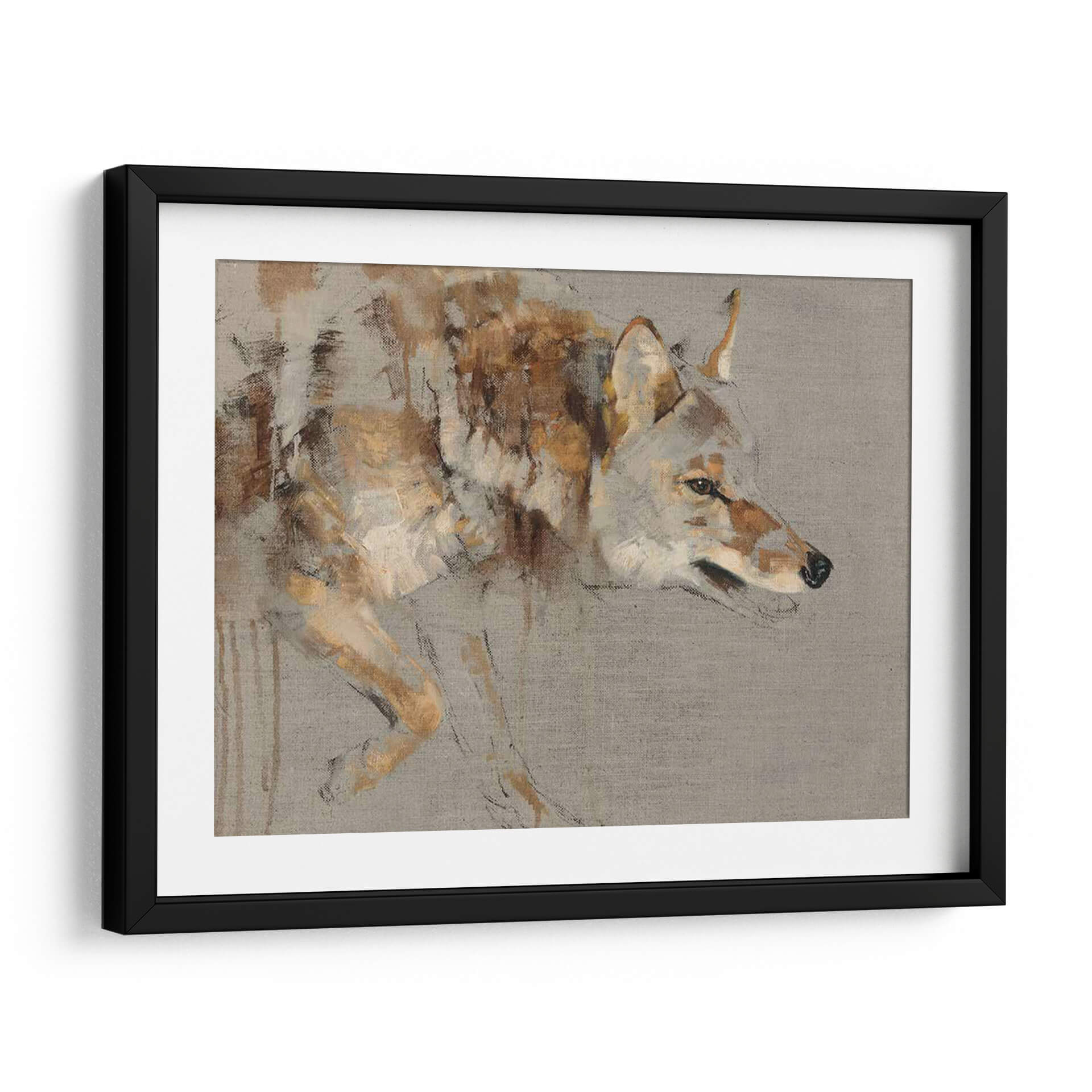 Sumérgete en la enigmática presencia de "El Vagabundo", una obra de arte que captura la esencia de la naturaleza salvaje con una maestría excepcional. La artista Julie T. Chapman nos presenta una figura de coyote ejecutada con trazos expresivos y una paleta de colores tierra, ocres y grises que evocan la calidez y la aspereza del entorno natural. La composición se centra en el perfil del animal, sus ojos penetrantes y su postura alerta, transmitiendo una sensación de misterio y libertad indómita. Este cuadro decorativo es perfecto para añadir un toque de carácter y sofisticación a cualquier espacio, ya sea una sala de estar moderna, un estudio personal o una oficina que busque inspiración en la resiliencia de la fauna. La técnica pictórica, que combina pinceladas sueltas con detalles sugeridos, confiere a la pieza una profundidad y textura únicas, invitando a la contemplación. "El Vagabundo" no es solo una representación, sino una invitación a conectar con la fuerza y la soledad del espíritu libre, convirtiéndose en un punto focal que dialoga con el espectador y enriquece visualmente el ambiente.