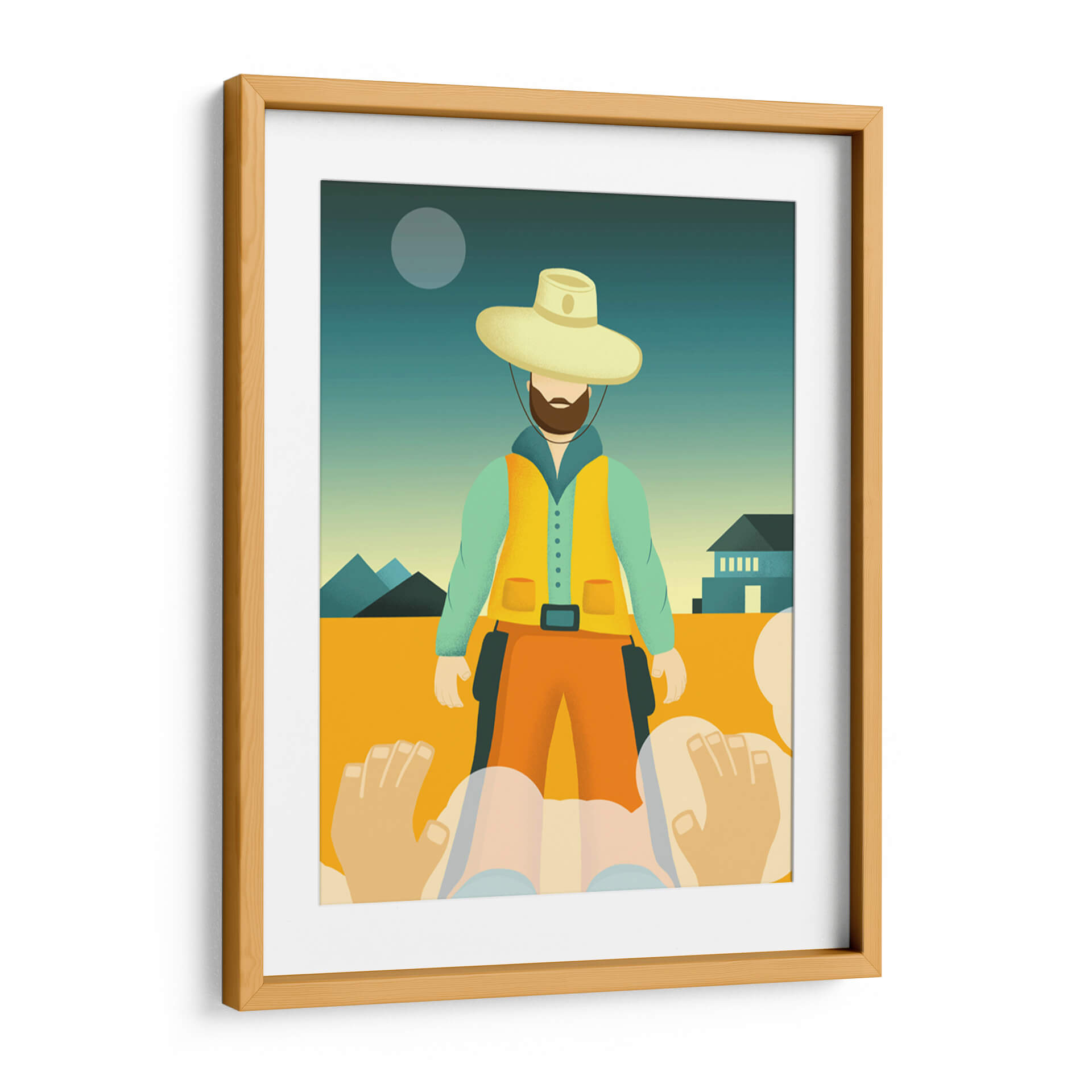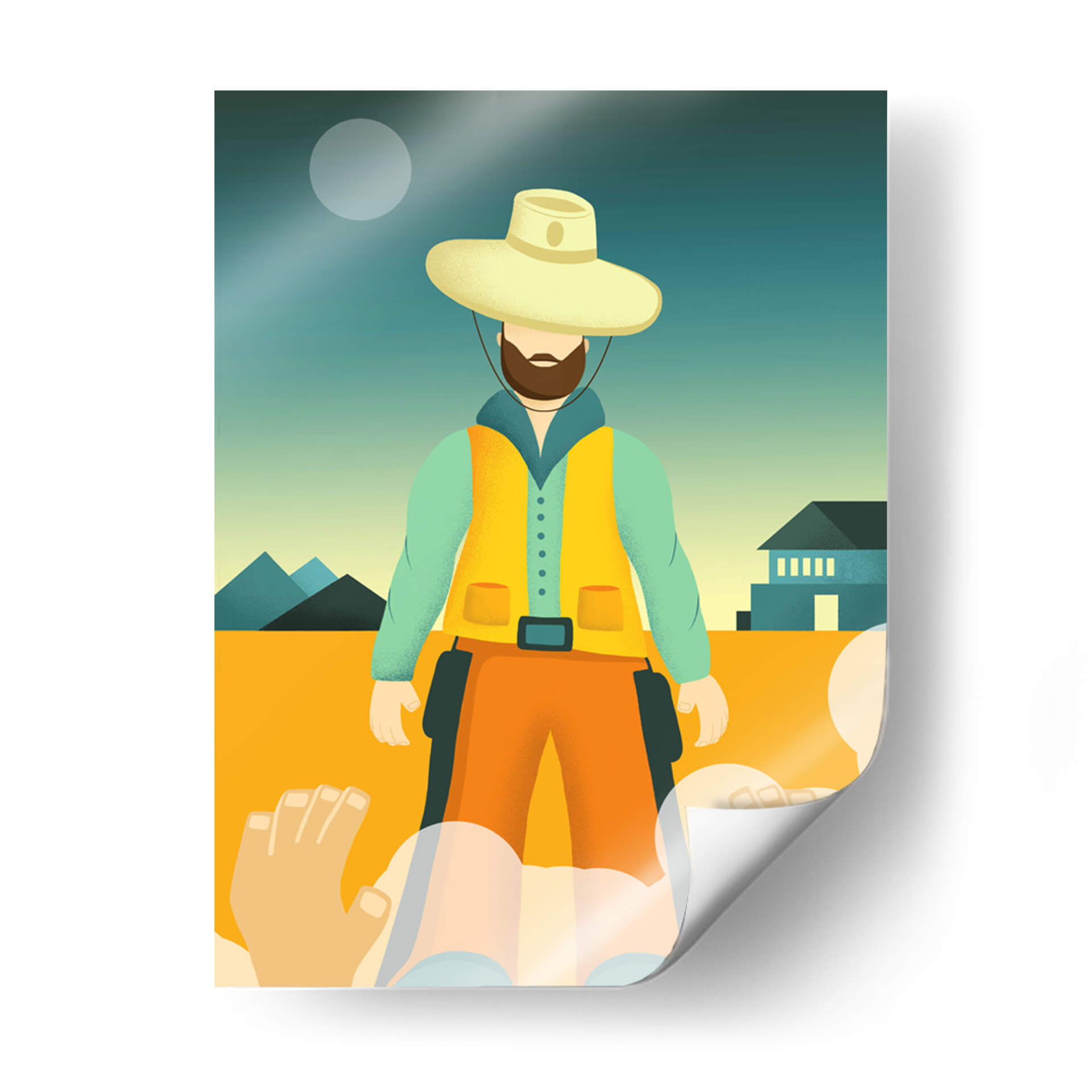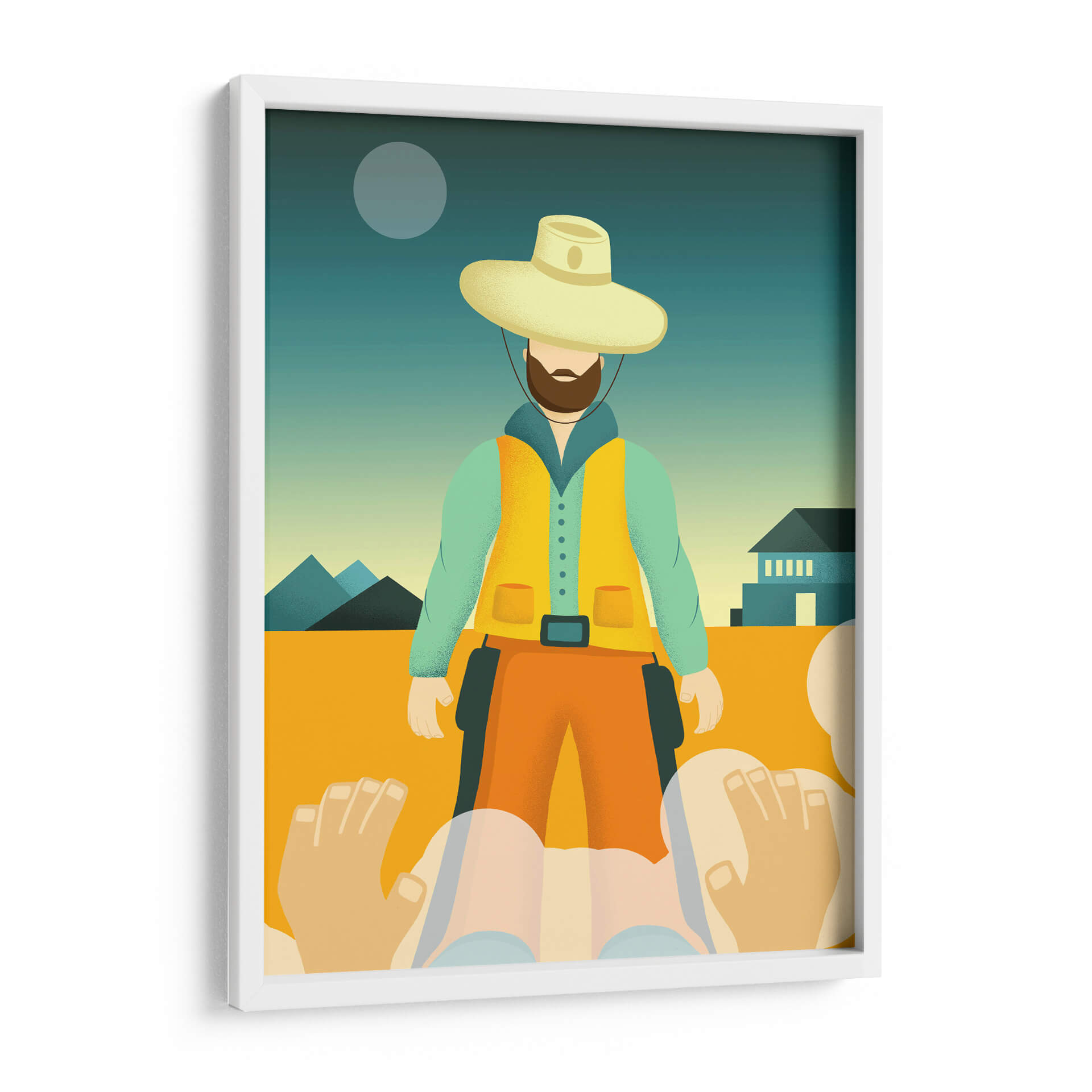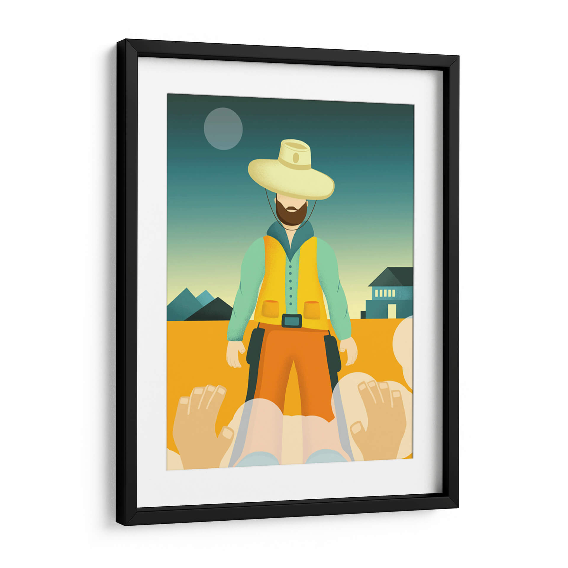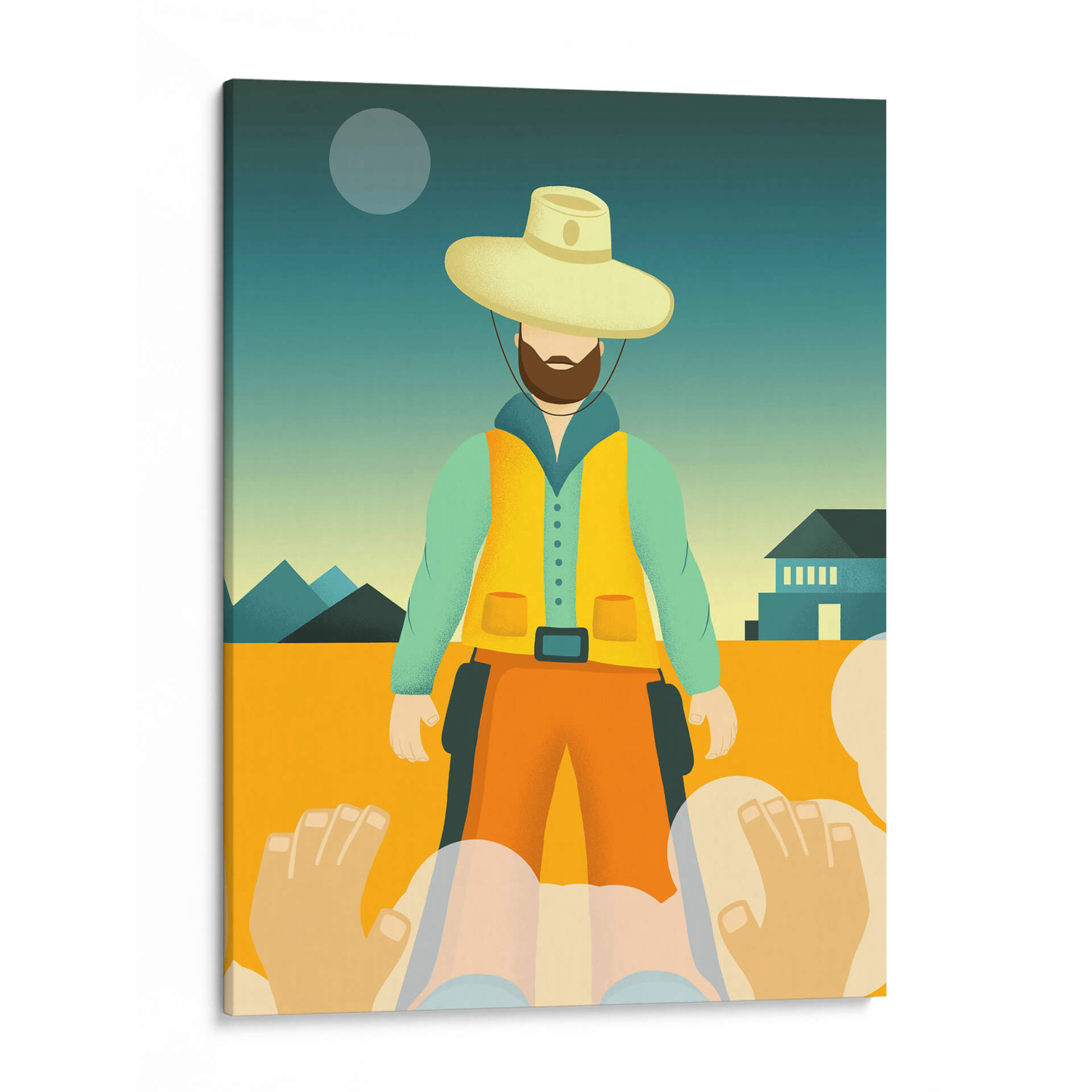 Sumérgete en la enigmática escena de "El Vaquero", una obra de arte digital que captura la esencia de la soledad y la resiliencia en un paisaje estilizado. La pieza presenta a una figura central con un sombrero de ala ancha y un chaleco amarillo vibrante, de pie sobre un campo ocre, bajo un cielo crepuscular teñido de tonos azules y amarillos. Las siluetas de montañas y una casa solitaria en el horizonte añaden una atmósfera de quietud y misterio. La paleta de colores, dominada por naranjas, amarillos y azules, crea un contraste visual llamativo y una sensación de calidez interrumpida por la inmensidad del cielo. El estilo gráfico y minimalista, con líneas limpias y formas geométricas, evoca un sentimiento de modernidad a la vez que remite a las narrativas del oeste americano. Las manos desenfocadas en primer plano sugieren una perspectiva inusual, quizás invitando al espectador a reflexionar sobre su propia conexión con la figura o el entorno. Este cuadro decorativo es perfecto para añadir un toque de carácter y profundidad a salones, estudios u oficinas, invitando a la contemplación y generando conversación.