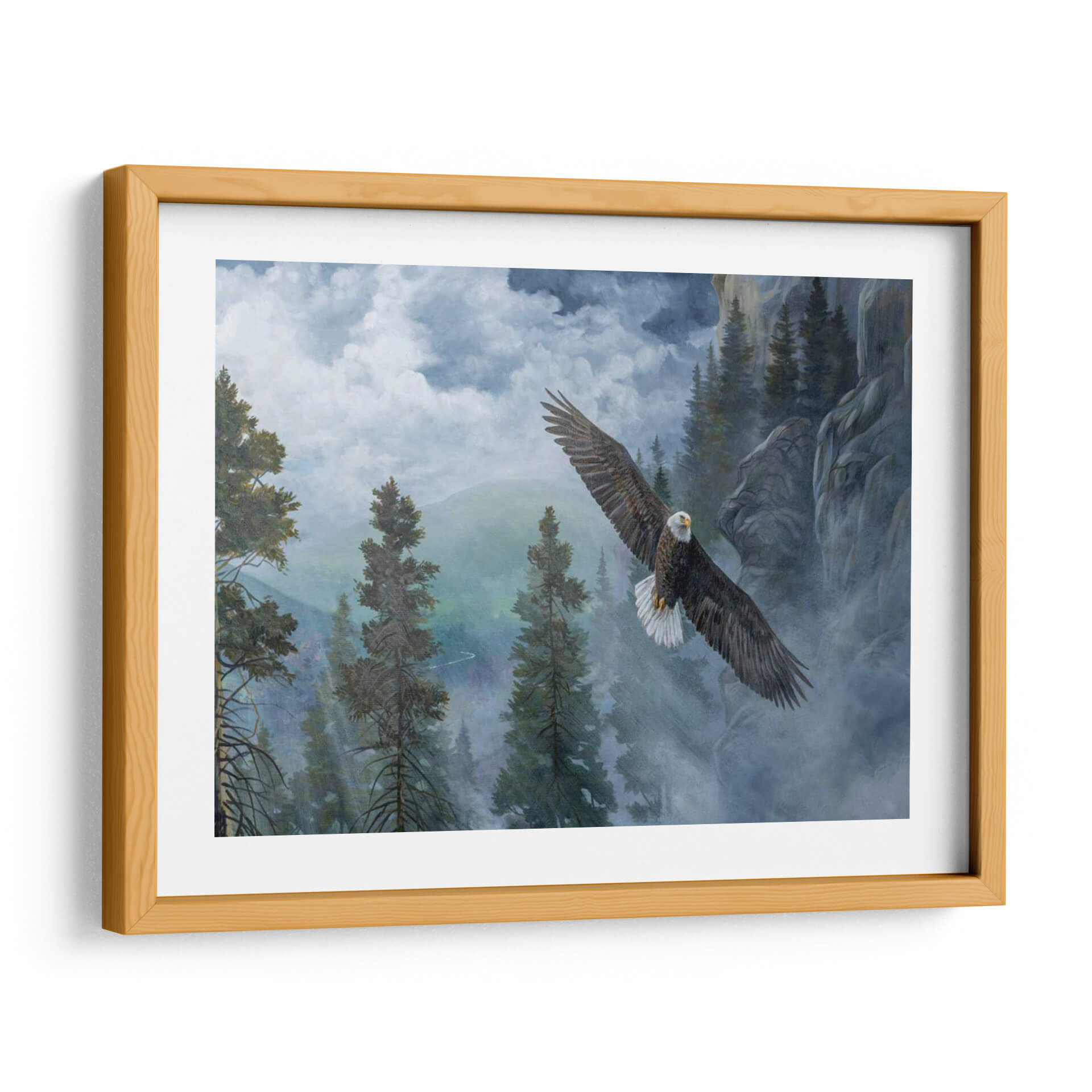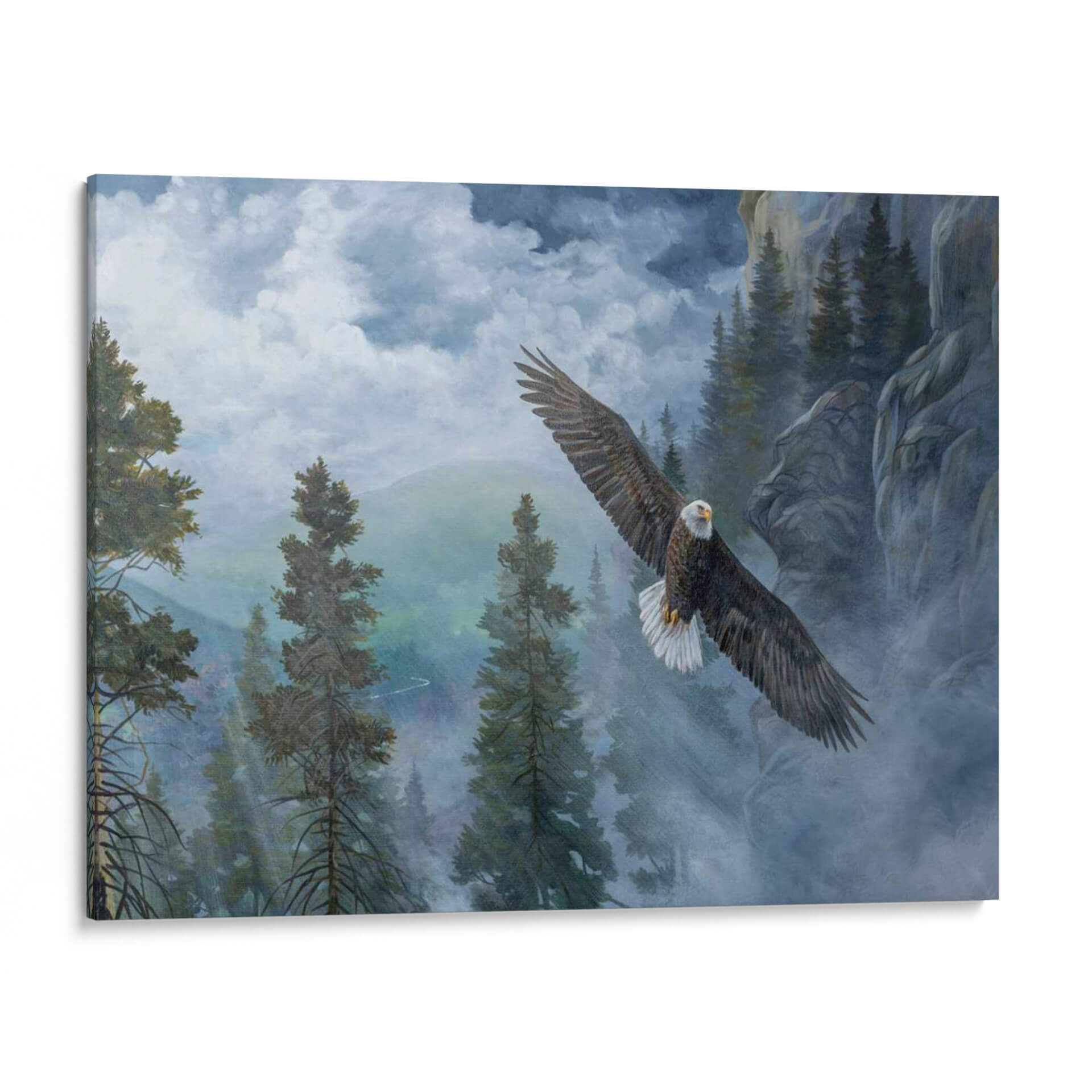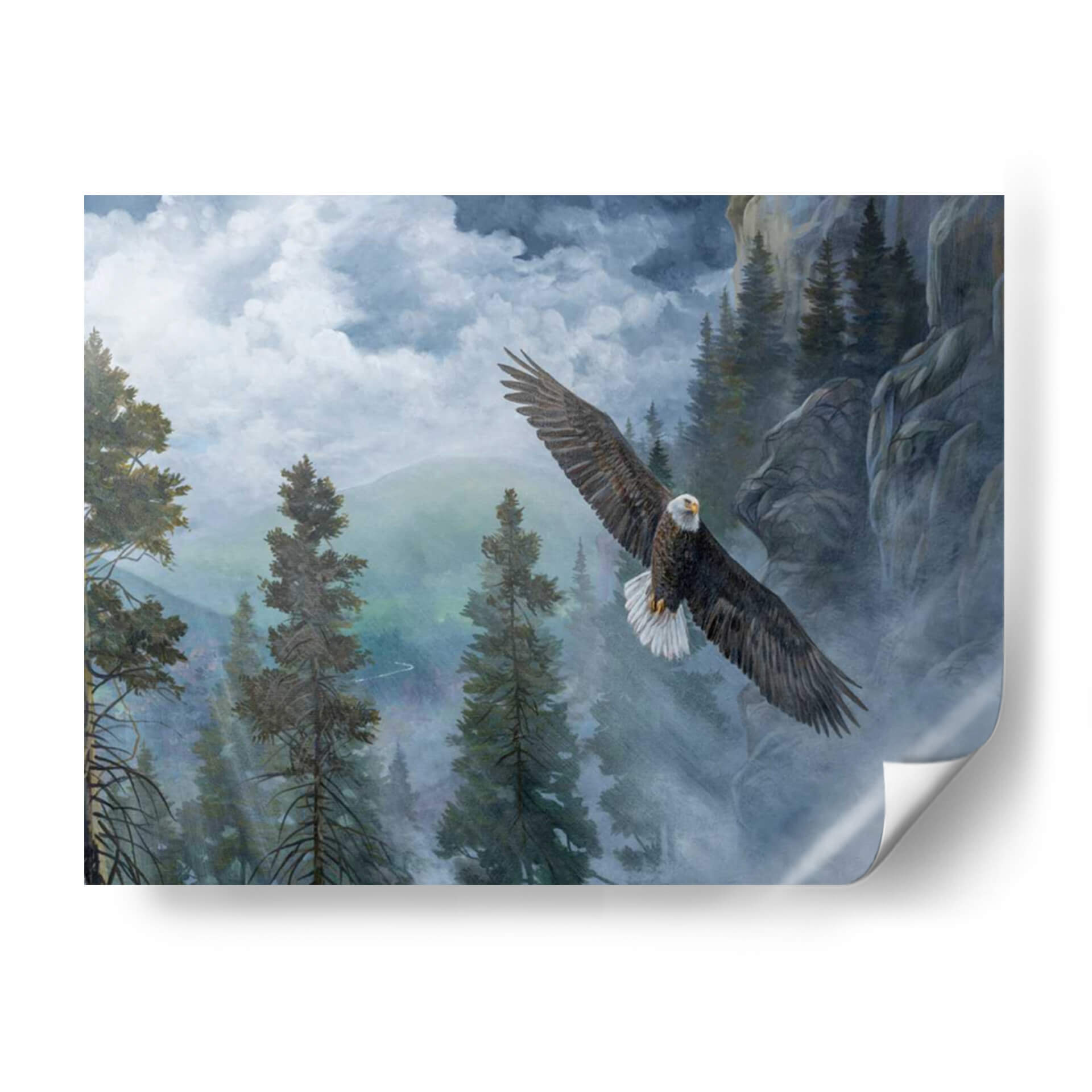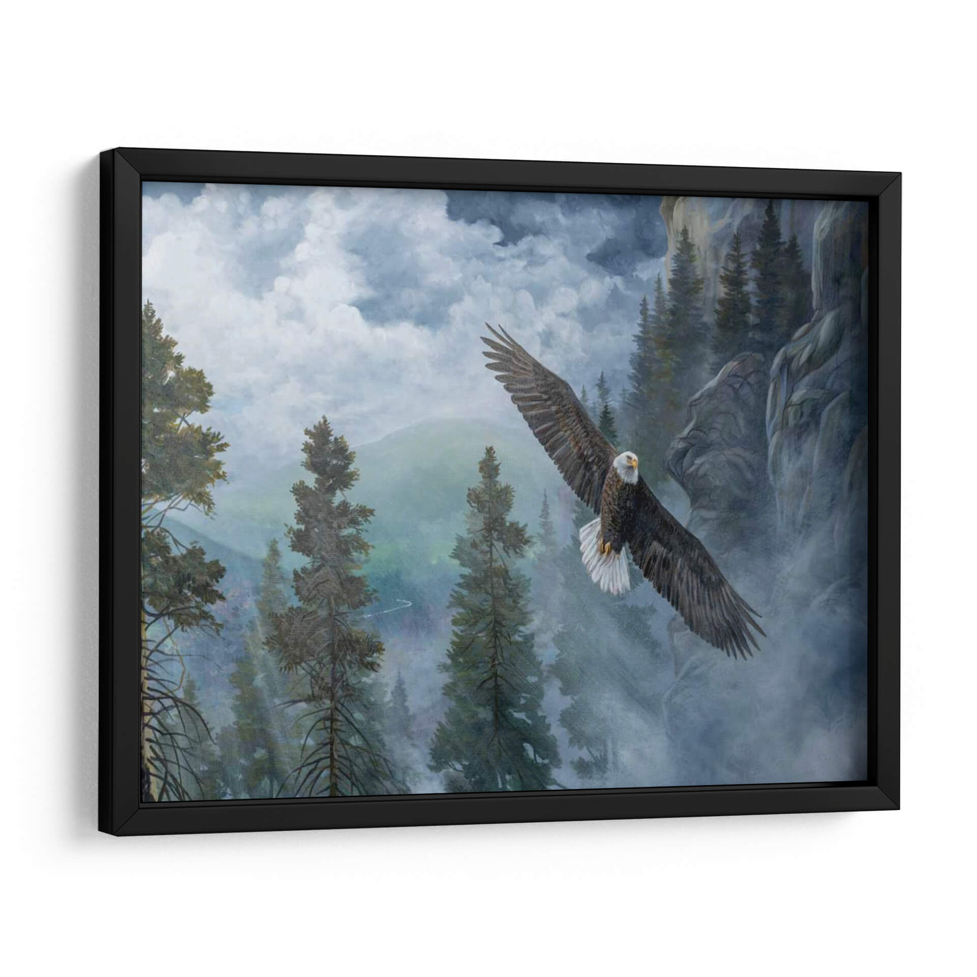 Captura la majestuosidad de la naturaleza con este impactante cuadro decorativo 'Elevado Alto II' de B. Lynnsy. La obra presenta un águila calva en pleno vuelo, descendiendo con gracia a través de un paisaje montañoso brumoso. Los verdes profundos de los pinos y los tonos grises de las imponentes formaciones rocosas se mezclan con un cielo nublado y etéreo, creando una atmósfera de serena grandeza y libertad salvaje. La detallada representación del plumaje del águila, sus alas extendidas y su mirada penetrante transmiten una sensación de poder y determinación. Los juegos de luces y sombras, junto con la profundidad creada por la niebla que envuelve el valle y el río serpenteante, invitan a la contemplación. Este cuadro decorativo es ideal para añadir un toque de naturaleza indómita y sofisticación a cualquier espacio, ya sea una sala de estar, un estudio o una oficina. Su estilo realista y la emotiva paleta de colores lo convierten en una pieza central que inspira admiración y evoca la fuerza del espíritu libre. Eleva tu decoración con esta obra maestra que celebra la belleza salvaje y la libertad.