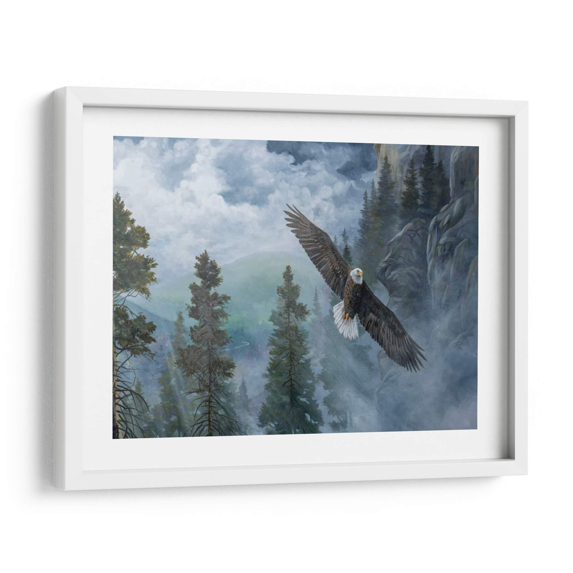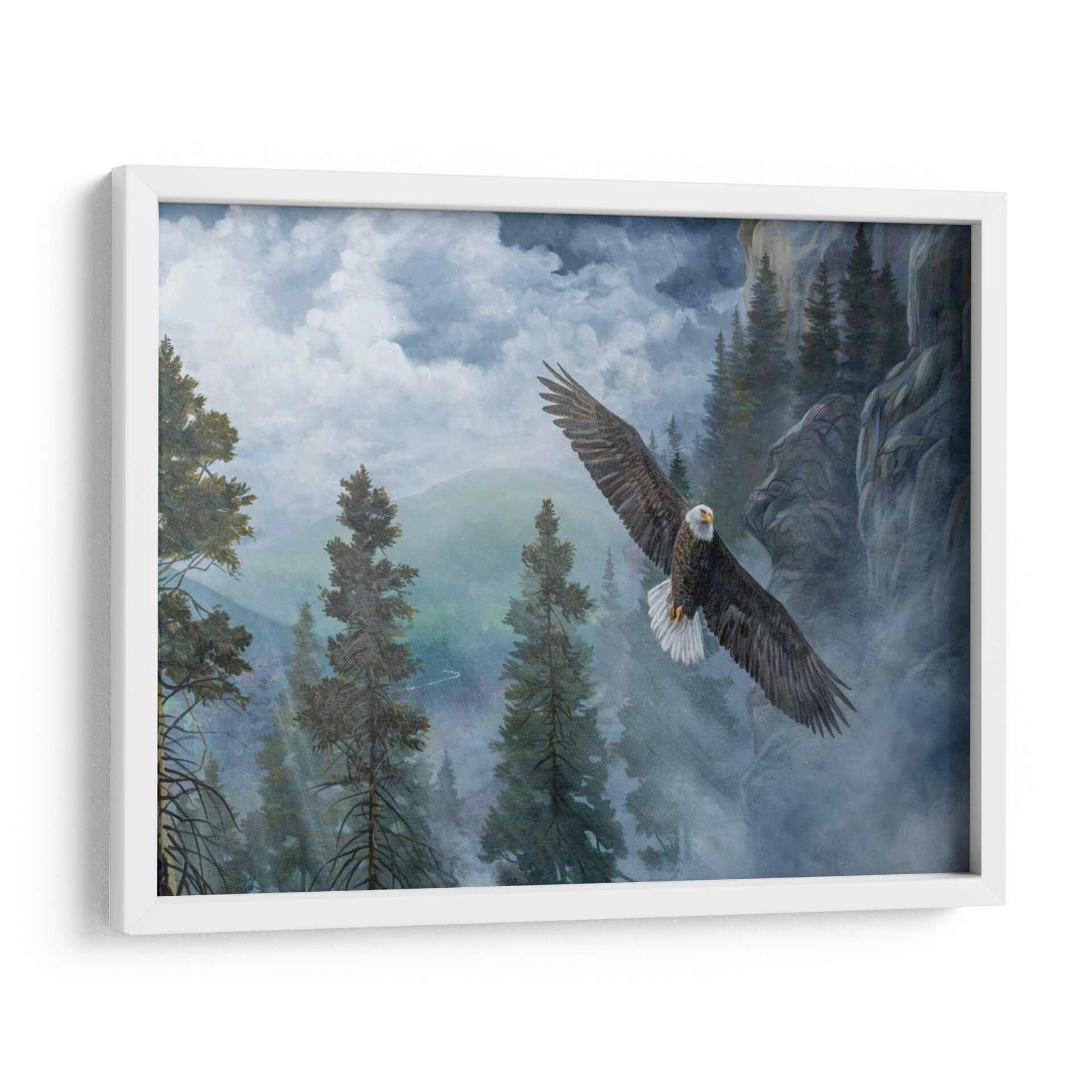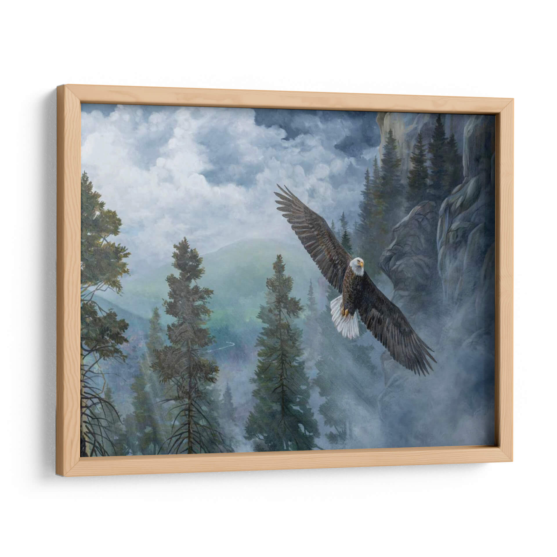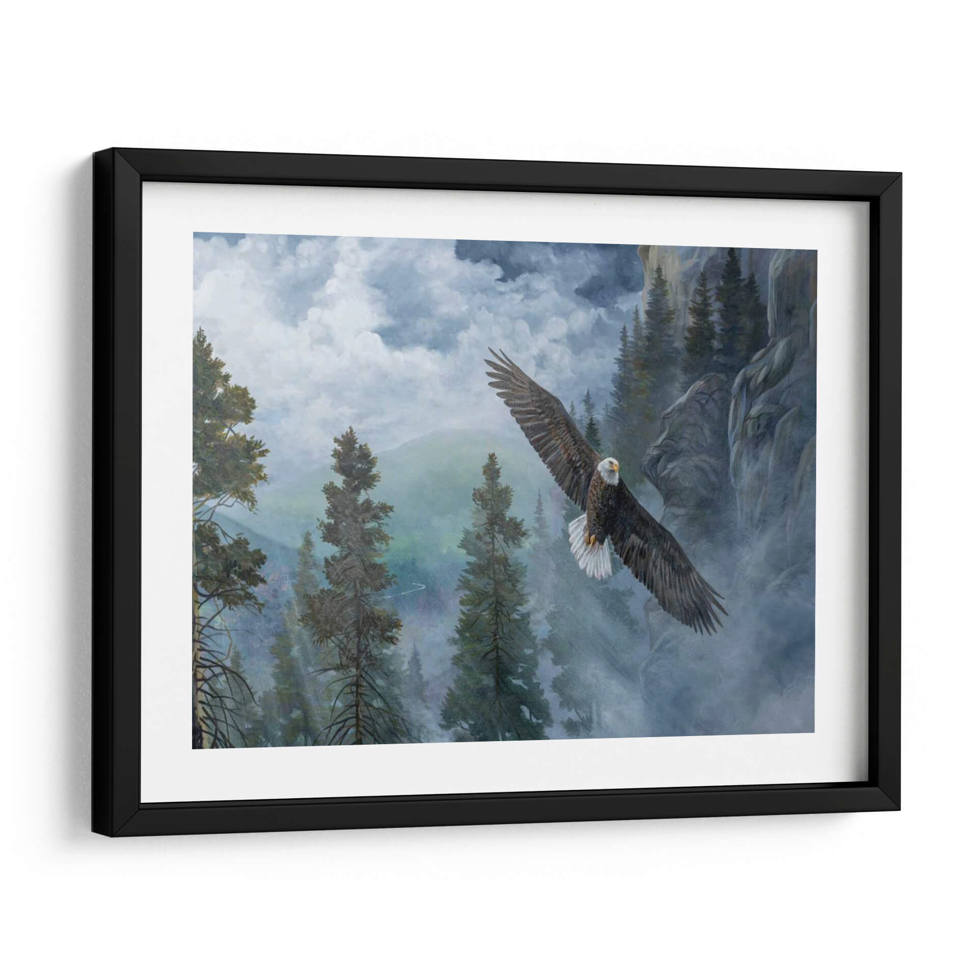 Captura la majestuosidad de la naturaleza con este impactante cuadro decorativo 'Elevado Alto II' de B. Lynnsy. La obra presenta un águila calva en pleno vuelo, descendiendo con gracia a través de un paisaje montañoso brumoso. Los verdes profundos de los pinos y los tonos grises de las imponentes formaciones rocosas se mezclan con un cielo nublado y etéreo, creando una atmósfera de serena grandeza y libertad salvaje. La detallada representación del plumaje del águila, sus alas extendidas y su mirada penetrante transmiten una sensación de poder y determinación. Los juegos de luces y sombras, junto con la profundidad creada por la niebla que envuelve el valle y el río serpenteante, invitan a la contemplación. Este cuadro decorativo es ideal para añadir un toque de naturaleza indómita y sofisticación a cualquier espacio, ya sea una sala de estar, un estudio o una oficina. Su estilo realista y la emotiva paleta de colores lo convierten en una pieza central que inspira admiración y evoca la fuerza del espíritu libre. Eleva tu decoración con esta obra maestra que celebra la belleza salvaje y la libertad.