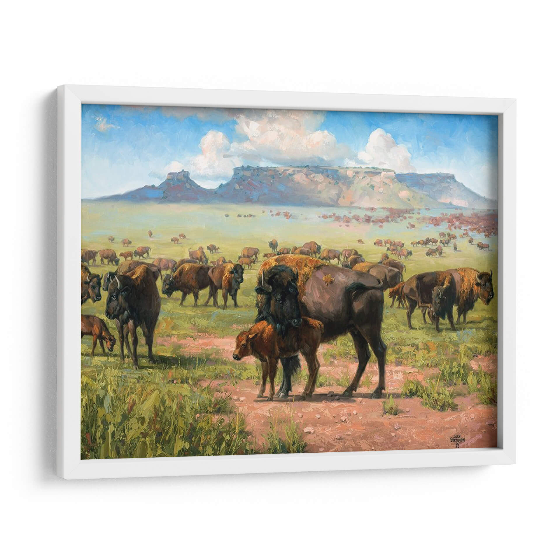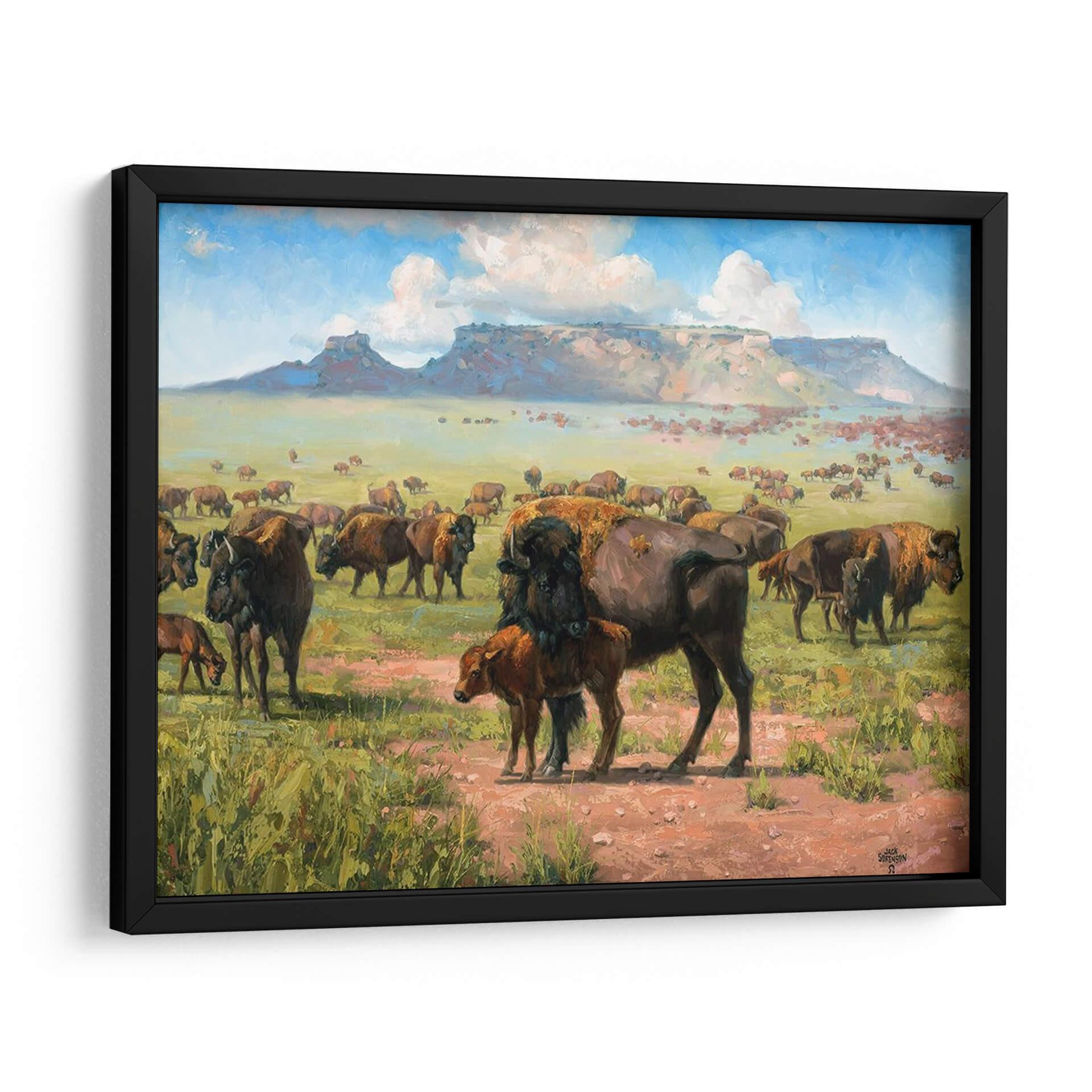 Sumérgete en la majestuosidad de la naturaleza con 'Espíritu de las Llanuras', una obra de arte cautivadora que captura la esencia de la vida salvaje en su hábitat natural. Este cuadro decorativo presenta un vasto paisaje de llanuras, coronado por formaciones rocosas imponentes bajo un cielo azul salpicado de nubes algodonosas. En primer plano, una manada de bisontes, liderada por una imponente figura materna con su cría, se despliega con un realismo que evoca la fuerza y la conexión familiar. La paleta de colores, dominada por tonos tierra, verdes exuberantes y el vibrante azul del cielo, crea una atmósfera de serenidad y poderío. El estilo pictórico, con pinceladas visibles que añaden textura y profundidad, otorga a la pieza un carácter orgánico y dinámico. 'Espíritu de las Llanuras' es más que una simple imagen; es una ventana a la indómita belleza del oeste americano, ideal para infundir calidez, carácter y una conexión con la naturaleza en tu sala de estar, estudio u oficina. Transforma tu espacio con este conmovedor testimonio de la resistencia y la belleza del espíritu salvaje.