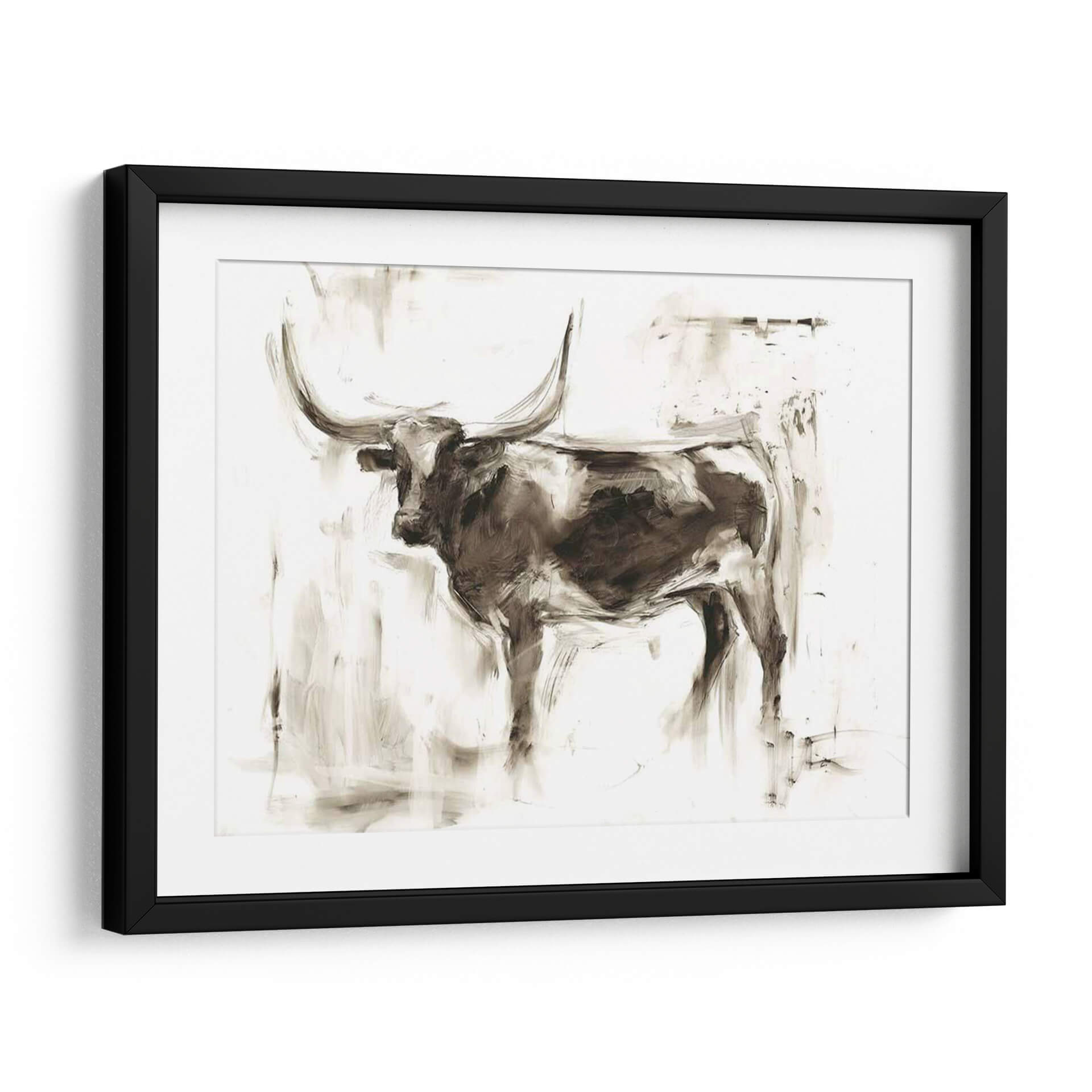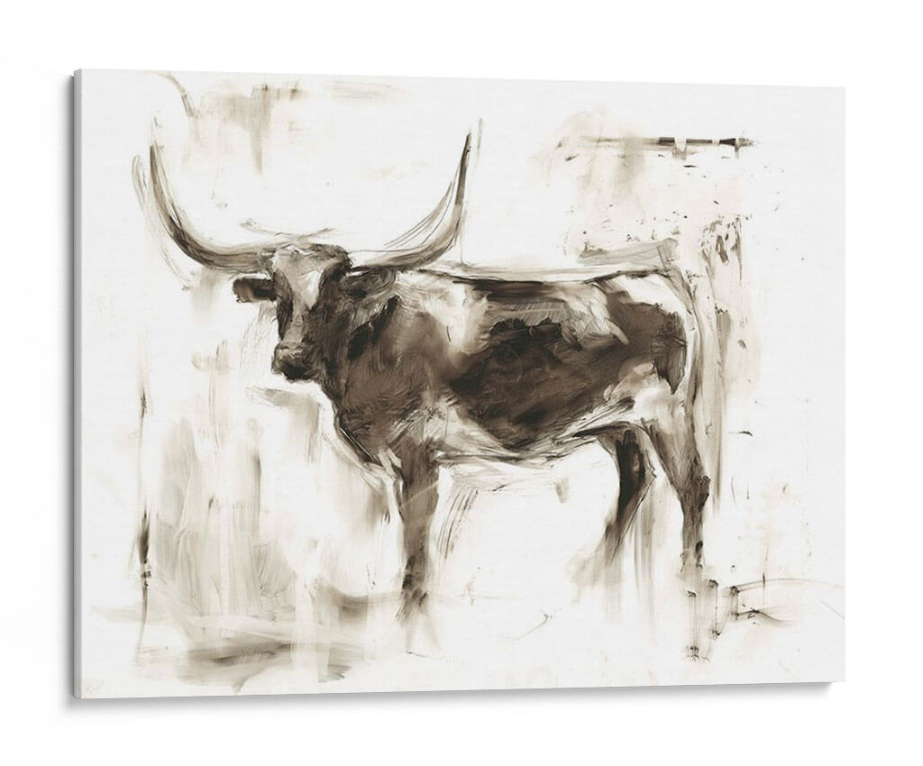 Sumérgete en la majestuosidad del "Estudio De Longhorn II", una obra de arte contemporáneo de Ethan Harper que captura la esencia poderosa y serena de este icónico animal. A través de pinceladas audaces y una paleta de colores en tonos sepia y blancos rotos, Harper crea una atmósfera de fuerza contenida y elegancia rústica. La composición, centrada en la figura imponente del longhorn, utiliza el espacio negativo de manera experta para resaltar sus curvas dramáticas y su mirada penetrante. Este cuadro decorativo es perfecto para añadir un toque de carácter y sofisticación a cualquier estancia, desde una sala de estar moderna hasta un despacho o un dormitorio. Su estilo evocador y su ejecución artística lo convierten en una pieza de conversación, ideal para quienes buscan arte que inspire y conecte con la naturaleza y la fuerza salvaje. Transforma tu hogar con esta pieza única que combina tradición y modernidad, aportando un aire de serenidad y poder a tu decoración.