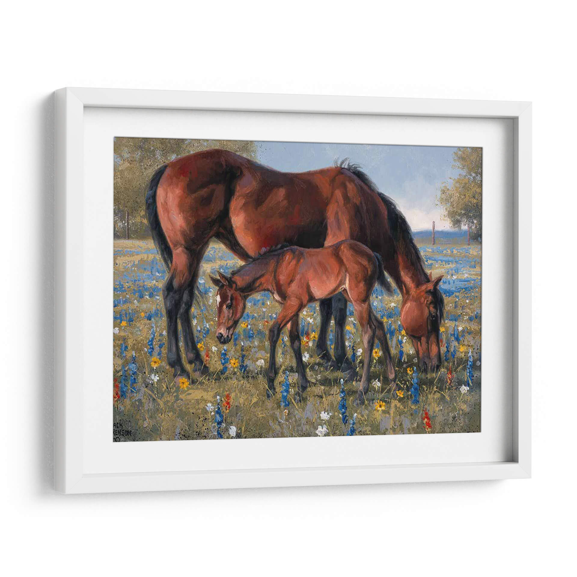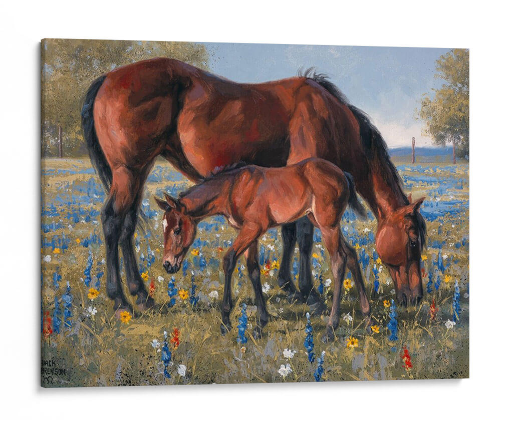 Captura la esencia de la naturaleza y la conexión familiar con "Flor Silvestre", una obra de arte que evoca paz y serenidad. Este cuadro decorativo presenta una yegua majestuosa junto a su tierno potrillo, pastando pacíficamente en un prado vibrante salpicado de flores silvestres azules, amarillas y rojas. La paleta de colores cálidos y terrosos de los caballos contrasta maravillosamente con el tapiz floral y el cielo azul claro, creando una atmósfera acogedora y natural. La técnica pictórica, con pinceladas visibles que añaden textura y profundidad, recuerda al impresionismo, aportando una sensación de movimiento y vida a la escena. La composición centrada en la tierna interacción entre madre e hijo transmite un sentimiento universal de amor y protección. Este cuadro es ideal para añadir un toque de dulzura rústica y elegancia a cualquier hogar, ya sea en la sala de estar, el dormitorio o un estudio. Un detalle encantador para quienes aprecian la belleza de los animales y los paisajes campestres.